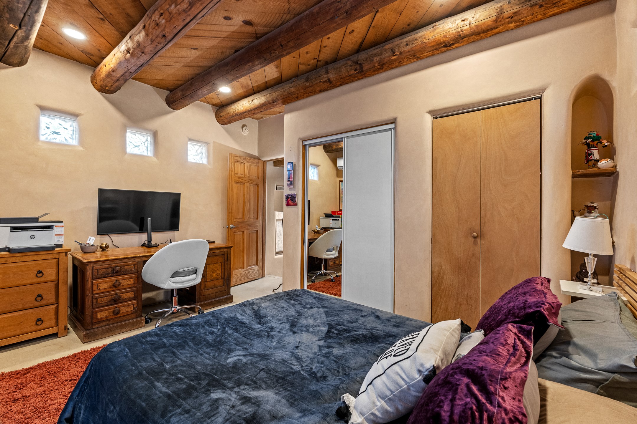 Just minutes from the historic Plaza, this freestanding condo with no shared walls offers the perfect blend of privacy, charm, and location. Situated at 107A Moore, you're ideally positioned near the Casa Solana Shopping Center, the Santa Fe River, and scenic trails that effortlessly lead you downtown. This sweet and sophisticated 1-bedroom residence is rich in authentic Santa Fe character and thoughtful upgrades. The open living space features a cozy kiva fireplace, vigas, tongue-and-groove ceilings, smooth plaster walls, and sleek concrete flooring throughout. The kitchen is appointed with granite countertops and stainless steel appliances, while the spa-like bathroom showcases a striking tiger's eye sink paired with white quartz counter. Comfort is ensured year-round with mini-split heating and cooling, and a washer and dryer convey for added convenience. A compact lofted storage area provides bonus space and is accessed via pull-down stairs through the laundry room. Outside, enjoy your own private courtyard, beautifully enclosed by coyote fencing an ideal setting for outdoor dining, morning coffee, or evening wine under the Santa Fe sky.A rare opportunity to own a private, freestanding condo in a highly desirable and walkable location close to everything Santa Fe has to offer.