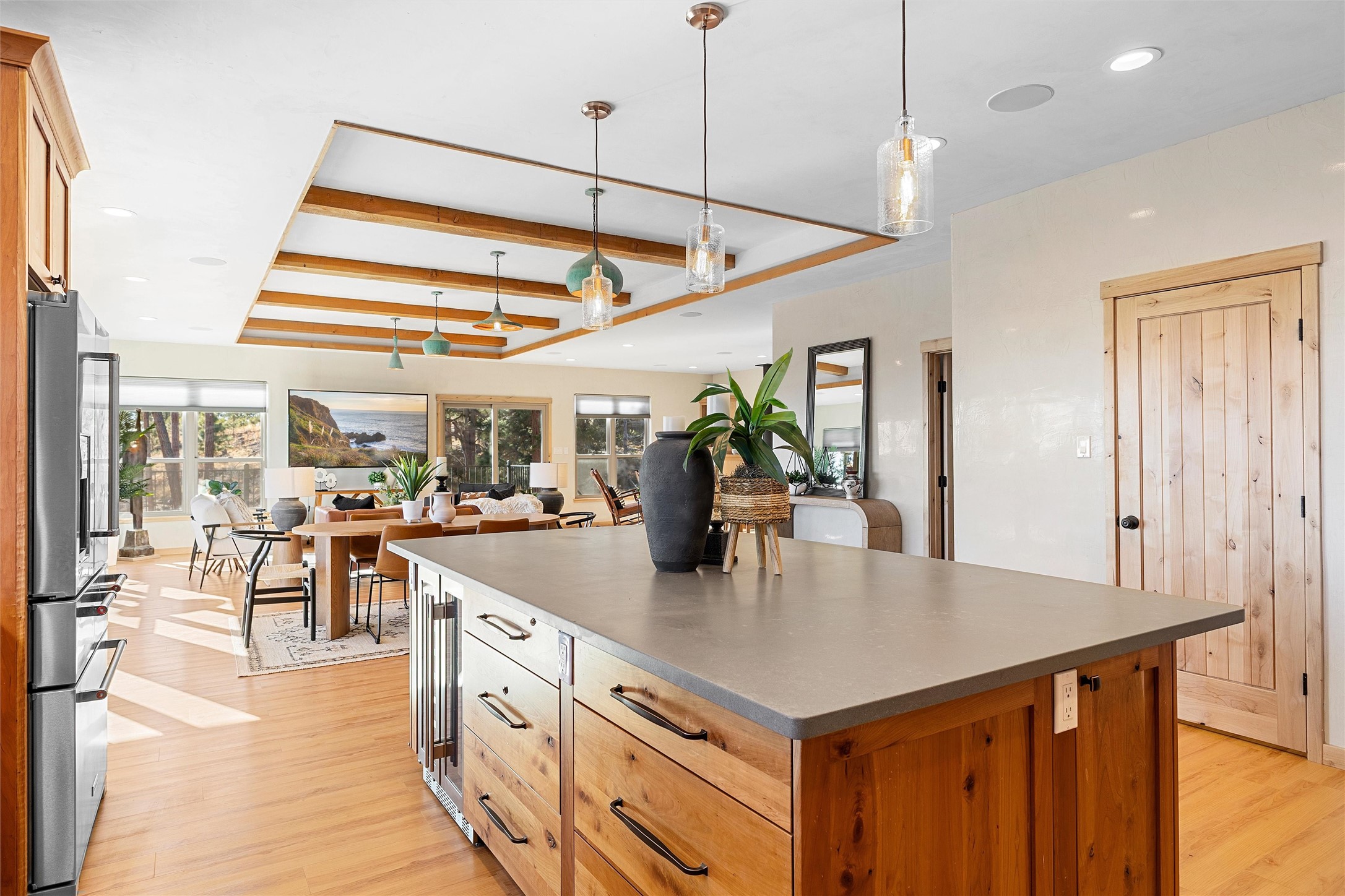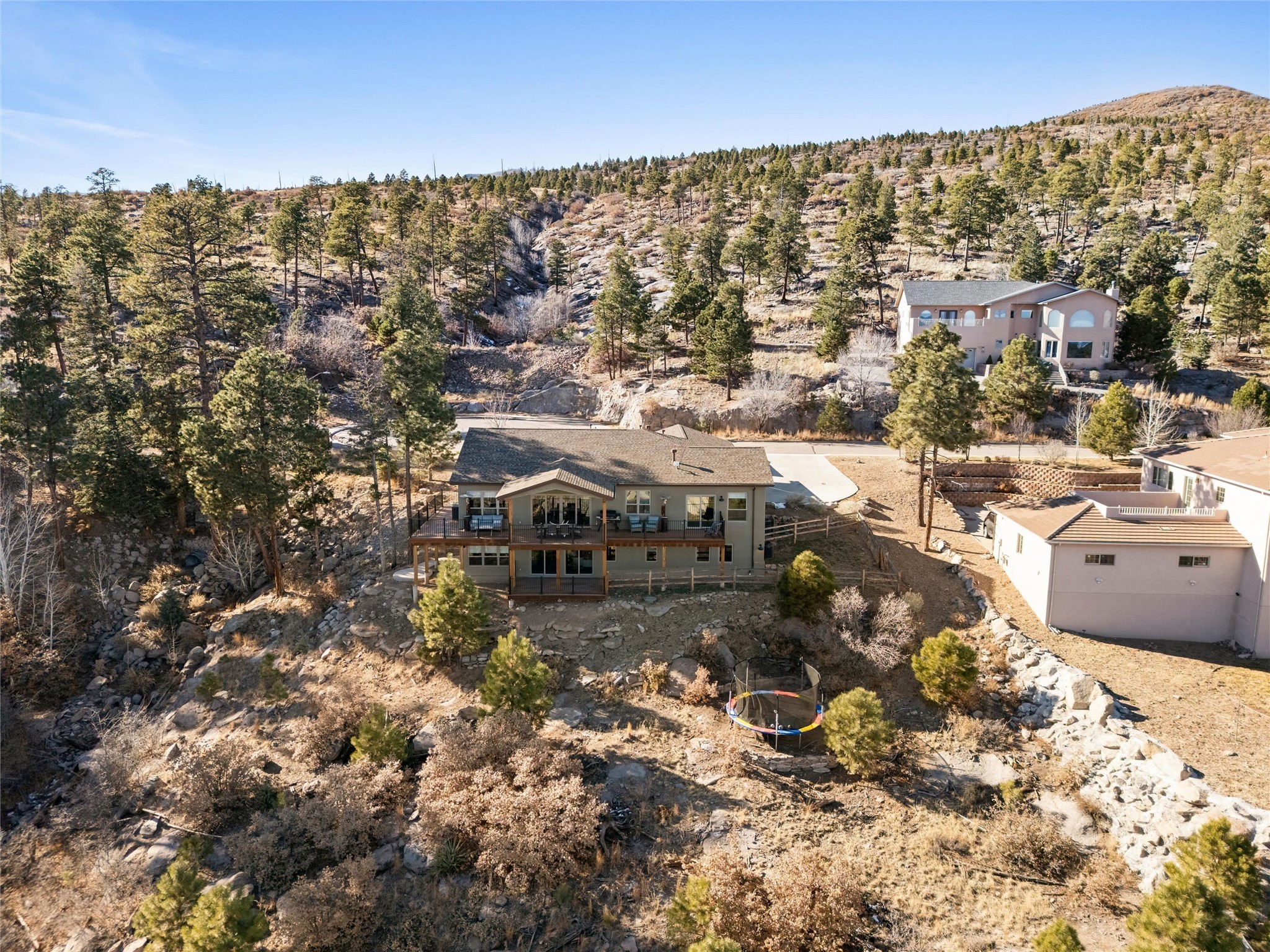 Tucked at the end of a quiet cul-de-sac in one of Los Alamos' most desirable neighborhoods, 1610 Solana is a truly rare offering. Set on over one acre (the largest lot in the neighborhood) and backing to National Forest and County land for unmatched privacy and a breathtaking natural backdrop. With arguably the best views in town, you'll enjoy sweeping vistas of the townsite, the Sangre de Cristo range, and more from multiple spaces throughout the home.Finished in 2022, this stunning residence offers over 3,500 square feet of modern, beautifully crafted living space and all of the contemporary amenities today's buyers expect. The primary suite is a showstopper with a private deck walkout, an enviable walk-in closet, and a spa-inspired ensuite highlighted by a copper soaking tub.Designed for comfortable main-floor living, the upper level includes two additional bedrooms, one with its own ensuite plus an additional full bath. Venetian plaster walls add softness and sophistication to the main living areas, while multiple gathering spaces provide room to relax or entertain with ease. Head outside to the wrap-around deck with a covered porch, the perfect place to take in the views in every season.The walkout basement expands your options with another spacious family room, a guest bedroom with attached bath, and a versatile bonus room ideal for an office or additional guest space, complete with a Murphy bed.An oversized two-car garage offers generous storage and flexible space for a home gym or workshop, and the large laundry room with attached mudroom just off the garage keeps daily life organized and effortless.New, modern, spacious, and surrounded by nature, 1610 Solana delivers the Los Alamos lifestyle at its finest.
