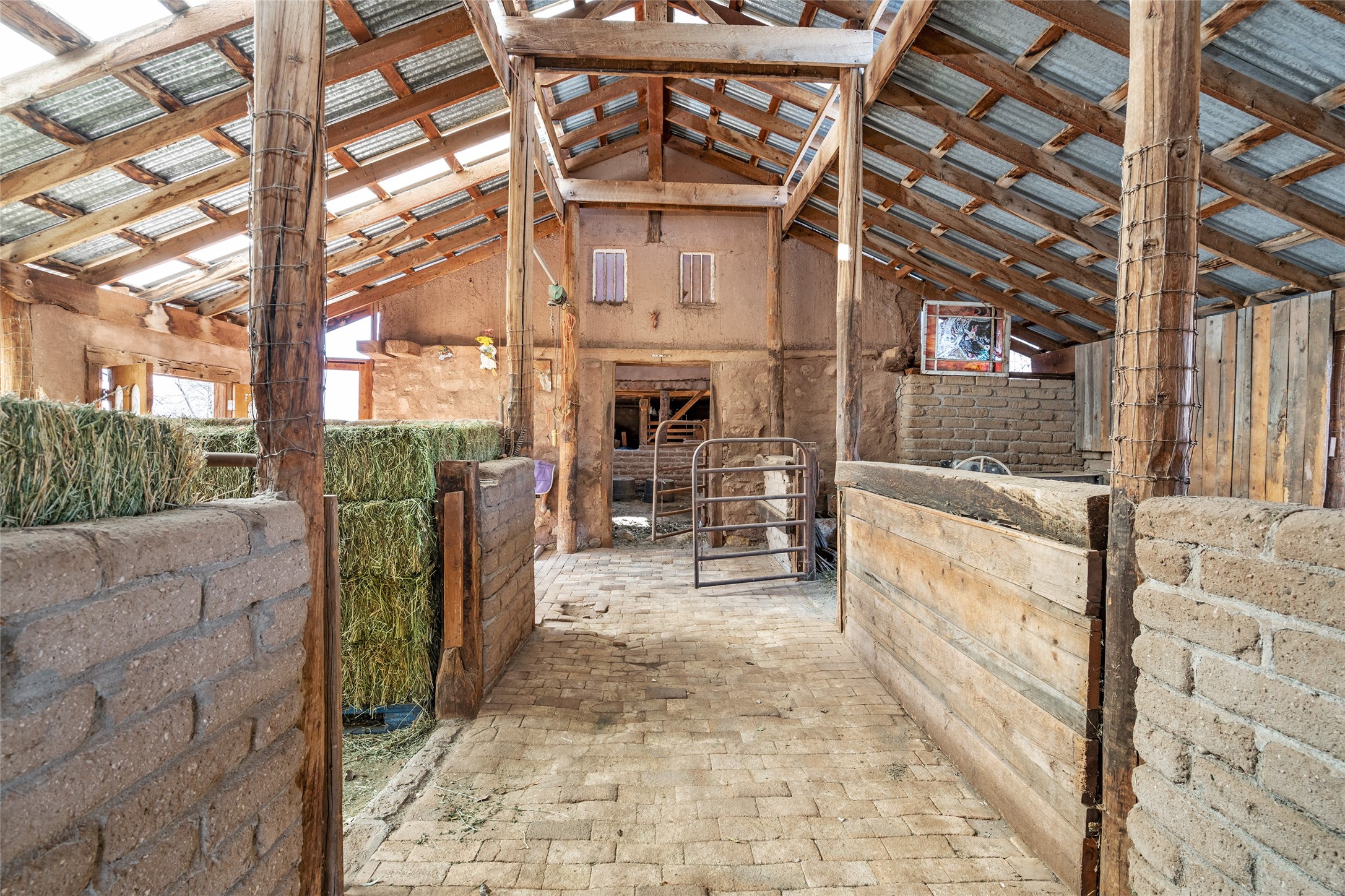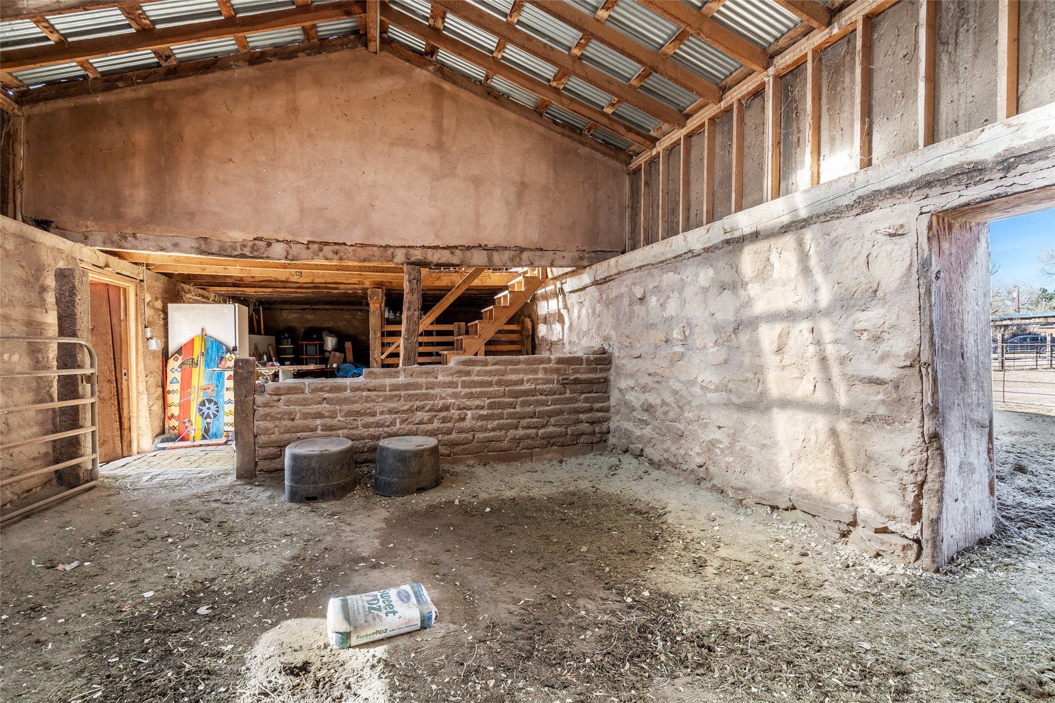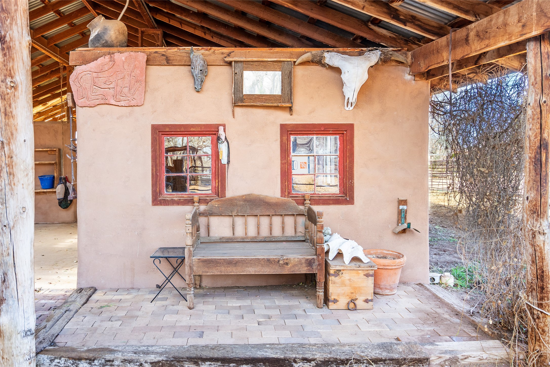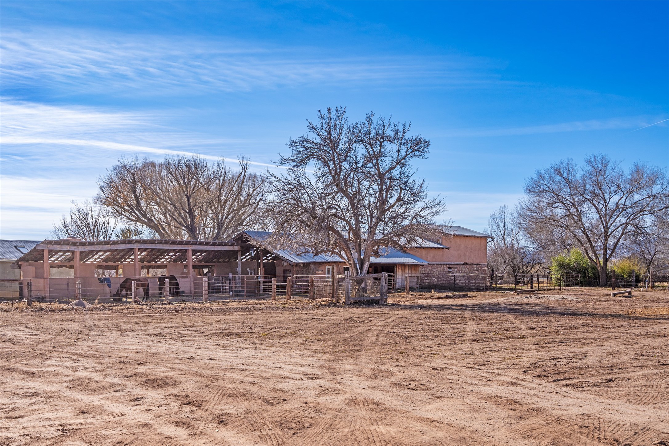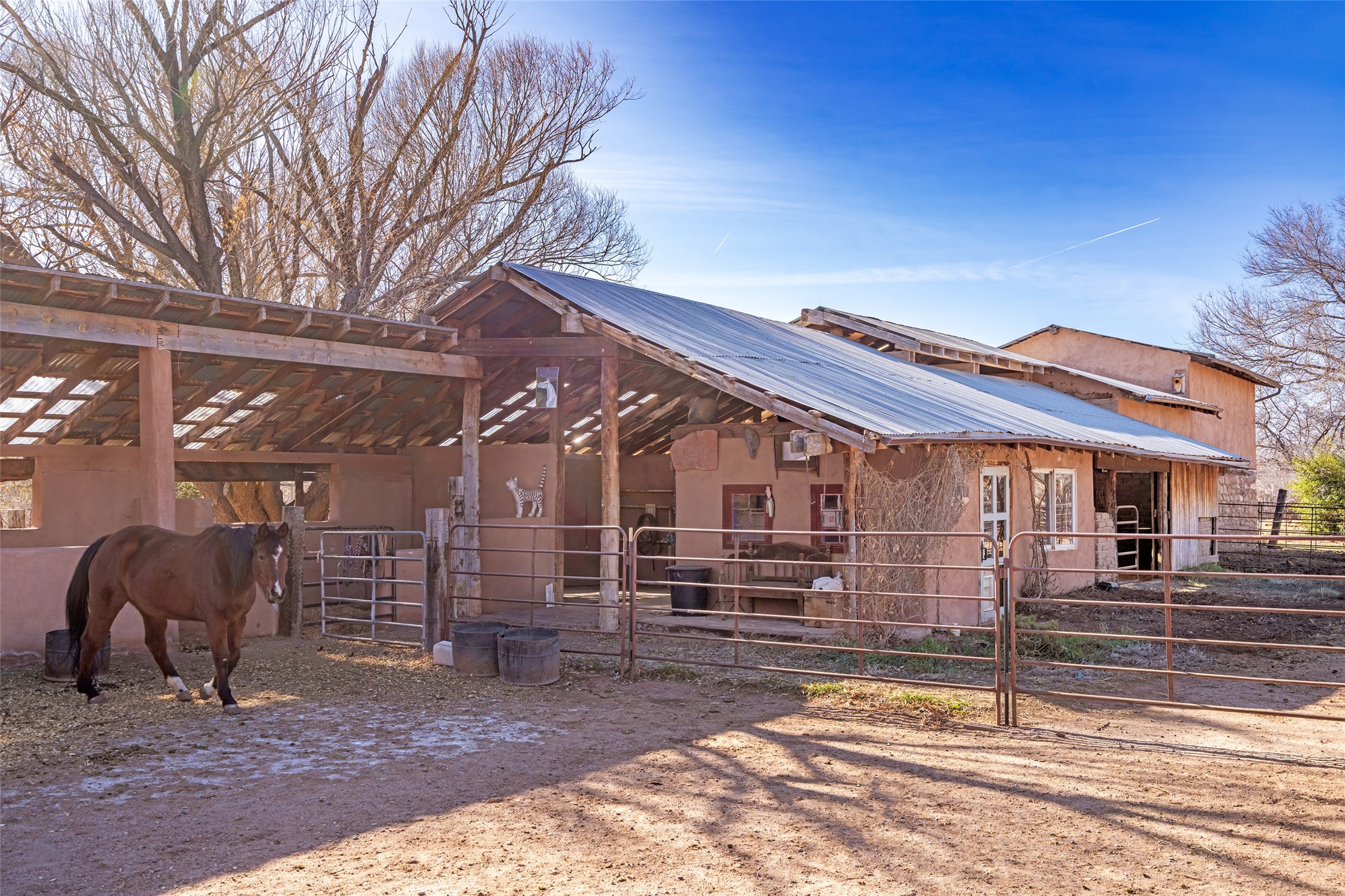 This historic Galisteo Hacienda presents a rare opportunity to restore an iconic adobe estate set on 3.8 acres within the village of Galisteo, one of the largest landholdings under Traditional Community zoning, which supports residential, live/work, and art gallery uses. Dating to the 1800s, the property once served as the headquarters of Don Jos Ortiz y Pino's sheep empire and later as the iconic Quartermill Farm - home, studio, and gallery of acclaimed artist Priscilla Hoback--making it uniquely suited to continue as a creative live/work estate. Located in the heart of Galisteo Village, the property includes a former gallery along a central village road and a substantial adobe main house privately set behind it.The hacienda features two residential wings with four bedrooms and three baths, a large library, grand living and dining rooms, multiple fireplaces, and authentic architectural details. A generous inner courtyard with mature trees, portals, and a koi pond creates a serene, campus-like setting ideal for both living and creative pursuits, complemented by fruit trees, gardens, and expansive village acreage.Equestrian facilities include a large handcrafted stone and adobe barn with spacious stalls and turnouts, wash rack, hay loft, tack room with bath, and an oversized arena, supported by a private well dedicated to the barn. Additional structures include an art studio with sink and loft, and a one-bedroom guest house--formerly the historic town bar--offering flexibility for guests, staff, or extended work use.The property is in need of renovation and restoration, presenting an exceptional opportunity for a discerning buyer to reimagine a historically significant live/work estate, blending residential life, creative enterprise, and community engagement in one of Galisteo's most storied village settings.