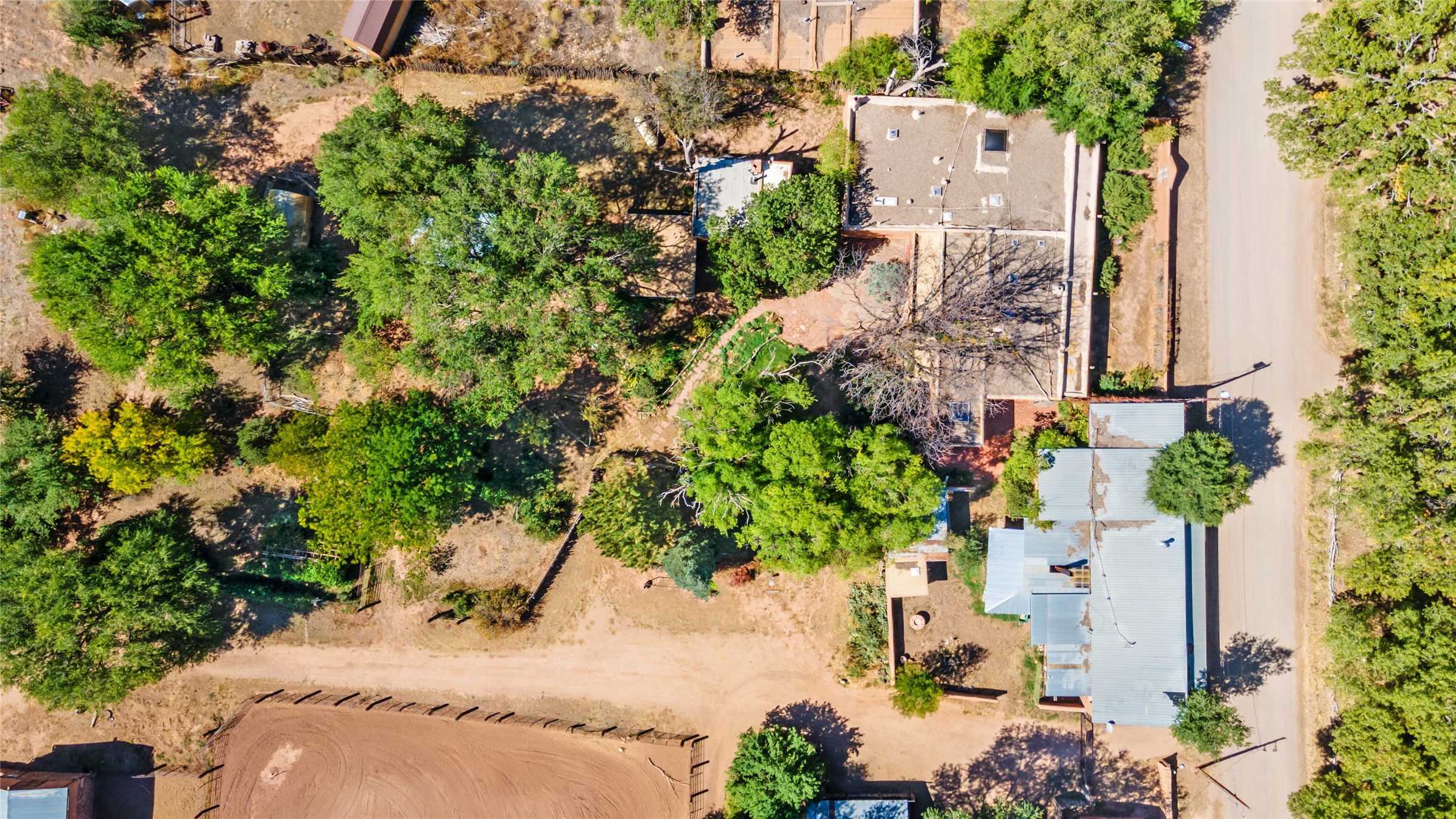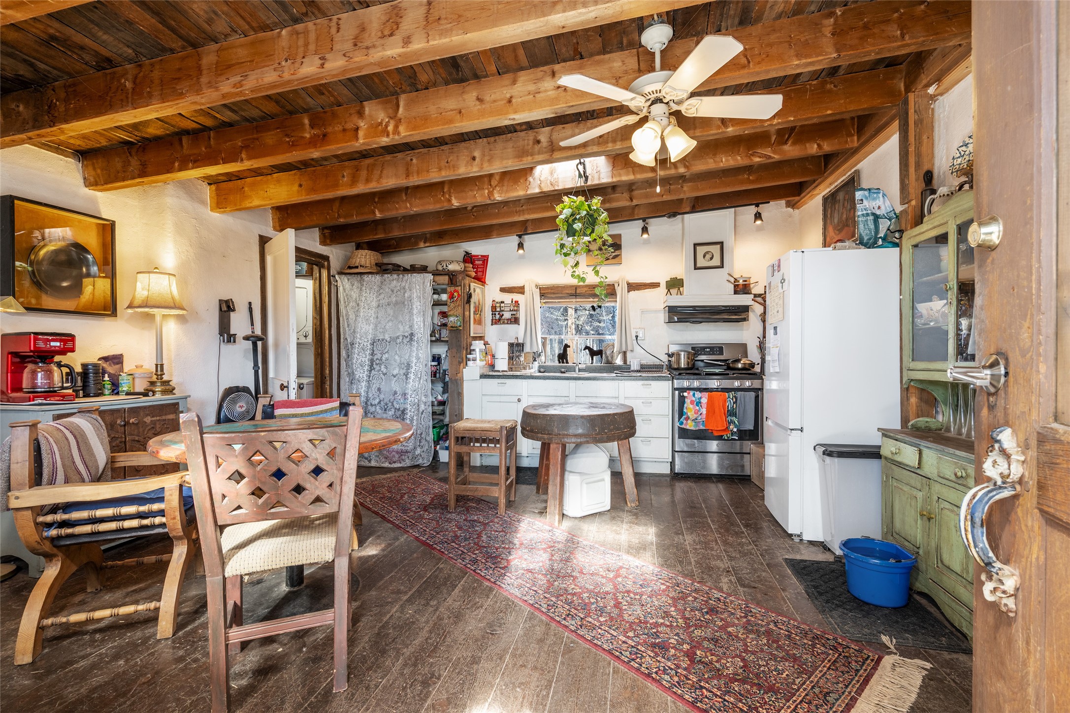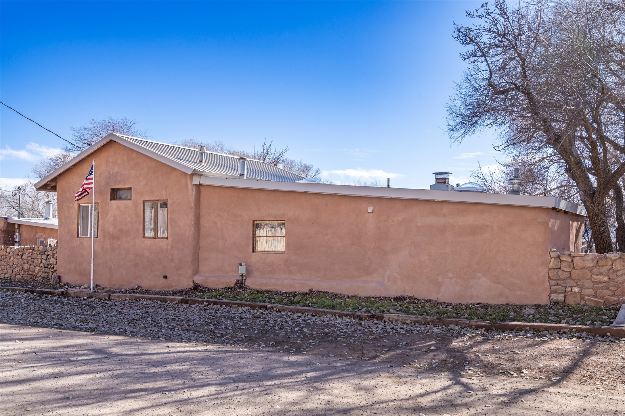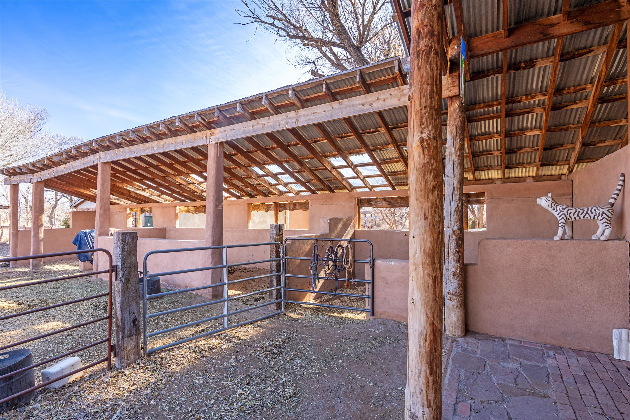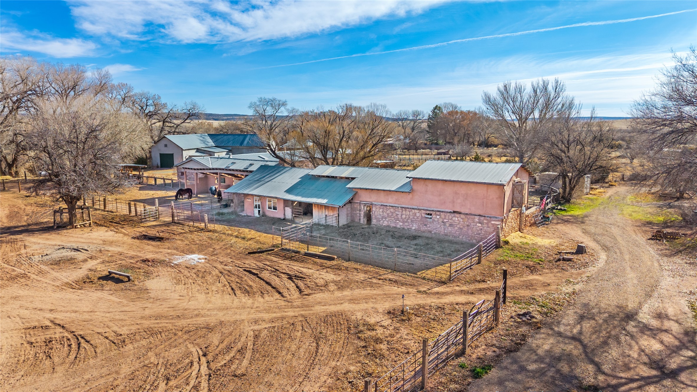 This historic Galisteo Hacienda presents a rare opportunity to restore an iconic adobe estate set on 3.8 acres within the village of Galisteo, one of the largest landholdings under Traditional Community zoning, which supports residential, live/work, and art gallery uses. Dating to the 1800s, the property once served as the headquarters of Don Jos Ortiz y Pino's sheep empire and later as the iconic Quartermill Farm - home, studio, and gallery of acclaimed artist Priscilla Hoback--making it uniquely suited to continue as a creative live/work estate. Located in the heart of Galisteo Village, the property includes a former gallery along a central village road and a substantial adobe main house privately set behind it.The hacienda features two residential wings with four bedrooms and three baths, a large library, grand living and dining rooms, multiple fireplaces, and authentic architectural details. A generous inner courtyard with mature trees, portals, and a koi pond creates a serene, campus-like setting ideal for both living and creative pursuits, complemented by fruit trees, gardens, and expansive village acreage.Equestrian facilities include a large handcrafted stone and adobe barn with spacious stalls and turnouts, wash rack, hay loft, tack room with bath, and an oversized arena, supported by a private well dedicated to the barn. Additional structures include an art studio with sink and loft, and a one-bedroom guest house--formerly the historic town bar--offering flexibility for guests, staff, or extended work use.The property is in need of renovation and restoration, presenting an exceptional opportunity for a discerning buyer to reimagine a historically significant live/work estate, blending residential life, creative enterprise, and community engagement in one of Galisteo's most storied village settings.