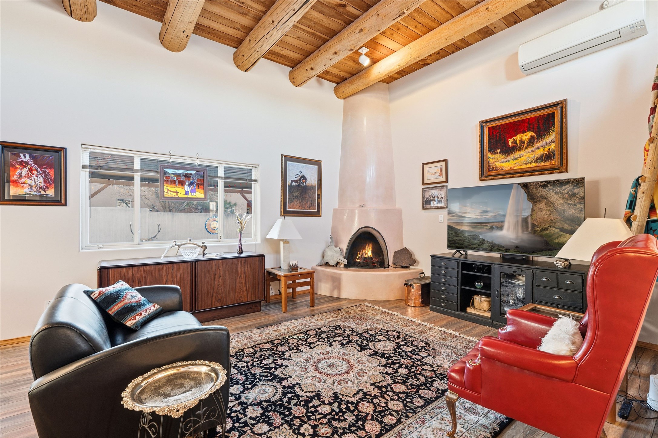 Desirable Pueblos del Sol Home in the Coveted Pion School Zone. This inviting 1,386 sq. Foot, 3-bedroom, 2-bath residence has a new roof (2023) and driveway (2025). Thoughtfully designed for comfortable living, the home features a welcoming living area with high ceiling and beams, anchored by a classic kiva fireplace--perfect for cozy evenings. The thoughtfully laid out kitchen flows around a large center island and into a well-lit dining space that opens up to the back garden. Enjoy recently updated flooring throughout the main living spaces. The primary suite offers an updated bath and direct access to the back portal, creating a seamless indoor-outdoor connection and a peaceful retreat. Step outside to enjoy the generously sized fully-enclosed backyard, ideal for entertaining, gardening, pets, or simply relaxing under New Mexico skies. With its prime location, functional layout, and expansive outdoor space, this home presents a wonderful opportunity in one of Santa Fe's most popular neighborhoods.