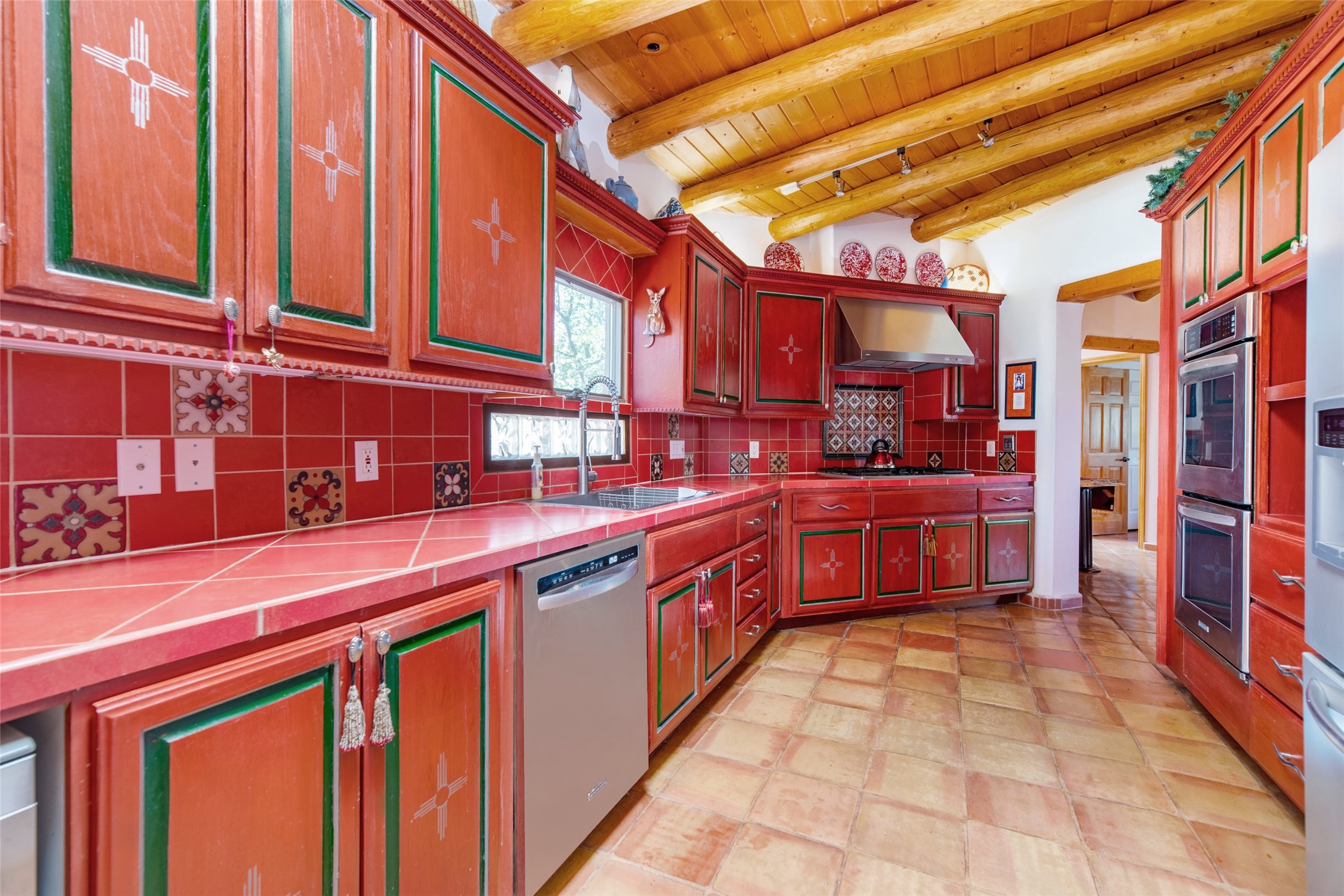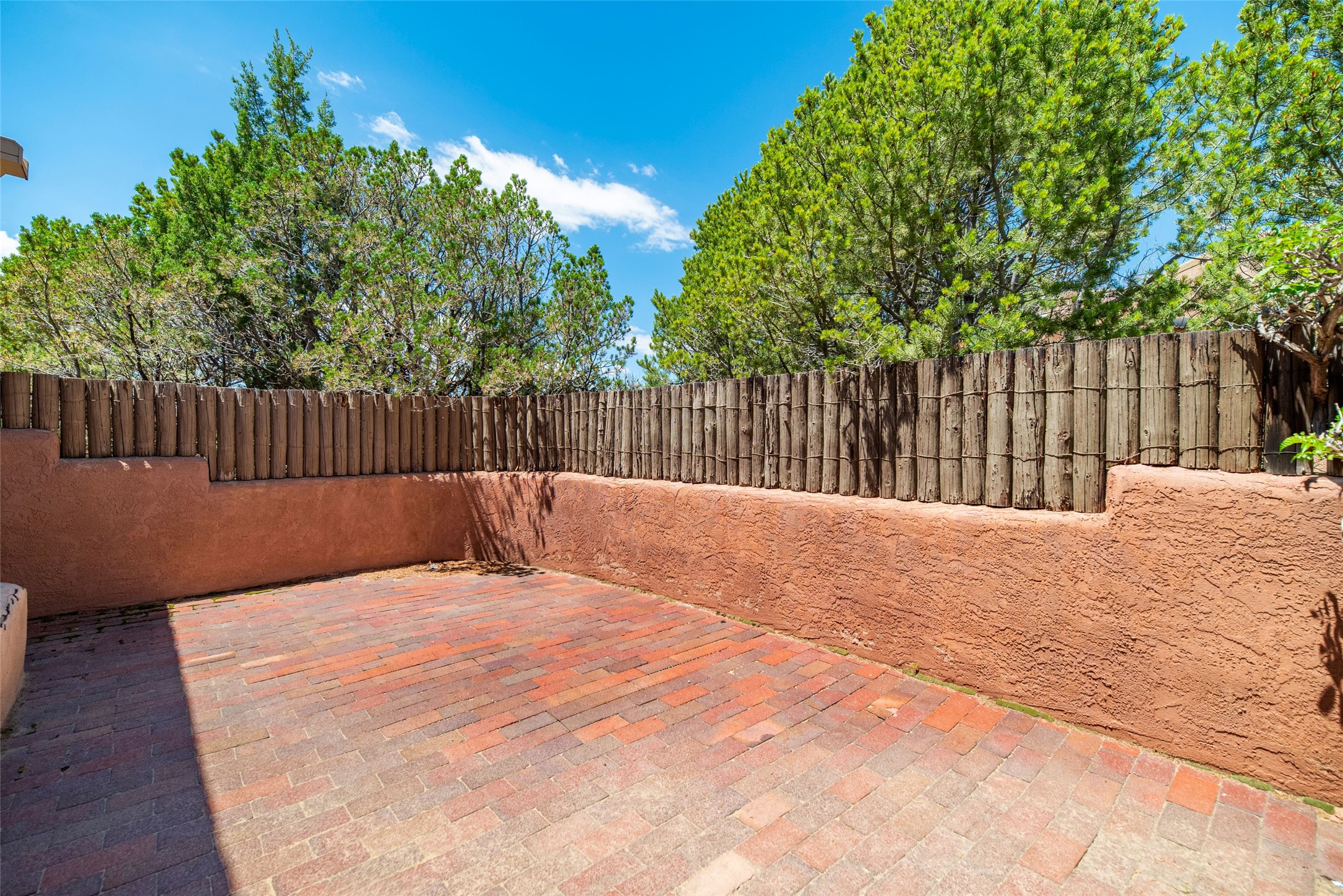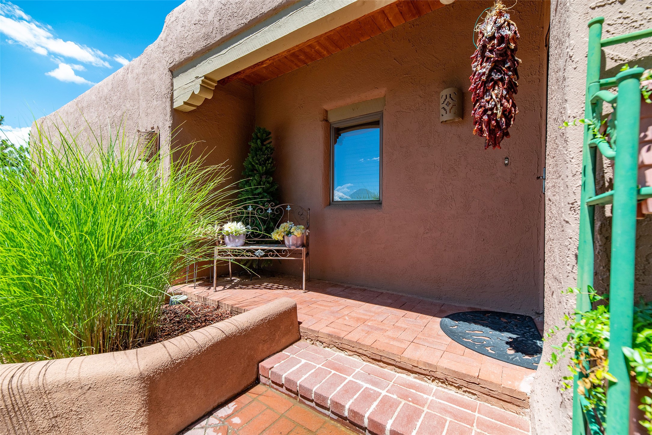 This home is in the prestigious Las Barrancas neighborhood on a property that is tree covered affording complete privacy to 3 walled courtyards, 3 steps up is a fourth ready to accommodate a large hot tub. This is one of the last modern homes constructed with authentic New Mexican materials - kivas, vigas,latillas, and saltillo tile floors. The 2-car garage is 1 1/2 stories with plenty of storage for an extra freezer and refrigerator. Entertaining is smooth and relaxing with the kitchen bar open to living & dining rooms. The 3 bedrooms, 2 baths, and laundry room -spacious & lovely! (No Interior Steps) It has Refrigerated A/C and forced air heat. Immerse yourself & your guests in the culture & vibe of the city of Santa Fe while living in a peaceful country setting. New stucco and roof maintenance. Easy access to downtown, Ten Thousand Waves, Hyde Park hiking/biking, and Ski Santa Fe!