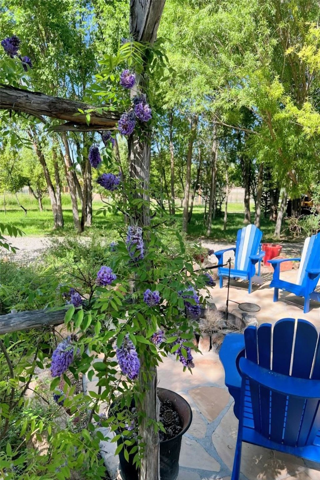 This rare Santa Fe County (Namb area), fenced horse property has water rights, mountain views, lots of shade trees, a barn, a shop, and a greenhouse. Situated on 1.389 lush, irrigated and fenced acres, this 3-bedroom, 2-bath, custom northern NM style home offers 2,196 sq ft with refrigerated-air, HVAC, ceiling fans, vaulted pine ceilings, exposed vigas, solid ash hardwood floors,and a spacious loft for hobbies or relaxing. Open living area features high-efficiency Acucraft wood-burning fireplace insert. Kitchen includes granite countertops, island, custom cabinets with pull-out shelving, wine storage, and quality appliances. Primary suite offers walk-in closets, spa-style bath with air-jetted tub, and natural travertine tile. Private guest suite includes separate exterior entrance and ensuite bath with travertine tile and cave horse art accent tiles by a local artist. Outdoor living features flagstone portals and walkways, ceiling fan, 1620 Trex deck, patio with fire pit, mature landscaping with drip irrigation, fruit trees, 1220 greenhouse, raised-bed garden, solar-powered gate, perimeter fencing (partial latilla), RV trailer parking and horse trailer parking. Horse amenities include grassy fenced turnout, 3035 three/four stall barn with partially insulated feed/tack room, huge area for hay storage, large corral, and ability to ride out from the property on shady trails (also Bureau of Land Management access within 3 miles). The 3045 metal building "dream shop" features three roll-up doors, reinforced slab for heavy-duty car lift installation, 110V and 220V electricity, workbench with lower shelf, generous fluorescent lighting, and two overhead piping systems (shop vacuum and compressor). All of this plus deeded acequia water rights and a private well. This unique offering--just off the High Road to Taos--is set against beautiful views of Sacred Heart Church, Santa Fe Ski Basin, and Santa Fe Baldy, just minutes from Pojoaque and an easy drive to Santa Fe and Los Alamos. Bring all of your animals, and move right in! Come visit and you will want to stay forever!
