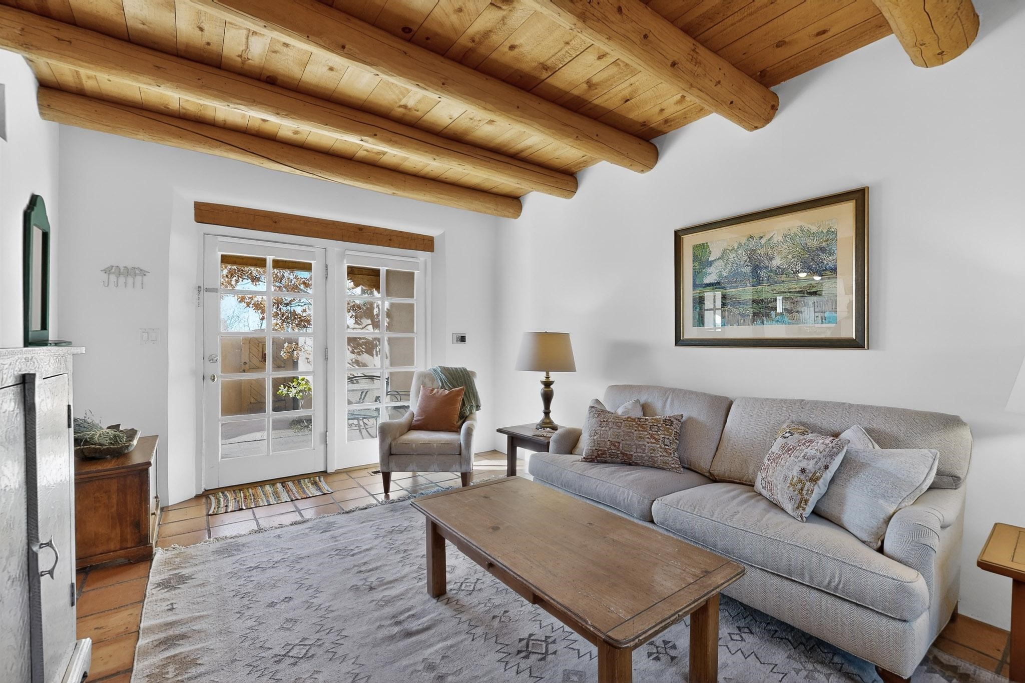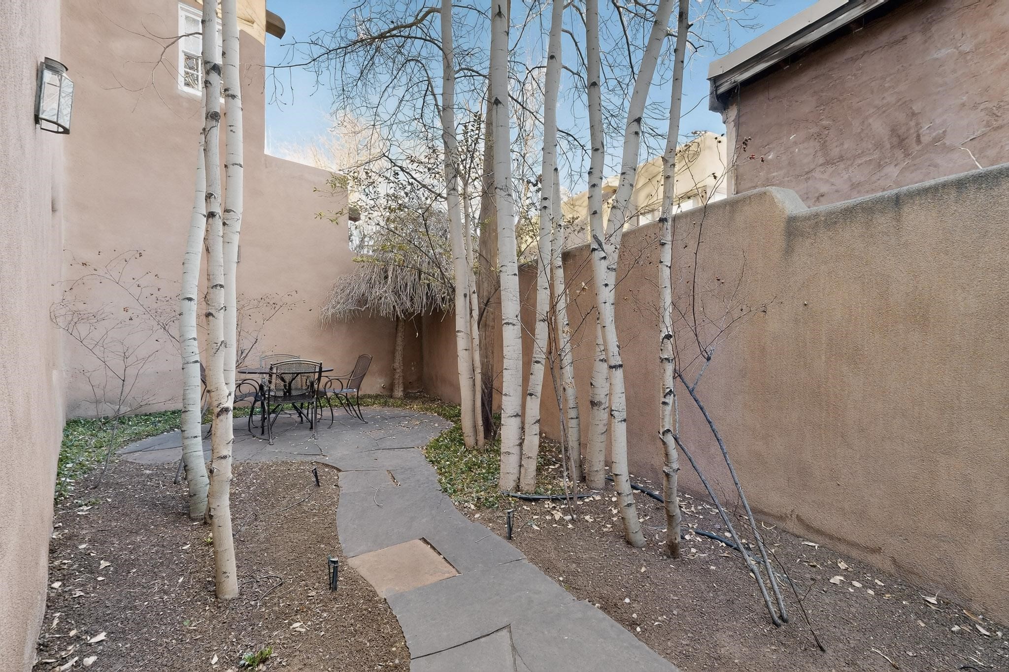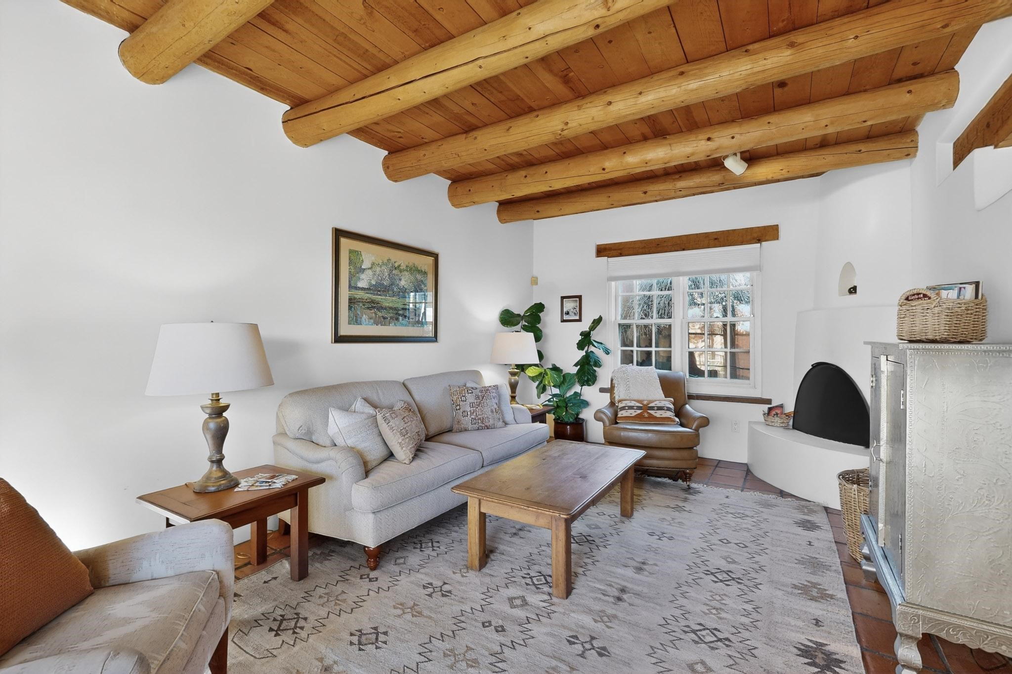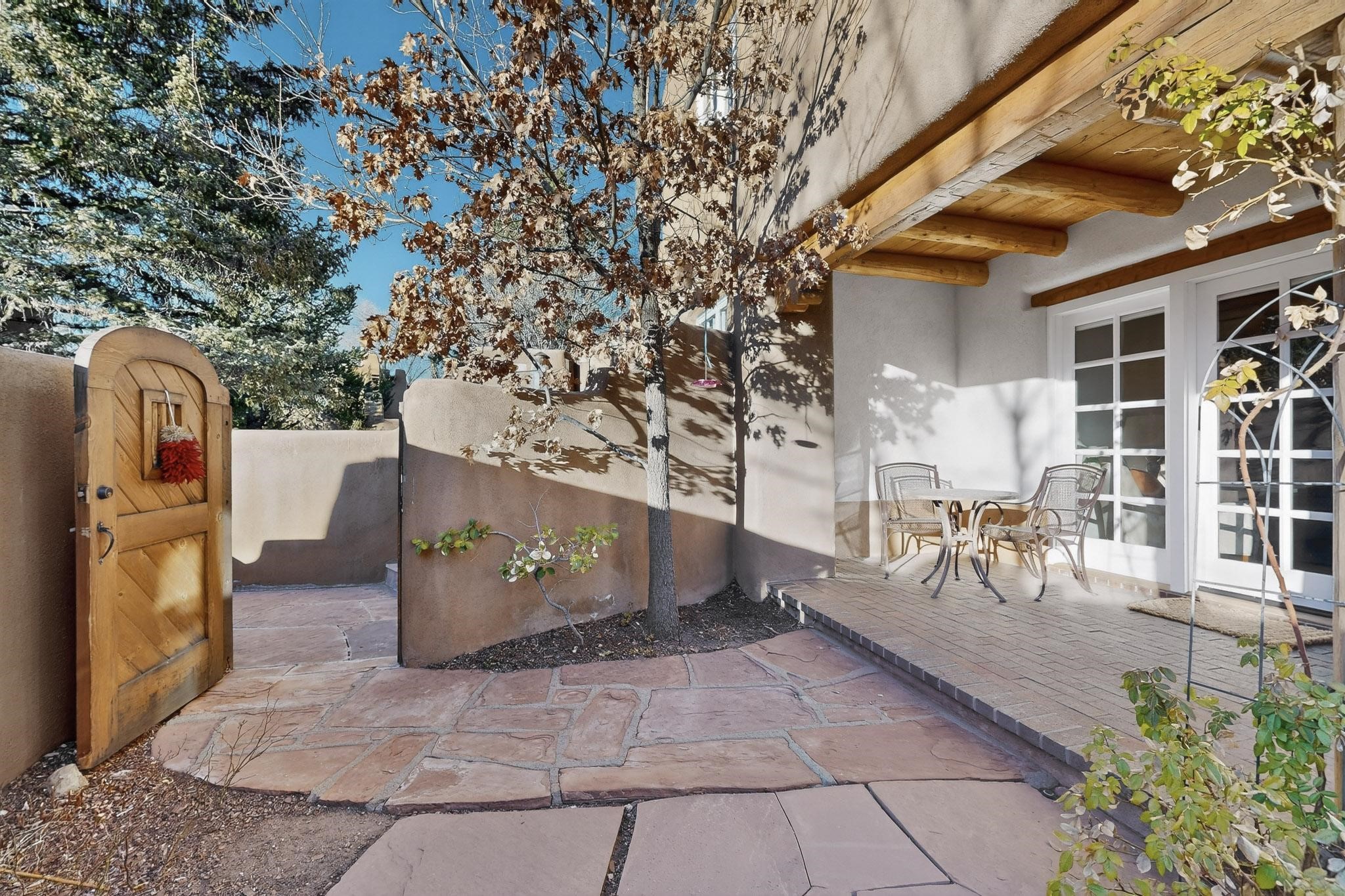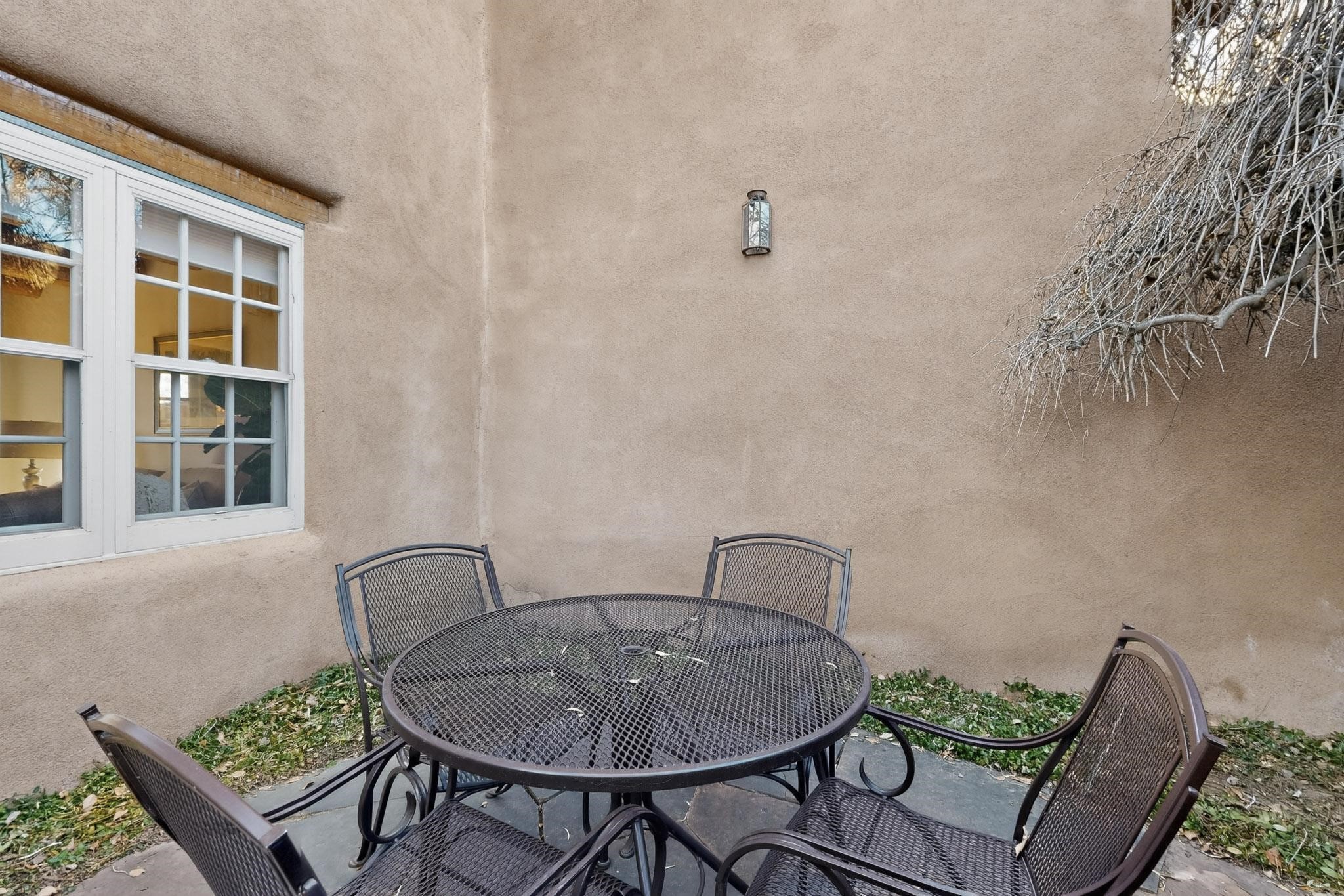 Santa Fe architectural details plus management to tend to every detail inside and out of this quarterownership property. Very nice two story condo, two bedrooms, each with private bath. Especially well situated on the property, this home enjoys sunset and city lights views from the upstairs deck. Walk through a handcrafted gate at the front entry courtyard and into a wel furnished and impeccably maintained home, completely cared for by the condominium owners association staff. Inside are smooth plastered wals, kiva fireplaces in the living room and both bedrooms, ceiling vigas throughout, Saltillo tile and wide plank pine floors, and Talavera tile kitchen and baths. There's a completely enclosed landscaped back yard with gas grill and patio furnishings for outdoor dining and quiet relaxation. The HOA provides dedicated on-site management, all building and equipment maintenance, furnishings, landscaping, cleaning, and an established rental program. Quarter-share interest available in unit 11 of Campanilla Compound.