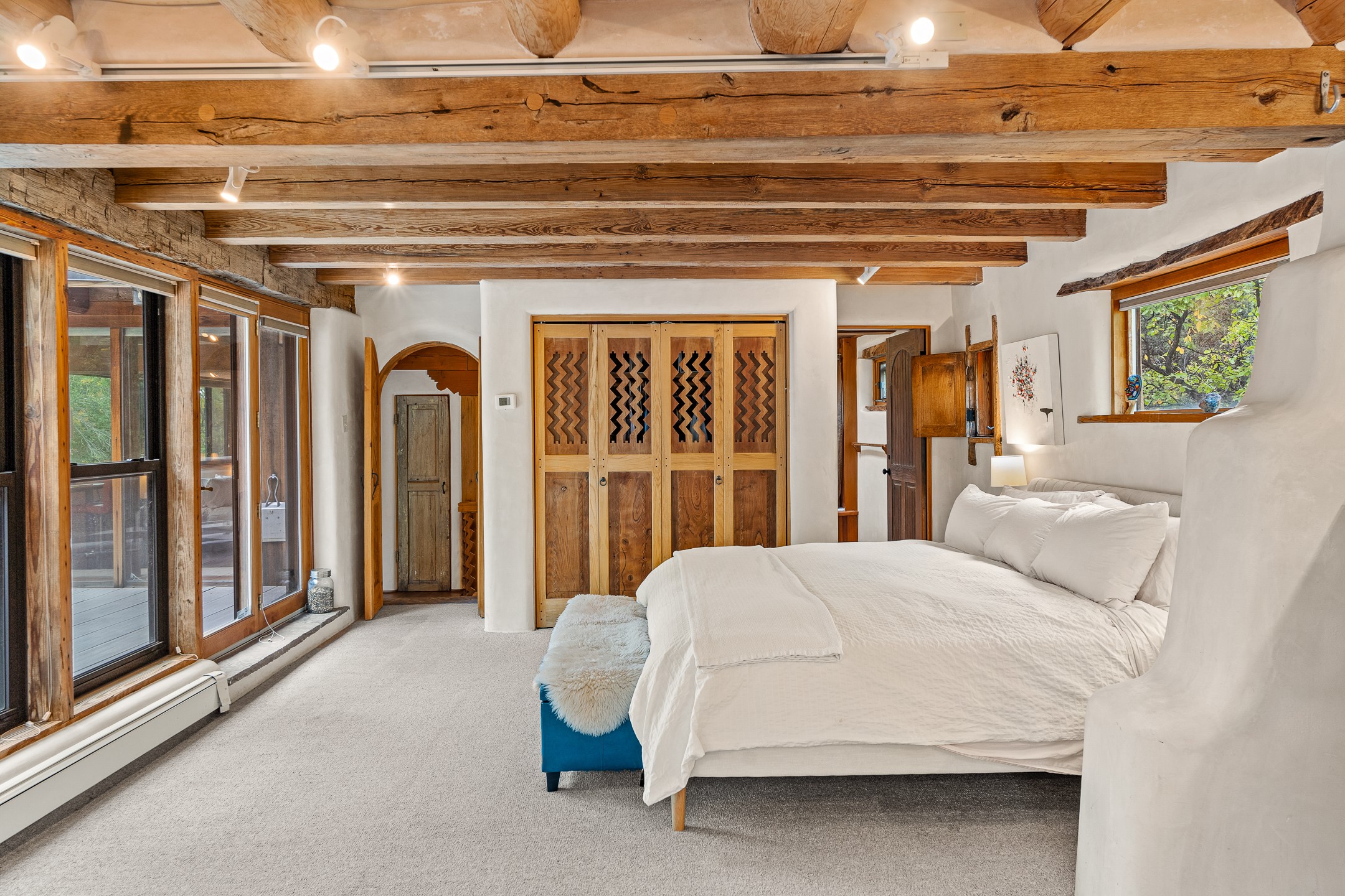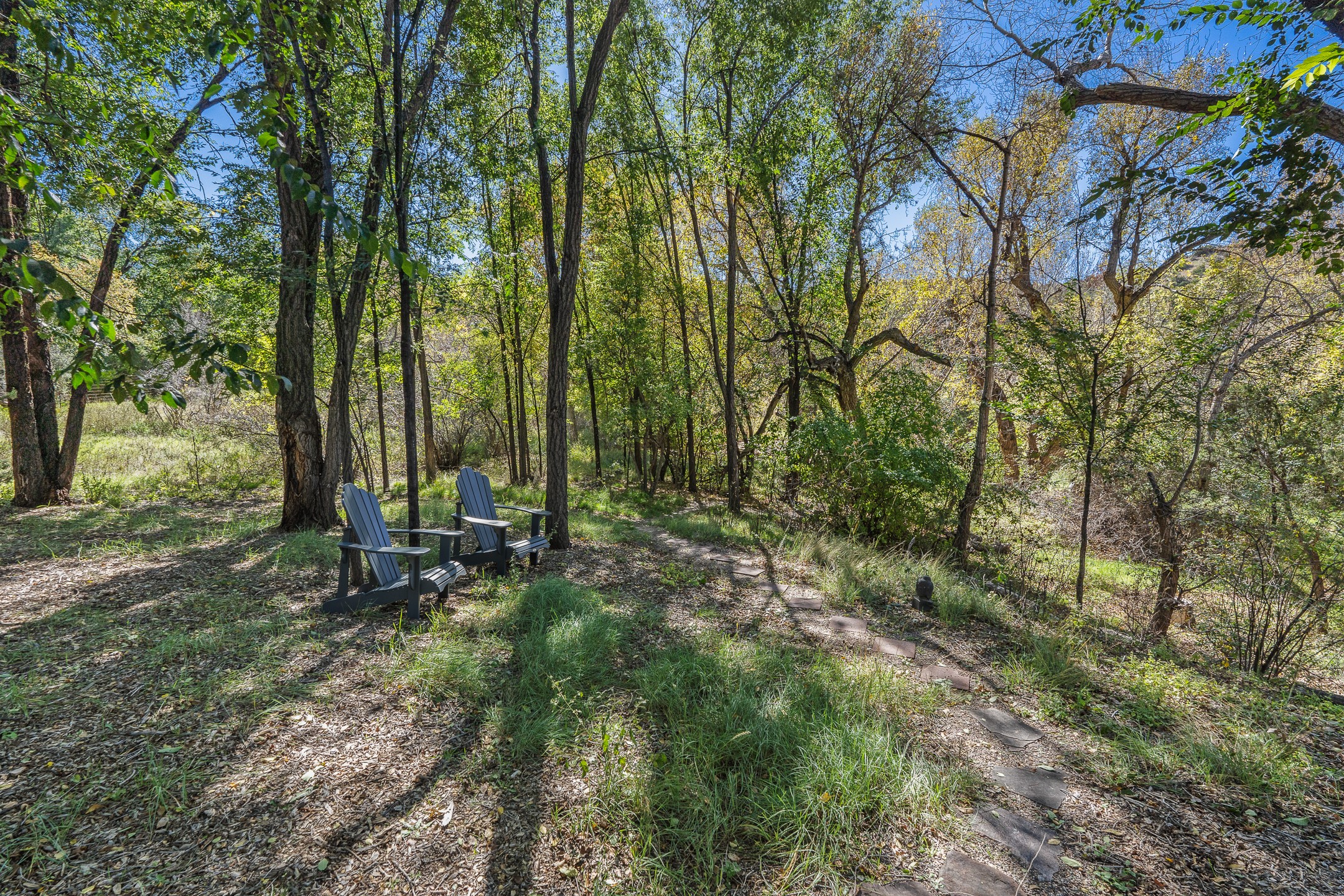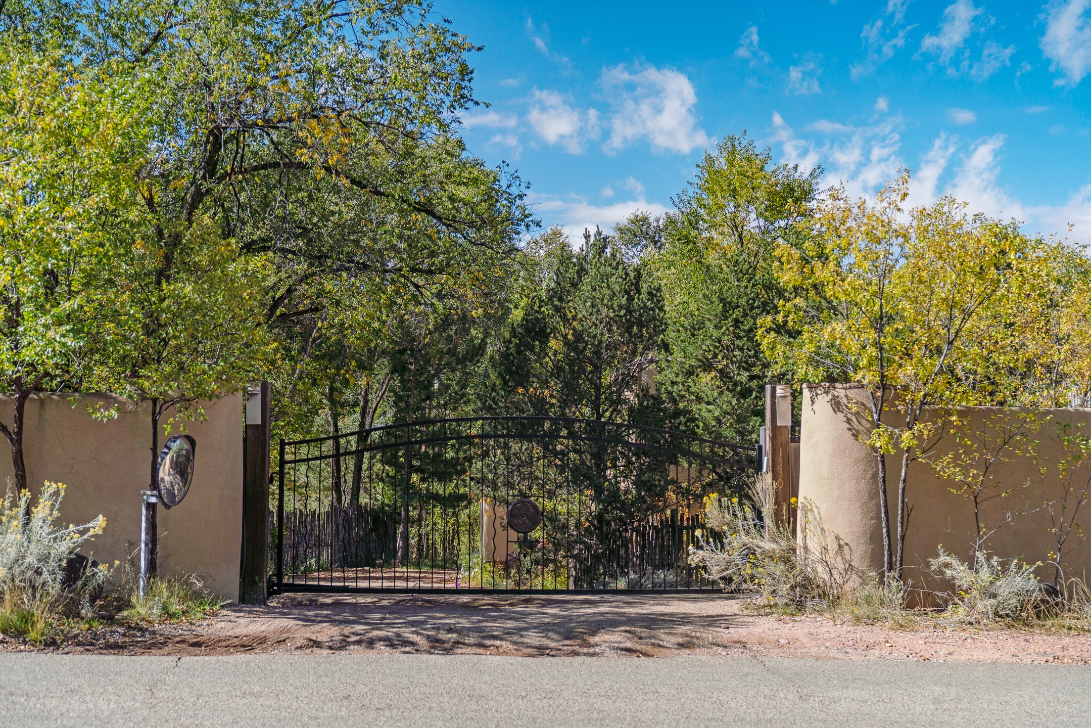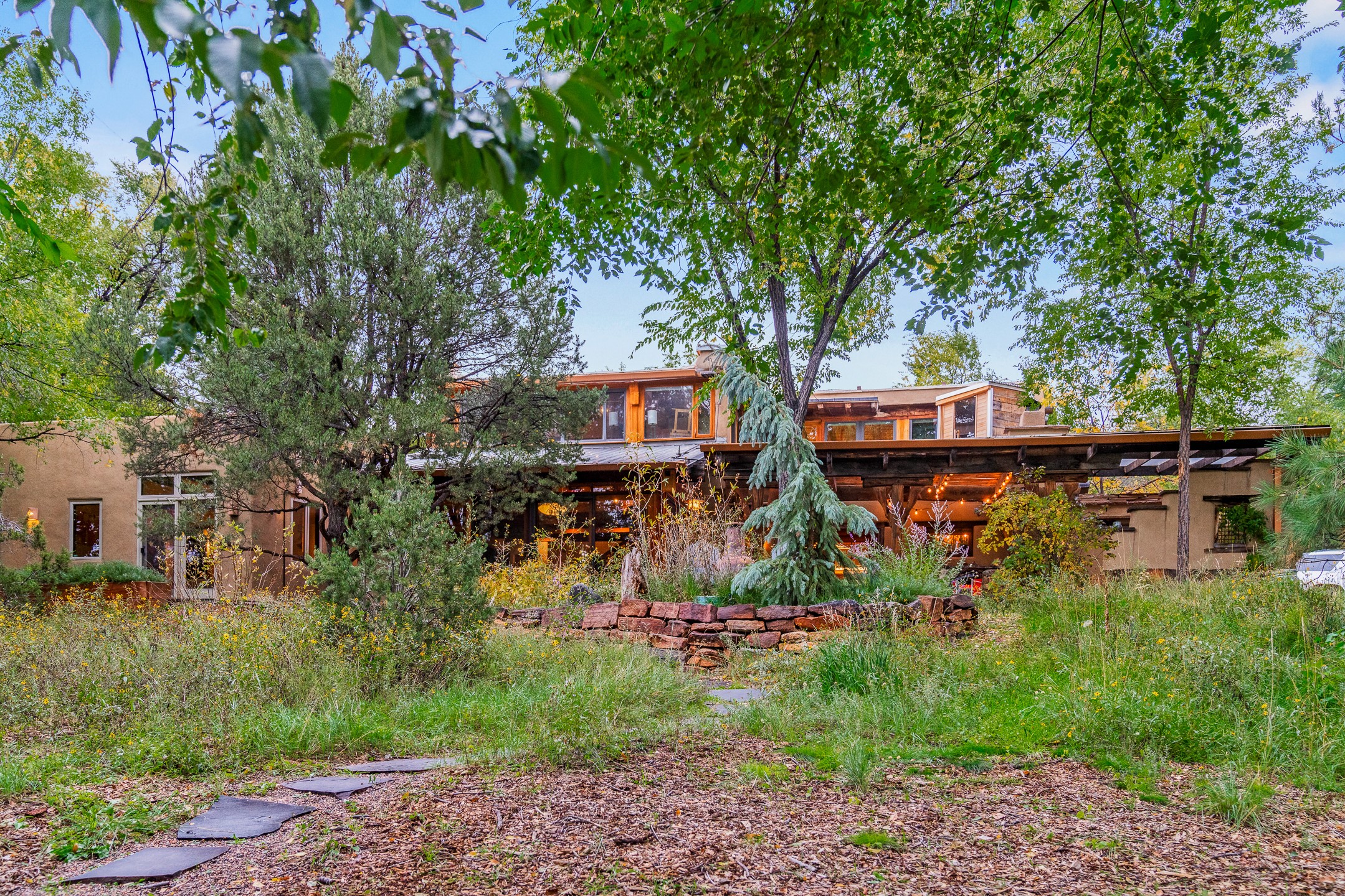 Location, Location--and Priced Below Appraisal - Featured in The Santa Fe New Mexican's December Real Estate Guide, this 3,366 sq. ft. adobe sanctuary in Tesuque is a rare fusion of artistry, nature, and architectural integrity. Just 8 minutes from the Plaza and nestled on 0.77 lush acres beside the seasonal Tesuque Creek, the property offers serenity, soul, and sustainability. The land has been gently restored through regenerative landscaping--reintroducing native wildflowers, birds, and wildlife pathways that honor the land's natural rhythms. Built by master Santa Fe artisans, the 3BD/3.5BA home celebrates timeless design with flagstone floors, vigas, split cedar ceilings, and walls that shift organically from adobe to stone. At the heart is the open kitchen and dining area, renovated with natural stone counters and designed for entertaining. French doors open to a covered portal with a natural gas firepit for gathering under the stars or summer monsoons. Two unique living rooms offer distinct experiences:- One, originally crafted for Japanese tea ceremony, features a pitched ceiling and a glass wall that frames the forested garden.- The second centers around a dramatic fireplace and leads to a ground-level primary suite with cedar-lined closet and fenced garden with fruit trees and pollinator plants.Upstairs are two guest suites, each with en suite baths; one includes a private deck and infrared sauna--an elevated retreat in the treetops.Extras include an automatic gate, a contemplative labyrinth, a private well with 3-acre feet of water rights, EV charger, handcrafted workshop, and arroyo access to nearby hiking and the Lower Windsor Trailhead.1330 Bishops Lodge is a soulful, artful expression of intentional living.
