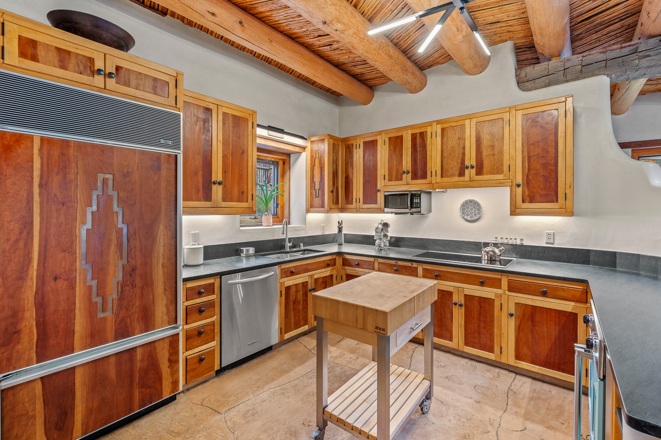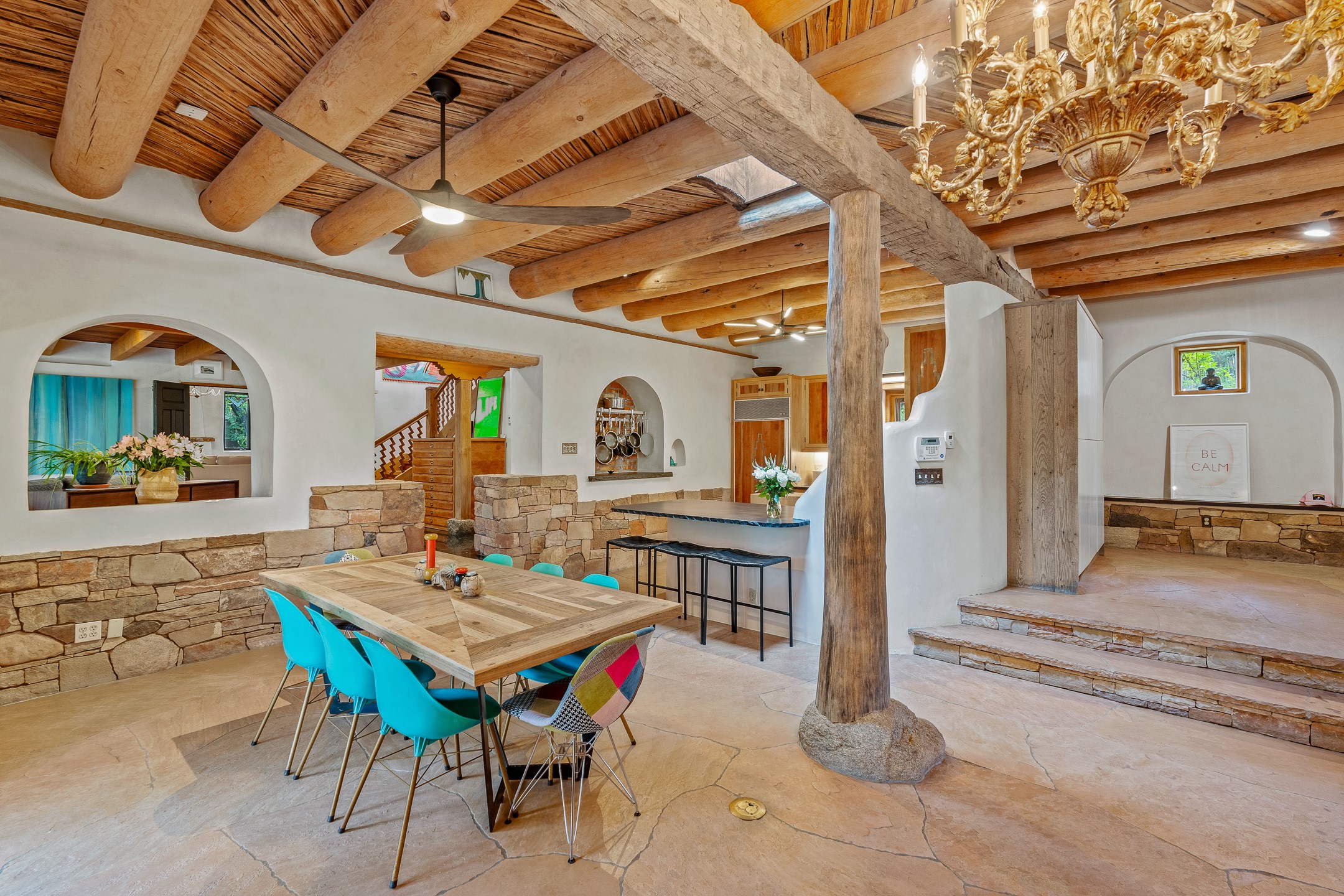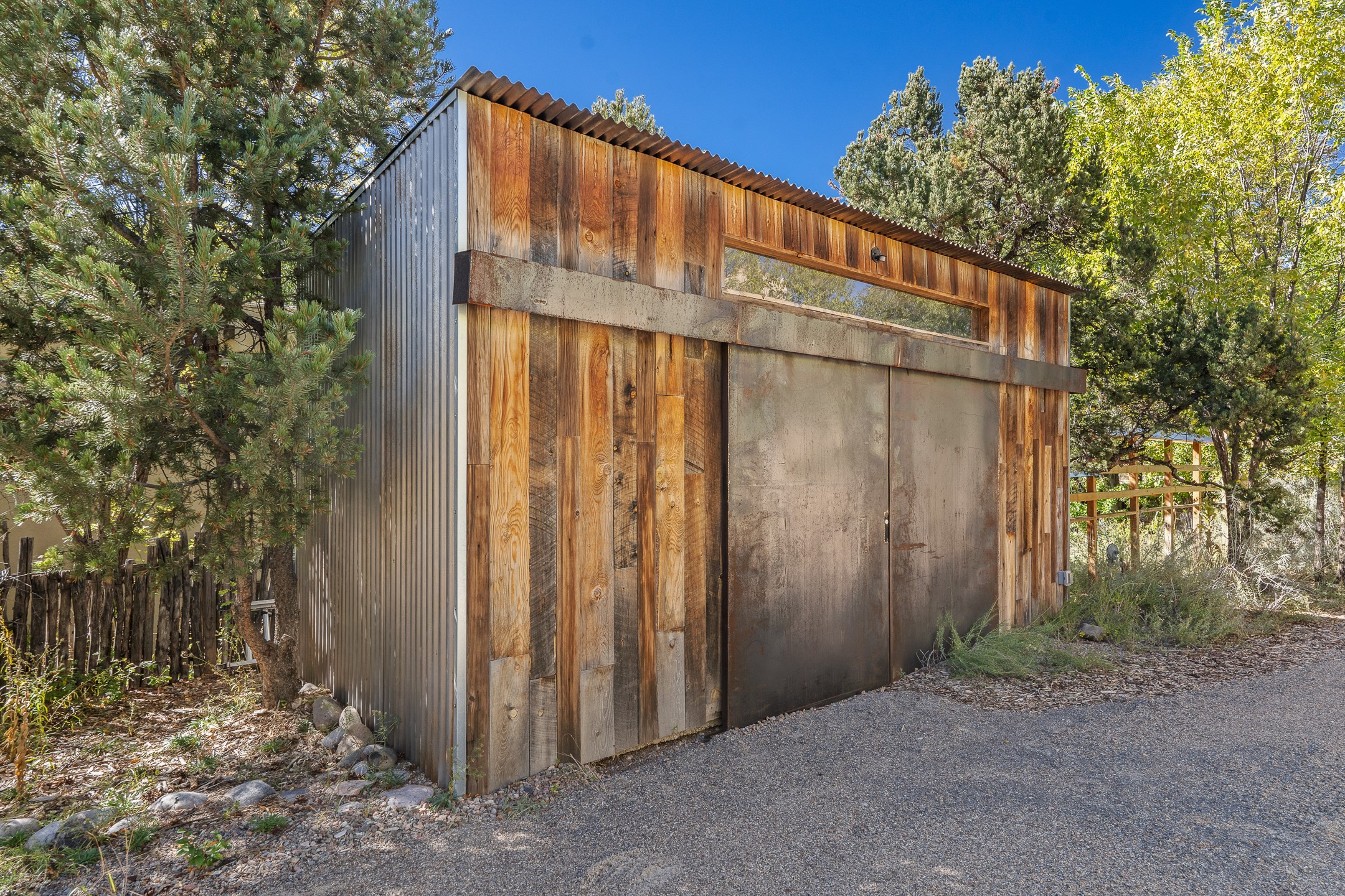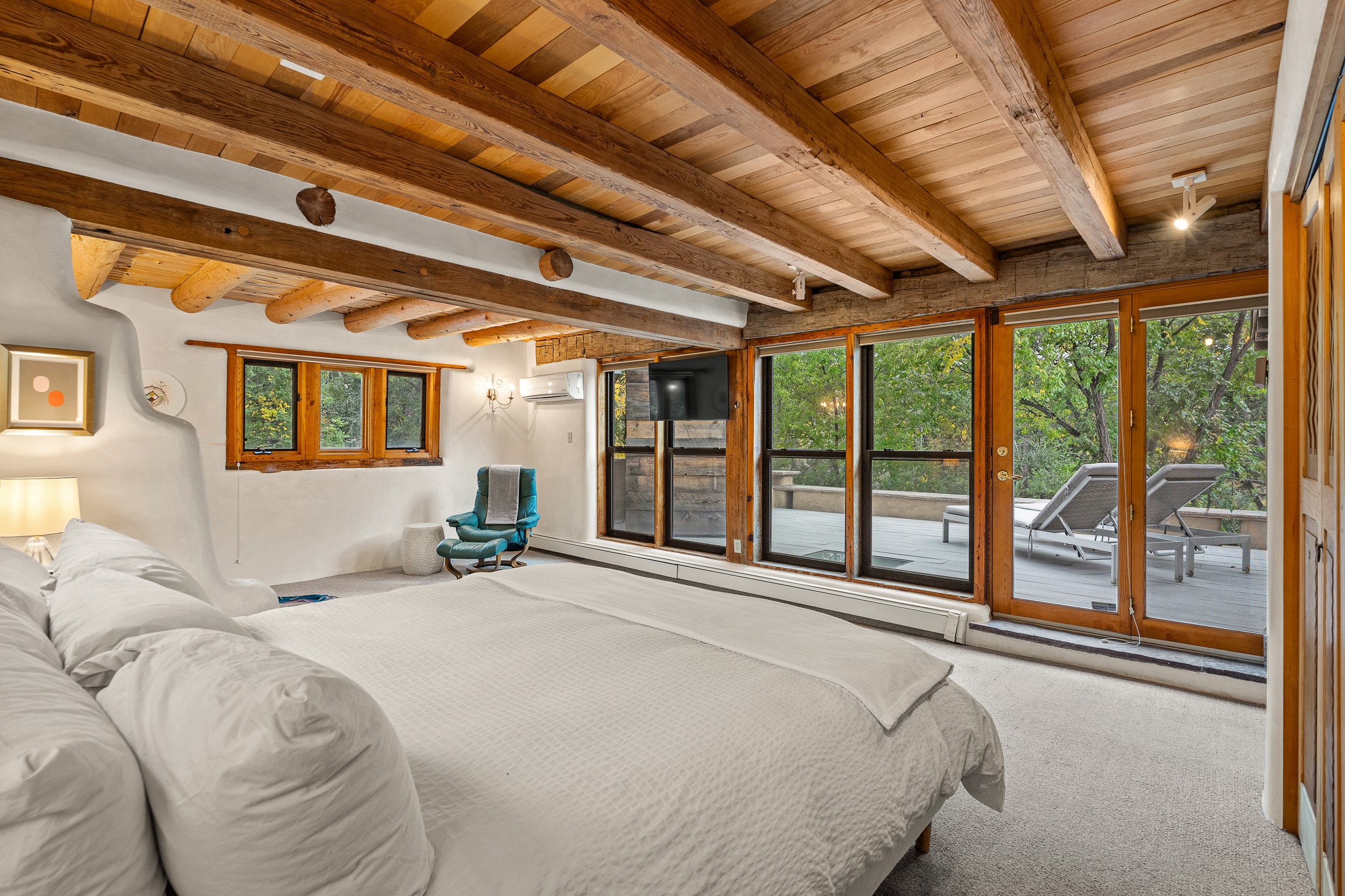 Location, Location--and Priced Below Appraisal - Featured in The Santa Fe New Mexican's December Real Estate Guide, this 3,366 sq. ft. adobe sanctuary in Tesuque is a rare fusion of artistry, nature, and architectural integrity. Just 8 minutes from the Plaza and nestled on 0.77 lush acres beside the seasonal Tesuque Creek, the property offers serenity, soul, and sustainability. The land has been gently restored through regenerative landscaping--reintroducing native wildflowers, birds, and wildlife pathways that honor the land's natural rhythms. Built by master Santa Fe artisans, the 3BD/3.5BA home celebrates timeless design with flagstone floors, vigas, split cedar ceilings, and walls that shift organically from adobe to stone. At the heart is the open kitchen and dining area, renovated with natural stone counters and designed for entertaining. French doors open to a covered portal with a natural gas firepit for gathering under the stars or summer monsoons. Two unique living rooms offer distinct experiences:- One, originally crafted for Japanese tea ceremony, features a pitched ceiling and a glass wall that frames the forested garden.- The second centers around a dramatic fireplace and leads to a ground-level primary suite with cedar-lined closet and fenced garden with fruit trees and pollinator plants.Upstairs are two guest suites, each with en suite baths; one includes a private deck and infrared sauna--an elevated retreat in the treetops.Extras include an automatic gate, a contemplative labyrinth, a private well with 3-acre feet of water rights, EV charger, handcrafted workshop, and arroyo access to nearby hiking and the Lower Windsor Trailhead.1330 Bishops Lodge is a soulful, artful expression of intentional living.
