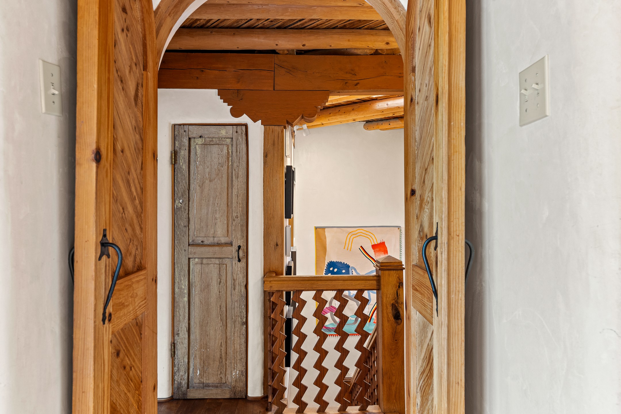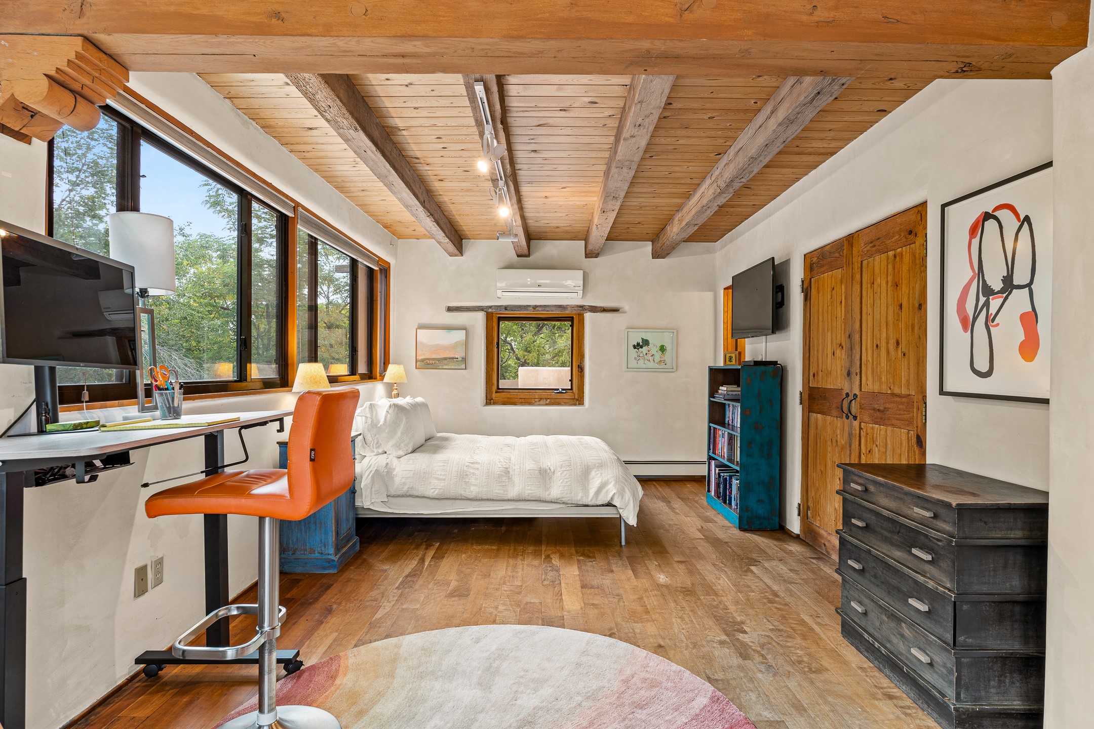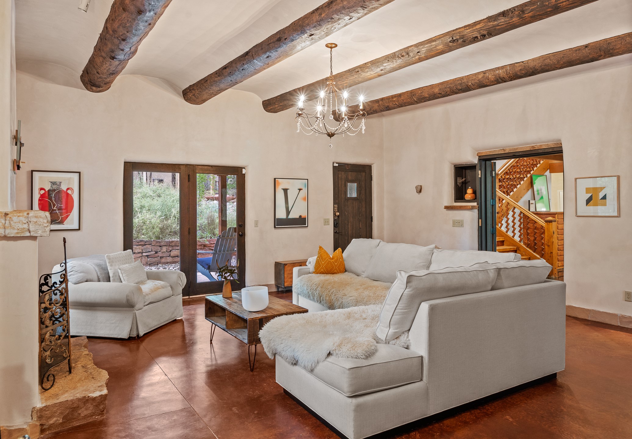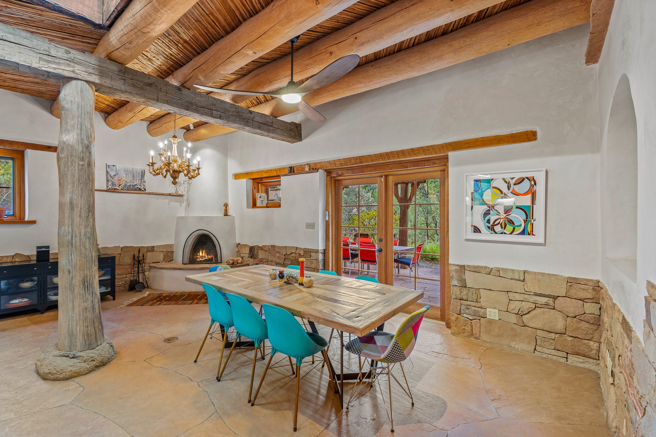 Location, Location--and Priced Below Appraisal - Featured in The Santa Fe New Mexican's December Real Estate Guide, this 3,366 sq. ft. adobe sanctuary in Tesuque is a rare fusion of artistry, nature, and architectural integrity. Just 8 minutes from the Plaza and nestled on 0.77 lush acres beside the seasonal Tesuque Creek, the property offers serenity, soul, and sustainability. The land has been gently restored through regenerative landscaping--reintroducing native wildflowers, birds, and wildlife pathways that honor the land's natural rhythms. Built by master Santa Fe artisans, the 3BD/3.5BA home celebrates timeless design with flagstone floors, vigas, split cedar ceilings, and walls that shift organically from adobe to stone. At the heart is the open kitchen and dining area, renovated with natural stone counters and designed for entertaining. French doors open to a covered portal with a natural gas firepit for gathering under the stars or summer monsoons. Two unique living rooms offer distinct experiences:- One, originally crafted for Japanese tea ceremony, features a pitched ceiling and a glass wall that frames the forested garden.- The second centers around a dramatic fireplace and leads to a ground-level primary suite with cedar-lined closet and fenced garden with fruit trees and pollinator plants.Upstairs are two guest suites, each with en suite baths; one includes a private deck and infrared sauna--an elevated retreat in the treetops.Extras include an automatic gate, a contemplative labyrinth, a private well with 3-acre feet of water rights, EV charger, handcrafted workshop, and arroyo access to nearby hiking and the Lower Windsor Trailhead.1330 Bishops Lodge is a soulful, artful expression of intentional living.