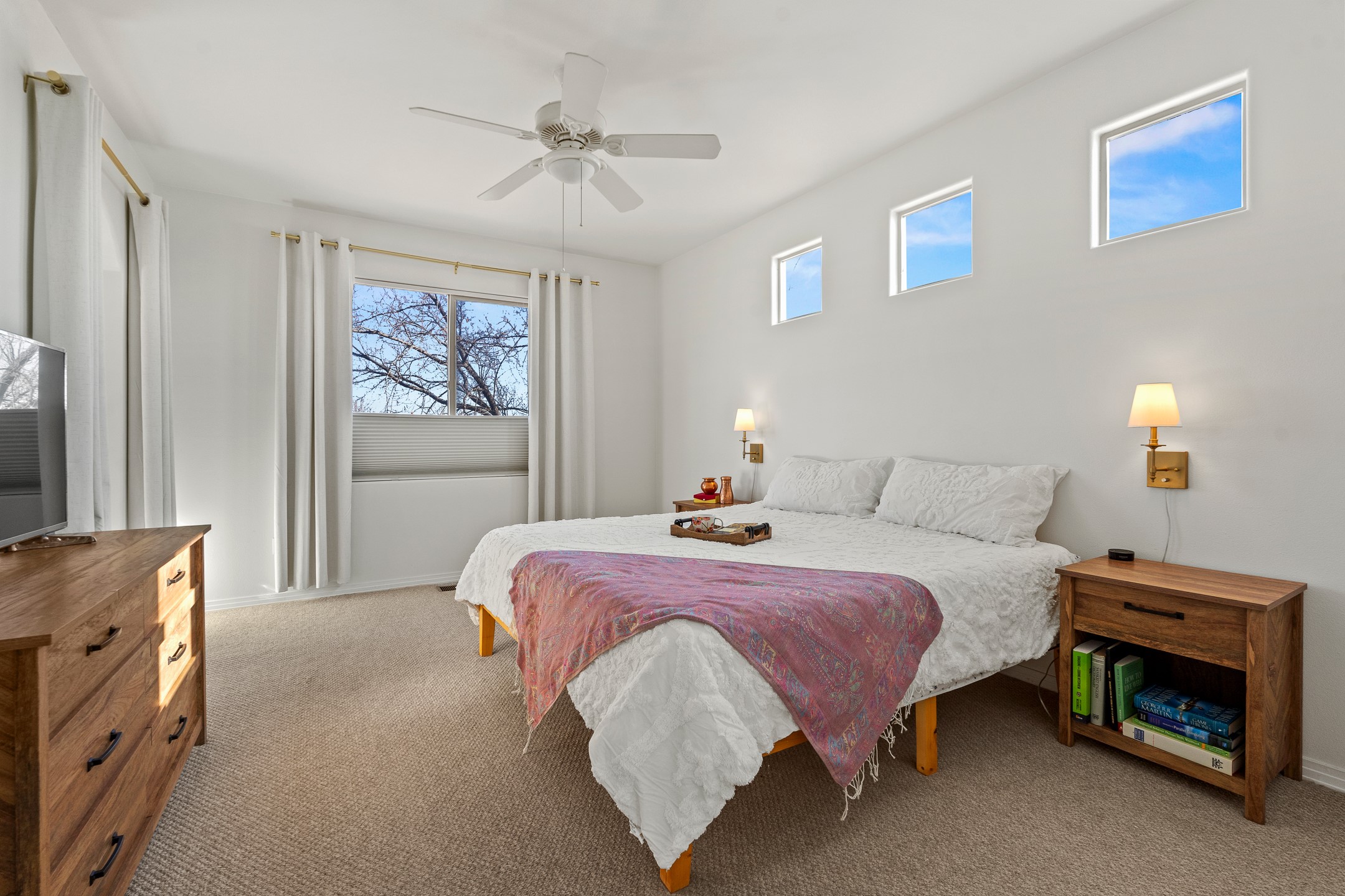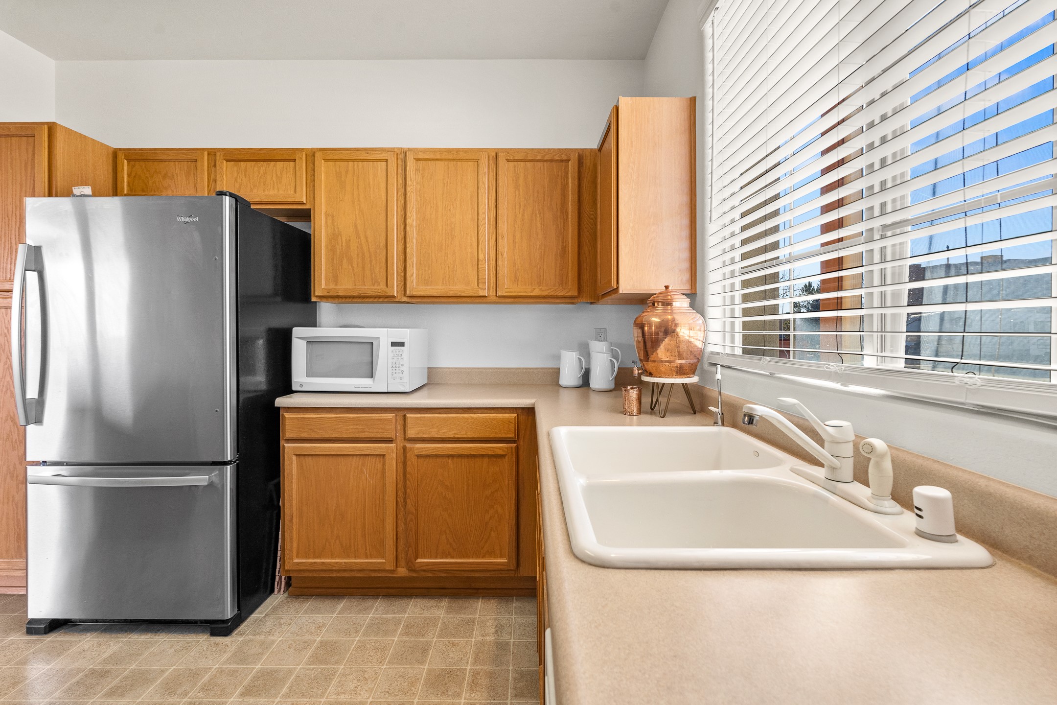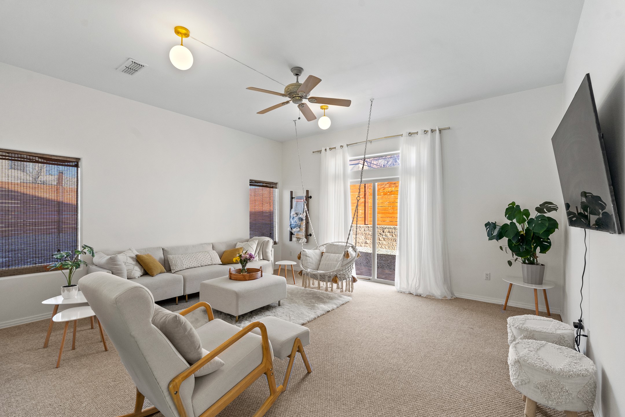 Set on a prime corner lot in one of the area's most desirable neighborhoods, this beautifully maintained home offers an exceptional blend of space, comfort, and Santa Fe living--with no HOA dues. Conveniently located near schools, parks, and community amenities, it's ideal for both growing households and those seeking an established, welcoming setting. The 1,856-square-foot two-story residence features 3 bedrooms, 2.5 baths, and a 2-car garage. Inside, soaring ceilings and abundant natural light create an immediate sense of openness. The spacious kitchen is well designed for daily living and entertaining, with generous counter space, a gas range, and easy flow to the dining area. Sliding doors lead to a large, fenced large backyard--perfect for outdoor dining, gardening, play, or relaxed gatherings. The inviting living room is anchored by a striking two-sided gas fireplace and enhanced by soft window treatments that add warmth and elegance. The main level also includes a convenient powder room, a generous laundry room with direct backyard access, and ample storage. The attached two-car garage offers space for vehicles, gear, and storage. Upstairs, three light-filled bedrooms provide comfort and privacy. The primary suite enjoys views of the Sangre de Cristo Mountains and features an en-suite bath with dual vanities, soaking tub, and walk-in shower. Two additional bedrooms share a well-appointed hall bath, ideal for guests, family, or a home office. An expansive upper-level deck is a true highlight--perfect for morning coffee, sunset skies, and Santa Fe's star-filled nights. Move-in ready and thoughtfully designed, 4615 Sunset Ridge offers generous indoor-outdoor living in a sought-after location. 4615 Sunset Ridge belongs on your must-see list.