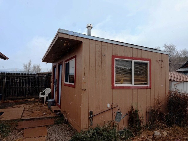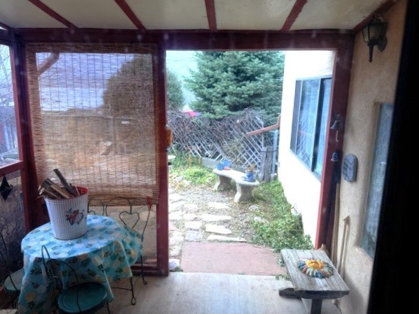 If you are looking for peace and quiet, lovely views that include sunsets, come and look at this house! Enjoy the joys of small-town life in this charmer! Situated east of the center of Pecos and the Pecos River in East Pecos, there are mountain views from the property, and the surrounding properties have beautiful rock formations. Two bedroom, one bath, large living room which is a later addition to the main house. The main house has a second living area with dining area. The country chicken sink is the focal point of the kitchen. The older/smaller living area could potentially be turned into a third bedroom. New laminate flooring in the whole house, new toilet, and new hot water in 2022-23. Partially enclosed front porch. A large building in the back is divided into two spaces, a studio on one side and storage on the other. It has electricity, and heating on the right (larger) side. The property is completely fenced, with an apple tree, dwarf crabapple, and grape vines.