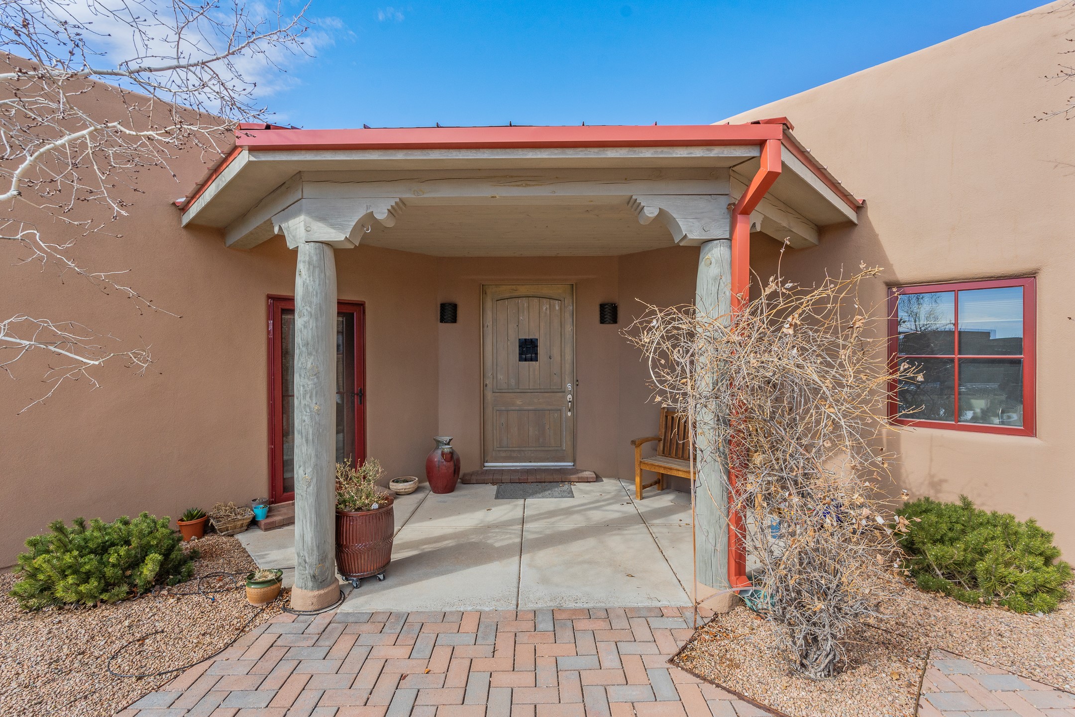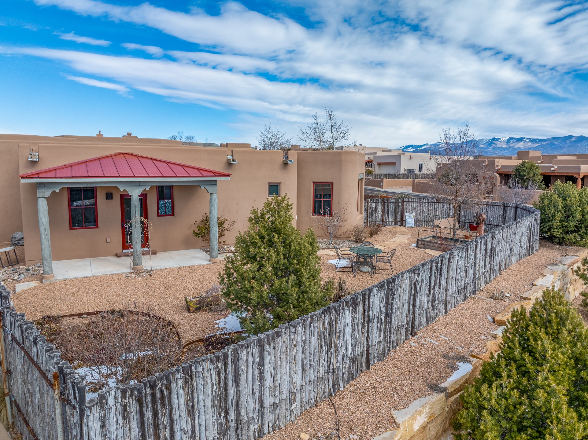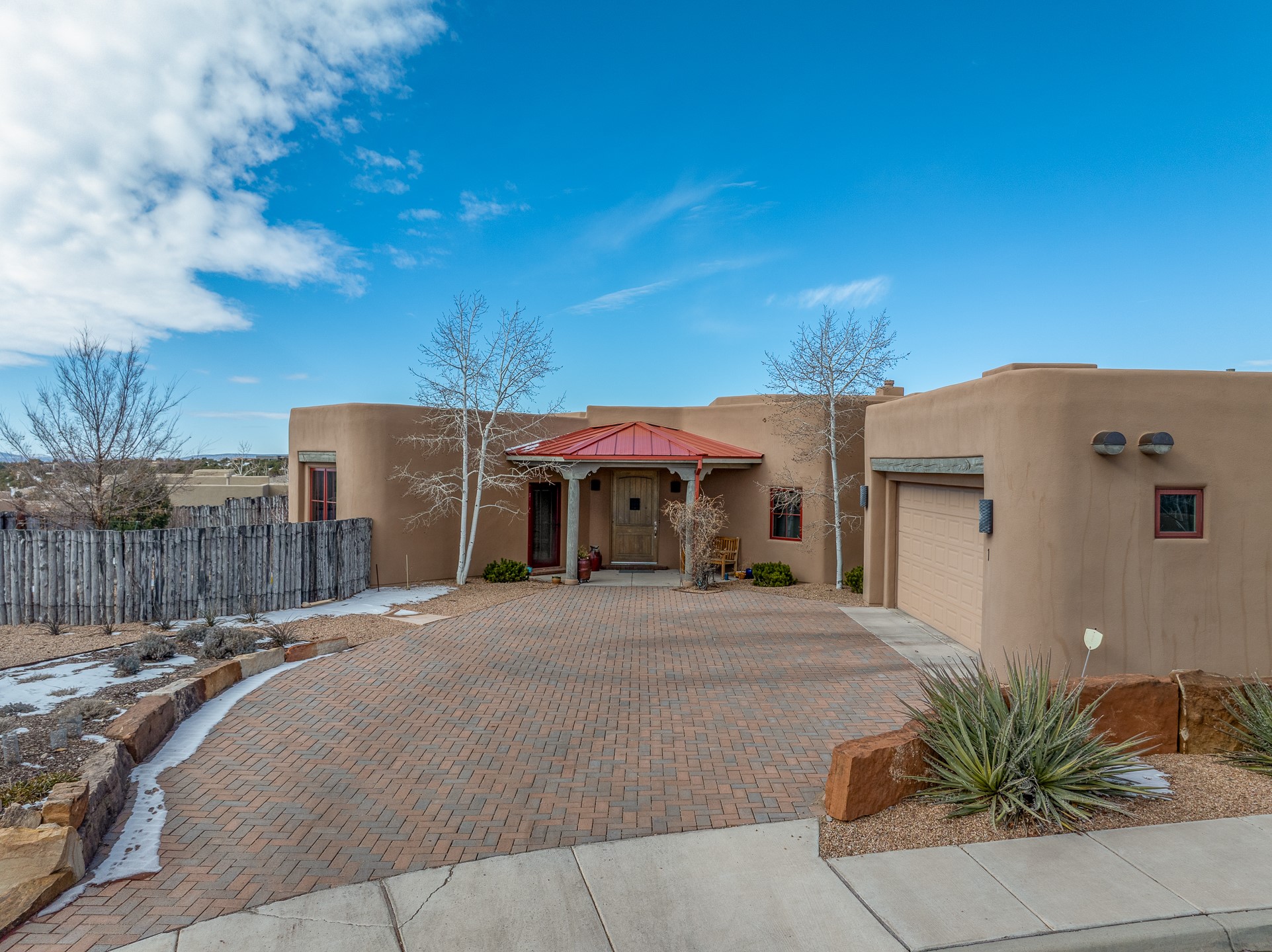 Sophisticated soft-contemporary living awaits in this beautifully designed single-level home, ideally situated on a desirable corner lot in the vibrant community of Aldea de Santa Fe. Built in 2014, this thoughtfully planned residence offers approximately 2,743 square feet of elegant living space, including three bedrooms, three baths, and a two-car garage.The well-designed floor plan provides excellent separation of spaces. A generous guest bedroom features an en-suite bath, while a versatile office or third bedroom includes a private exterior entrance--perfect for guests, creative pursuits, or a home office. Stone flooring throughout creates a clean, modern aesthetic, complemented by forced air heating and air conditioning for year-round comfort.The open-concept living, dining, and kitchen areas offer a seamless yet well-defined flow. The living room is highlighted by exposed beams, a gas fireplace, and tall windows that flood the space with natural light. The spacious kitchen is appointed with knotty alder cabinetry, extensive solid-surface countertops for food preparation, a stainless-steel range with exterior venting, a center island, and a built-in desk area--ideal for everyday living and entertaining.The primary suite serves as a serene retreat, featuring two spacious walk-in closets and a spa-inspired bath. Light-filled living and dining areas open effortlessly to the rear patio, where mature landscaping, and a charming peek-a-boo view of the Jemez Mountains create a tranquil outdoor setting for relaxation or gatherings.Aldea de Santa Fe is known for its village-style charm and active lifestyle, offering residents miles of walking trails, expansive shared open space, a community center, and tennis, basketball, and bocce courts. Annual art tours, community garage sales, and a variety of social clubs foster a welcoming and connected neighborhood atmosphere.This home presents a rare opportunity to enjoy refined comfort, thoughtful design, and a true sense of community--Santa Fe living at its best.
