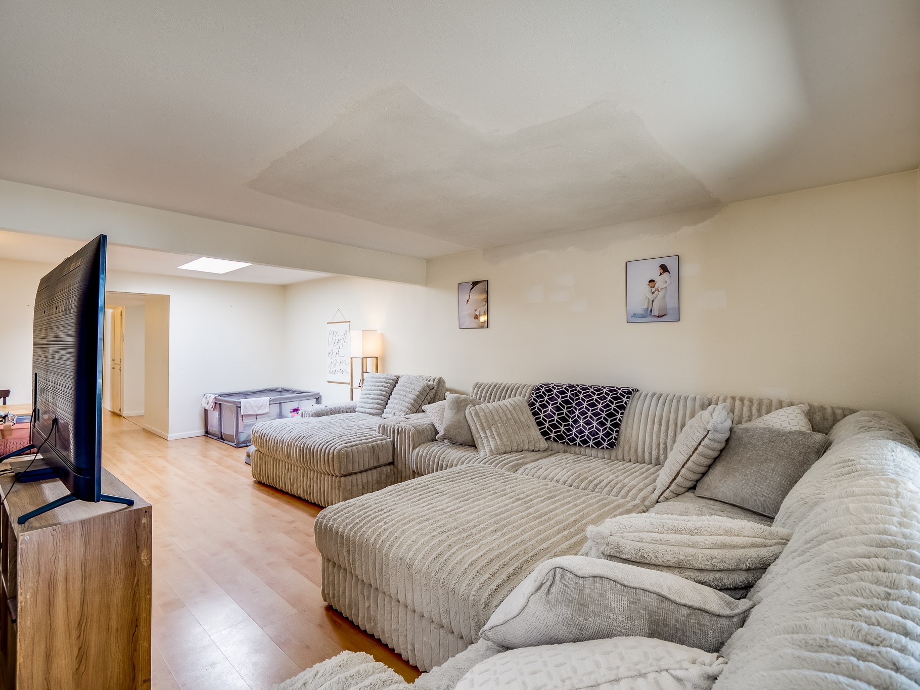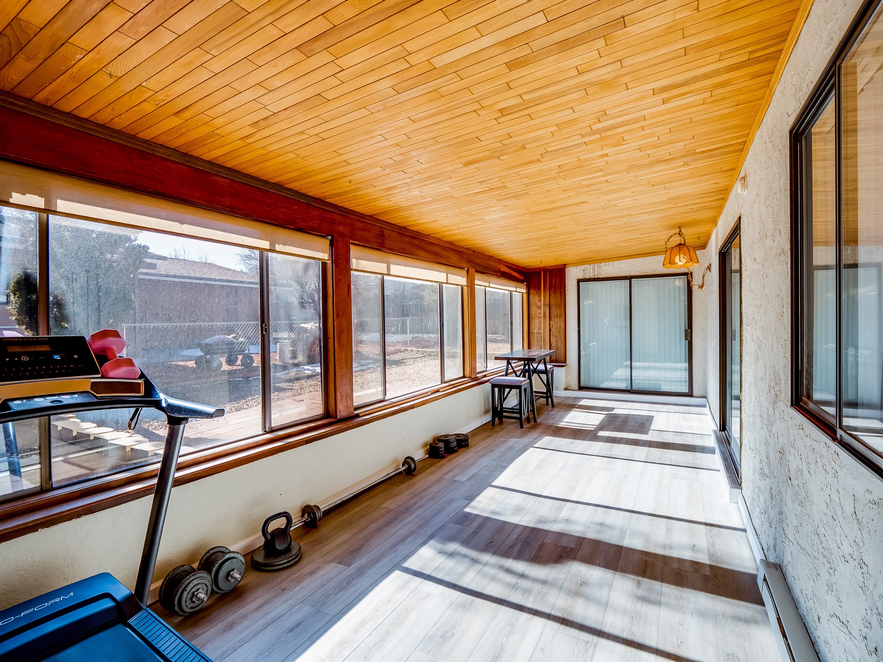 This charming single-story home in White Rock offers beautiful xeriscape landscaping and a welcoming layout. Step through the front entrance onto laminate wood floors that extend through the main living areas. A coat closet and convenient access to the two-car garage greet you at the entry. The spacious living room features a large front-facing window and a skylight, filling the space with natural light. Adjacent to the living room is a dining space with sliders leading to a bright sunroom with new laminate wood flooring. The bonus room, with the same new floors, offers additional space and leads to the backyard, with another access point to the garage for convenience. The galley-style kitchen boasts wood cabinets with glass inlays, hard surface countertops, tile flooring, stainless steel appliances, and a gas oven/range. Another skylight brightens up this functional space. Down the hallway, you'll find a large guest room with a double-door walk-in closet and sliders leading to the sunroom, a guest bathroom with a single sink vanity and a tiled shower/tub, and an open laundry space with upper cabinets that could easily be enclosed. The spacious primary en-suite includes a walk-in closet and sliders to the sunroom, while the primary bathroom has a single sink vanity and tiled shower/tub. The sunroom is surrounded by windows, offering a perfect view of the fenced-in backyard with its low-maintenance landscaping, mature trees, and room to create your dream garden or outdoor living area. With parks, trails, shopping, and restaurants just a short distance away, this home is in an ideal location. Come take a tour today!