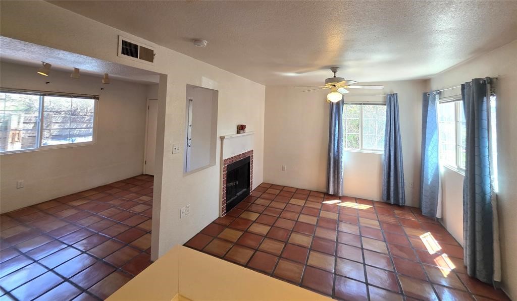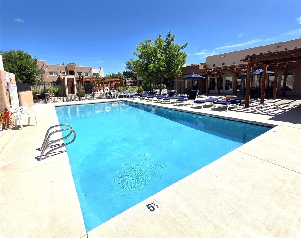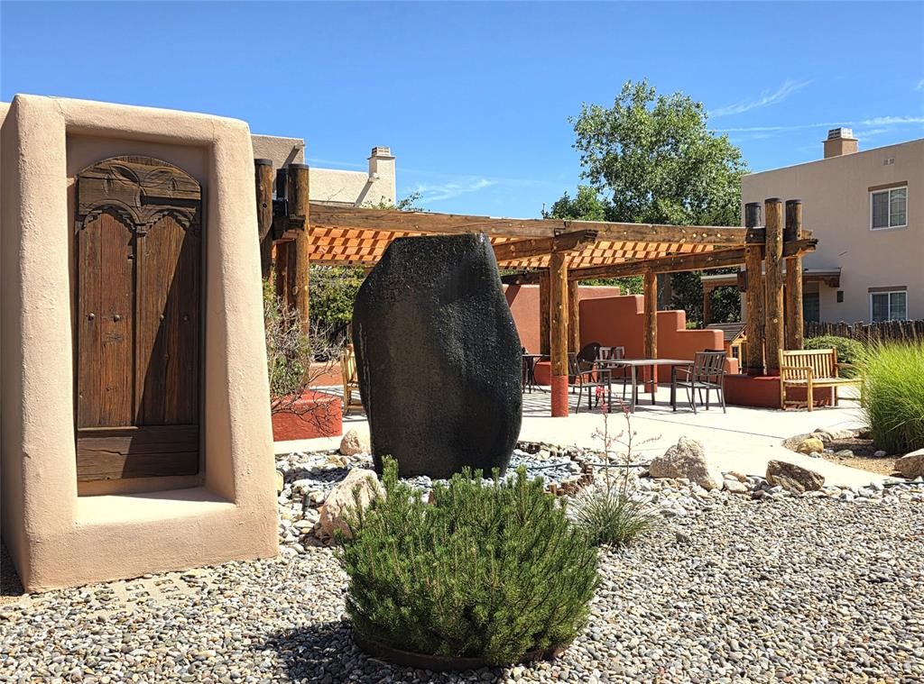 Welcome to the Dos Santos community a lovely town home end unit offering enhanced privacy and beautiful views of the mountains to the east and west. Located next to a greenbelt, this two-bedroom, two-bath home features approximately 950 square feet of well-designed living space, including an open-concept living and dining area with Saltillo tile floors, a wood-burning fireplace, and a kitchen ideal for entertaining. The upstairs includes a primary suite with an en suite bath, a walk-in closet, and attractive window treatments. Outside, the home offers a covered front patio and a fenced yard, with patio furniture included. Residents of Dos Santos enjoy access to a range of amenities, including a heated saltwater pool, hot tub, clubhouse, fitness center with exercise equipment, outdoor entertainment gazebos with gas grills, walking paths, and an expansive dog park. Located just minutes from downtown Santa Fe, close to shopping, St Vincent Hospital and direct access to Santa Fe's 'Rail Trail' for commuting, hiking and biking. The property also offers an easy commute throughout Santa Fe and to Los Alamos. Association fees cover community area maintenance, exterior building and roof maintenance, parking upkeep, recreational facilities, security, as well as water, sewer, and refuse services. E-Z to show.