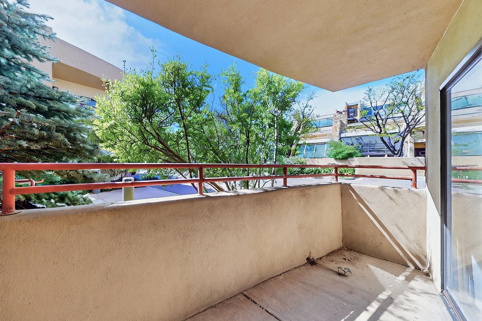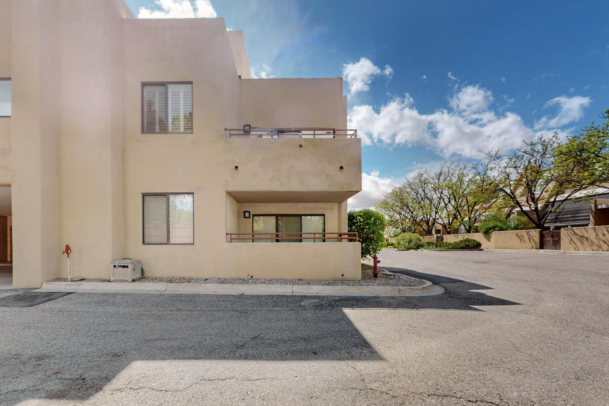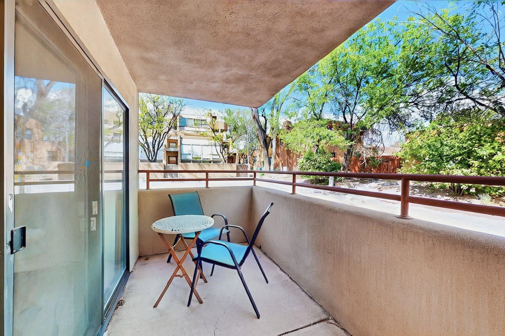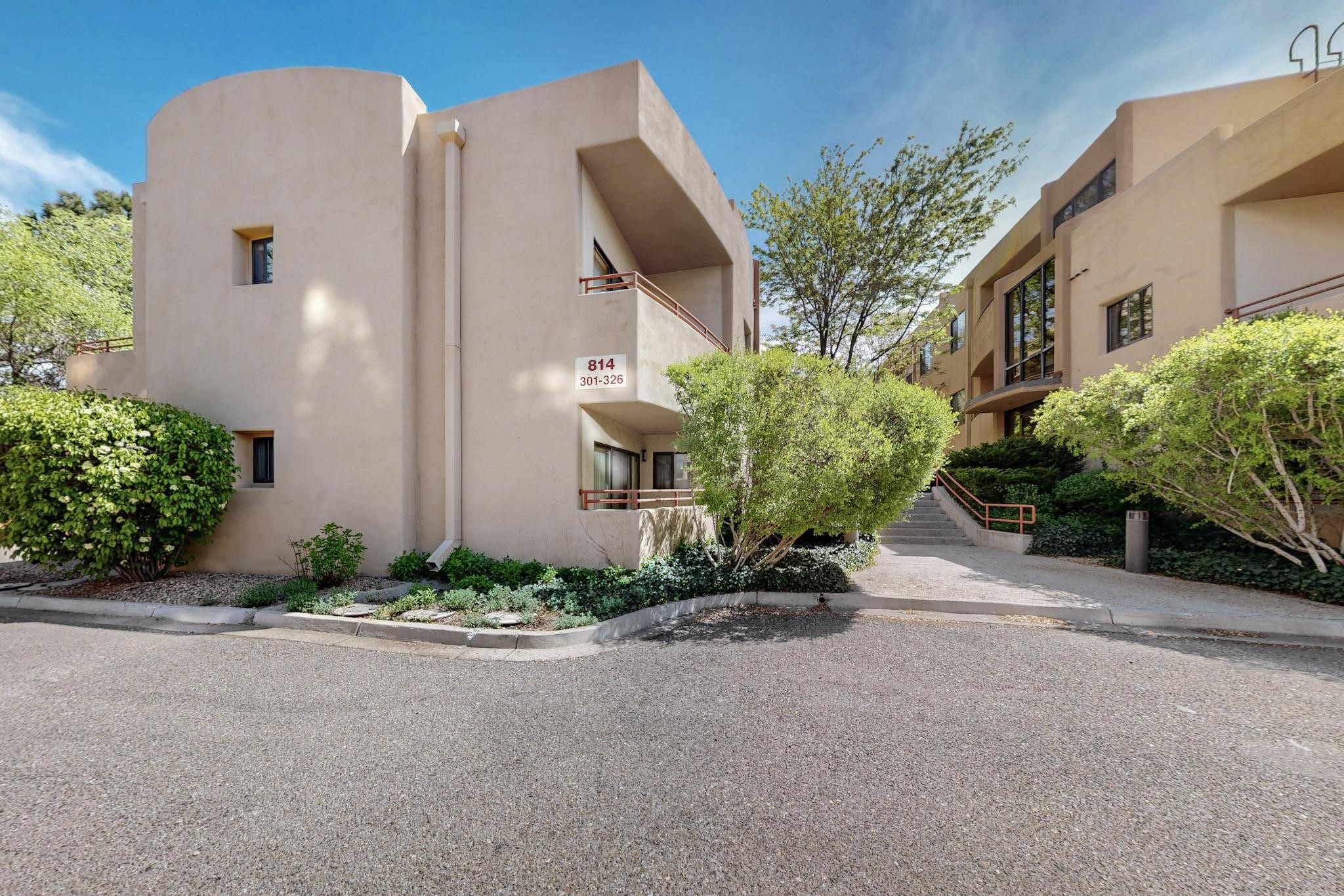 SELLERS SAY SELL! Midtown ground floor end unit with secured direct entry right off the assigned covered carport and no stairs! Huge 17' x 6 1/2' storage closet perfect for skis, biclycles, etc., to free up condo space. Close to Trader Joe's, State buildings, shopping and restaurants. Contemporary spacious layout flanked by 2 private terraces; east for breakfast and west for sunset cocktails. Open concept living/dining/kitchen with 10' ceilings. Large galley kitchen with laundry and central A/C. Public transportation to The Plaza is about 5 to 10 minutes away and the close by Rail Runner takes about an hour to Albuquerque. This small complex is close to everything yet discretely hidden for quiet and privacy with a nicely landscaped courtyard.