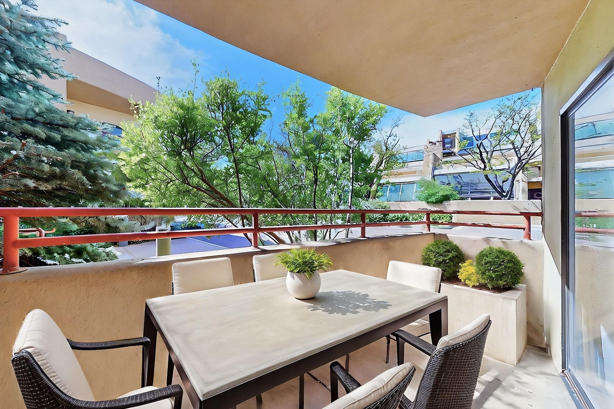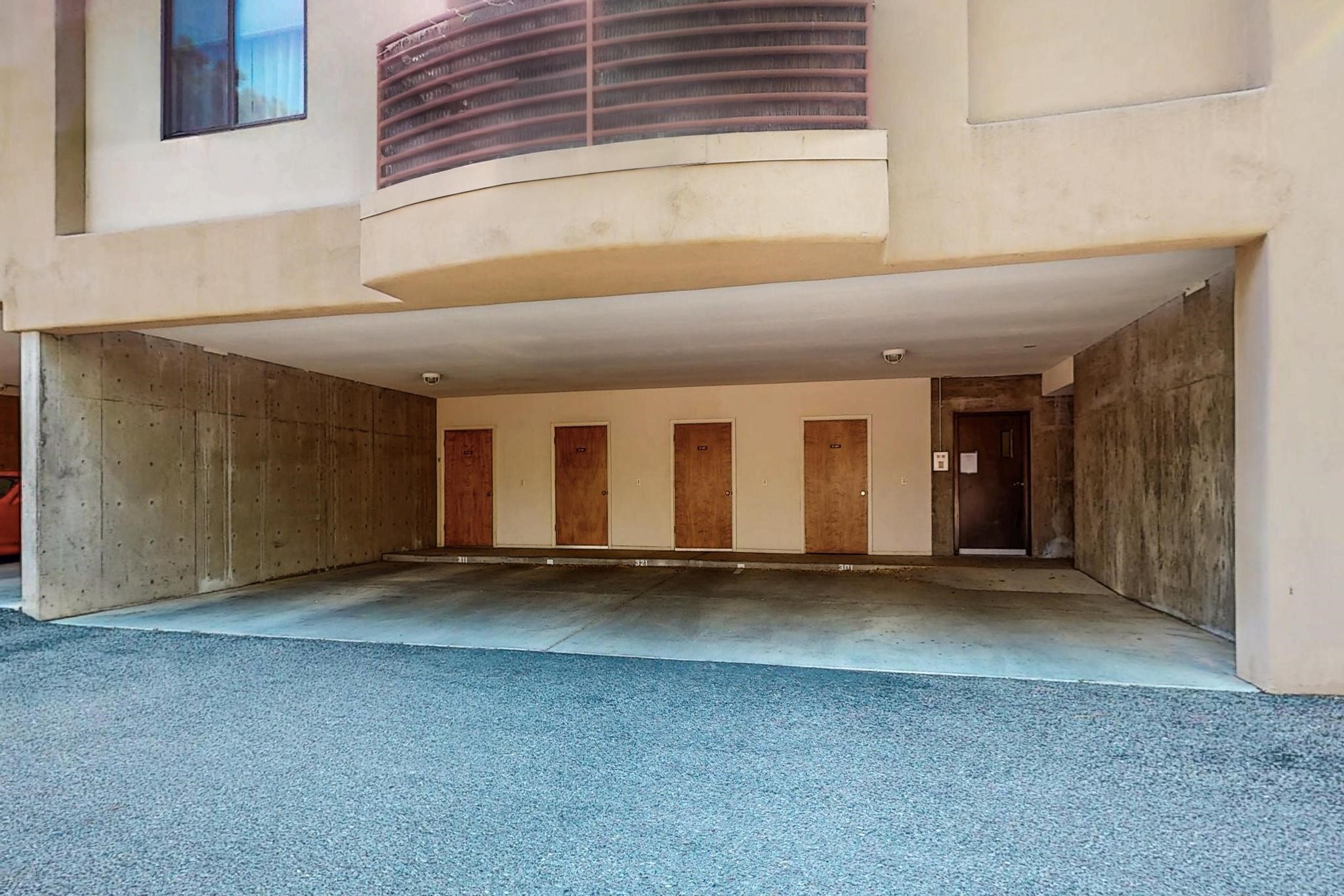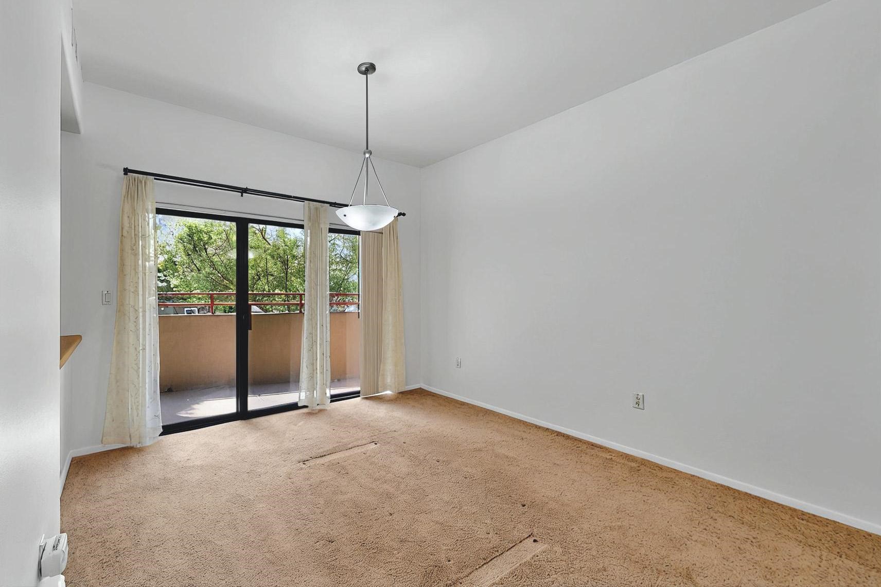 SELLERS SAY SELL! Midtown ground floor end unit with secured direct entry right off the assigned covered carport and no stairs! Huge 17' x 6 1/2' storage closet perfect for skis, biclycles, etc., to free up condo space. Close to Trader Joe's, State buildings, shopping and restaurants. Contemporary spacious layout flanked by 2 private terraces; east for breakfast and west for sunset cocktails. Open concept living/dining/kitchen with 10' ceilings. Large galley kitchen with laundry and central A/C. Public transportation to The Plaza is about 5 to 10 minutes away and the close by Rail Runner takes about an hour to Albuquerque. This small complex is close to everything yet discretely hidden for quiet and privacy with a nicely landscaped courtyard.