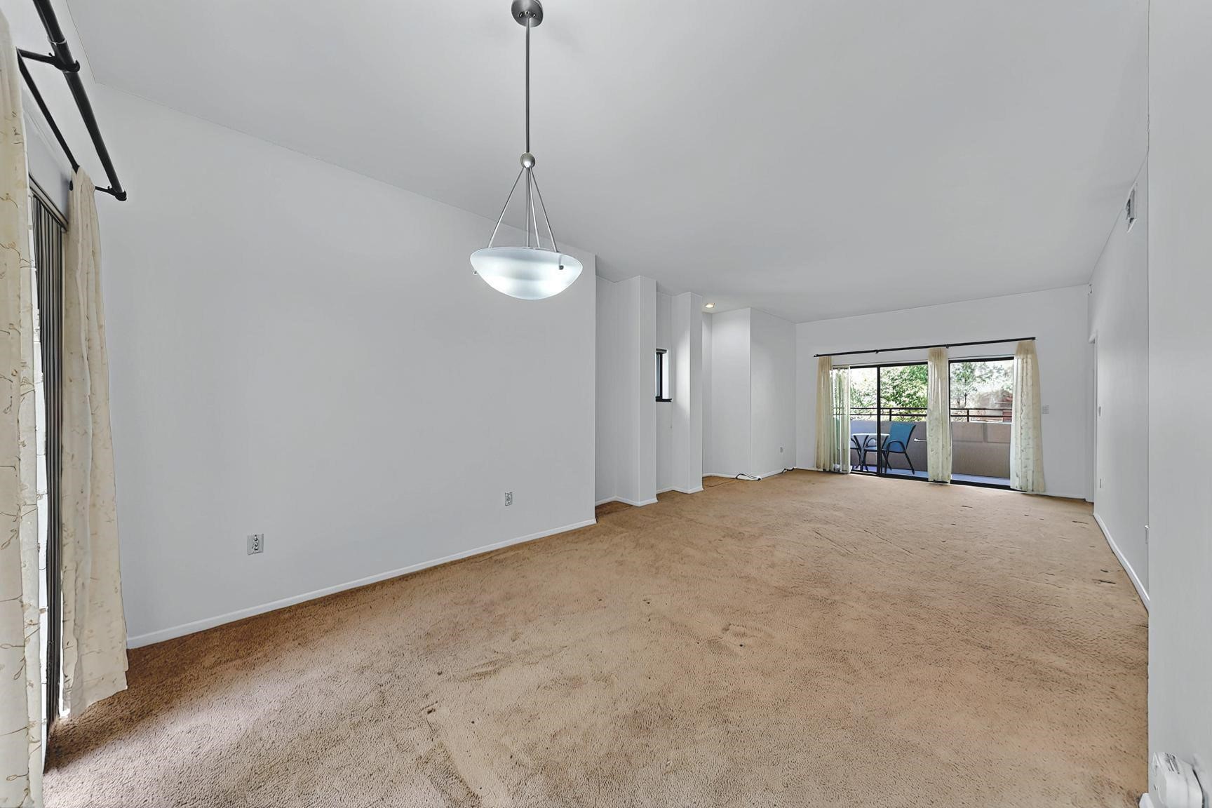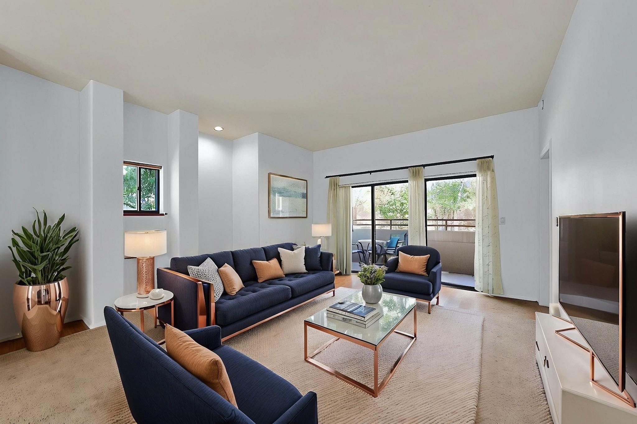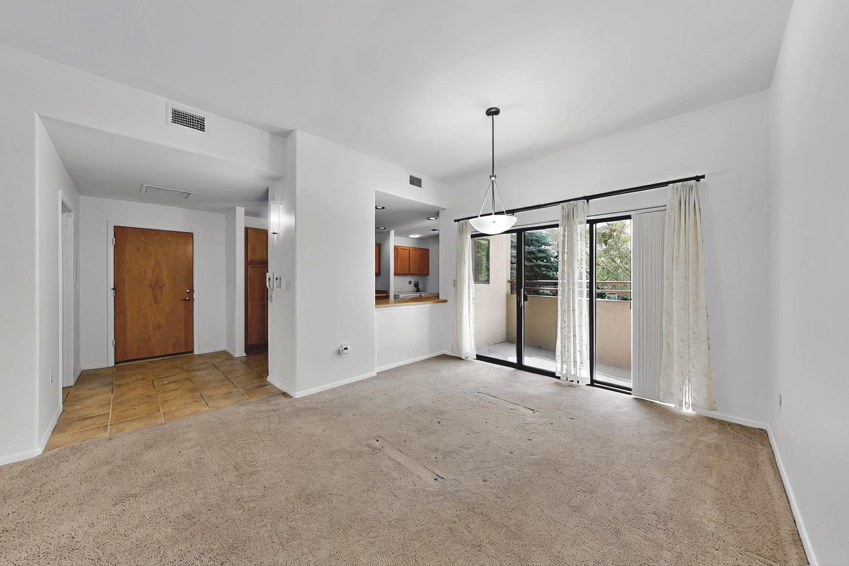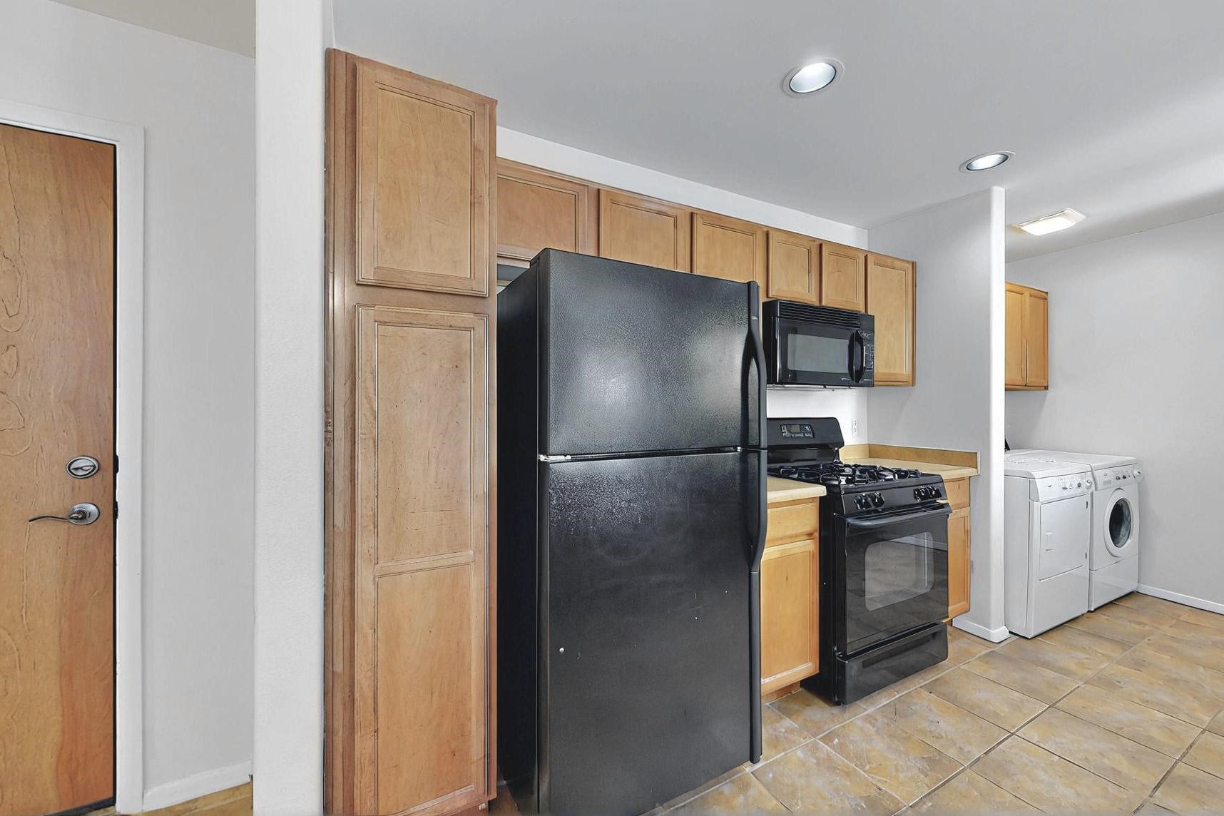 SELLERS SAY SELL! Midtown ground floor end unit with secured direct entry right off the assigned covered carport and no stairs! Huge 17' x 6 1/2' storage closet perfect for skis, biclycles, etc., to free up condo space. Close to Trader Joe's, State buildings, shopping and restaurants. Contemporary spacious layout flanked by 2 private terraces; east for breakfast and west for sunset cocktails. Open concept living/dining/kitchen with 10' ceilings. Large galley kitchen with laundry and central A/C. Public transportation to The Plaza is about 5 to 10 minutes away and the close by Rail Runner takes about an hour to Albuquerque. This small complex is close to everything yet discretely hidden for quiet and privacy with a nicely landscaped courtyard.
