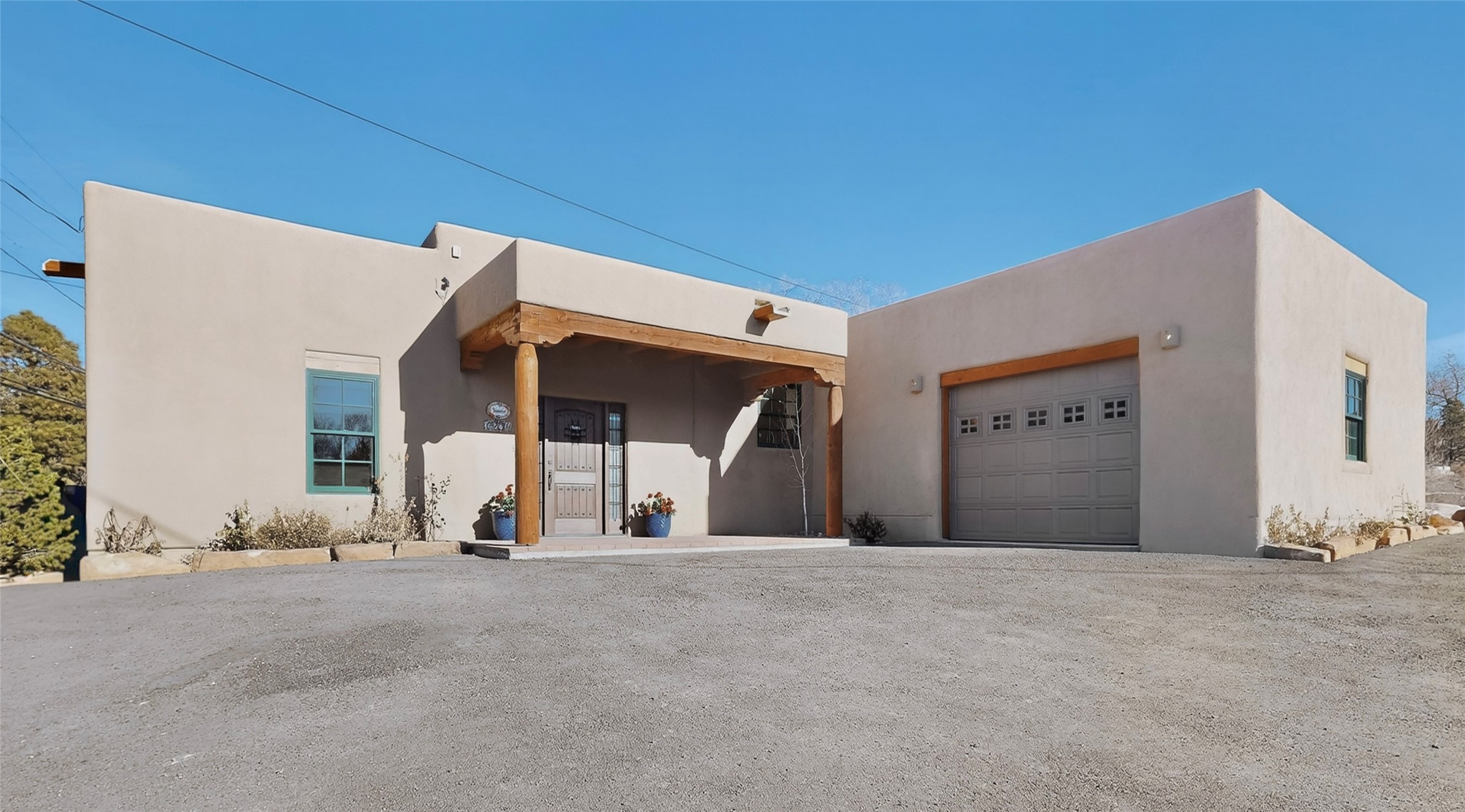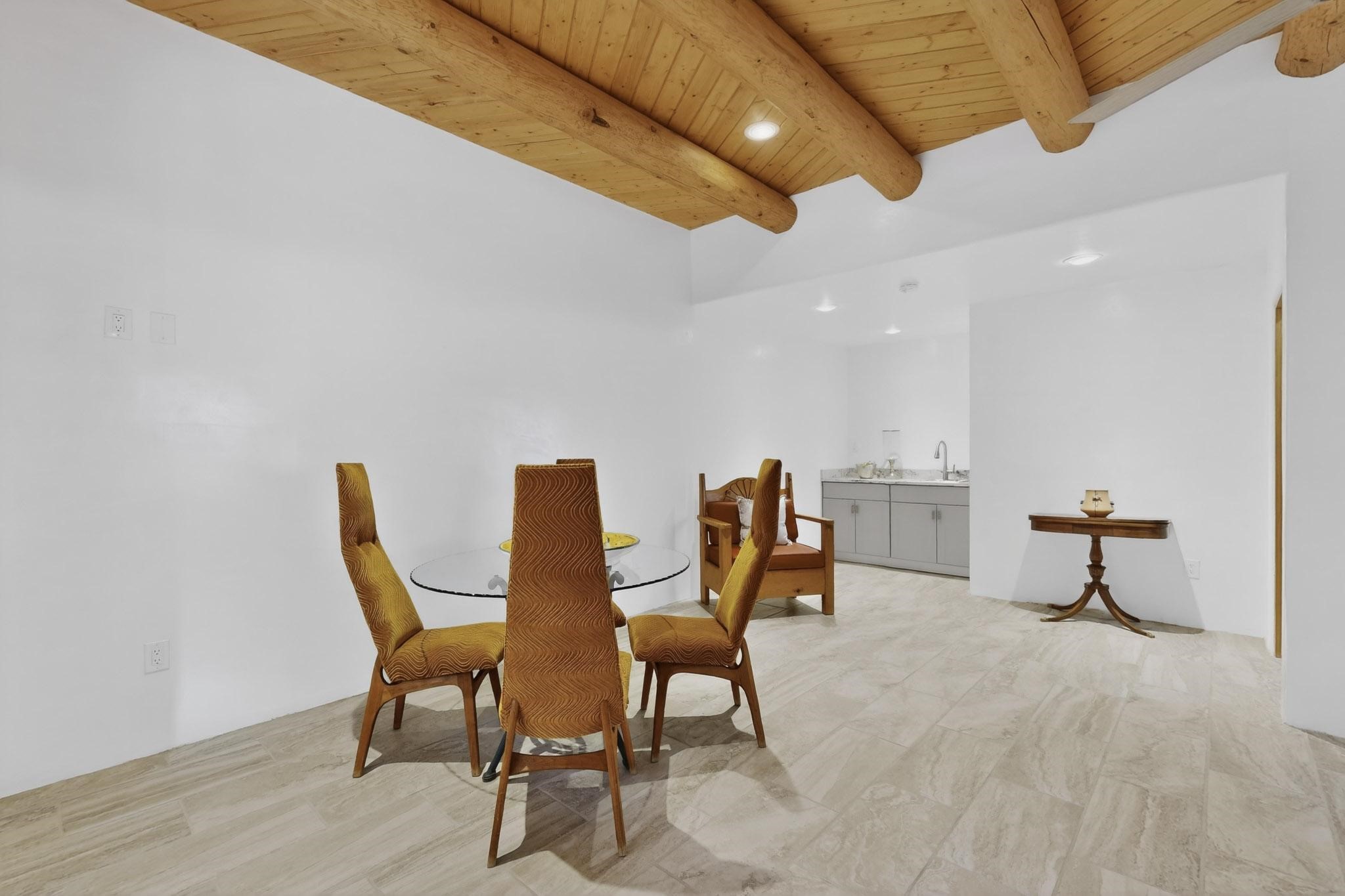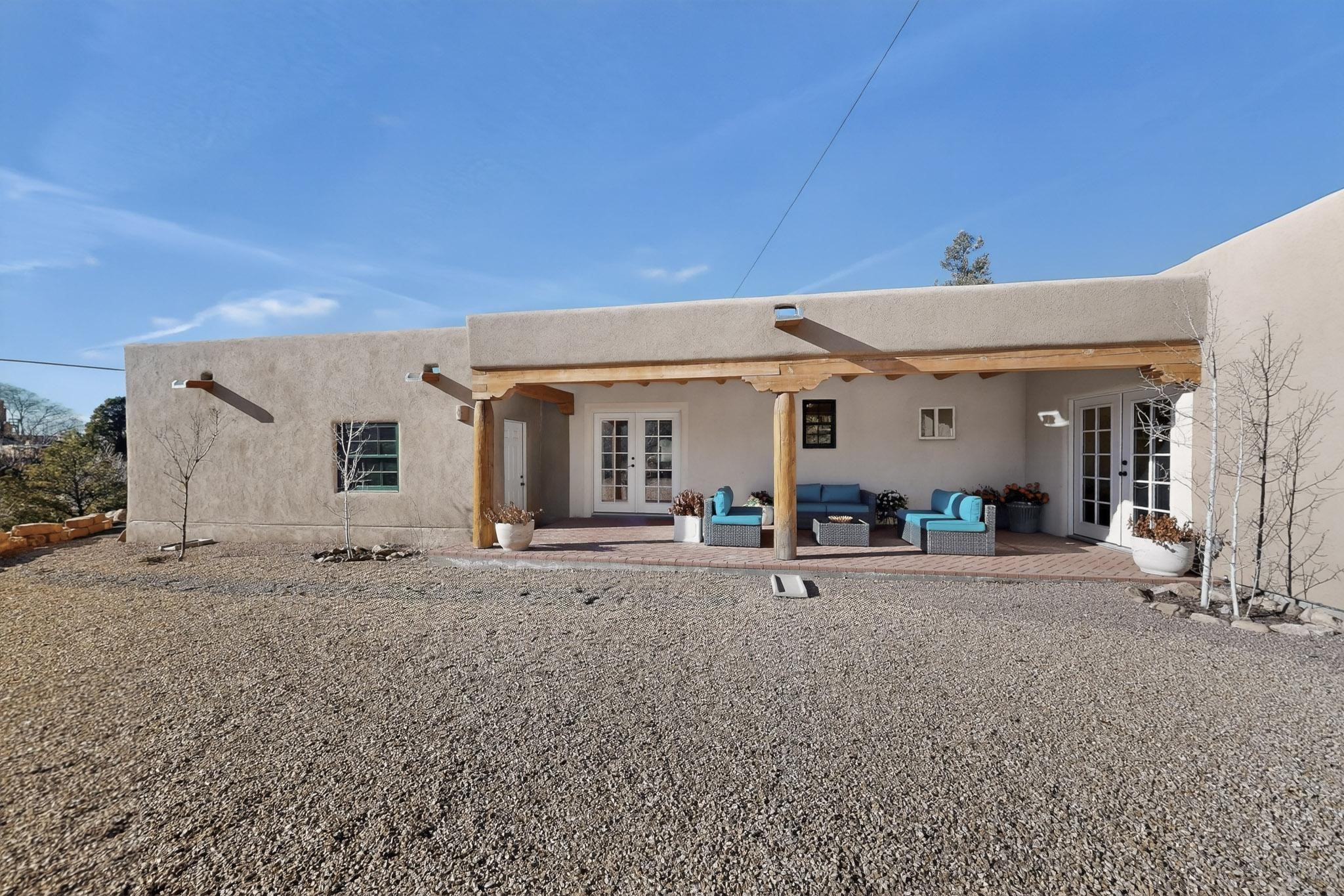 Casa Lucero is a refined East-side estate set among mature trees across from the Santa Fe River Park on coveted Upper Canyon Road. This 3,800-square-foot property blends classic Southwestern architecture with modern comfort on 0.45 acres, featuring a 2-bedroom main residence and a spacious 1-bedroom guest suite. Traditional details - vigas, corbels, nichos, and diamond-finish plaster- are paired with porcelain tile and wood floors throughout. The open layout centers on a chef's kitchen with custom cabinetry, stainless appliances, and a marble island, flowing into light-filled living and dining areas. The primary suite offers a walk-in closet and spa-like bath. Radiant heat, mini-splits, portals, curated grounds, and an oversized garage complete this elegant retreat near Cristo Rey Church.