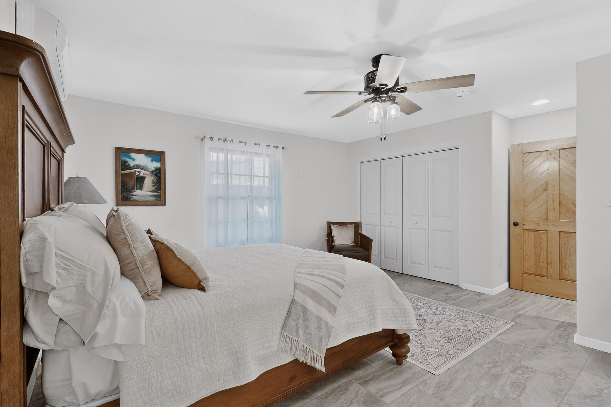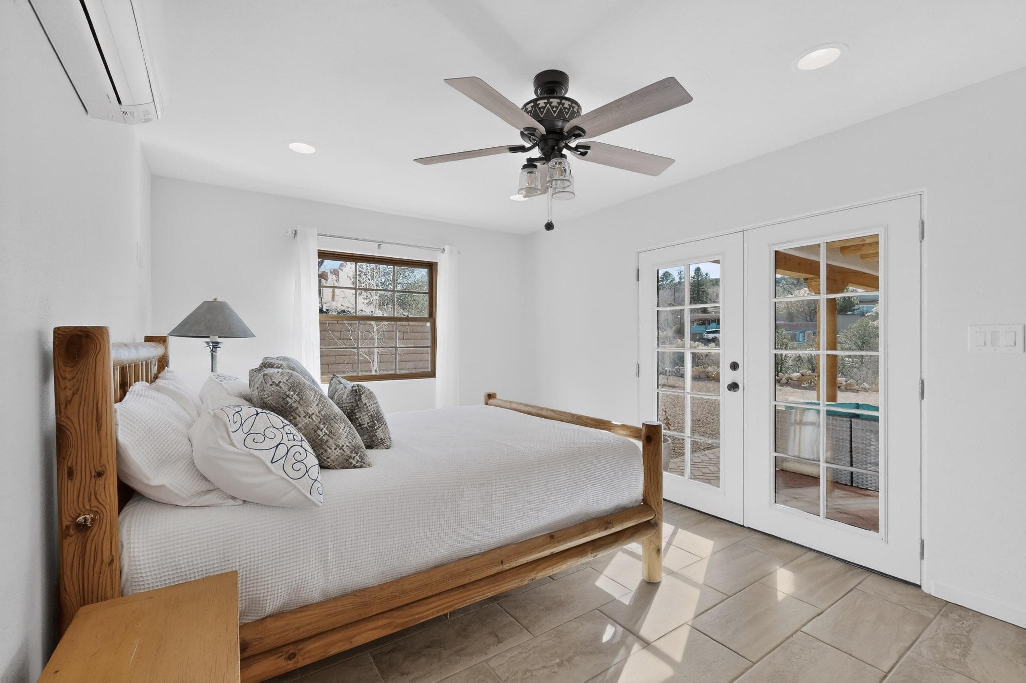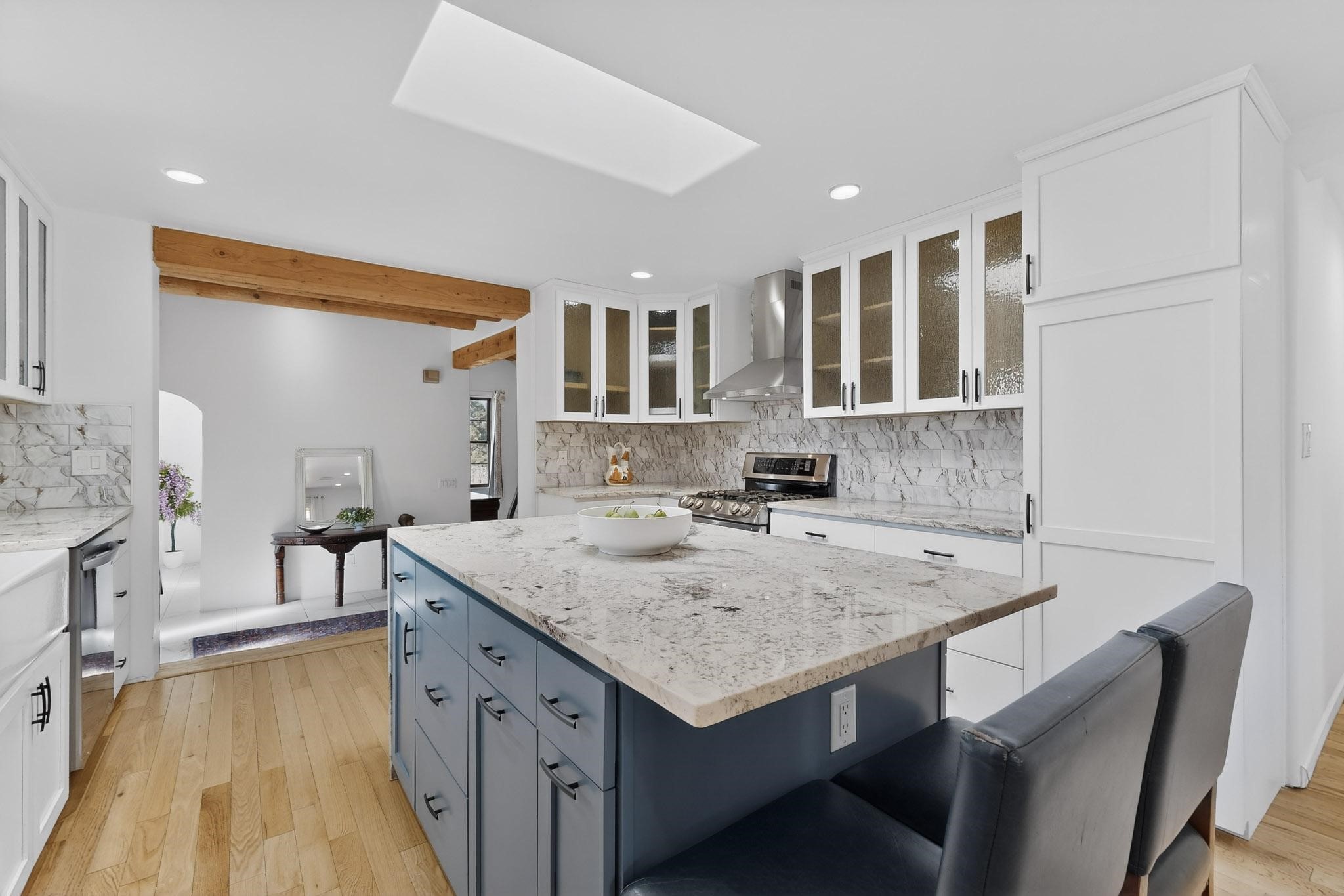 Casa Lucero is a refined East-side estate set among mature trees across from the Santa Fe River Park on coveted Upper Canyon Road. This 3,800-square-foot property blends classic Southwestern architecture with modern comfort on 0.45 acres, featuring a 2-bedroom main residence and a spacious 1-bedroom guest suite. Traditional details - vigas, corbels, nichos, and diamond-finish plaster- are paired with porcelain tile and wood floors throughout. The open layout centers on a chef's kitchen with custom cabinetry, stainless appliances, and a marble island, flowing into light-filled living and dining areas. The primary suite offers a walk-in closet and spa-like bath. Radiant heat, mini-splits, portals, curated grounds, and an oversized garage complete this elegant retreat near Cristo Rey Church.
