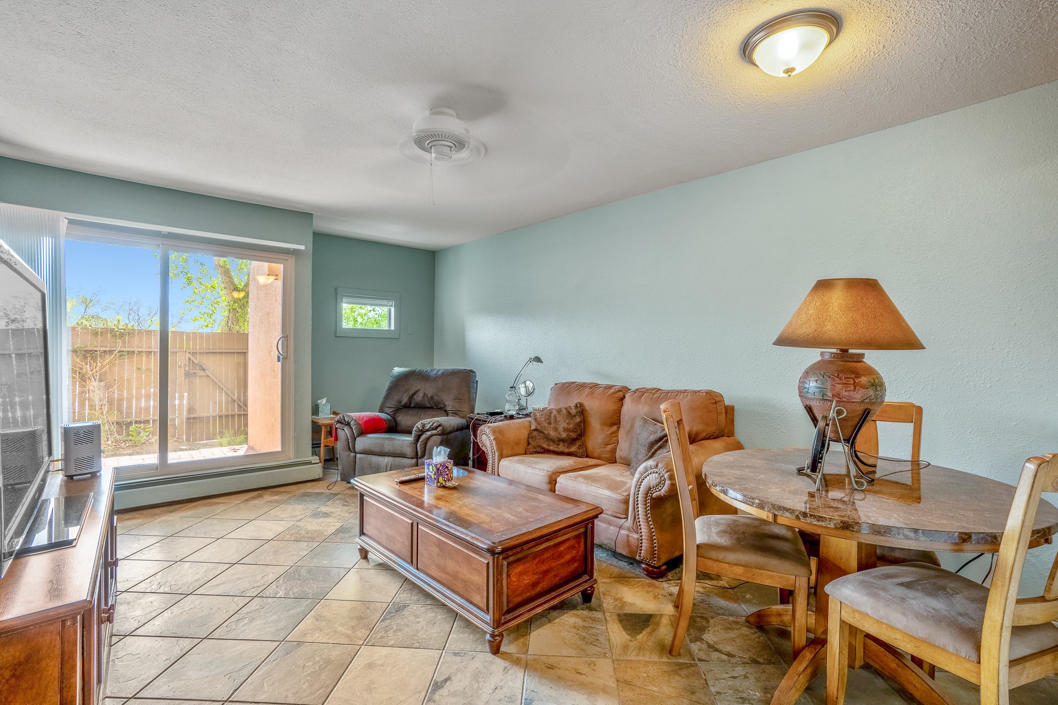 Exceptionally Nice Ground-Floor Condo in Los Arroyos. This beautifully upgraded 1-bedroom ground-floor condo offers comfortable living with a host of desirable features. The home boasts stylish all-tile flooring throughout, an upgraded kitchen and bathroom, two ceiling fans, and an in-unit laundry with a newer stackable washer and dryer. Convenience is key, with assigned parking directly in front of the with easy access to the private patio. Guest parking is also located nearby. Enjoy tranquil sunset views and the shade of mature trees from your outdoor space. Residents of Los Arroyos enjoy access to a wide range of community amenities, including: Year-round indoor heated pool, Sauna and weight room, Hospitality room, Tennis and basketball courts and Nearby walking trails. Ideally located just minutes from schools, shopping, medical facilities, and the Santa Fe Plaza, this condo provides both comfort and convenience. Condo fees include baseboard hot water heat, water, sewer, refuse, and maintenance and insurance on the buildings and grounds