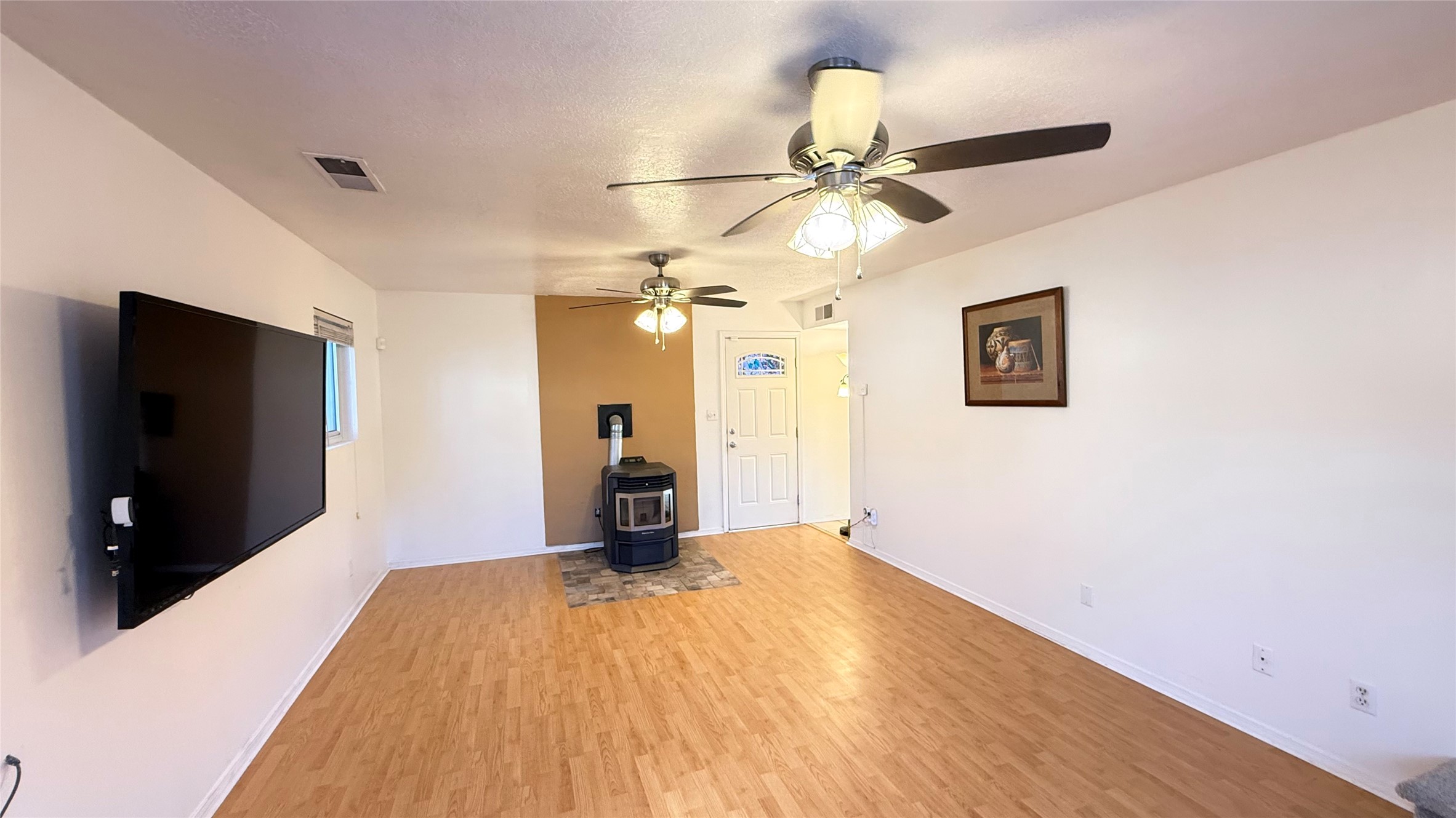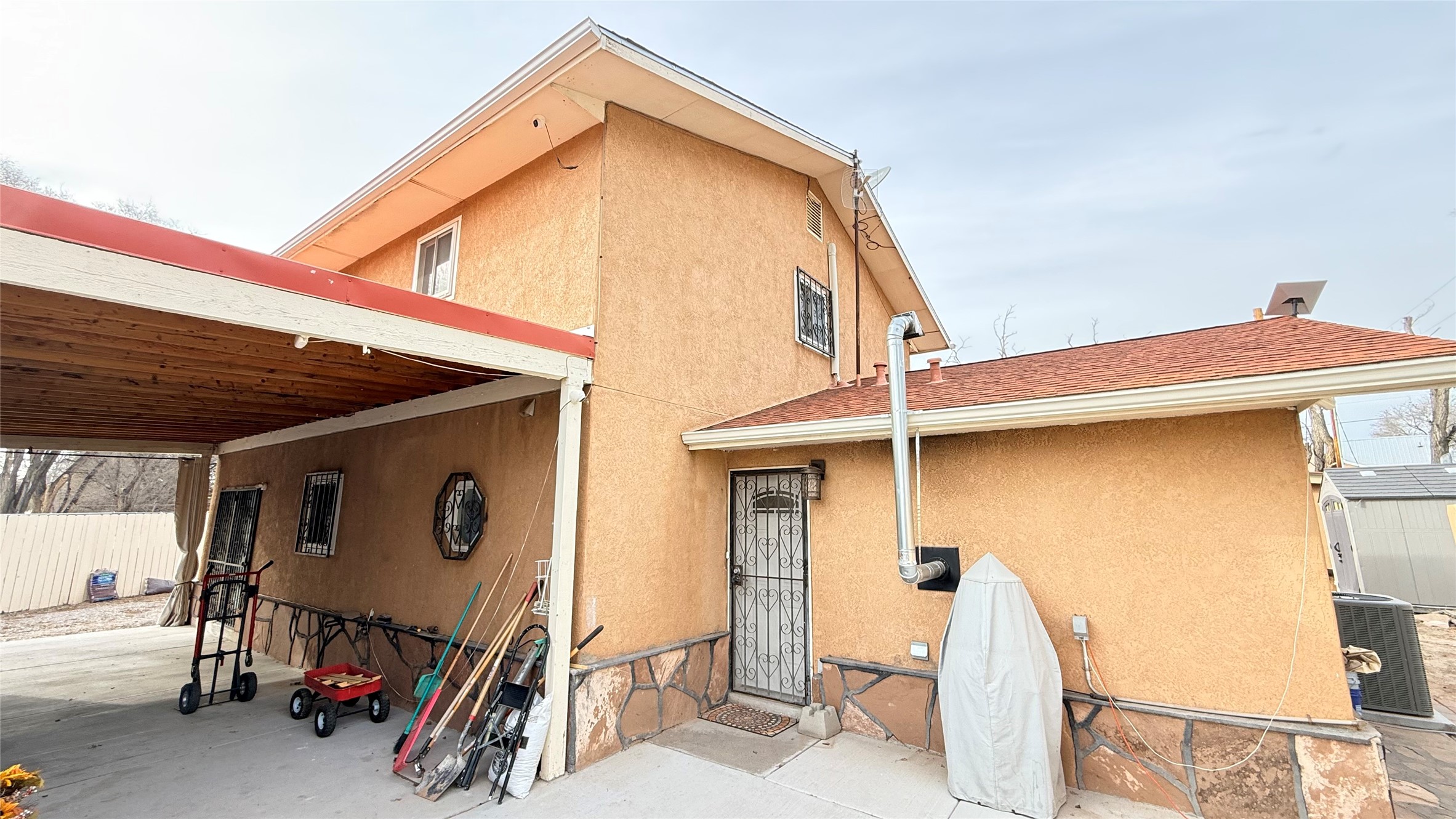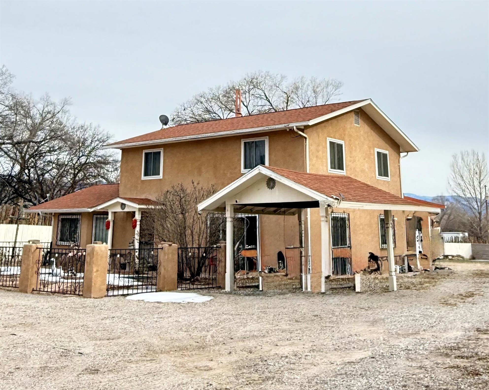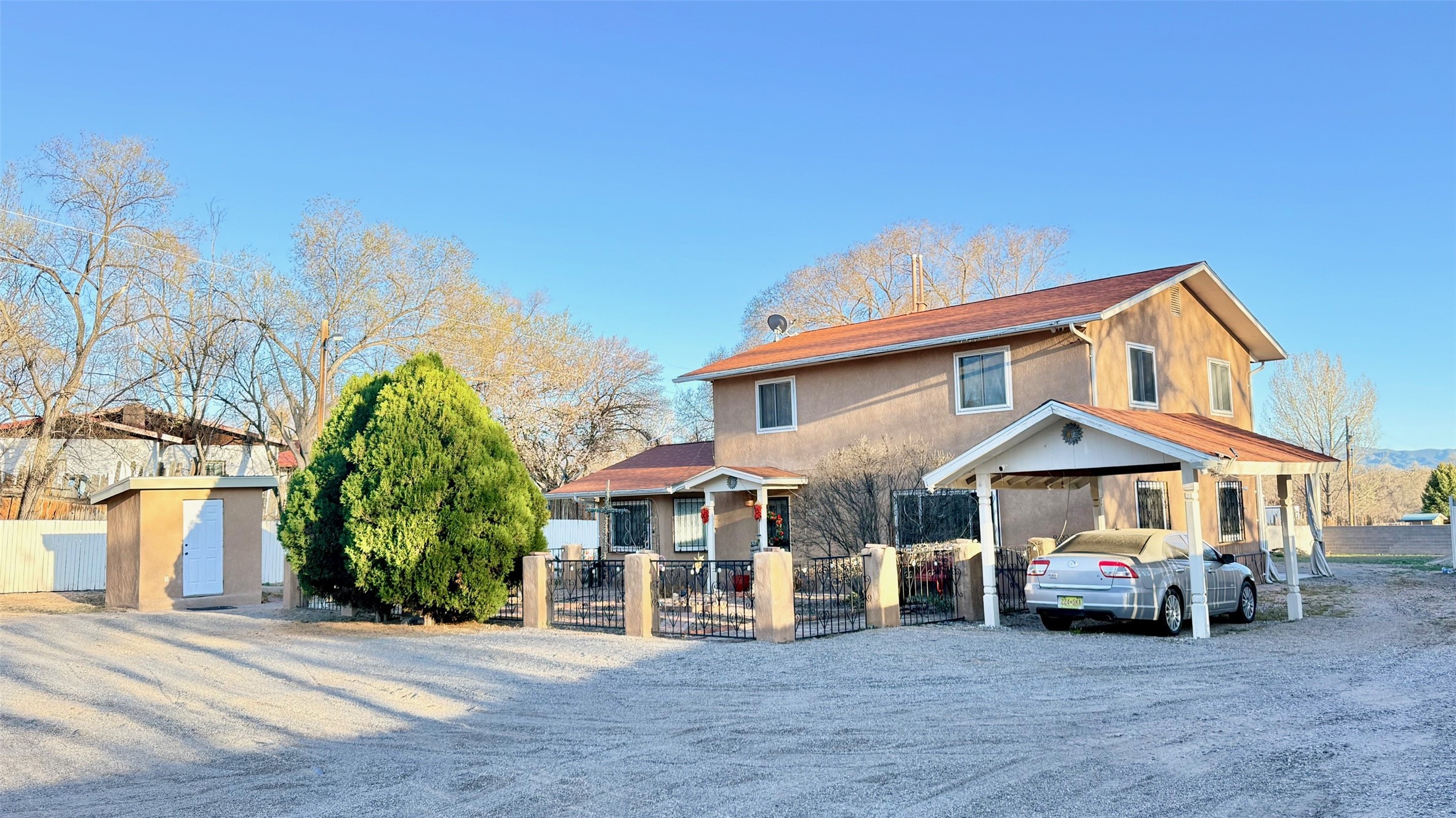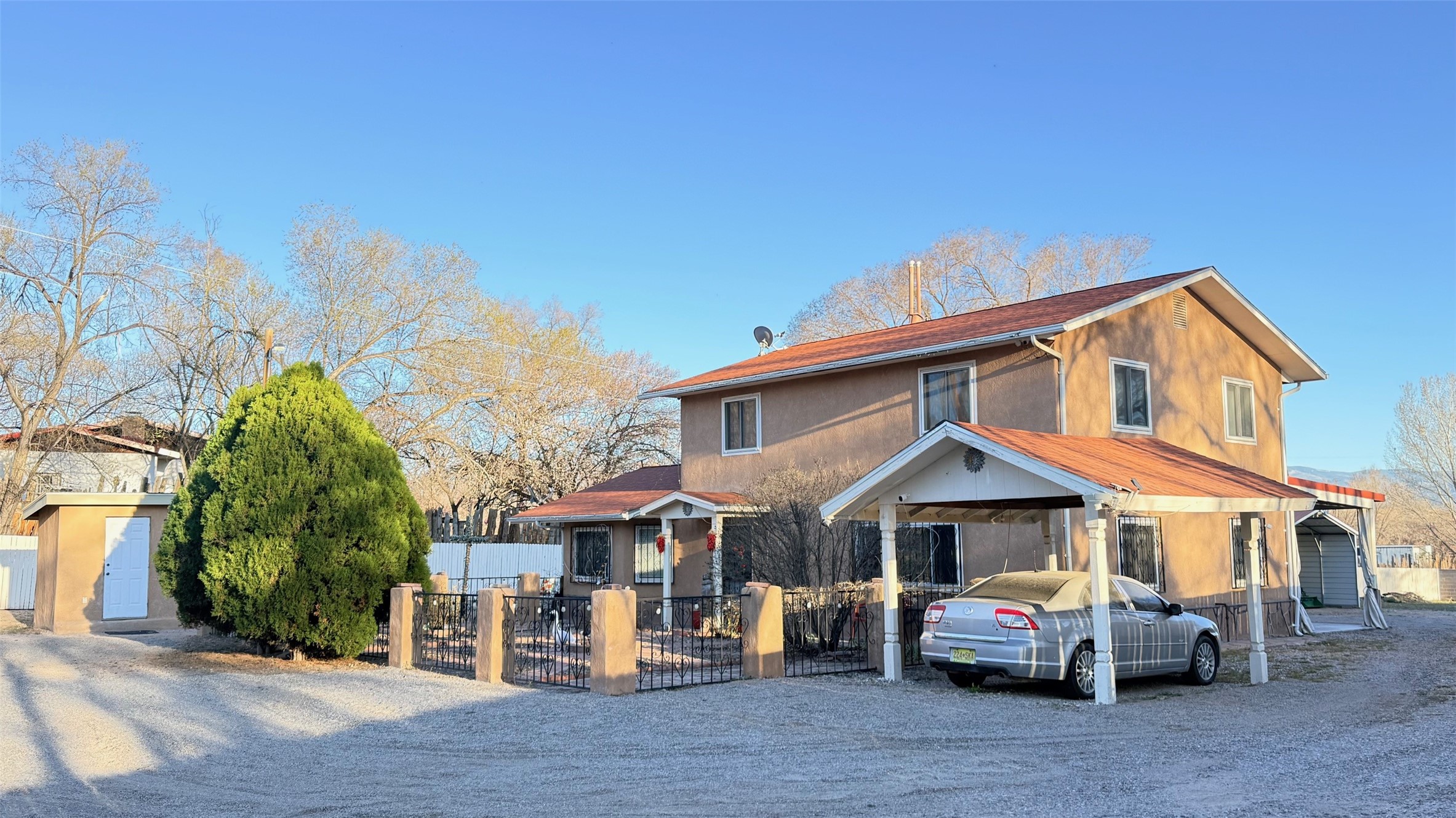 Pride of ownership shines throughout this well-maintained two-story home featuring 3 bedrooms and 2 baths. Recently installed carpet and spacious living areas filled with natural light create a comfortable and inviting atmosphere, complemented by thoughtful updates throughout.Interior highlights include a smart heating thermostat, a regularly serviced HVAC system, and a cozy pellet stove with remote control. Additional features such as smart ceiling fans, removable windows for easy cleaning, a security camera system, and a home alarm provide added convenience and peace of mind. The washer, dryer, and refrigerator will convey with the sale.The exterior offers exceptional versatility, with an electric entry gate, a detached 2-car garage, two covered carports, and a large metal carport providing ample parking and storage. The property also includes a private well and valuable acequia water rights.This home has been kept in immaculate condition. Property is being sold as-is.