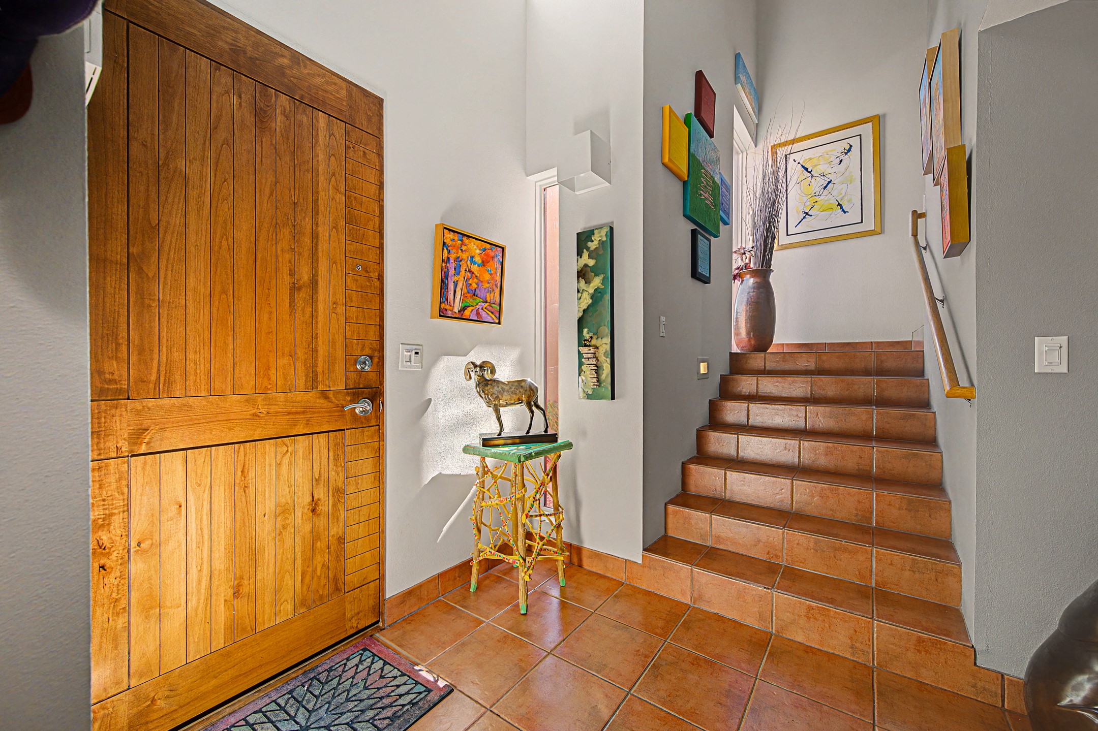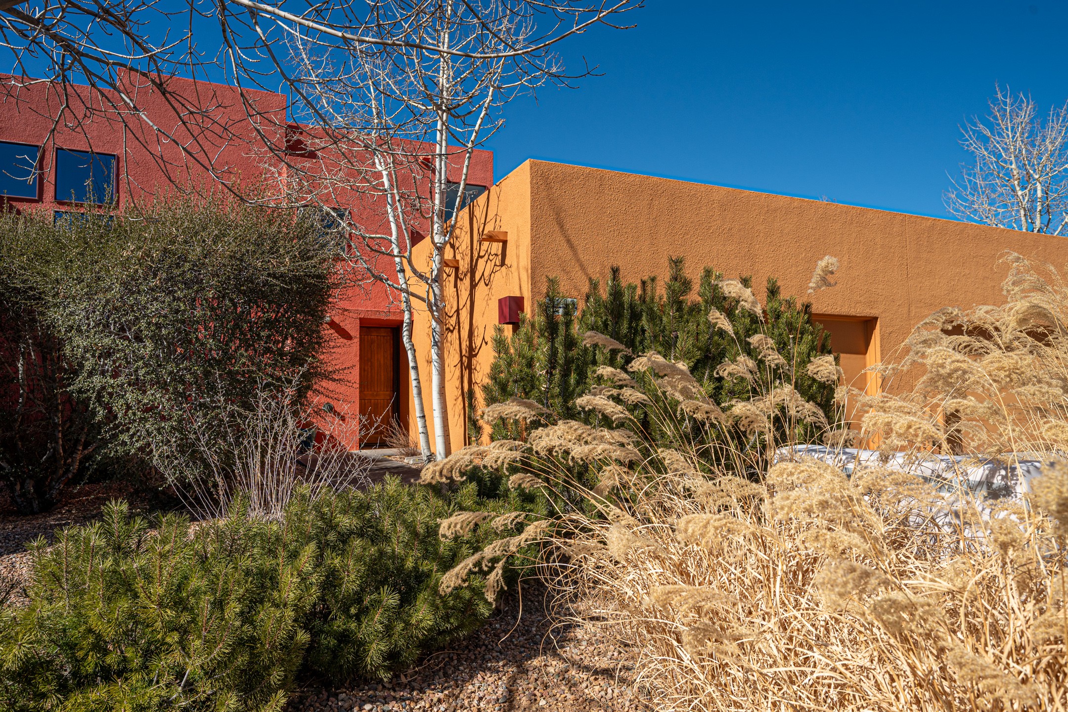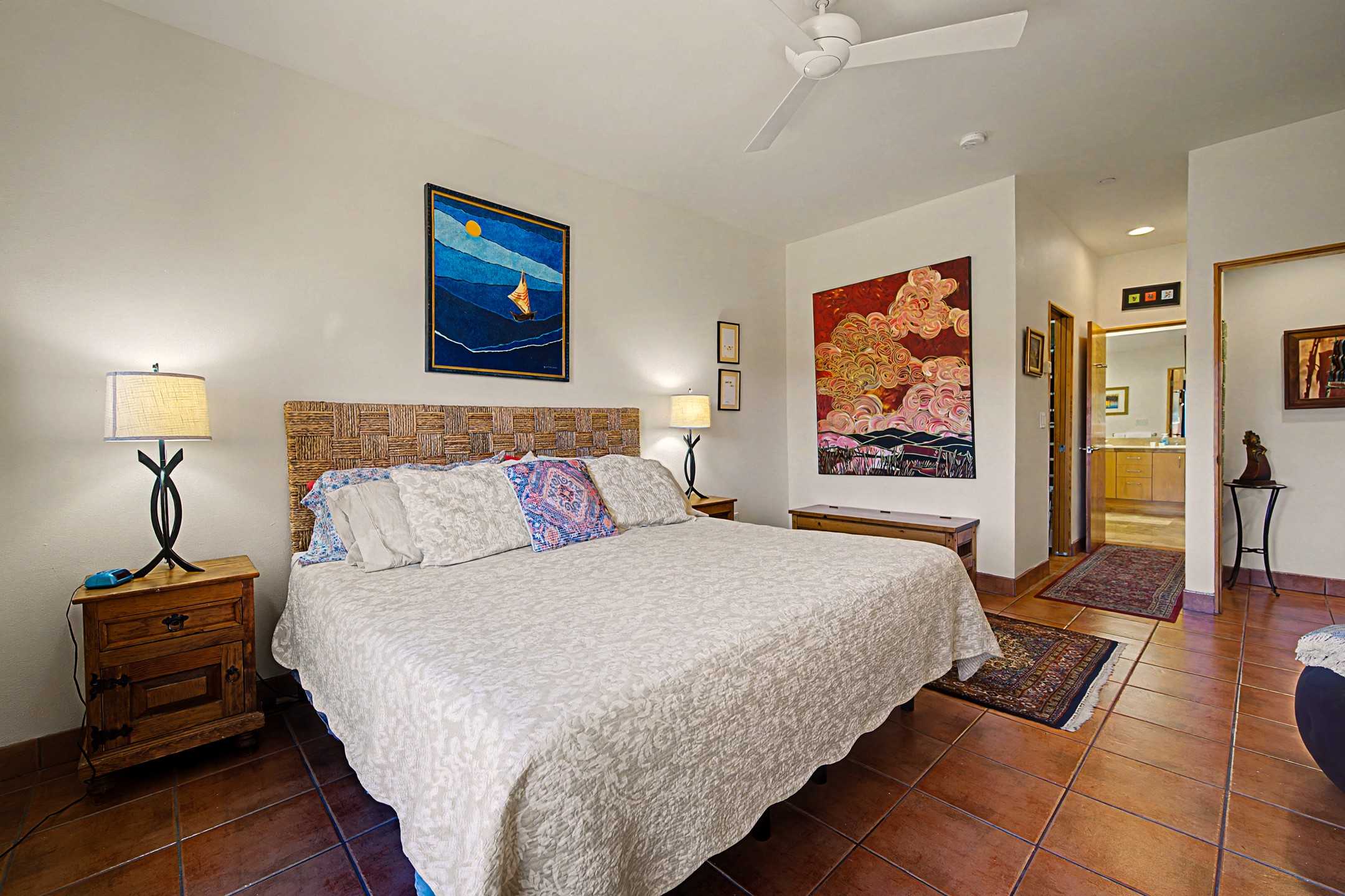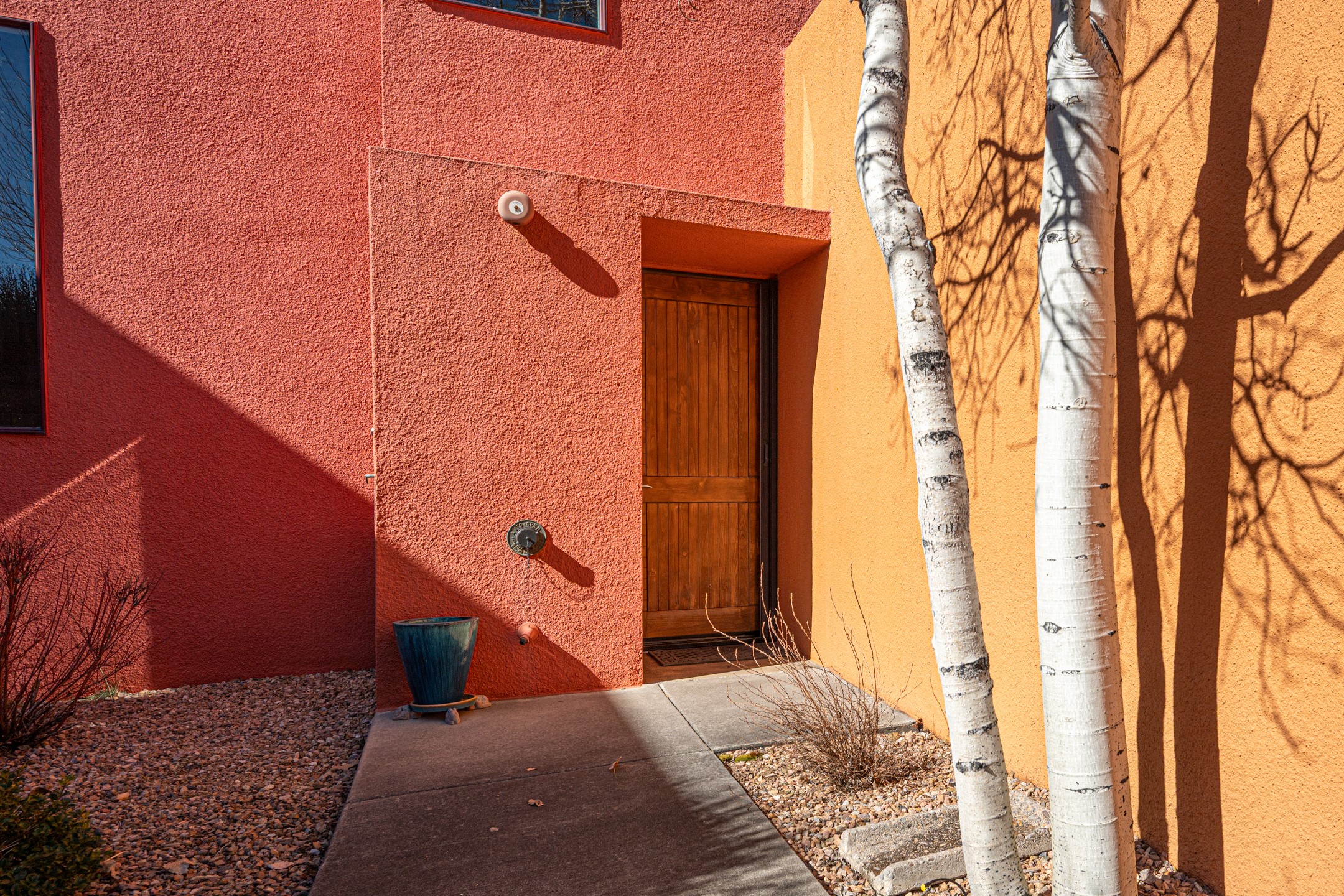 This light-filled home offers one of Zocalo's most popular floor plans in a prime west-facing location overlooking the arroyo and hillside. The residence features three bedrooms, including a main-level primary suite, with two upstairs bedrooms, a shared bath, and a private wraparound balcony. A private patio is accessible from both the living room and the primary suite for easy indoor-outdoor living.Soaring ceilings with skylights highlight the dining area, while warm wood ceilings accent the living room and kitchen. A double-sided wood-burning fireplace adds charm and warmth between the living and dining spaces. The thoughtful layout provides ground-level living, ample storage, and efficient use of space.Located in the Zocalo community designed by renowned architect Ricardo Legorreta, just minutes from downtown Santa Fe. Amenities include two fitness centers, clubhouse, pool, and spa.