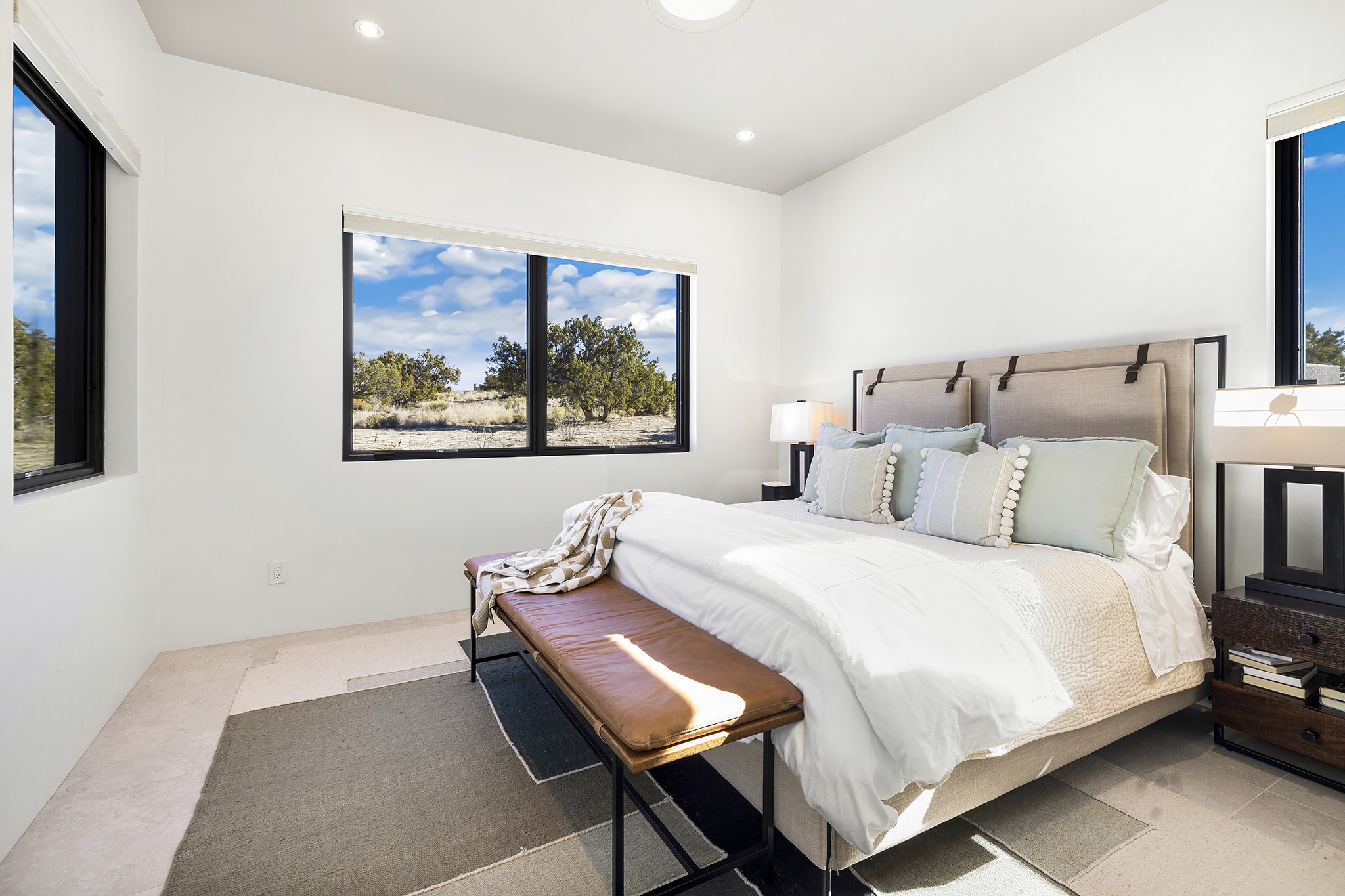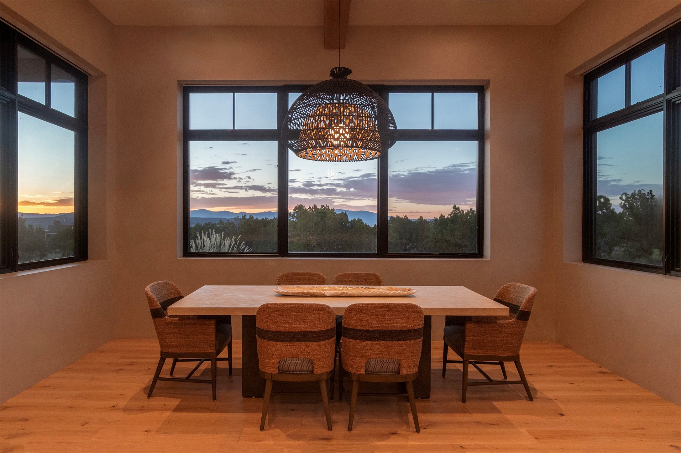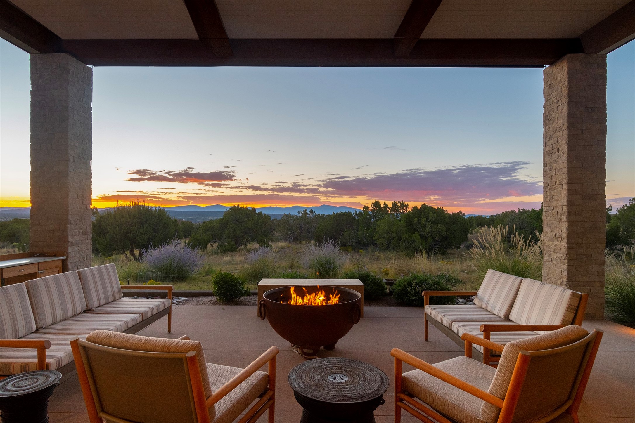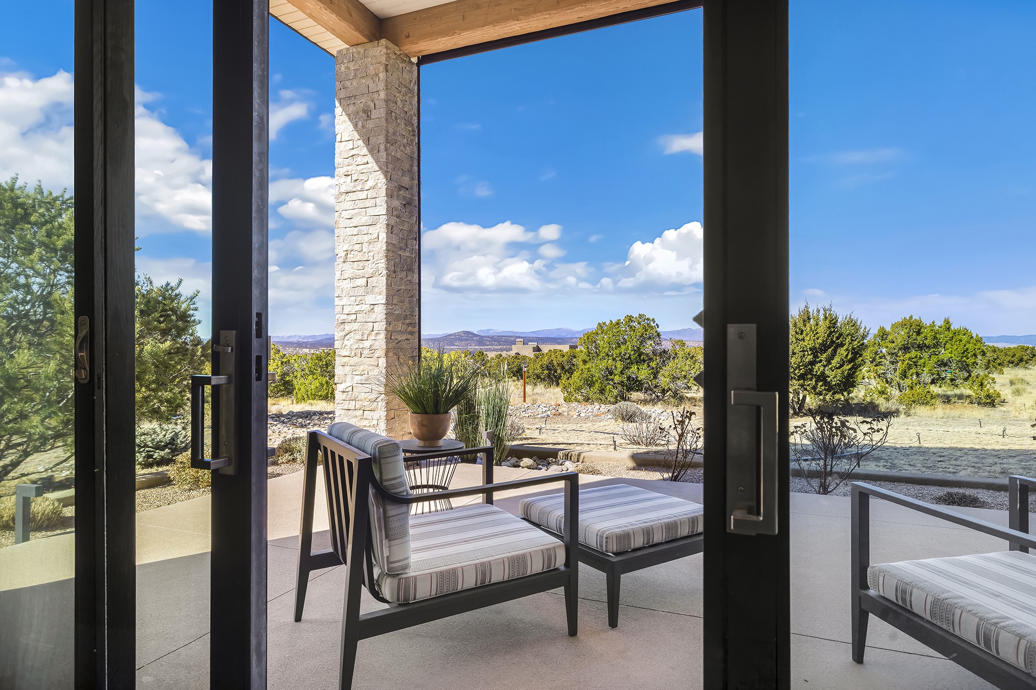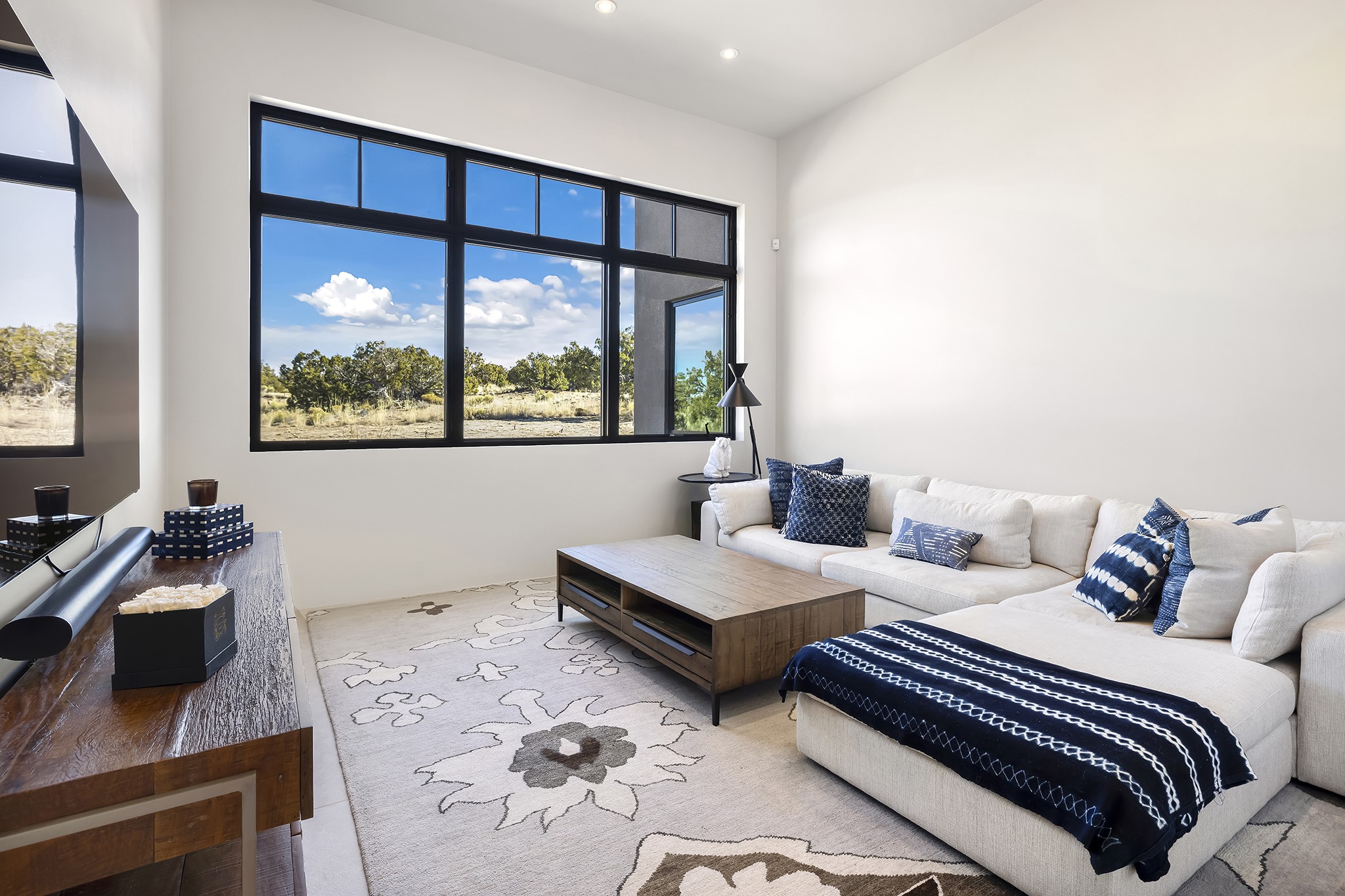 A masterful blend of modernity and warmth, this single-level custom home--built by Prull Custom Builders in 2021-- is sited on 1.8 acres and framed by the panoramic majesty of the Jemez Mountains. Every detail was thoughtfully designed to reflect the natural beauty of New Mexico while embracing clean, contemporary lines and sustainable living.The heart of the home is the expansive living, kitchen, and dining area--anchored by a split stone accent wall with a sleek gas fireplace and wrapped in floor-to-ceiling windows that open to a deep portal with a gas firepit and uninterrupted views. The chef's kitchen is a showpiece, featuring an 8-burner Viking range, Sub-Zero refrigerator, expansive stone countertops, and a large center island with bar seating and a prep sink--ideal for gathering and entertaining.Organic textures and subtle design elements are woven throughout: lime-washed walls, distressed beams, and a soft stone feature wall create a quiet luxury that feels both rooted and elevated. Powered by solar, this home pays homage to the land in both form and function.The private primary suite and adjacent office offer direct access to the portal and inspiring western views. In the guest wing, three bedrooms, two bathrooms, and a media room provide generous accommodation and flexible use. A separate flex room--currently an art studio--is located off the laundry room for added versatility.This is a rare opportunity to own a nearly new, artfully crafted home in the coveted community of Las Campanas--where architecture, sustainability, and the soul of the Southwest converge.