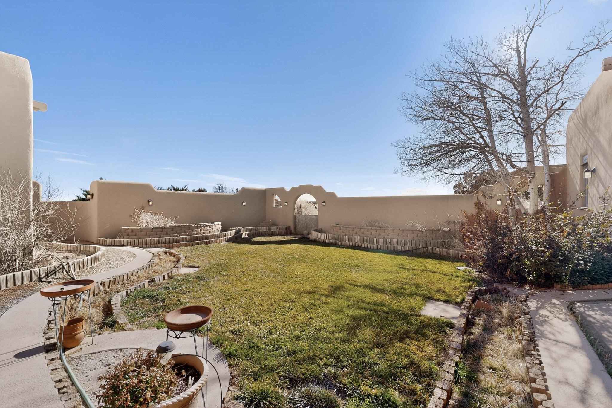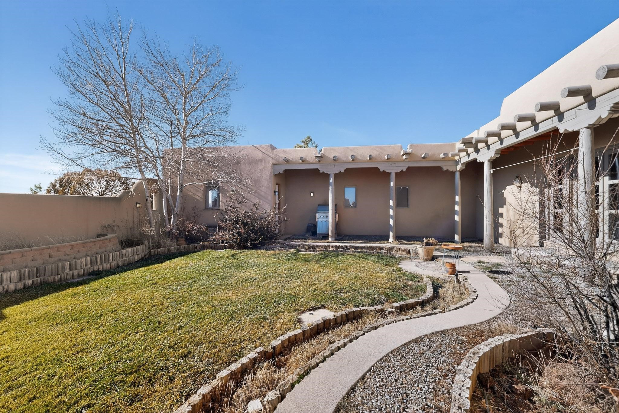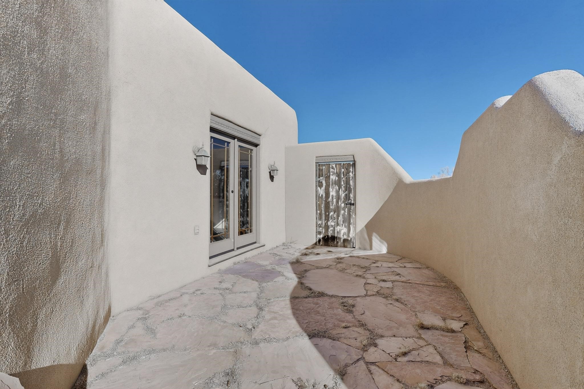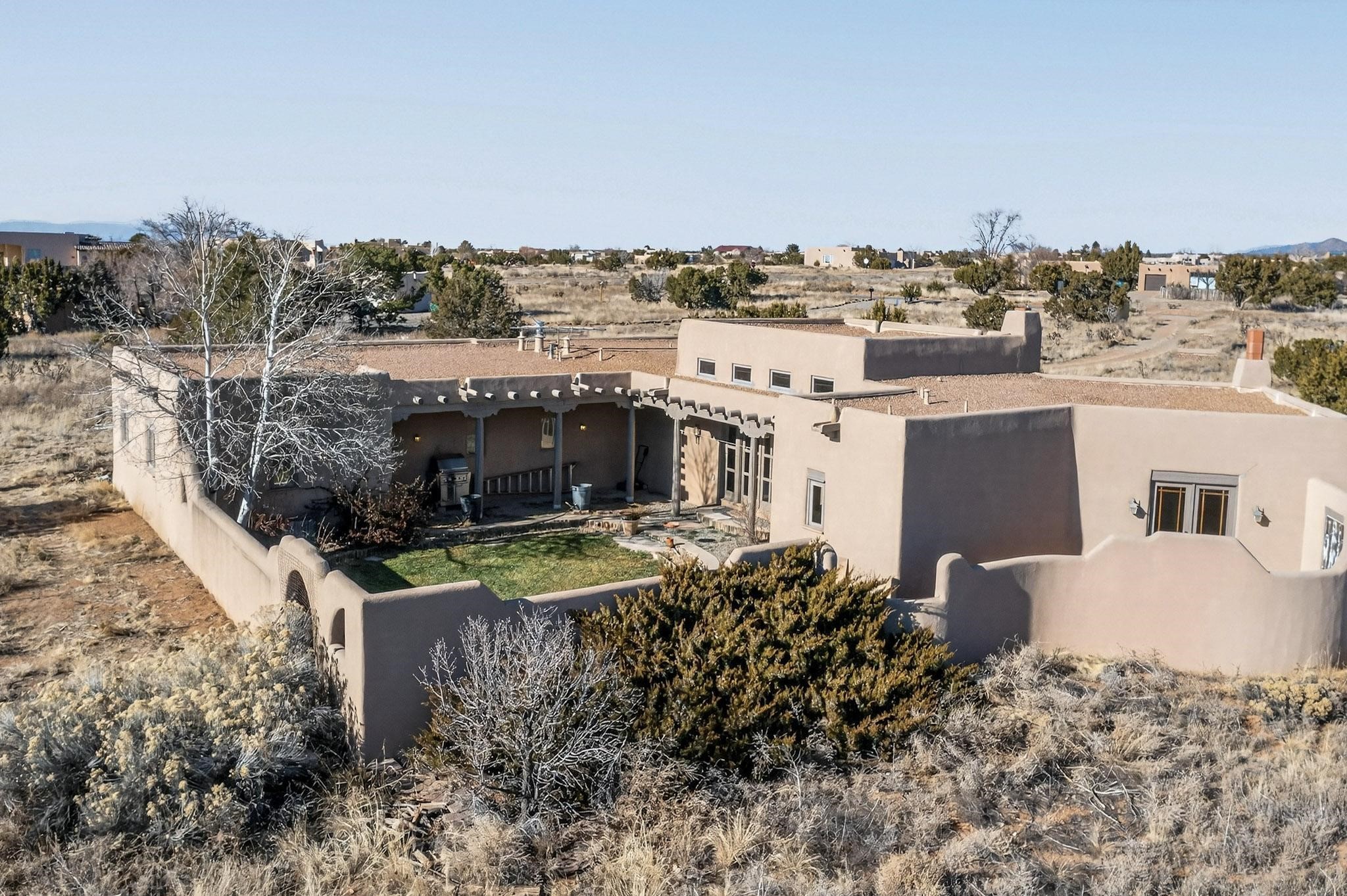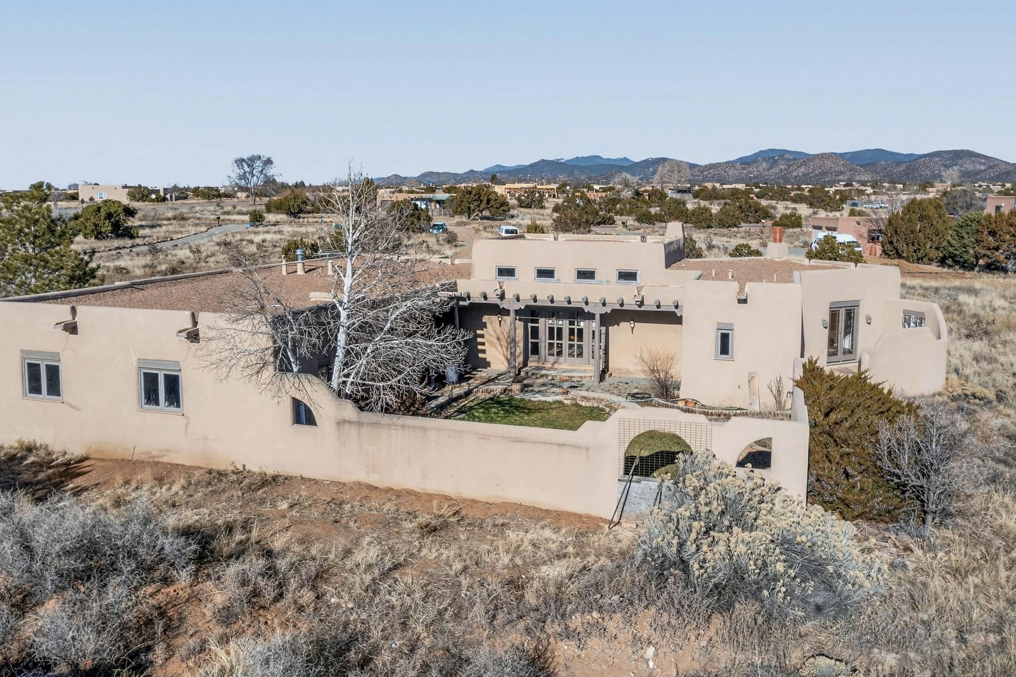 First time on the market! This charming Eldorado oasis has magnificent western views, a private back yard enclosed by curving walls and established plantings. The large kitchen has cabinets created by a local Santa Fe craftsman, and plenty of room to prep and entertain your guests. The adjacent dining area and a spacious great room with a kiva fireplace has soaring ceilings and slate floors. Hand turned Vigas, and a herringbone wood ceiling contribute to the many authentic elements found in this Santa Fe home. French doors open to the oversized courtyard with a grass lawn, garden and a sprinkler system. Follow the coved hallway to the primary bedroom with another kiva fireplace, private patio and generous bathroom. This home is filled with natural light provided by French doors and windows. There is always a beautiful view from any window or door.