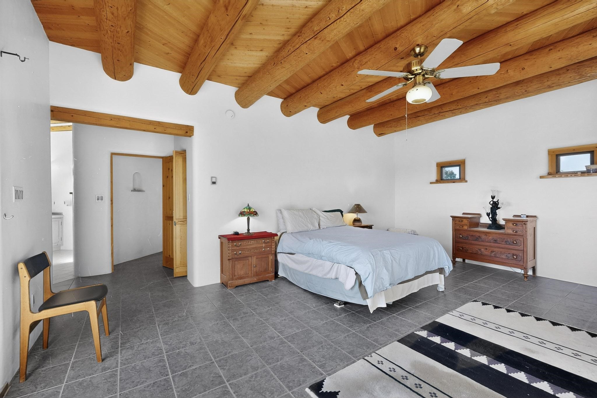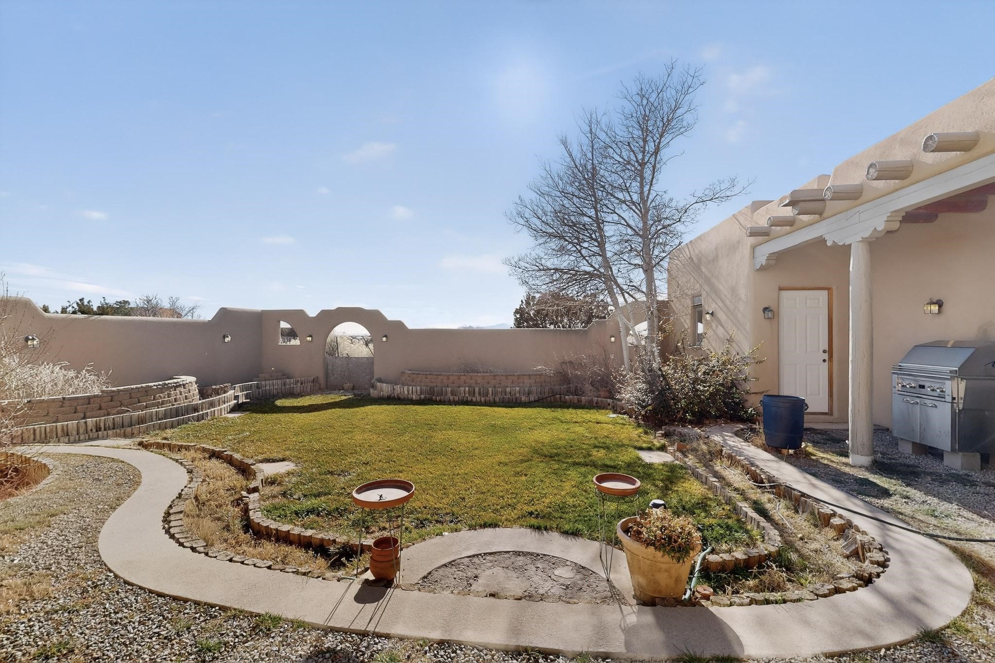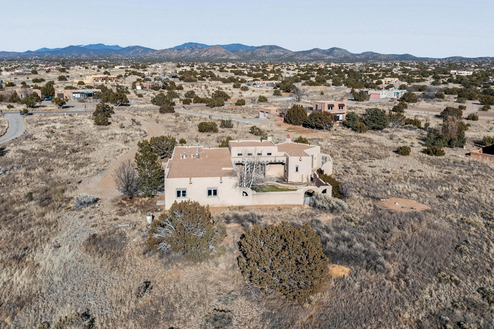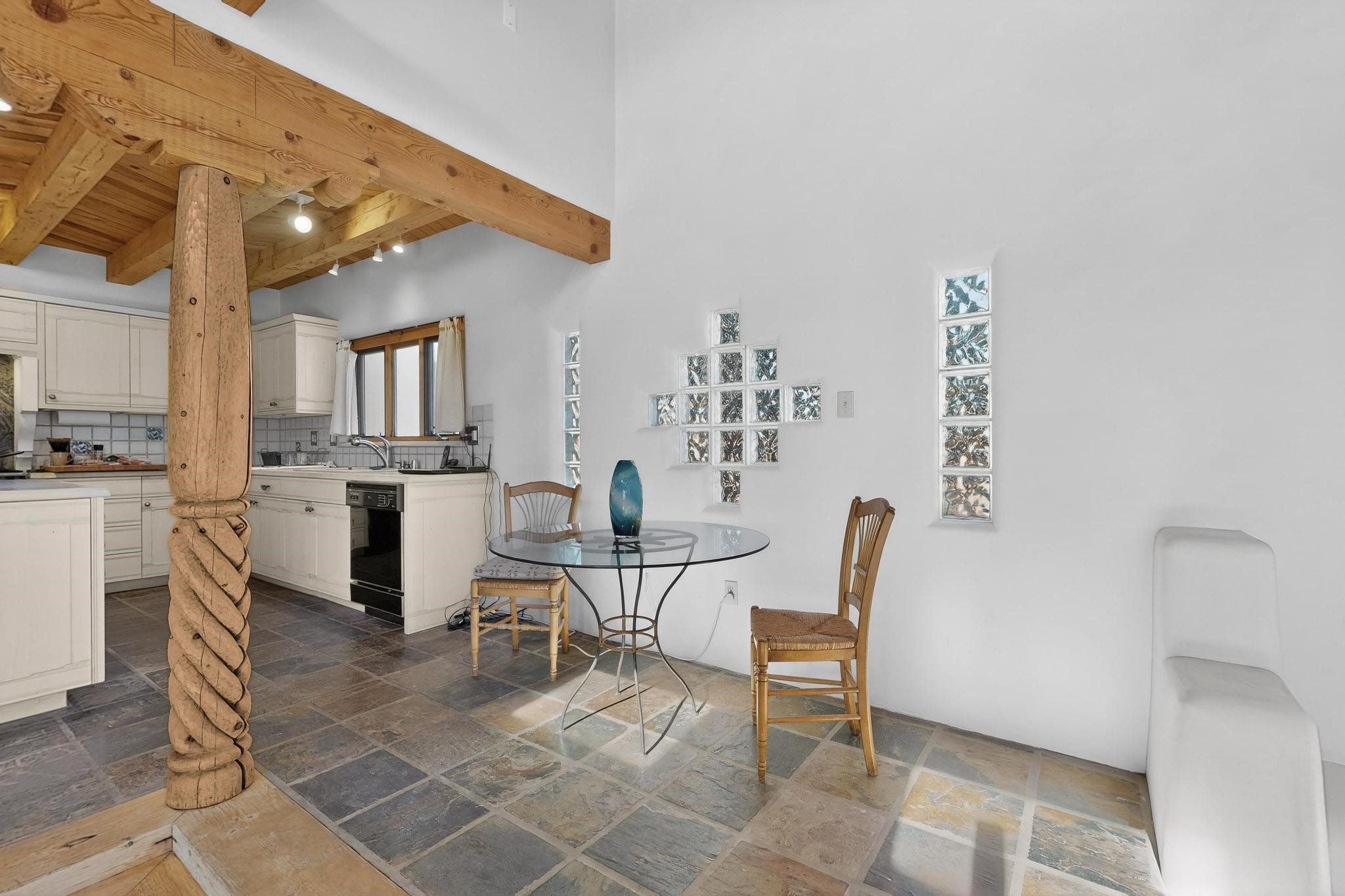 First time on the market! This charming Eldorado oasis has magnificent western views, a private back yard enclosed by curving walls and established plantings. The large kitchen has cabinets created by a local Santa Fe craftsman, and plenty of room to prep and entertain your guests. The adjacent dining area and a spacious great room with a kiva fireplace has soaring ceilings and slate floors. Hand turned Vigas, and a herringbone wood ceiling contribute to the many authentic elements found in this Santa Fe home. French doors open to the oversized courtyard with a grass lawn, garden and a sprinkler system. Follow the coved hallway to the primary bedroom with another kiva fireplace, private patio and generous bathroom. This home is filled with natural light provided by French doors and windows. There is always a beautiful view from any window or door.