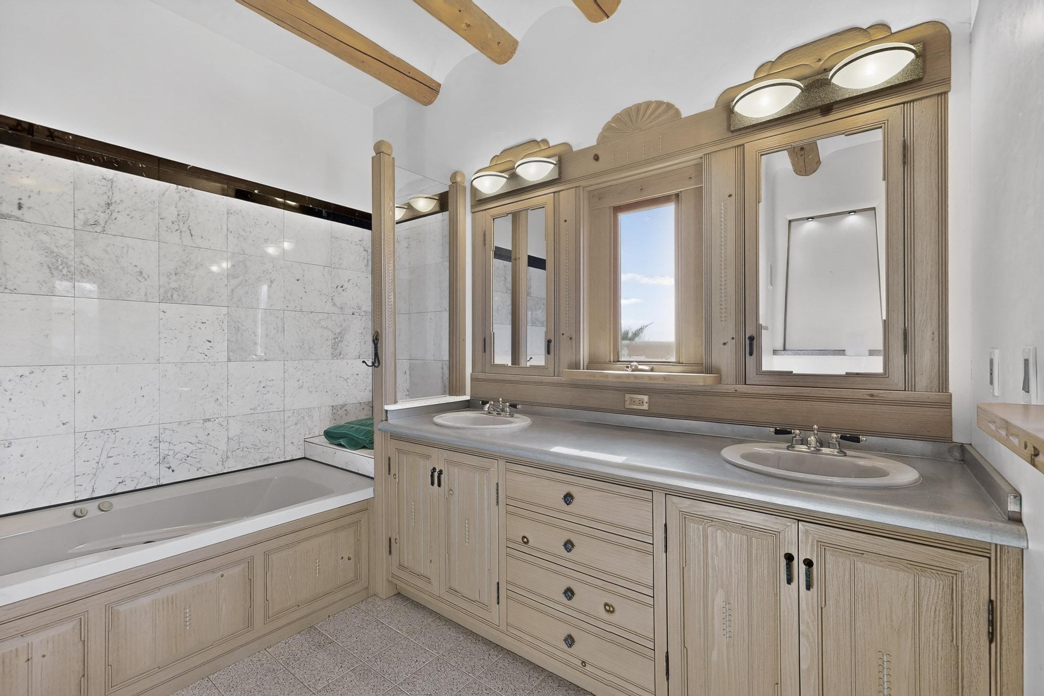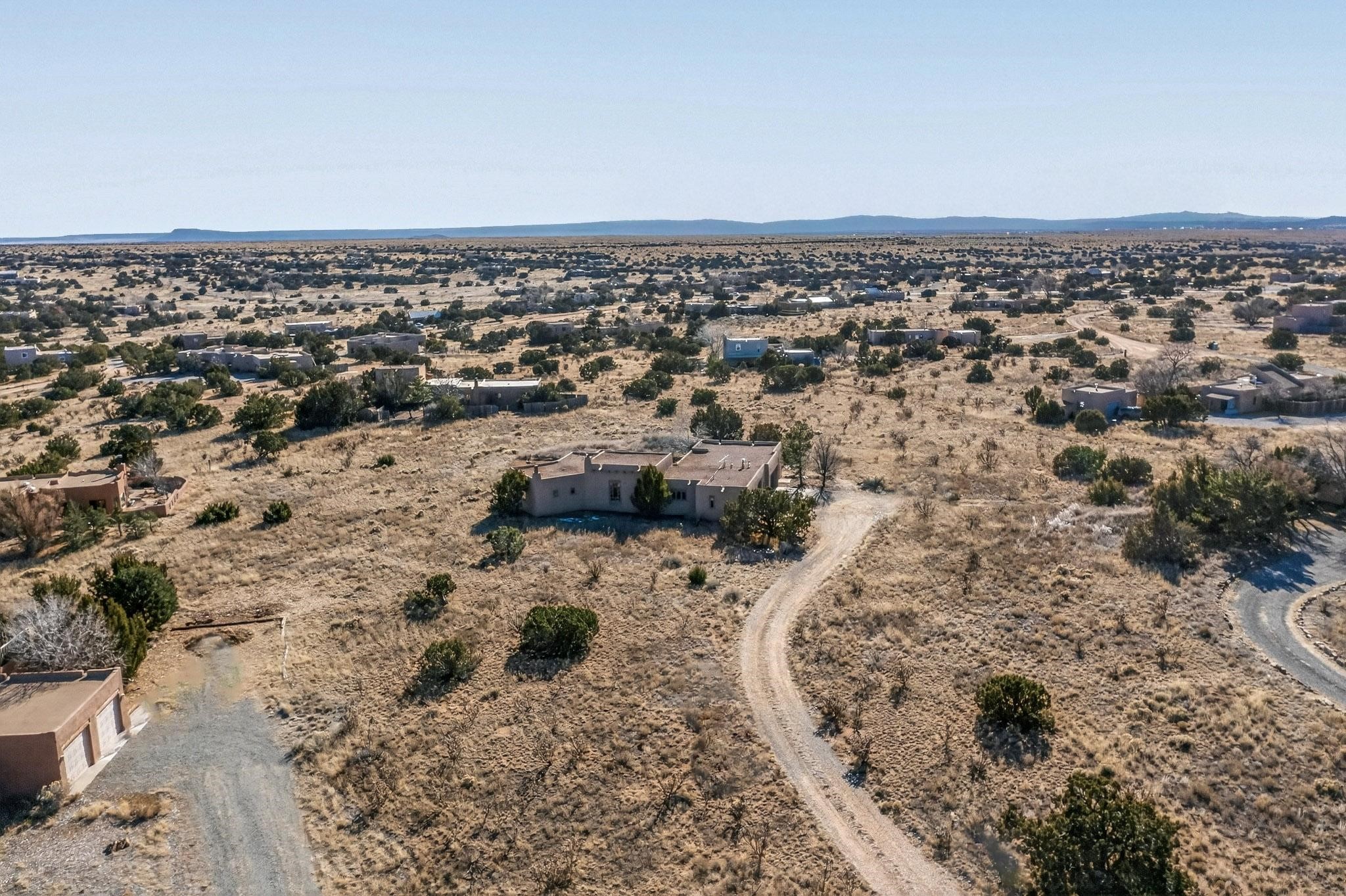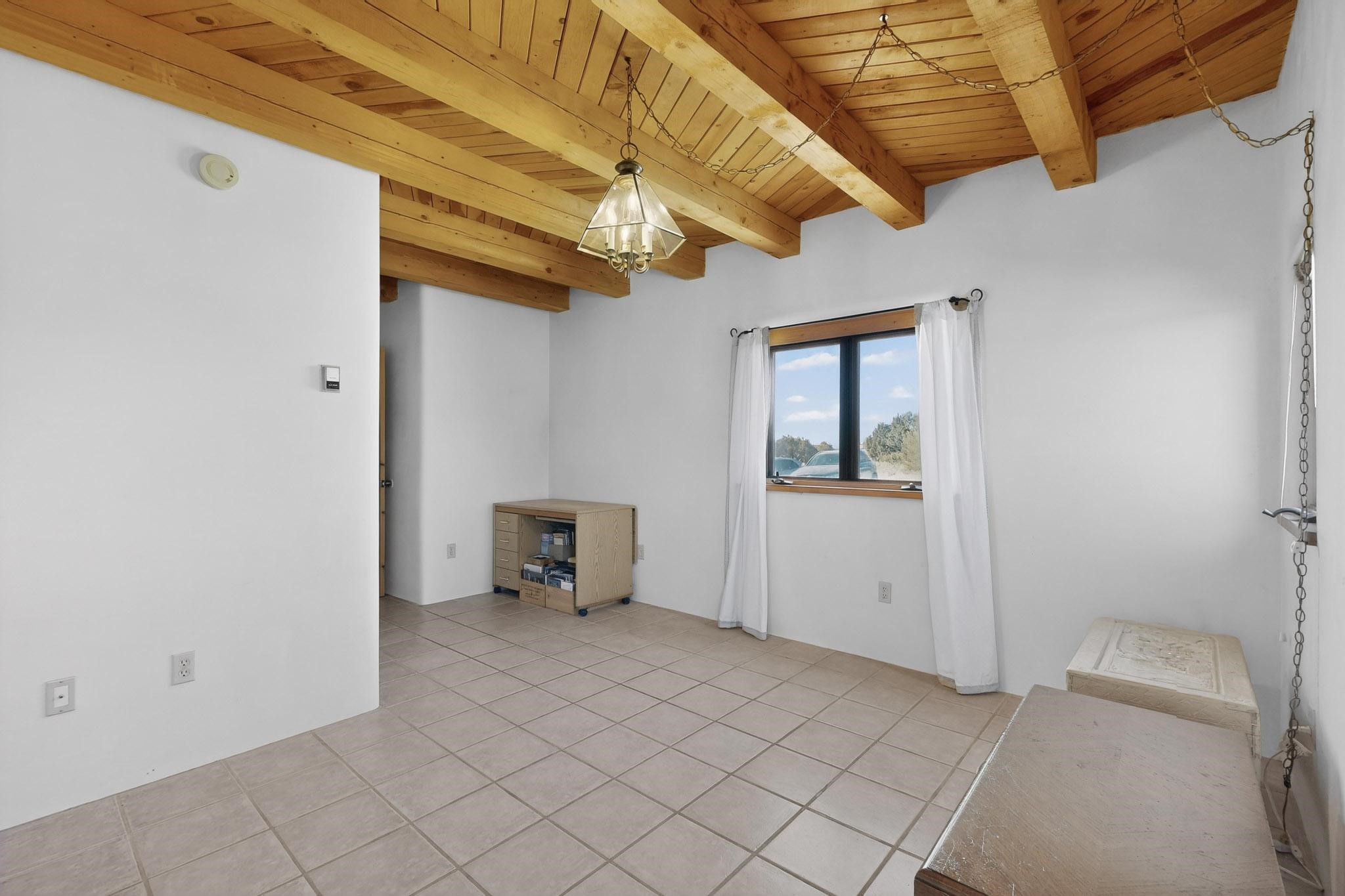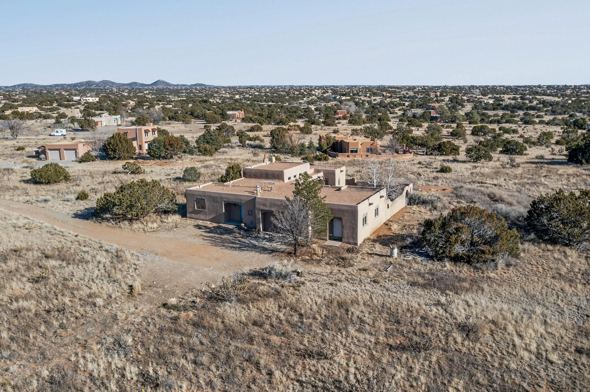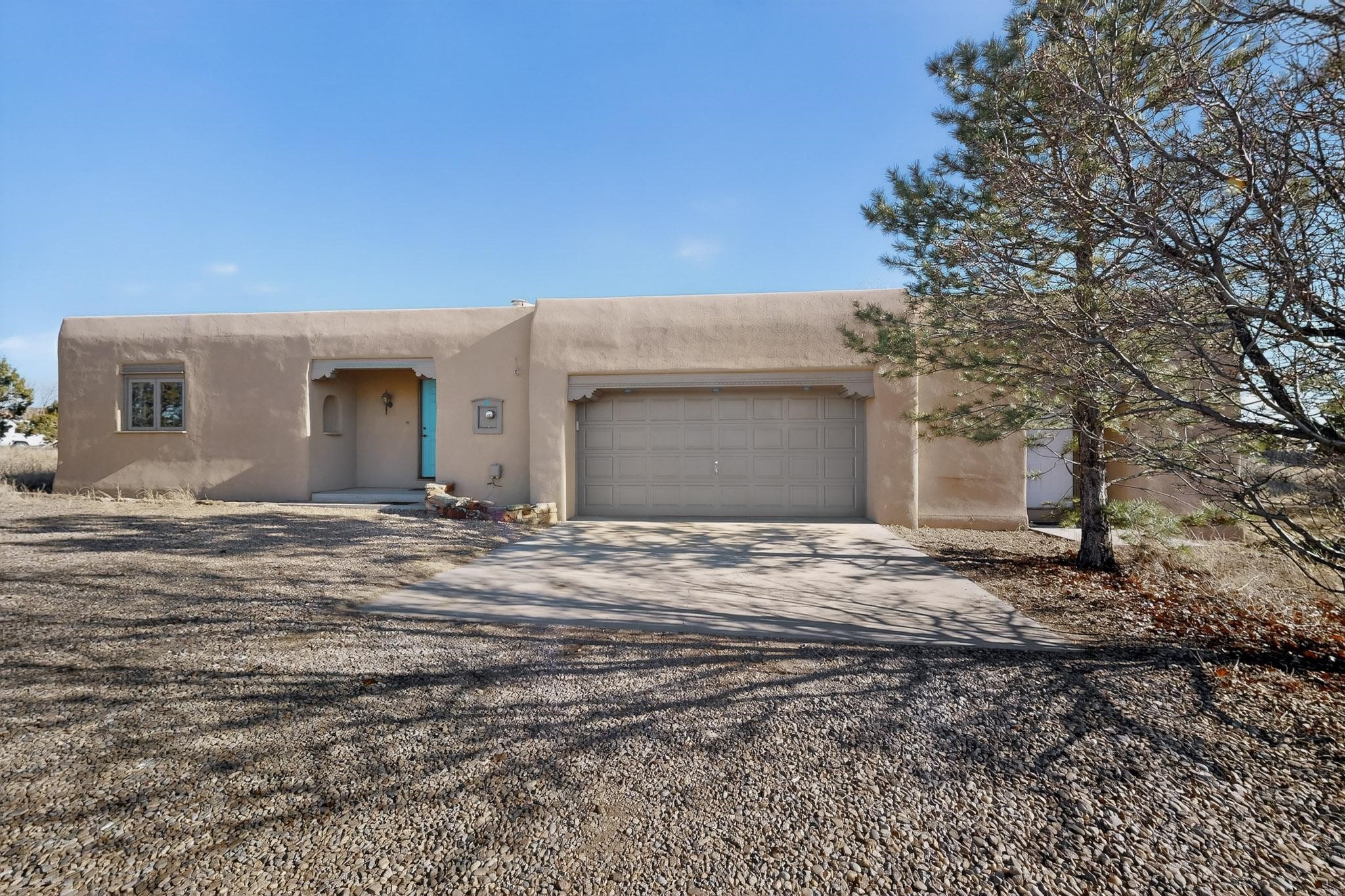 First time on the market! This charming Eldorado oasis has magnificent western views, a private back yard enclosed by curving walls and established plantings. The large kitchen has cabinets created by a local Santa Fe craftsman, and plenty of room to prep and entertain your guests. The adjacent dining area and a spacious great room with a kiva fireplace has soaring ceilings and slate floors. Hand turned Vigas, and a herringbone wood ceiling contribute to the many authentic elements found in this Santa Fe home. French doors open to the oversized courtyard with a grass lawn, garden and a sprinkler system. Follow the coved hallway to the primary bedroom with another kiva fireplace, private patio and generous bathroom. This home is filled with natural light provided by French doors and windows. There is always a beautiful view from any window or door.