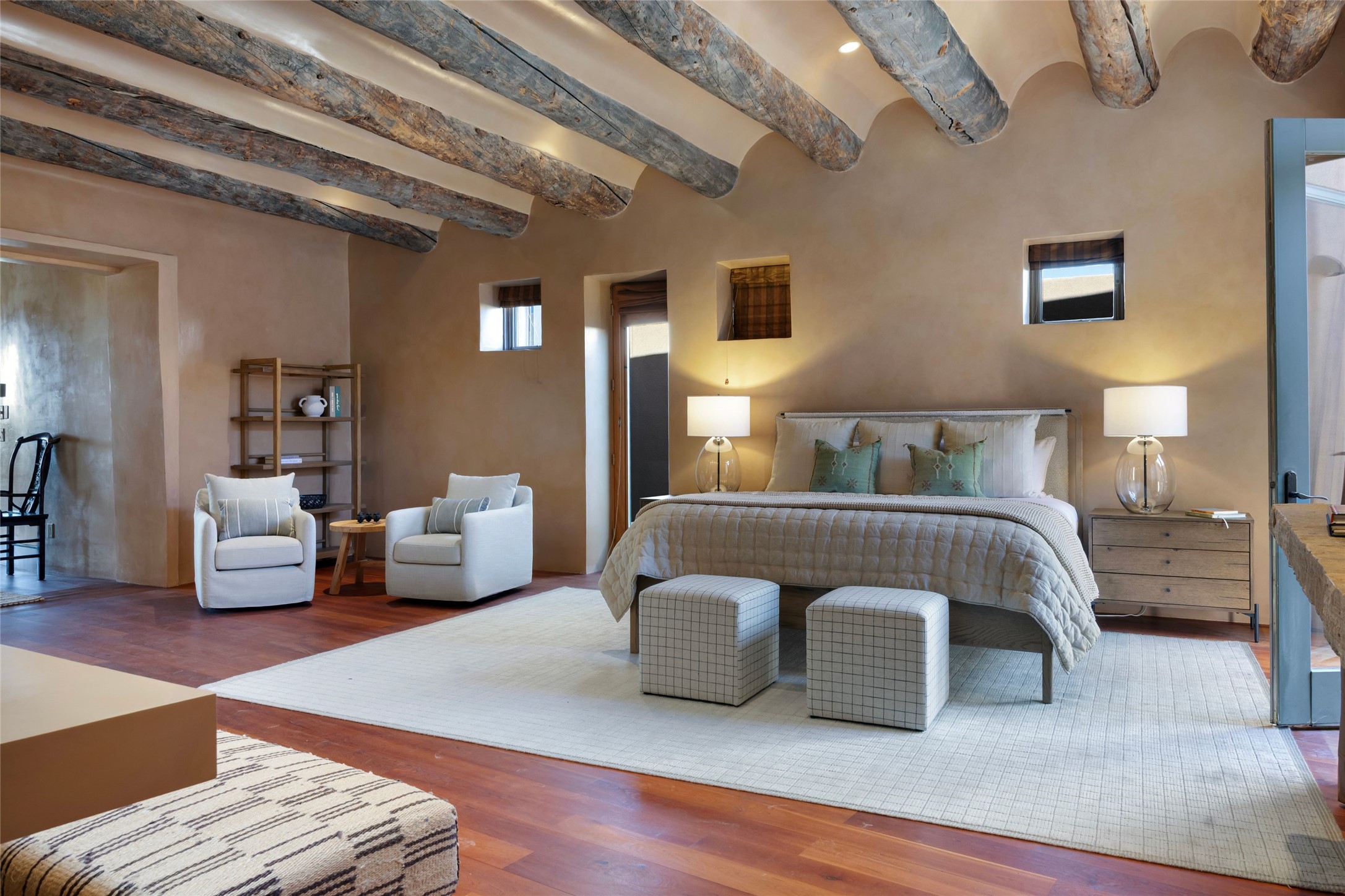 Welcome to 5 Penasco Circle, one of the most exciting estates in Santa Fe, this captivating estate impresses with commanding architecture, majestic mountain views and superior craftsmanship. Privately sited on a premiere 2.3-acre homesite within the famed Las Campanas community, this tour de force home by Turner Lechner & Romero, perfectly blends contemporary design with Northern New Mexico high desert luxury. The gallery-like formal living room stuns and welcomes as a grand centerpiece, flowing into a dining room encased in sheets of glass beneath an iconic hogan-style ceiling, framing surreal Jemez Mountain sunsets. At the heart of the home lies a professional-grade chef's kitchen, an epicurean sanctuary featuring high-performance luxury appliances, walk-in pantry, butler's pantry, and a breakfast bar that anchors the home's casual living and breakfast areas. The primary wing is a sanctuary of refined comfort, offering dual bedroom options with ensuite baths, two private offices, and stone-surround fireplaces--all opening to secluded courtyard living spaces. Three total walk-in closets ensure ample storage for the most discerning homeowner. Guests enjoy ultimate privacy in a dedicated wing featuring a spacious ensuite bedroom, plus two additional guest suites with private entrances. Additional design features include a separate media room/den with its own bath and an attached heated studio. Exceptional craftsmanship is showcased throughout the single-level interior, from quality plaster walls and rare massive vigas to curated natural stone and hardwood flooring. The outdoor experience is unrivaled, featuring vast entertaining areas, deep covered portals, and two covered entry portcacheres. A welcoming front courtyard leads to a rooftop deck providing 360-degree vistas of the high-desert landscape. With extensive guest parking and a tranquil, park-like setting, this estate represents the ultimate Santa Fe and Las Campanas lifestyle.