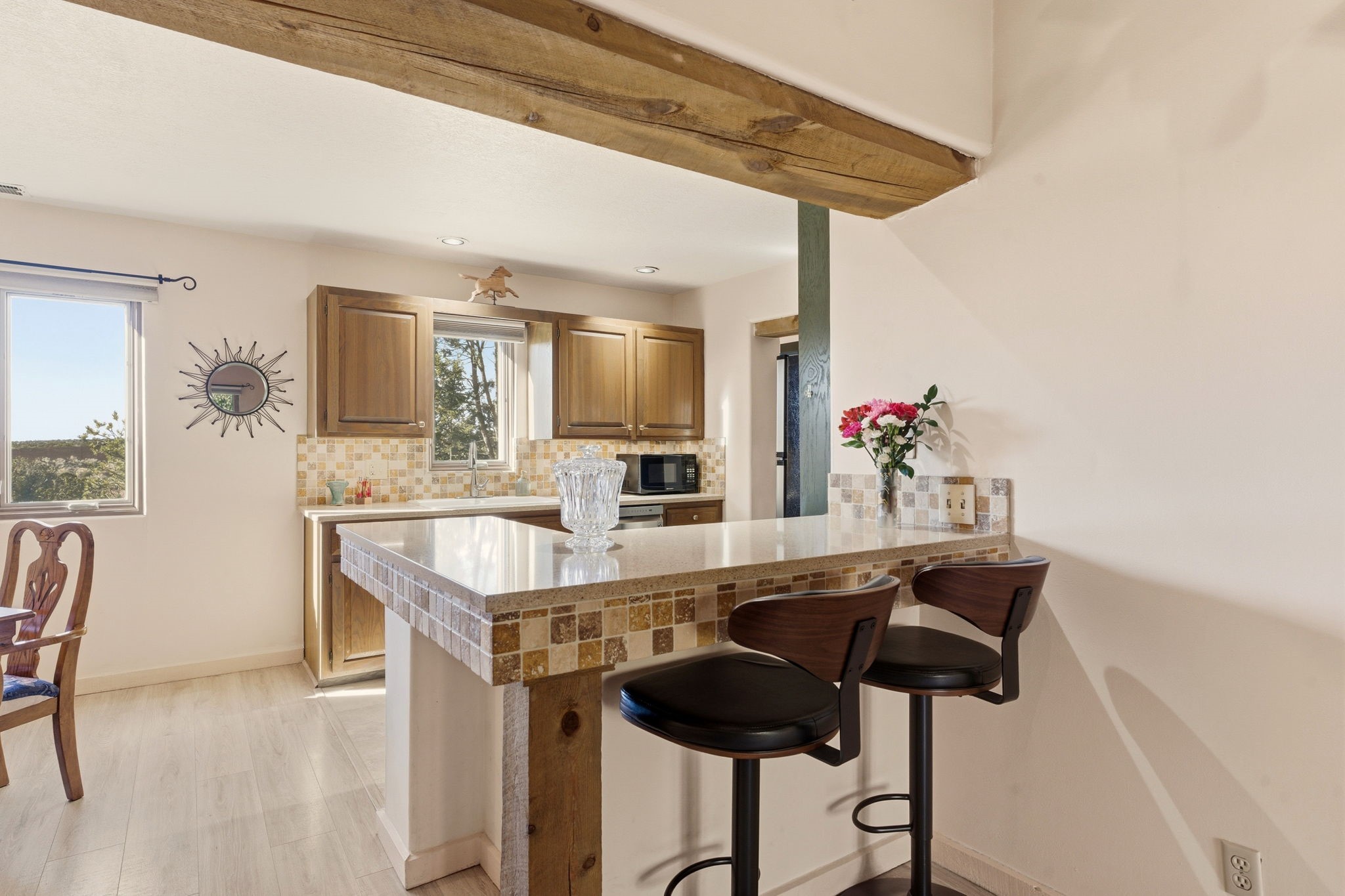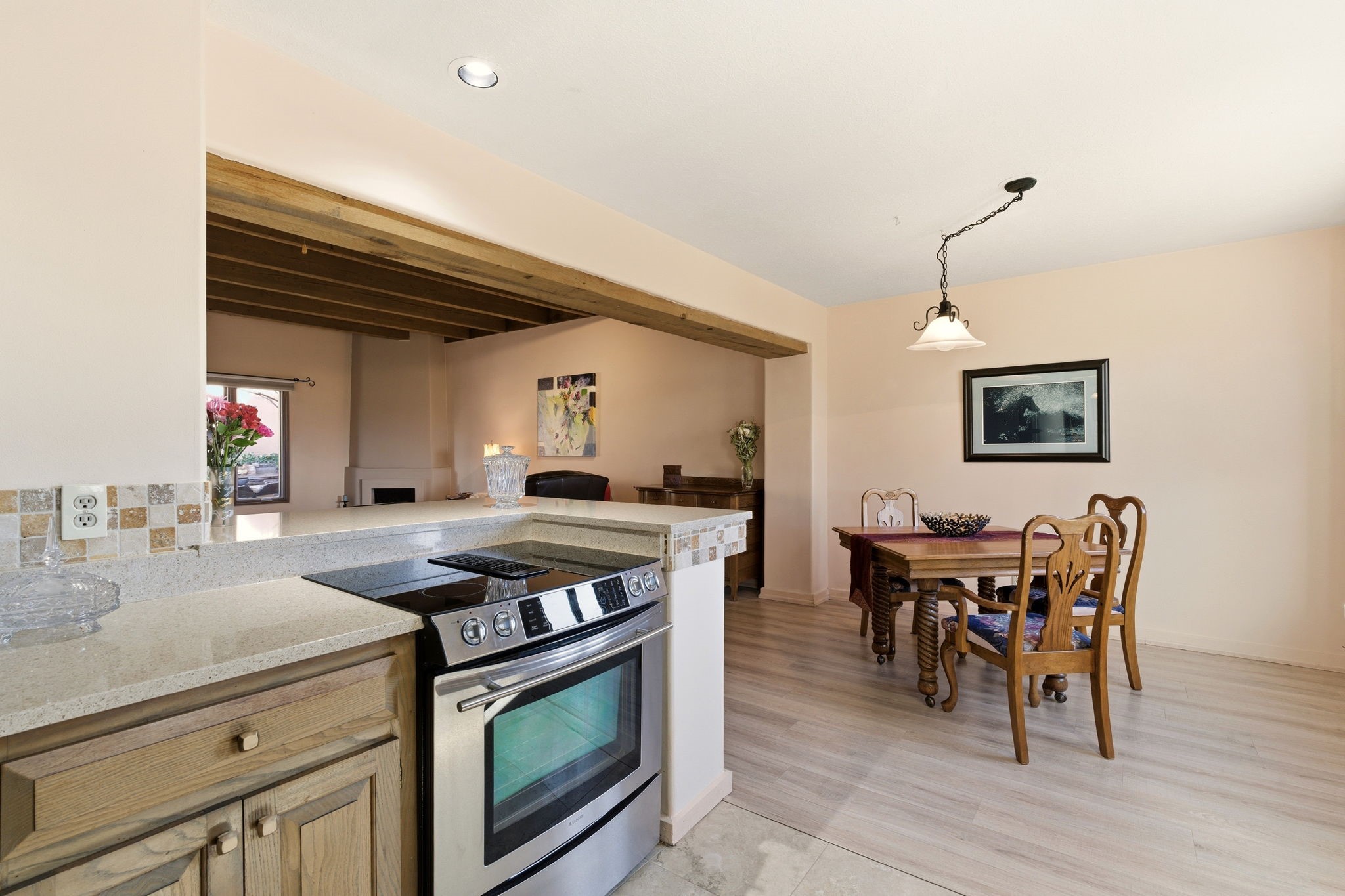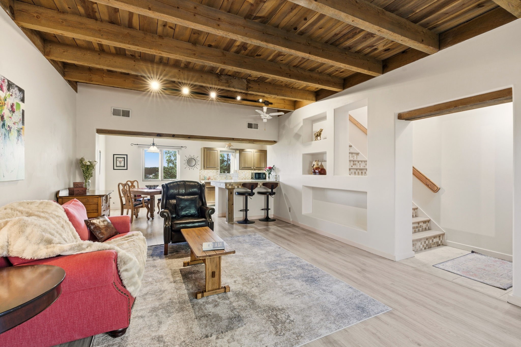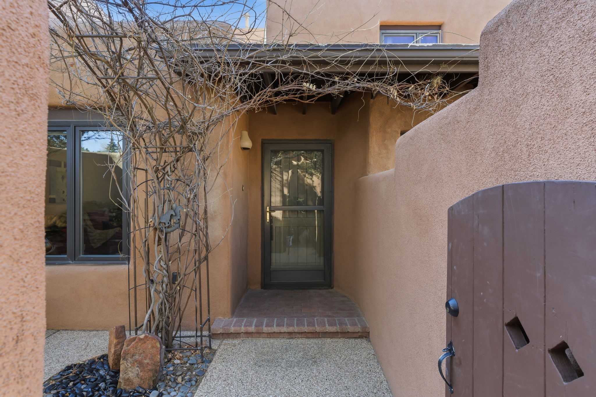 Step into serenity with this meticulous two-story Northside condo, tucked within a desirable gated neighborhood just minutes from the heart of Santa Fe. Enter through the gate into your own private, walled courtyard oasis--an enchanting welcome framed by a graceful Japanese maple, orchard rock, and ivy-lined walls that create a peaceful retreat before you even step inside. The interior offers an inviting open-concept living and dining area filled with architectural charm. Engineered wood floors, a striking corner wood-burning fireplace, high beamed ceilings, and thoughtful details throughout create warmth and character. Western views from the dining room window provide a stunning backdrop for evening meals and unforgettable sunsets. The beautifully appointed kitchen features newer appliances, including an electric stove with convection oven, elegant Silestone countertops, and timeless Travertine flooring. Just off the kitchen, you'll find a well-designed laundry room and pantry with convenient pull-out drawers, along with a stylishly remodeled bath--ideal for guests. An attached, oversized one-car garage with direct entry adds convenience, while a generous under-stairs storage closet ensures everything has its place. Upstairs, engineered wood stairs with tiled risers lead to two spacious bedrooms finished with plush wool Berber carpet. The updated full bath is a luxurious retreat, featuring a deep soaking tub, Silestone counters, and Travertine tile. Multiple skylights fill the home with natural light, enhancing the airy feel throughout. Comfort is ensured year-round with forced air heating and refrigerated A/C, and the newer foam roof with a lifetime warranty provides peace of mind for years to come. Located just a short drive to the Santa Fe Plaza, you'll enjoy easy access to shopping, coffee shops, galleries, and restaurants--while still savoring the tranquility of Northside living.