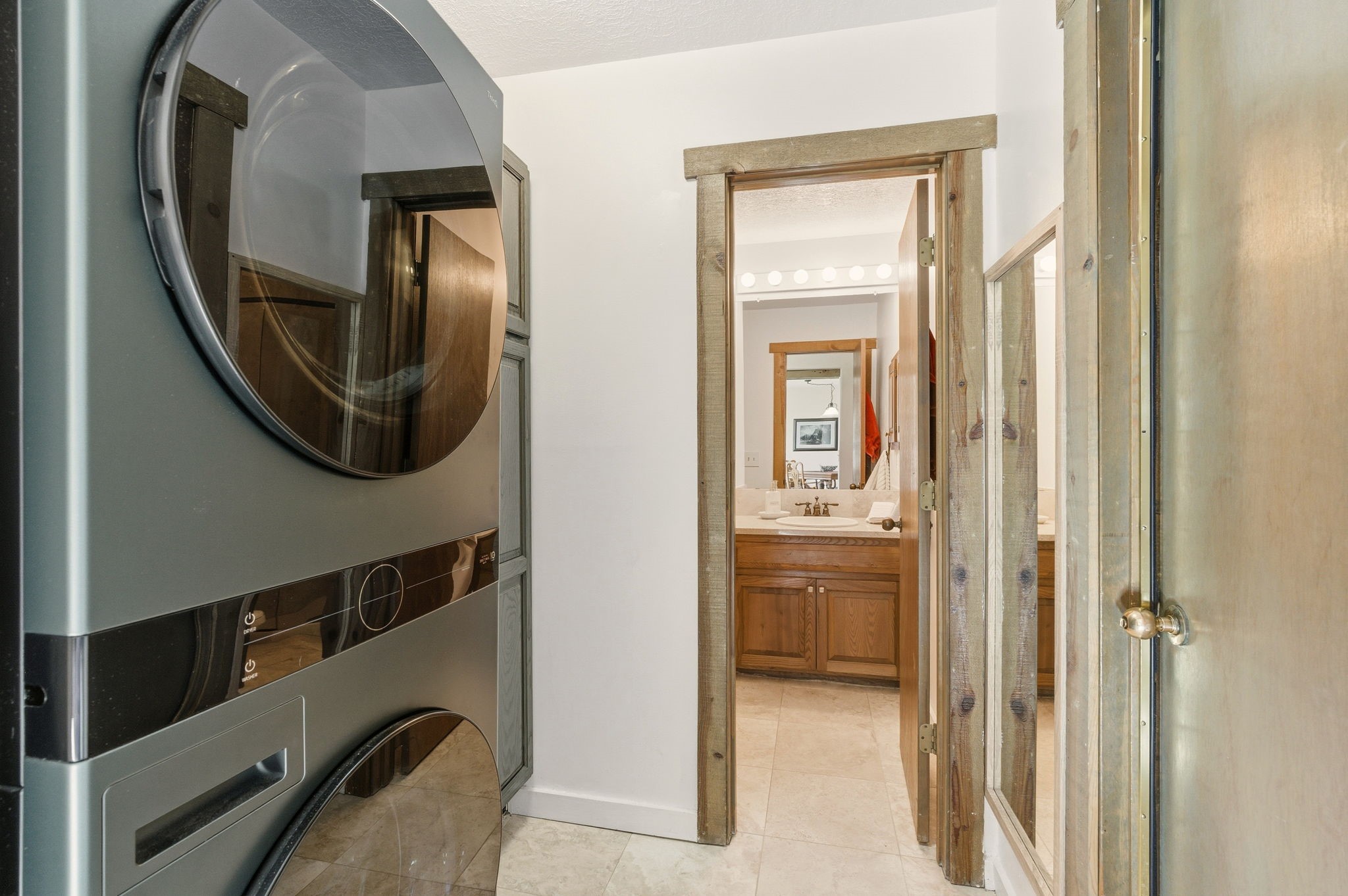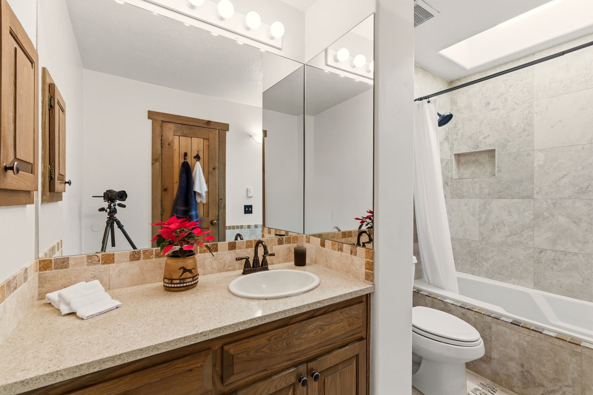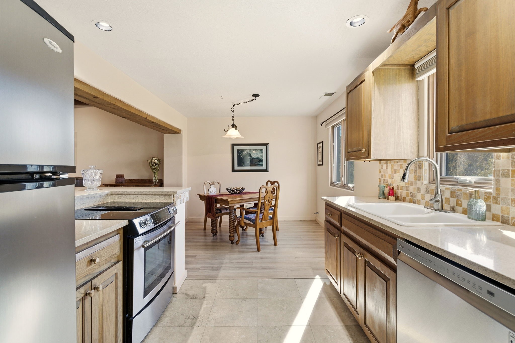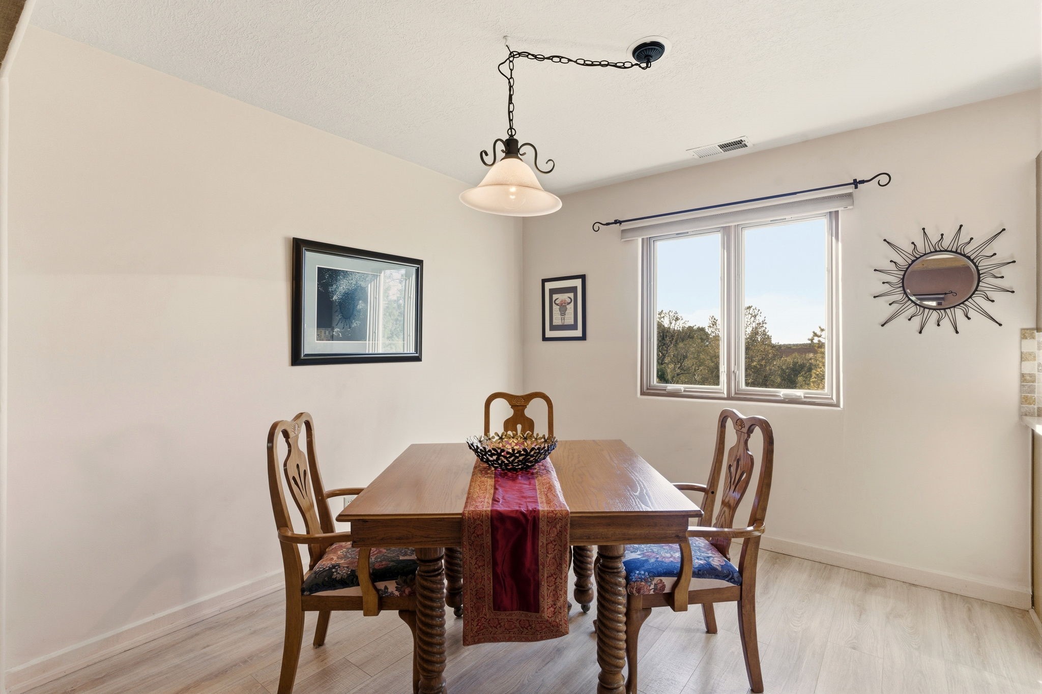 Step into serenity with this meticulous two-story Northside condo, tucked within a desirable gated neighborhood just minutes from the heart of Santa Fe. Enter through the gate into your own private, walled courtyard oasis--an enchanting welcome framed by a graceful Japanese maple, orchard rock, and ivy-lined walls that create a peaceful retreat before you even step inside. The interior offers an inviting open-concept living and dining area filled with architectural charm. Engineered wood floors, a striking corner wood-burning fireplace, high beamed ceilings, and thoughtful details throughout create warmth and character. Western views from the dining room window provide a stunning backdrop for evening meals and unforgettable sunsets. The beautifully appointed kitchen features newer appliances, including an electric stove with convection oven, elegant Silestone countertops, and timeless Travertine flooring. Just off the kitchen, you'll find a well-designed laundry room and pantry with convenient pull-out drawers, along with a stylishly remodeled bath--ideal for guests. An attached, oversized one-car garage with direct entry adds convenience, while a generous under-stairs storage closet ensures everything has its place. Upstairs, engineered wood stairs with tiled risers lead to two spacious bedrooms finished with plush wool Berber carpet. The updated full bath is a luxurious retreat, featuring a deep soaking tub, Silestone counters, and Travertine tile. Multiple skylights fill the home with natural light, enhancing the airy feel throughout. Comfort is ensured year-round with forced air heating and refrigerated A/C, and the newer foam roof with a lifetime warranty provides peace of mind for years to come. Located just a short drive to the Santa Fe Plaza, you'll enjoy easy access to shopping, coffee shops, galleries, and restaurants--while still savoring the tranquility of Northside living.