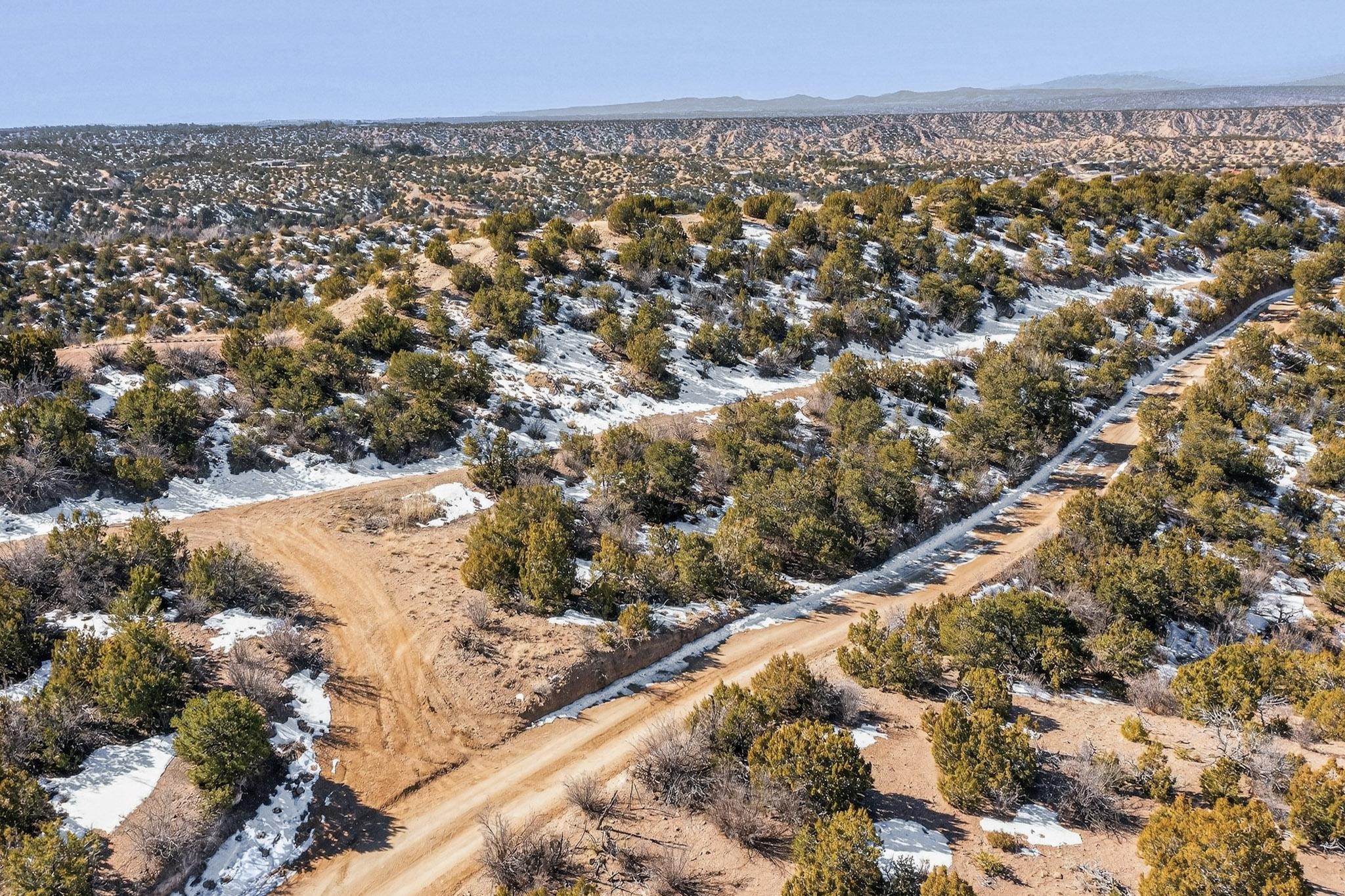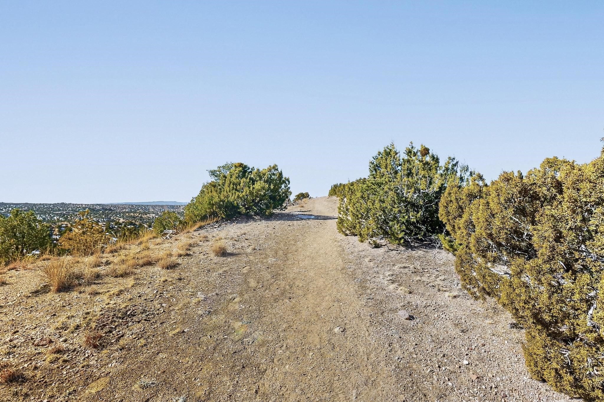 Breathtaking views from this astonishing 15 acre ridge top lot in a small private and gated subdivision moments from the village of Rio En Medio which has offers access to a trail head into the mountains of the National Forest and a nearby waterfall. A deep, sandy bottomed, canyon cuts through the lot. Shared well and power available. Short, level and private access road (easement) off the main road. Minimal CC&Rs. All 5 lots can be purchased as a package. The buildable site offers spectacular views but will need expert construction and design flair for each terrain. Two minutes drive to fine dining at the Four Seasons Encantado Resort. The Tesuque Village Market is 5 minutes and Santa Fe itself another 10.