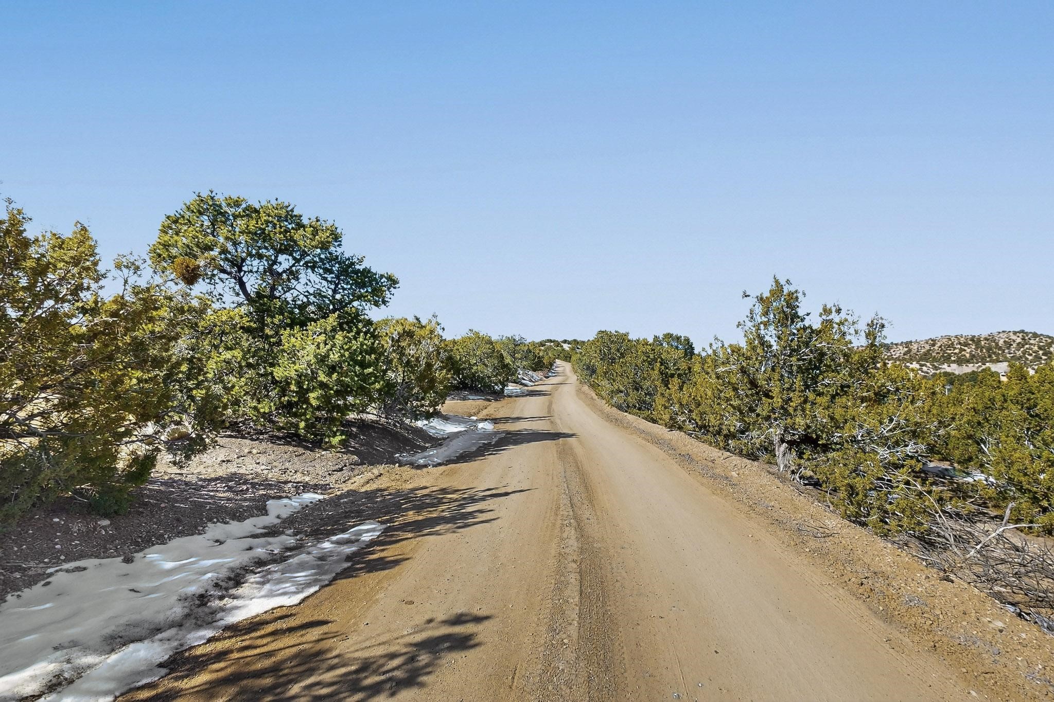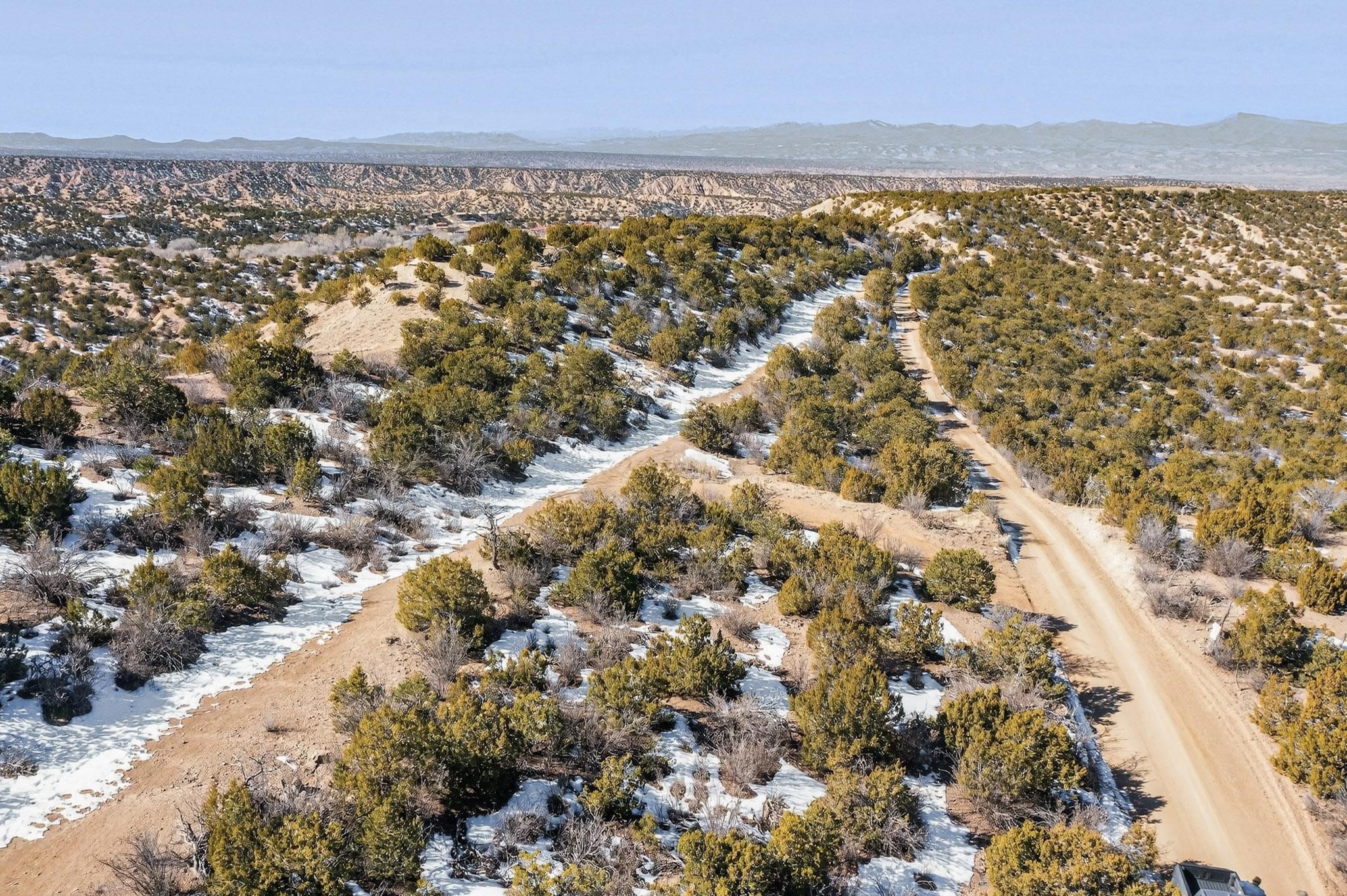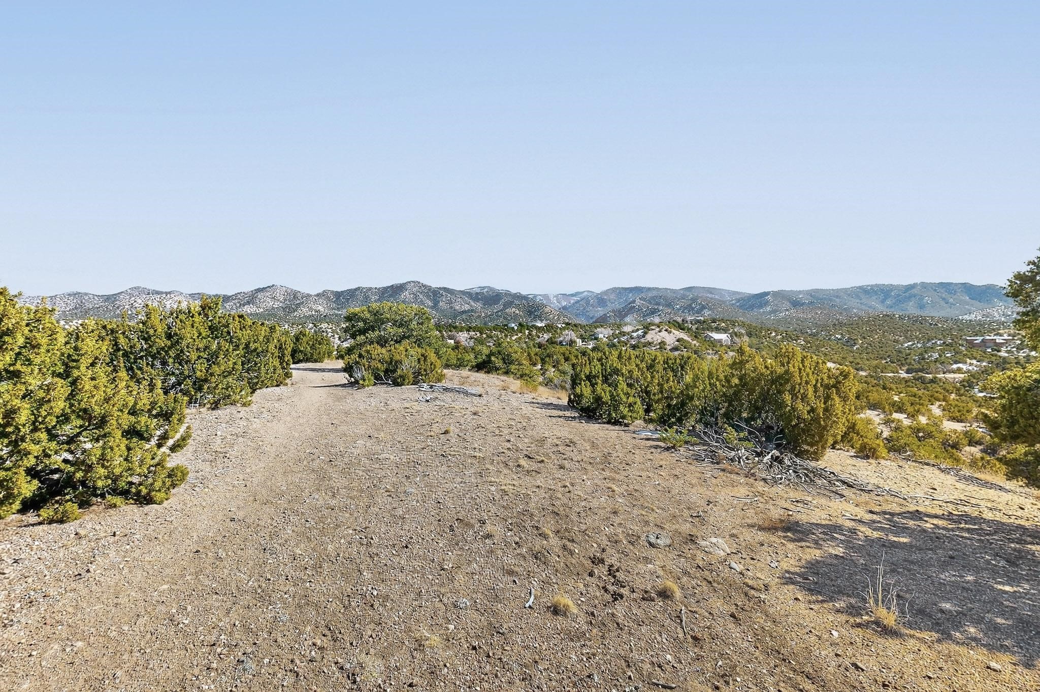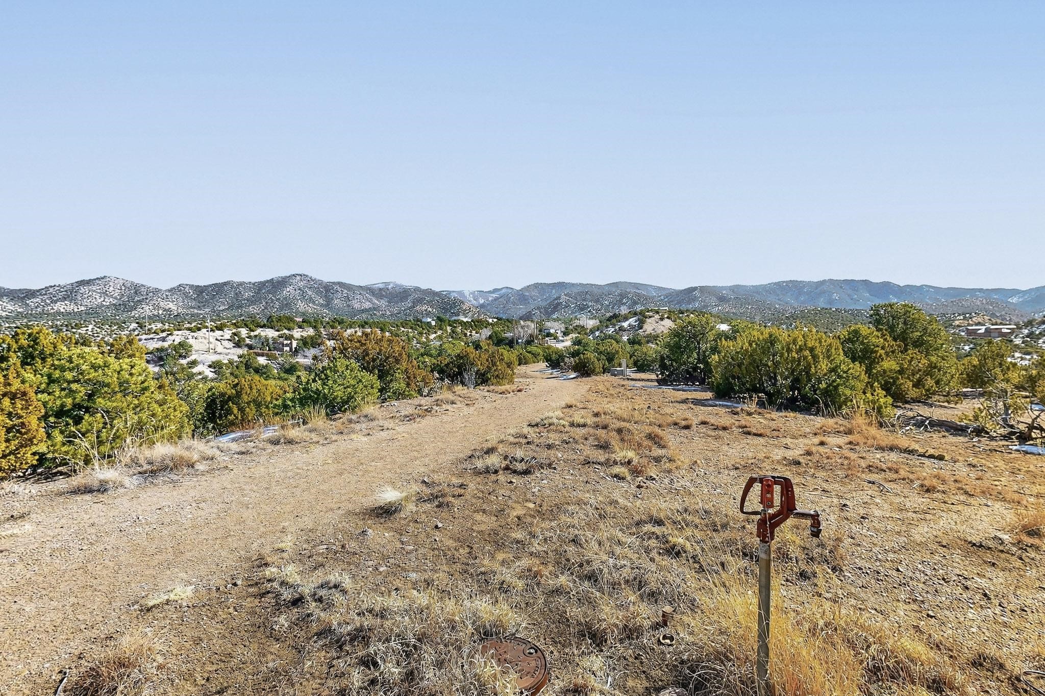 Breathtaking views from this astonishing 5.6 acre ridge top lot in a small private and gated subdivision moments from the village of Rio En Medio, which offers access to a trail head into the mountains of the National Forest and a nearby waterfall. A deep, sandy bottomed, canyon cuts through the lot. On Rio en medio community water. Power available. First lot inside the gate with a large flat building site . Minimal CC&Rs. All 5 lots can be purchased as a package. 2 minutes drive to fine dining at the Four Seasons Encantado Resort. Tesuque Village Market is 5 minutes and Santa Fe itself another 10.
