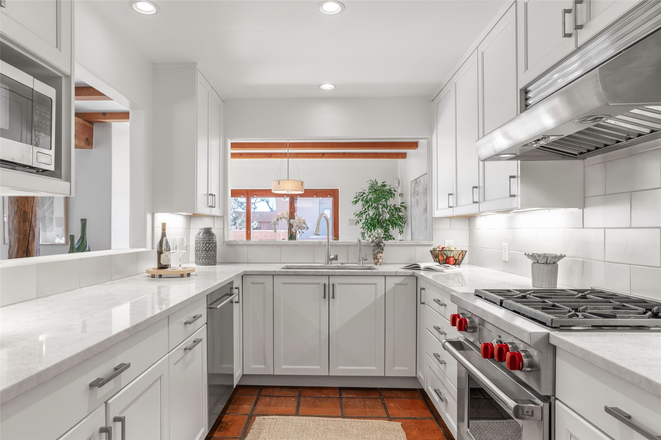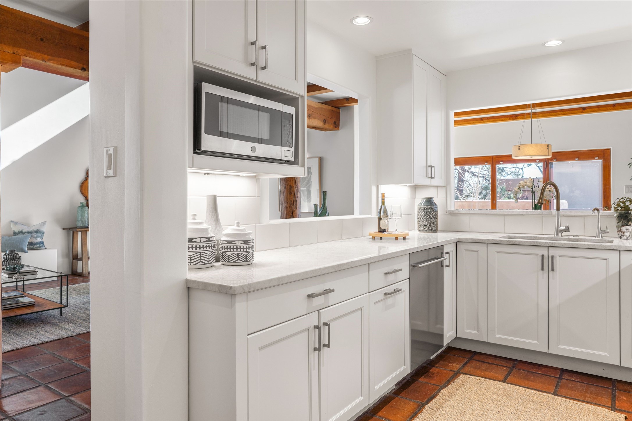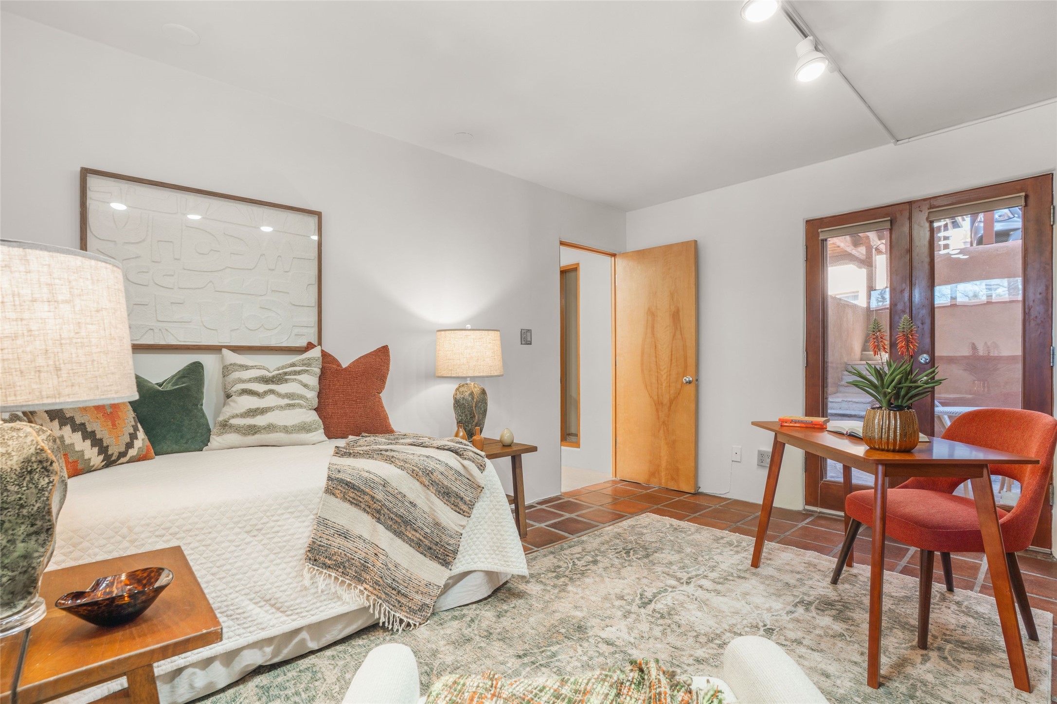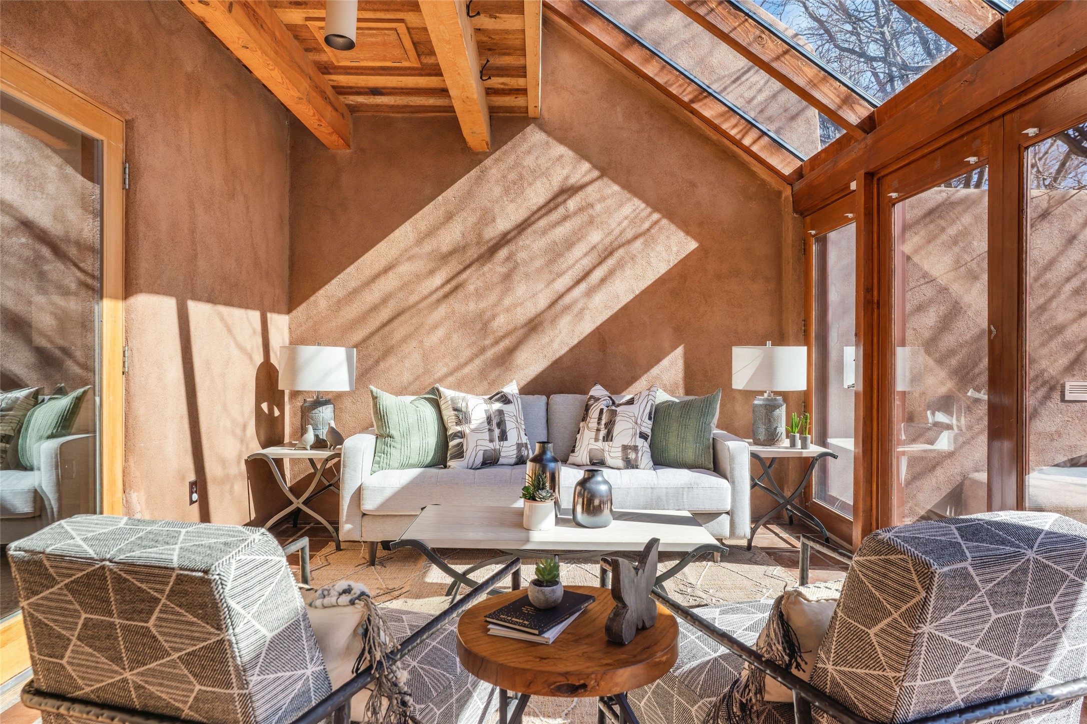 Nestled in the heart of historic Santa Fe just steps from Canyon Road, galleries, restaurants and the historic Plaza, this refined condominium in the highly sought after La Vereda Compound offers a rare blend of traditional charm and modern sophistication. Boasting 2 spacious bedrooms, a large office (perfect for remote work or guest overflow), 2 full bathrooms, and a half bath, this home is thoughtfully designed for comfort, convenience, and style. The updated kitchen features high-end appliances including a gas oven/range, contemporary cabinetry, and premium finishes, making is a delight for home chefs and entertainers alike. The high ceiled living and dining area are warm and inviting, with classic Santa Fe touches throughout. An added bonus to this property is the solarium off the living and dining rooms which provides extra living space as well as passive solar heat. There is a large laundry room and an extra utility/storage room. Upstairs, the primary suite opens to a private balcony with lovely views - an ideal spot for morning coffee or sunset unwinding. Enjoy serene surroundings and beautifully maintained grounds in a quiet community. Whether your seeking a peaceful getaway, a lock-and-leave second residence, or a sophisticated pied-a-terre, this La Vereda gem offers the quintessential Santa Fe lifestyle.