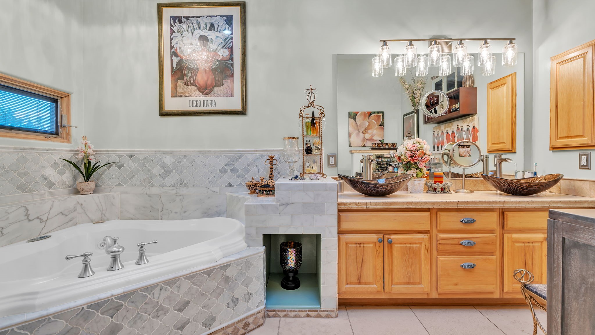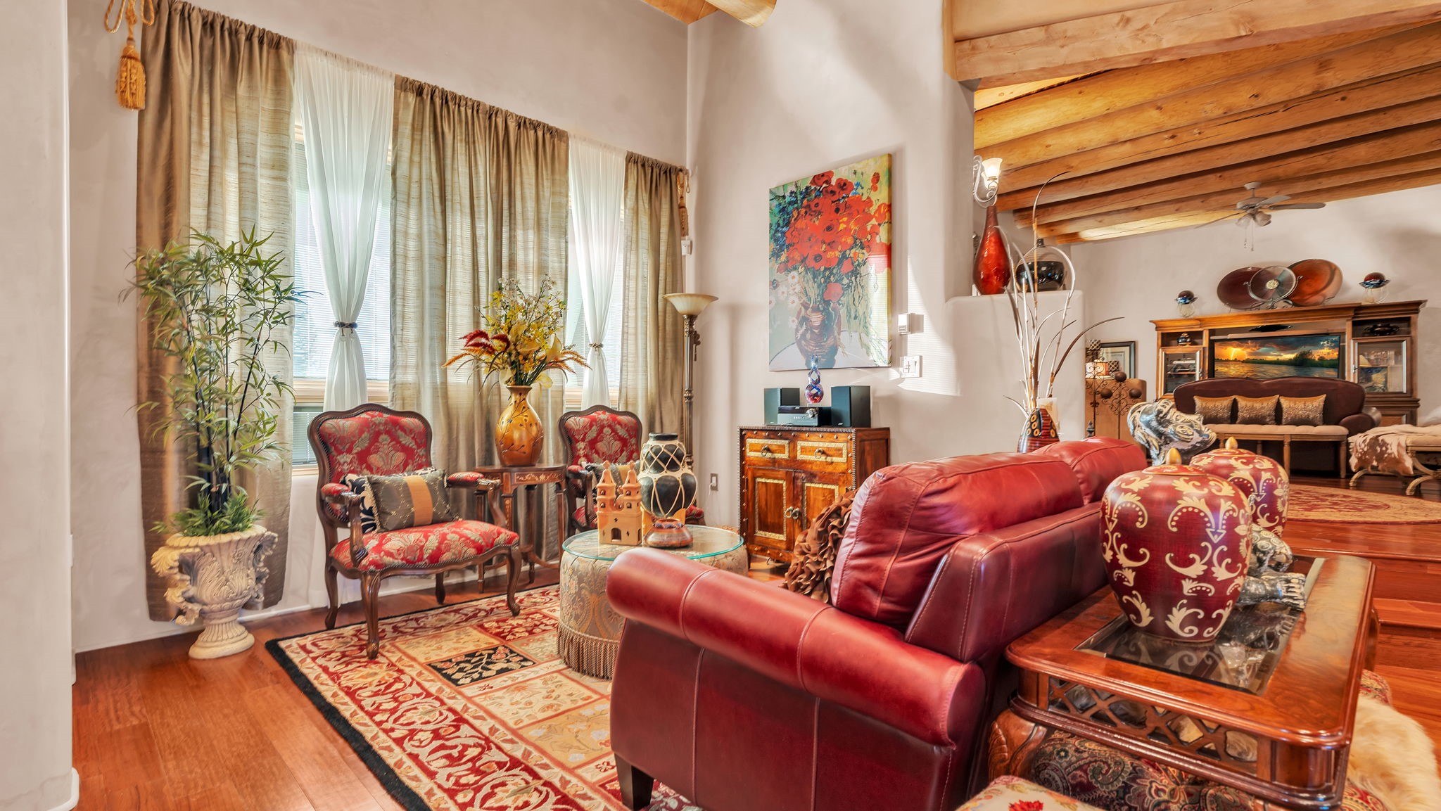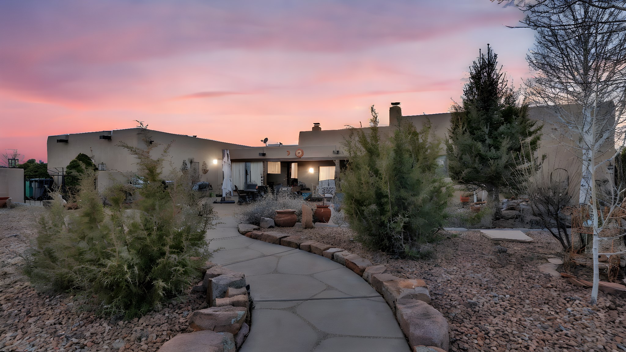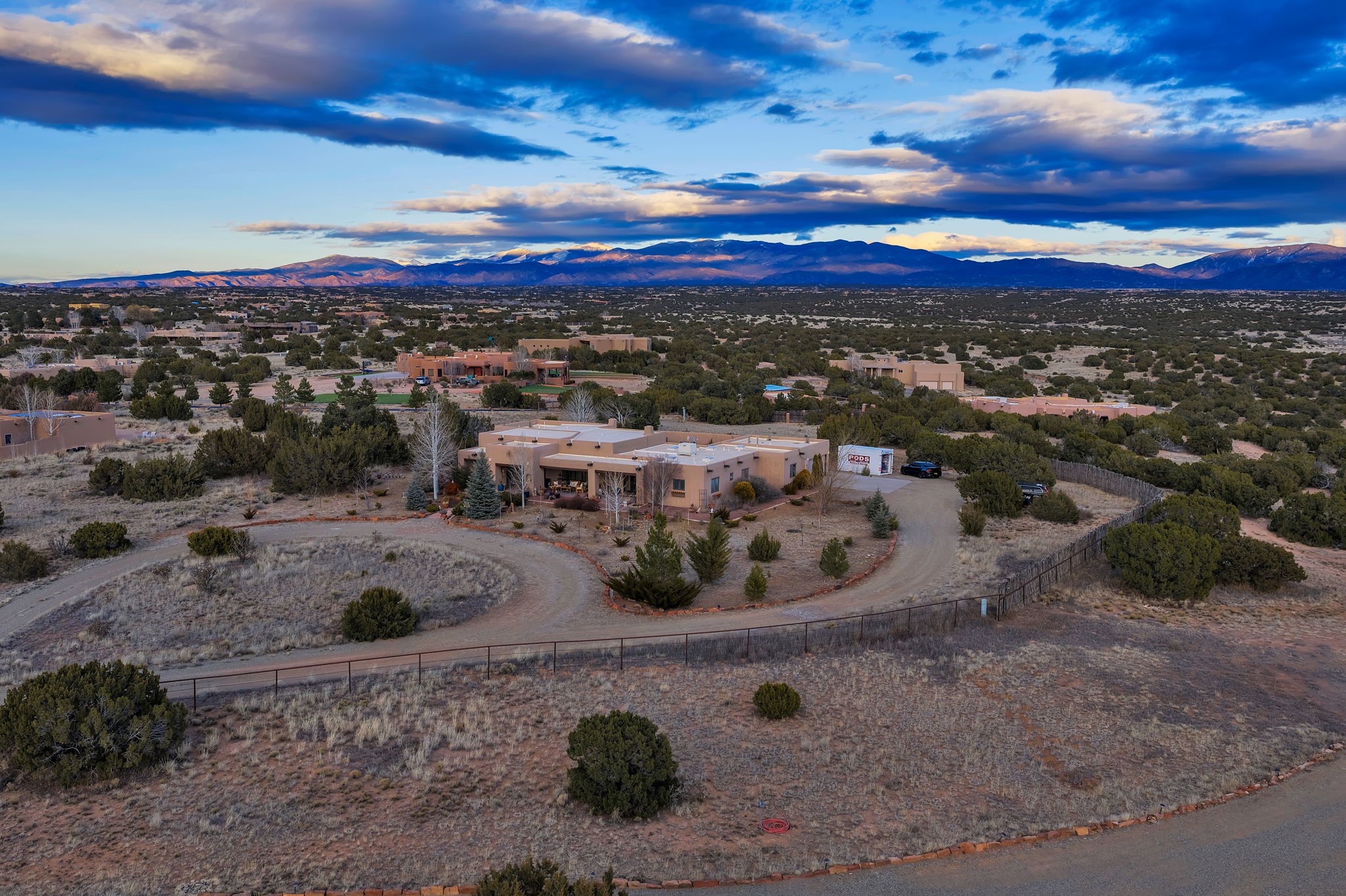 Experience the magic of Santa Fe in this stunning 3,000+ sq. ft. custom-built home featuring 4 bedrooms and 2.5 baths on 2.5 private acres -- with space and potential to add a casita or guest house (subject to county and architectural approval).Designed with timeless Southwestern character, this home showcases diamond plaster walls, exposed viga cedar wood ceilings, beautiful skylights, rich African hardwood flooring, and two wood-burning kiva fireplaces. The open-concept floor plan flows effortlessly into a beautifully upgraded kitchen with granite countertops, custom cabinetry, and newer appliances -- perfect for entertaining.Enjoy radiant floor heating throughout the home and insulated garage. Beautiful Pella windows that frame incredible mountain, sunset, and city views, filling the home with natural light.Outdoor living shines with covered front and back portals, a walled and landscaped backyard, and a serene custom pond with waterfall -- creating a private retreat ideal for relaxing or hosting guests. The spacious primary suite opens directly to a portal and features a large walk-in closet and spa-like feel.Additional highlights include a 2023 TPO roof with transferable warranty and proximity to Marty Sanchez Golf Course.Privacy, charm, breathtaking views, and true Santa Fe style -- this is the luxury retreat buyers have been waiting for.