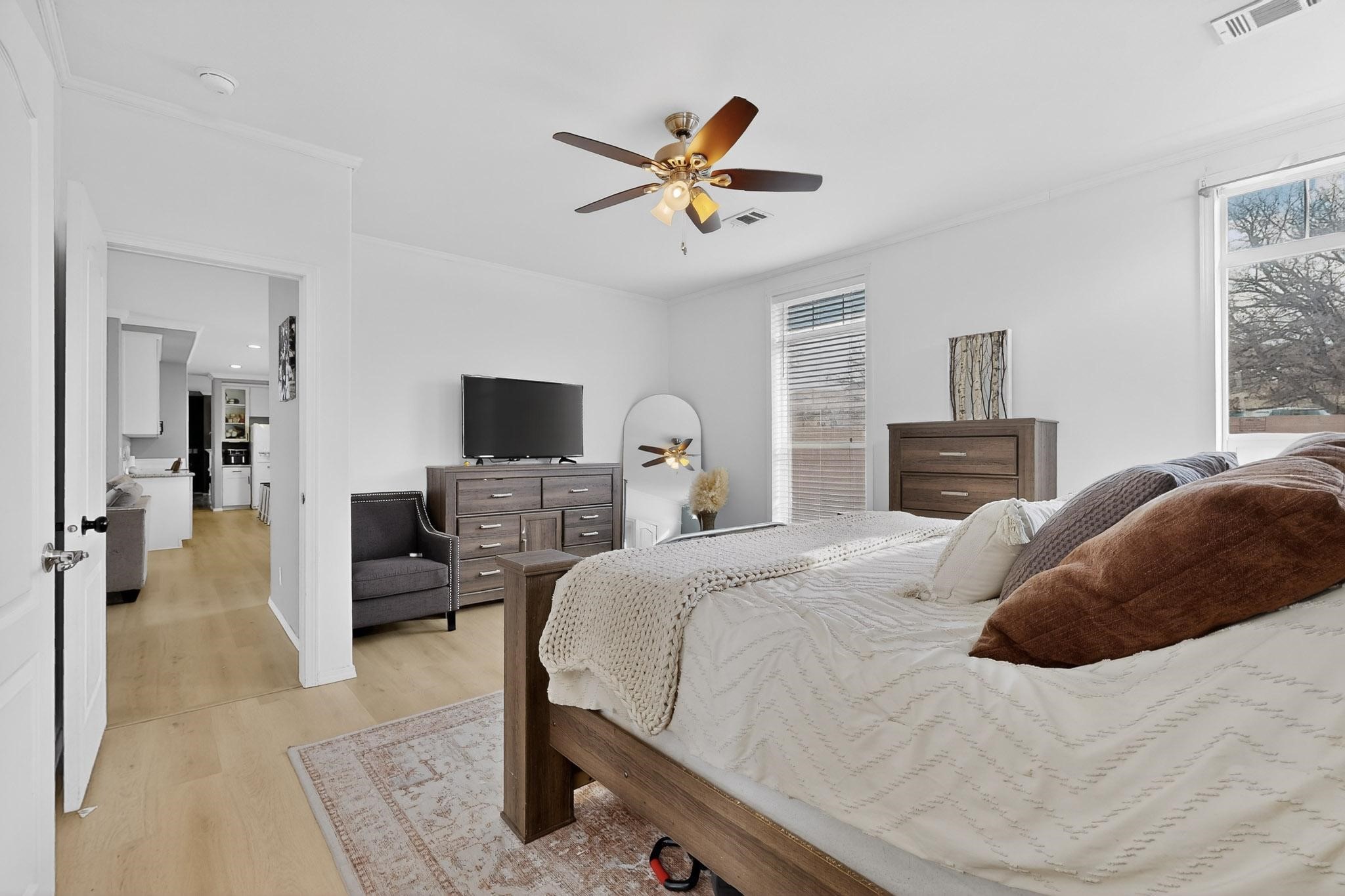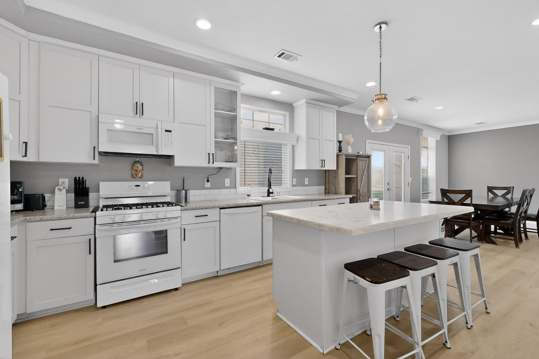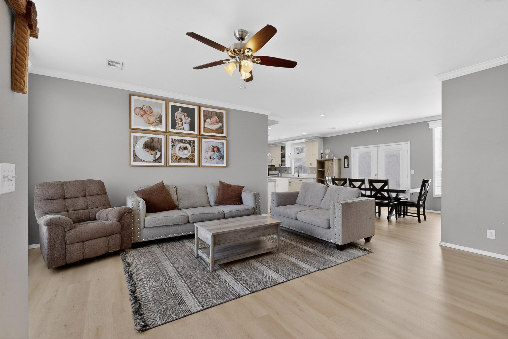 Thoughtfully updated and move-in ready, this 3-bedroom, 2-bath modular home sits on a desirable corner lot with a permanent foundation and numerous seller improvements. The bright, open-concept floor plan features new luxury vinyl plank flooring throughout the main living areas, creating a clean and cohesive living space ideal for everyday comfort and entertaining. The kitchen offers crisp white cabinetry, modern appliances, and a spacious center island with seating for four, seamlessly connecting to the dining area, which includes a built-in hutch and direct access to the backyard for easy indoor-outdoor living. The primary suite provides a private retreat with an oversized walk-in closet and a remodeled en-suite bath featuring dual sinks and a soaking tub. Two additional bedrooms share a well-appointed full bath, offering flexibility for guests, family, or a home office. A second living area adds valuable versatility and can function as a den, media room, or playroom depending on your needs. Outdoor spaces include a side pergola with covered dining area, a large patio, garden areas, retaining wall, and fencing that enhance both usability and privacy. Conveniently located in the heart of Espaola with easy access to Santa Fe and Los Alamos, this well-maintained home offers comfort, functionality, and an excellent opportunity to enjoy Northern New Mexico living.
