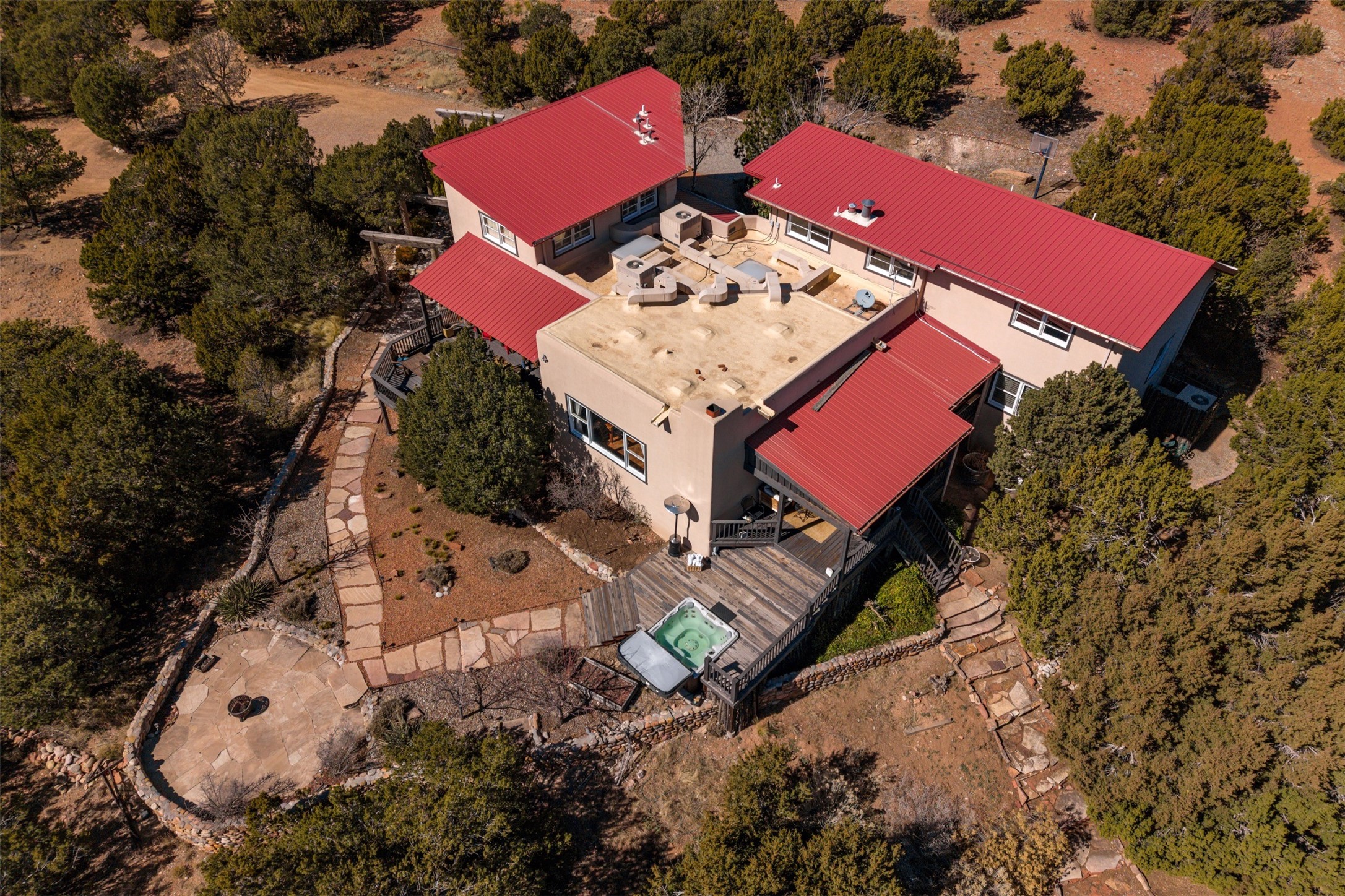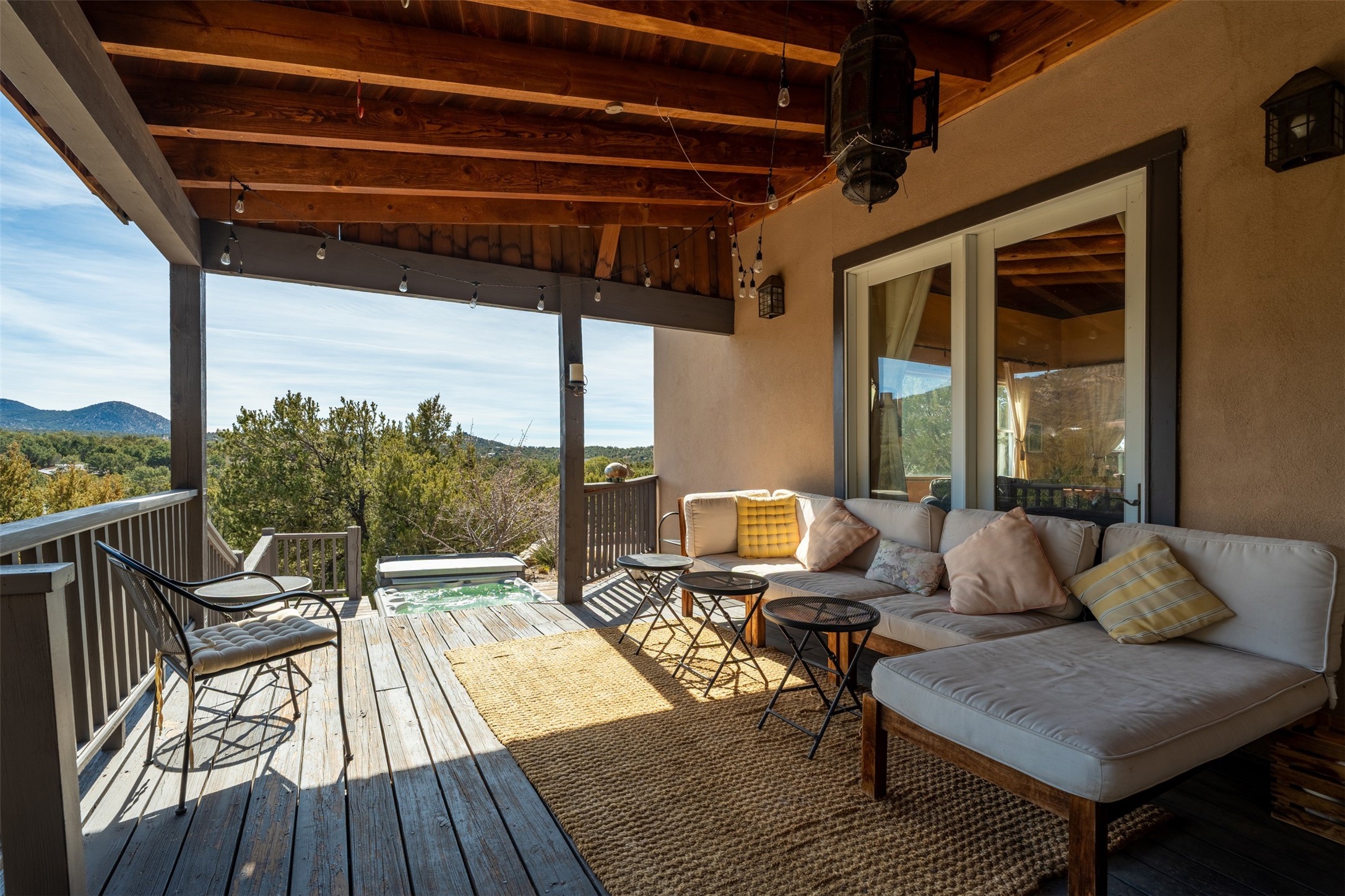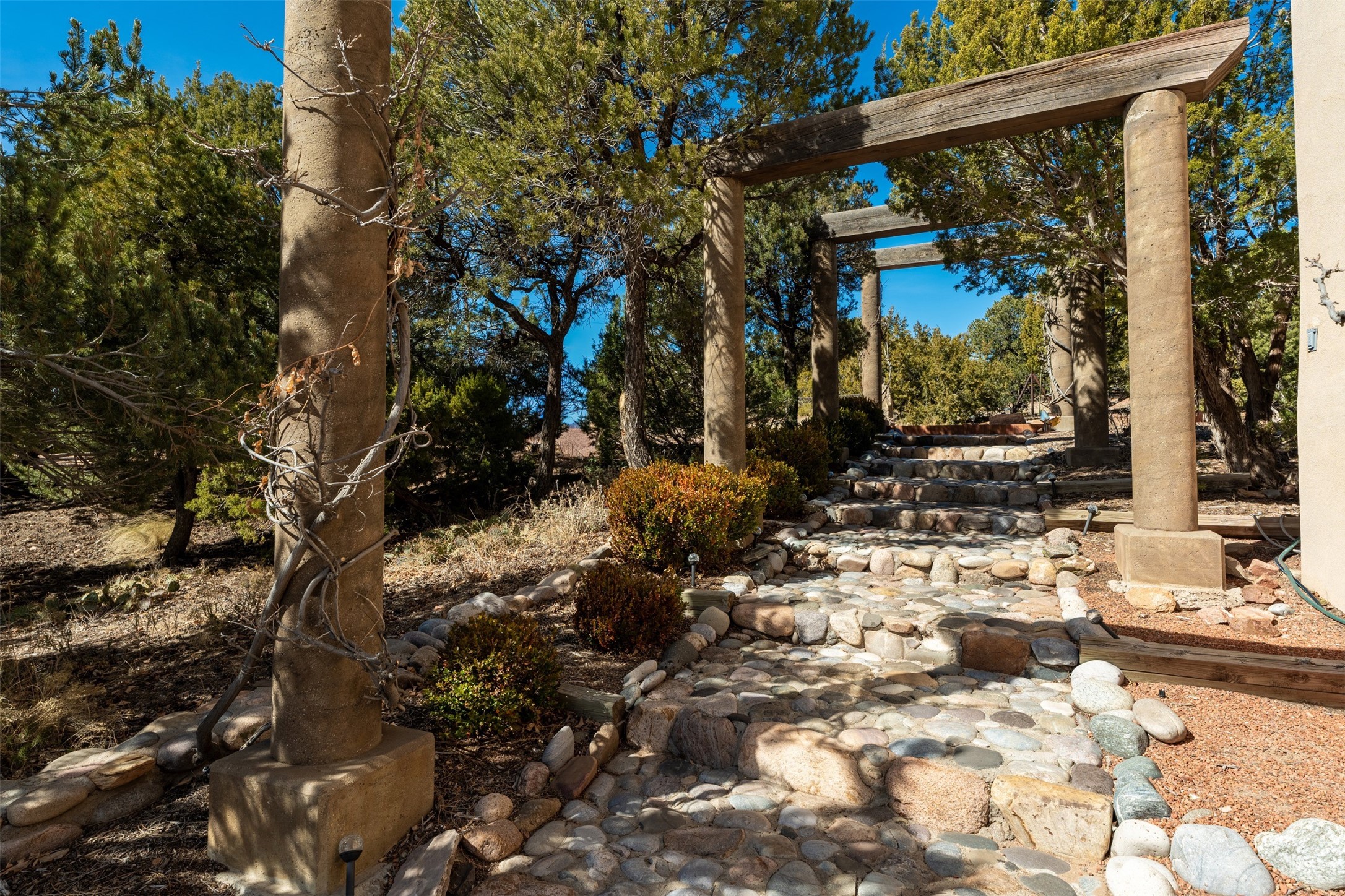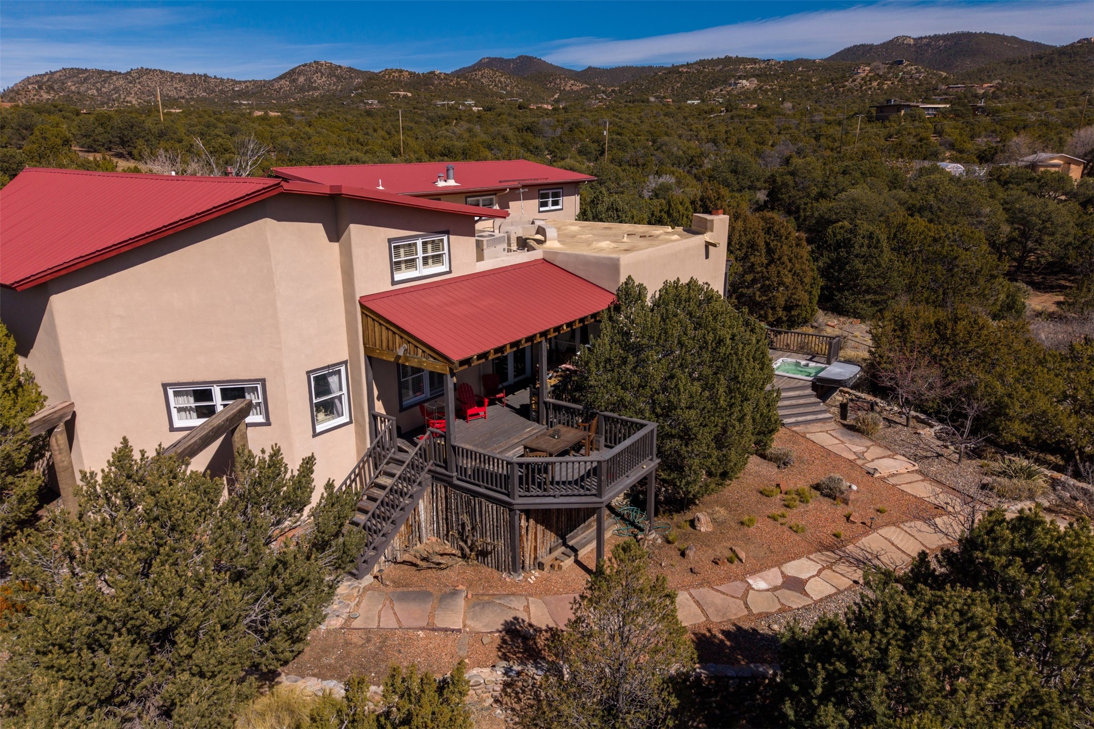 This beautiful custom home is nestled in the pinon foothills just 10 minutes from the Plaza and within close proximity to El Gancho Fitness Club surrounded by scenic open space. The home is embellished thought-out with craftsman features such as hand-painted doors and customtile treatments, and the layout offers two distinct bedroom wings, each with its own upstairs spaces, perfect for a media room, library, or gathering space or gallery. Natural light from panoramic windows fills the living room,where the kiva fireplace creates a cozy atmosphere. The property has multiple decks create lounging areas, for plenty of indoor and outdoor living. A bubbling hot tub built into one of the decks that makes for amazing stargazing! The primary bedroom has a 17-foot ceiling and resort-like touches and lighting. The home is located in the county so no millionaire tax. Ample storage fills the home throughout, and aprivate well serves all water and irrigation needs. Central air and Nest thermostats ensure comfort for the live/work needs. This property is a bird and wildlife paradise.