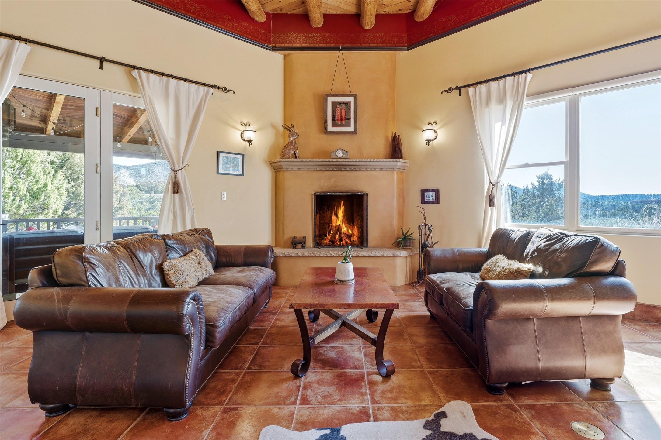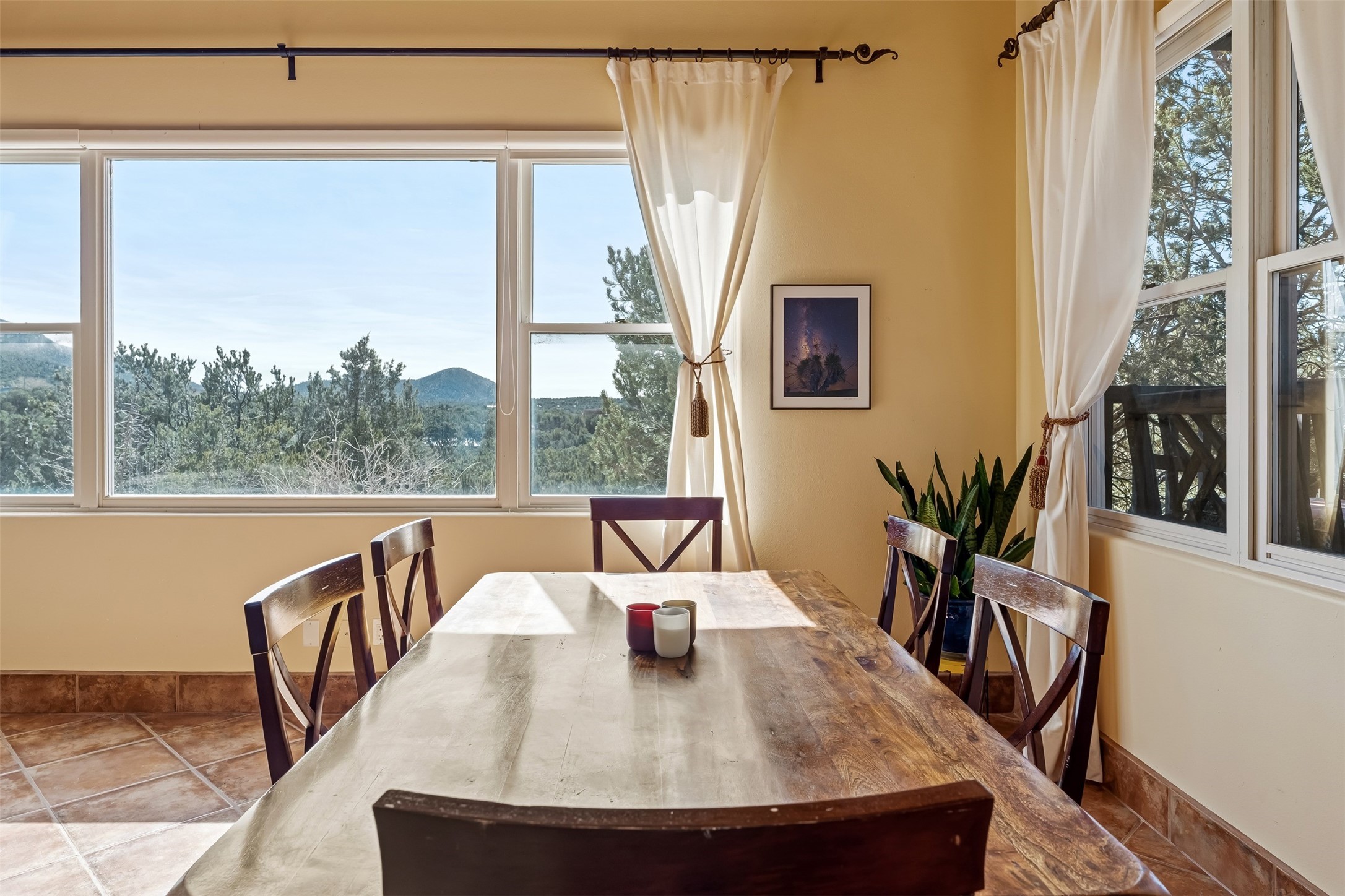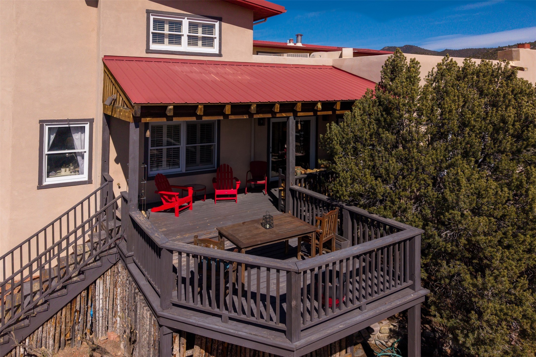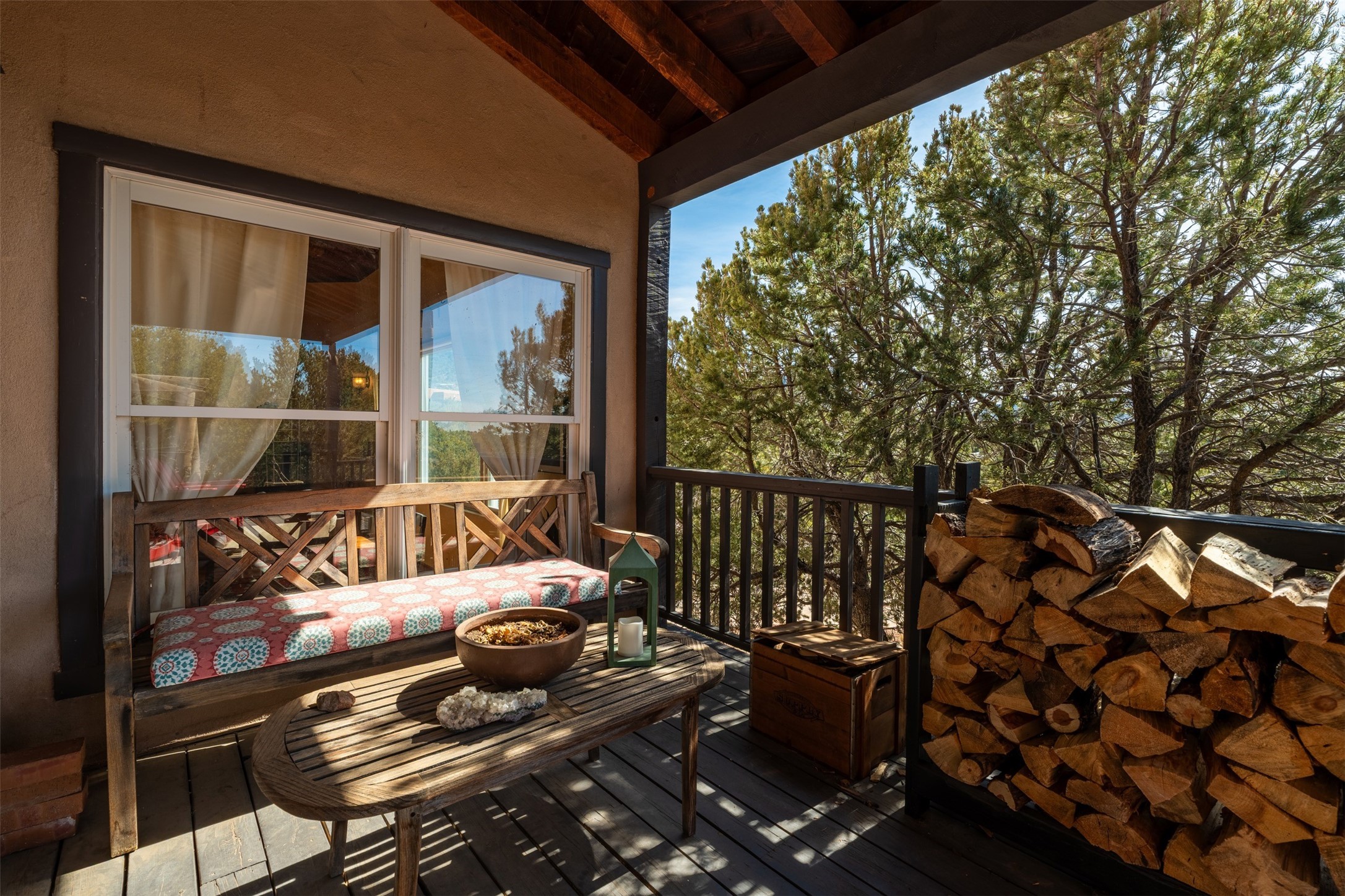 This beautiful custom home is nestled in the pinon foothills just 10 minutes from the Plaza and within close proximity to El Gancho Fitness Club surrounded by scenic open space. The home is embellished thought-out with craftsman features such as hand-painted doors and customtile treatments, and the layout offers two distinct bedroom wings, each with its own upstairs spaces, perfect for a media room, library, or gathering space or gallery. Natural light from panoramic windows fills the living room,where the kiva fireplace creates a cozy atmosphere. The property has multiple decks create lounging areas, for plenty of indoor and outdoor living. A bubbling hot tub built into one of the decks that makes for amazing stargazing! The primary bedroom has a 17-foot ceiling and resort-like touches and lighting. The home is located in the county so no millionaire tax. Ample storage fills the home throughout, and aprivate well serves all water and irrigation needs. Central air and Nest thermostats ensure comfort for the live/work needs. This property is a bird and wildlife paradise.
