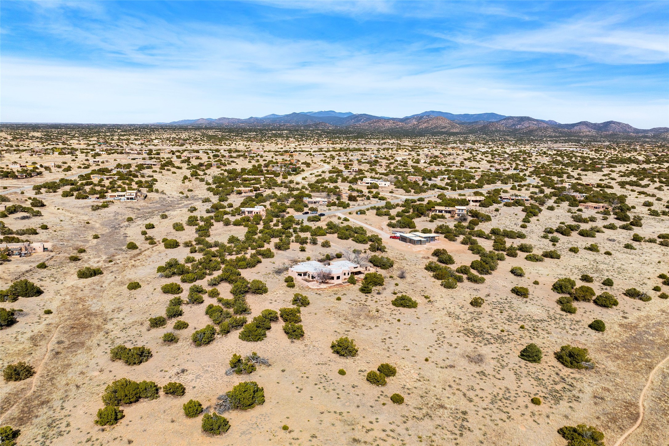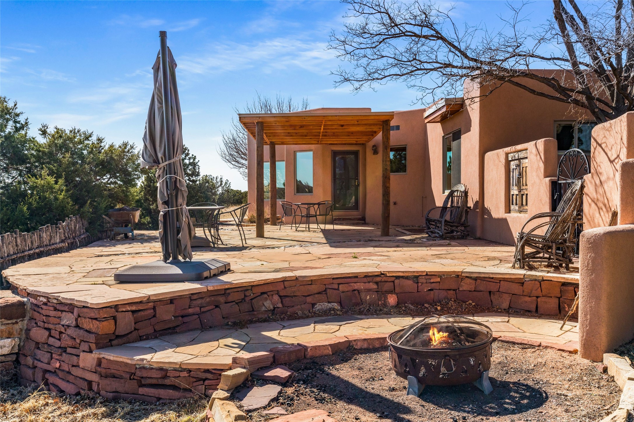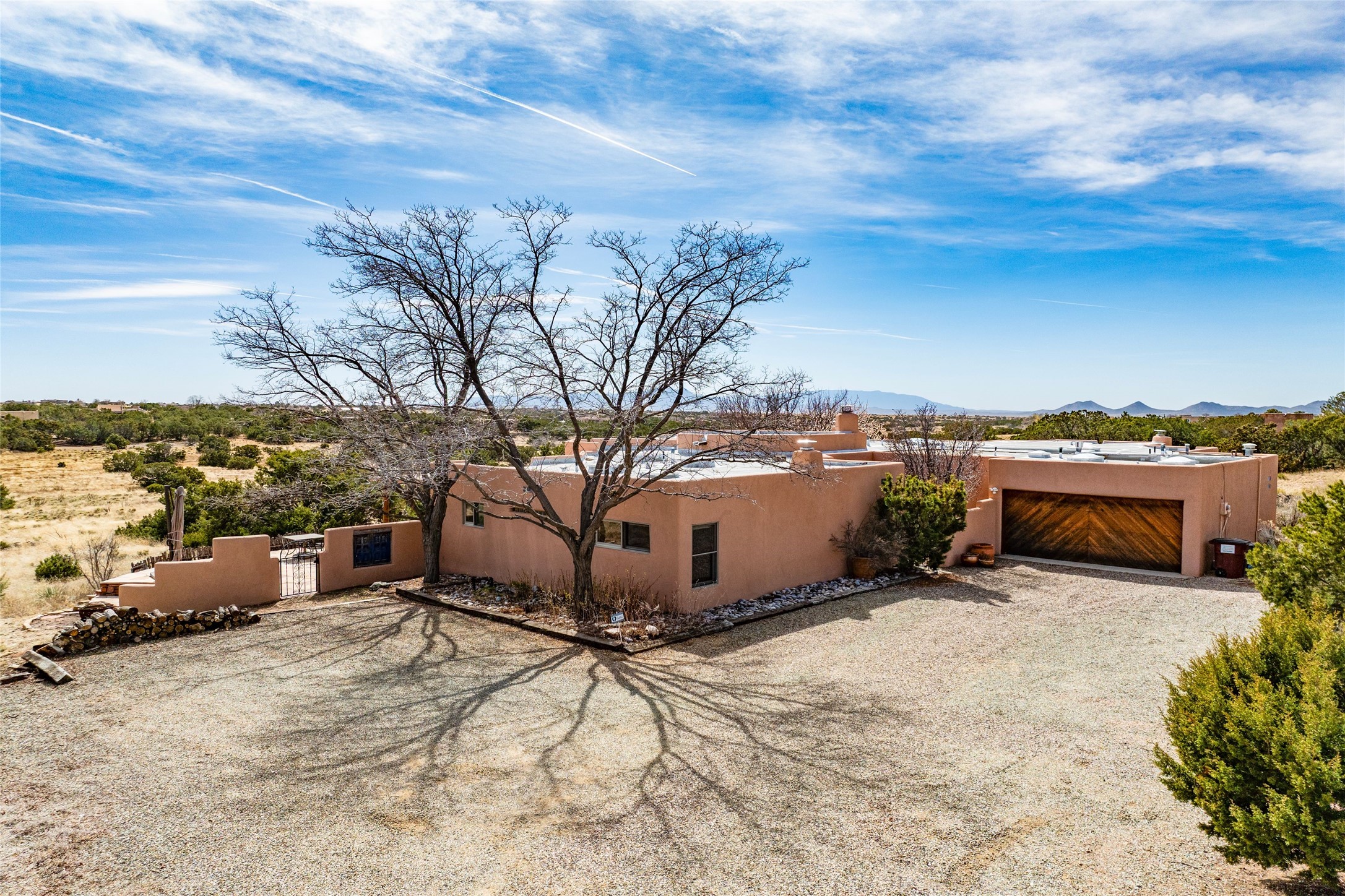 Set on nearly 4.75 acres -this inviting hacienda blends classic Santa Fe character with Saltillo and Talavera tile, vigas, nichos, kiva fireplaces, and graceful arched doorways create a warm, artful backdrop, while expansive windows frame breathtaking views, including the majestic Sandia & Jemez mountains. Sunlight pours through the windows, framing sweeping, soul-stirring views in nearly every direction. The airy great room- complete with a wet bar-is made for gatherings that drift from afternoon conversation into starlit evenings. The thoughtful floor plan offers both privacy and flexibility, with a guest area, office space, and a serene primary suite with bonus room. Step outside and life slows to its perfect rhythm. Relax on the spacious covered flagstone patio with views of the expansive greenbelt-perfect for sunset gatherings or quiet mornings-- while a garden room with hot tub adds a touch of everyday serenity. Enjoy Eldorado's trails, pool, tennis, pickleball, and community amenities, all in a peaceful setting within 30 minutes from the galleries, restaurants and charm of Santa Fe Plaza. This isn't just a home -- it's a place to live freely, gather often, and wake up inspired.