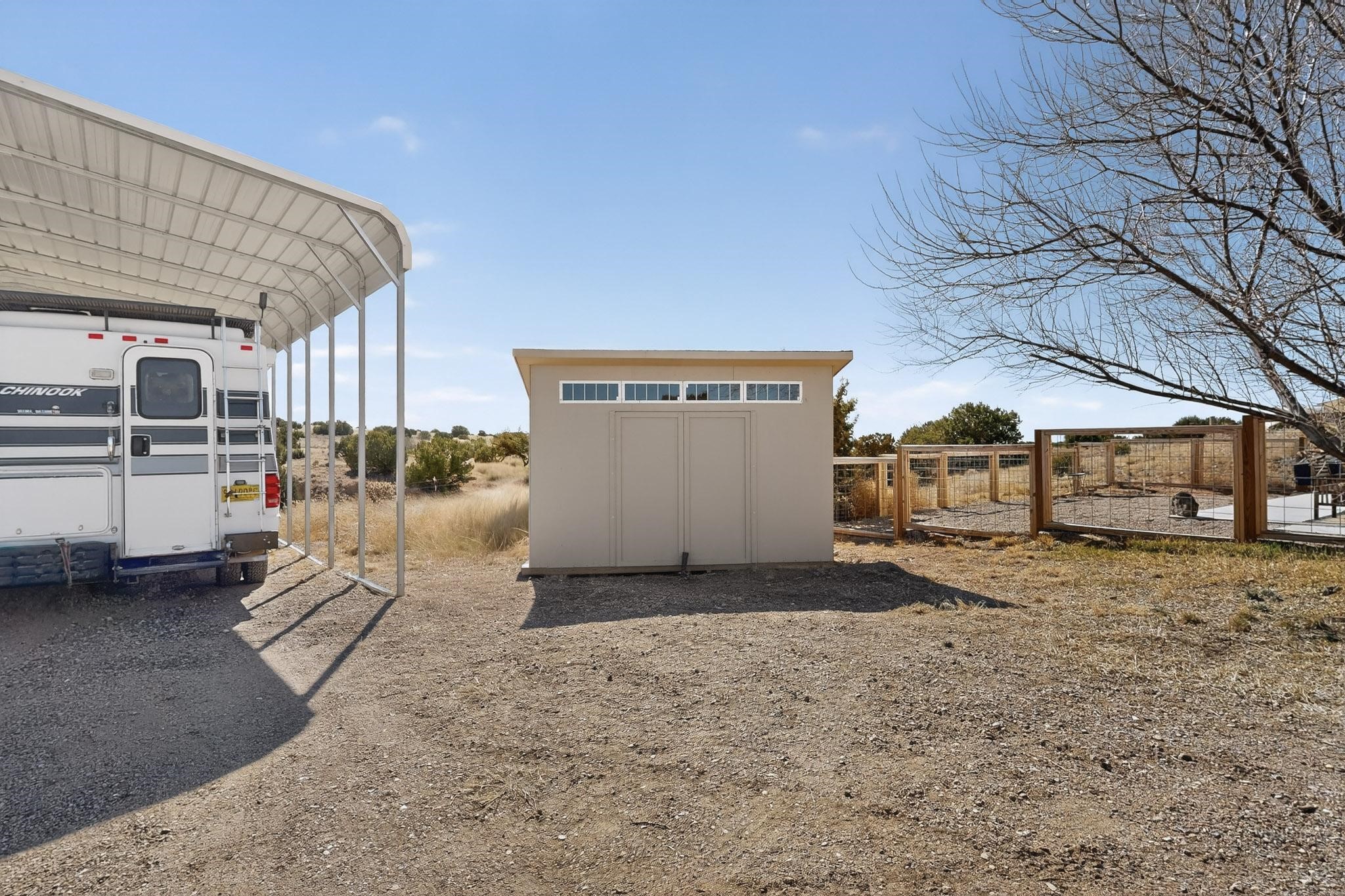 Nestled at the end of private drive, this Northern New Mexico-style home (built 2011) offers something rare: privacy, open space, and low operating costs, all just 25 minutes from downtown Santa Fe. Set on over 6 acres with mountain views, enjoy morning coffee on the patio as the sun rises or unwind with a hike on your own land as sunset settles over the Ortiz and Sandia ranges. Constructed with insulated concrete forms (ICF), thick walls provide exceptional insulation. Natural wood beams, high ceilings, and large windows connect the interior to the surrounding landscape. In-floor radiant heat and a wood-burning stove add comfort. The kitchen, remodeled in 2023, blends clean design with environmentally conscious materials, including Wilsonart® THINSCAPE performance countertops. Made from a sustainable, high-density engineered composite and GREENGUARD Gold certified, these sleek surfaces offer low maintenance and an eco-friendly footprint. Generous cabinetry and open flow into the living space create relaxed, everyday living. The main level has new flooring throughout. Downstairs there's a spacious primary bedroom and renovated bath (which could easily be modified to include a second bathroom). Upstairs, two bedrooms provide flexibility for guests, a home office, or creative space, with access to a deck overlooking the acreage. A fully owned solar system covers most electrical usage, reducing utility costs and supporting a sustainable lifestyle. A metal roof, newly installed radon mitigation system, recent pre-inspection with health and safety items addressed, and hog-wire perimeter fencing provide practical peace of mind. Horses are allowed, offering future possibilities. This is a home for someone who values independence without isolation, land to explore, space to breathe, and a thoughtfully built retreat less than a half hour from downtown Santa Fe.