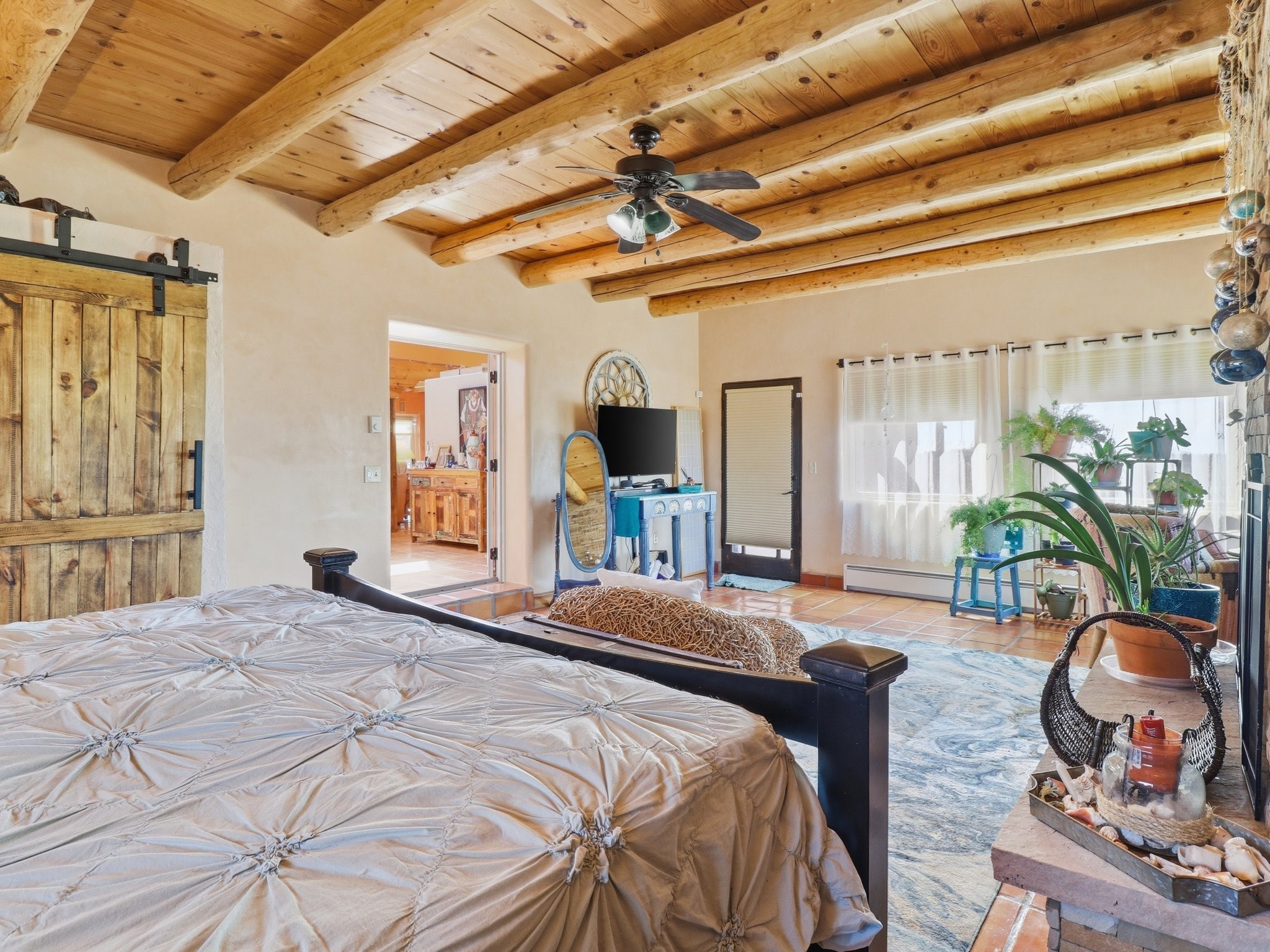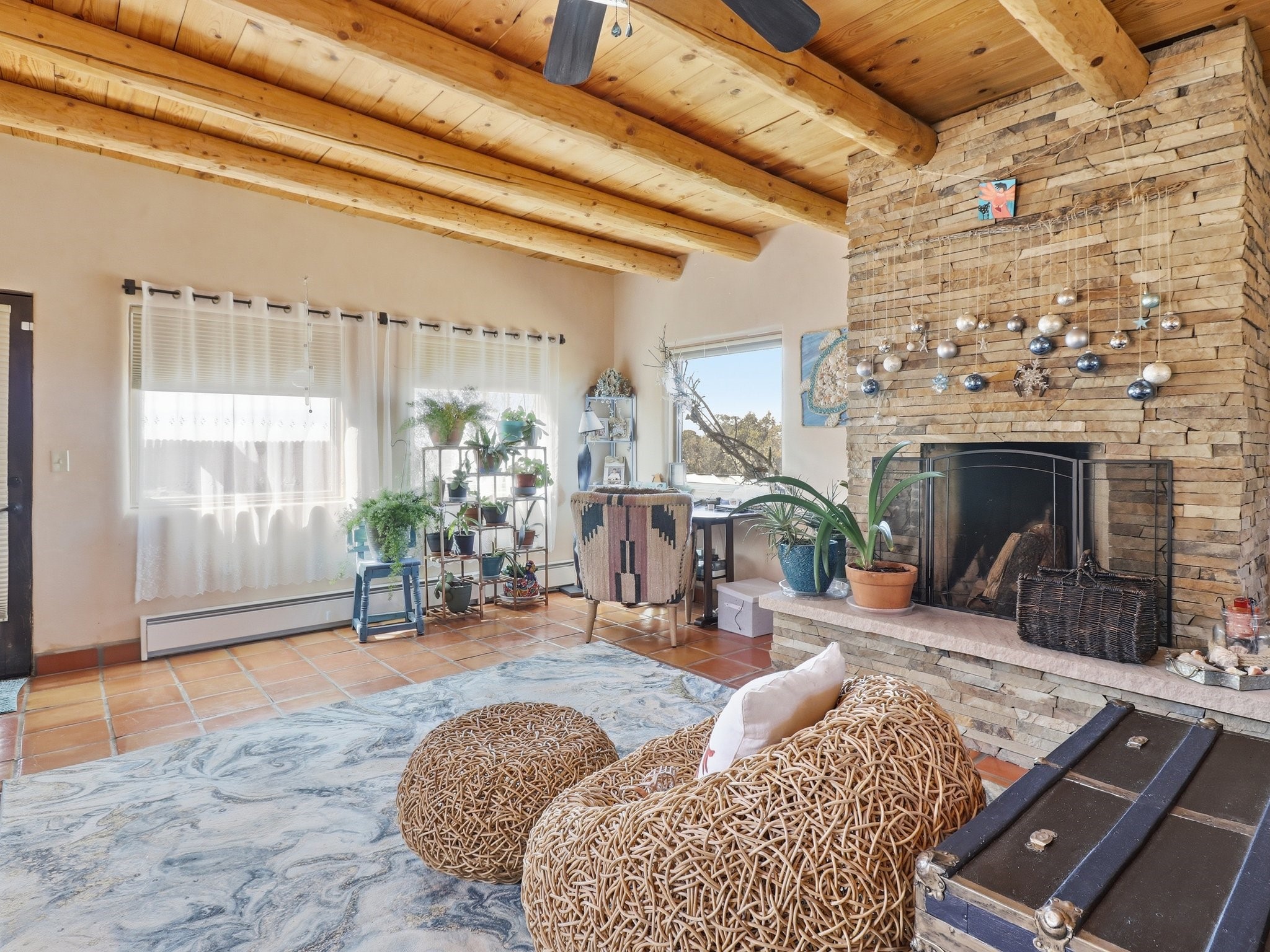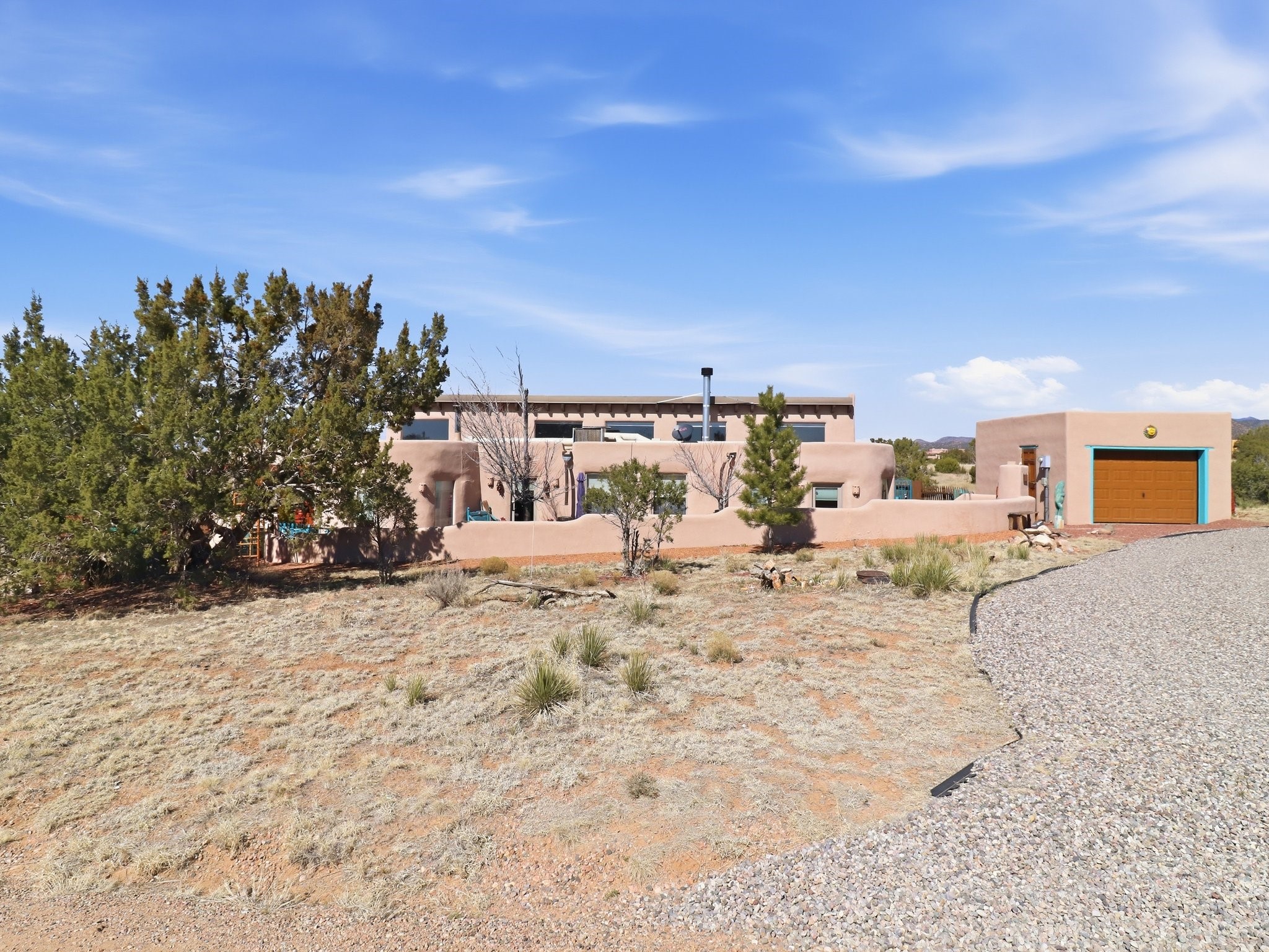 Set within the highly desirable Eldorado community just minutes from the cultural heart of Santa Fe, 16 Jornada Place presents a rare opportunity to own a classic Northern New Mexico residence on an expansive 1.30-acre cul-de-sac lot. This thoughtfully designed 3 bedroom, 2-bath, home offers approximately 2,515 square feet of living space and blends timeless Southwestern architecture with warmth, comfort, and privacy. Originally built in 1990 and lovingly maintained by its second owner, the property reflects a sense of authenticity and enduring quality that is increasingly hard to find. Upon entering the home, you are welcomed by an inviting open floor plan filled with natural light and traditional Santa Fe character. Rich Saltillo tile flows throughout the residence, complemented by striking vigas and wood beam ceilings that create a warm, architectural presence in the main living spaces. Large windows frame the surrounding landscape while filling the home with sunlight, enhancing the connection between the interior living areas and the beauty of the high desert beyond. 1 wood-burning stove, 1 fire place, and a classic kiva fireplace provide cozy gathering spaces and add to the authentic Southwestern ambiance. The layout offers both comfort and functionality, with a private primary suite positioned to capture peaceful views and direct patio access, perfect for morning coffee or quiet evenings under Santa Fe's renowned sunsets. Two additional bedrooms sit on the opposite side of the home, offering flexibility for guests, while a possible 4th bedroom, office space or studio compliments the floor plan. The single-level design enhances ease of living, while the detached garage and additional parking provide convenience and storage for vehicles, hobbies, or outdoor gear. Situated on over an acre of land, the property provides ample space to enjoy the serenity of Eldorado's wide-open landscapes while still being just a short drive from the restaurants, galleries, and culture of downtown Santa Fe. Residents of Eldorado enjoy access to community amenities including tennis courts, extensive walking and hiking trails, equestrian facilities, a clubhouse, and a popular community center that fosters a vibrant neighborhood lifestyle. Offered at $800,000, this distinctive property combines classic Santa Fe architecture, generous acreage, and the sought-after lifestyle of Eldorado, making it an exceptional opportunity for those seeking space, character, and proximity to one of the Southwest's most celebrated cities.