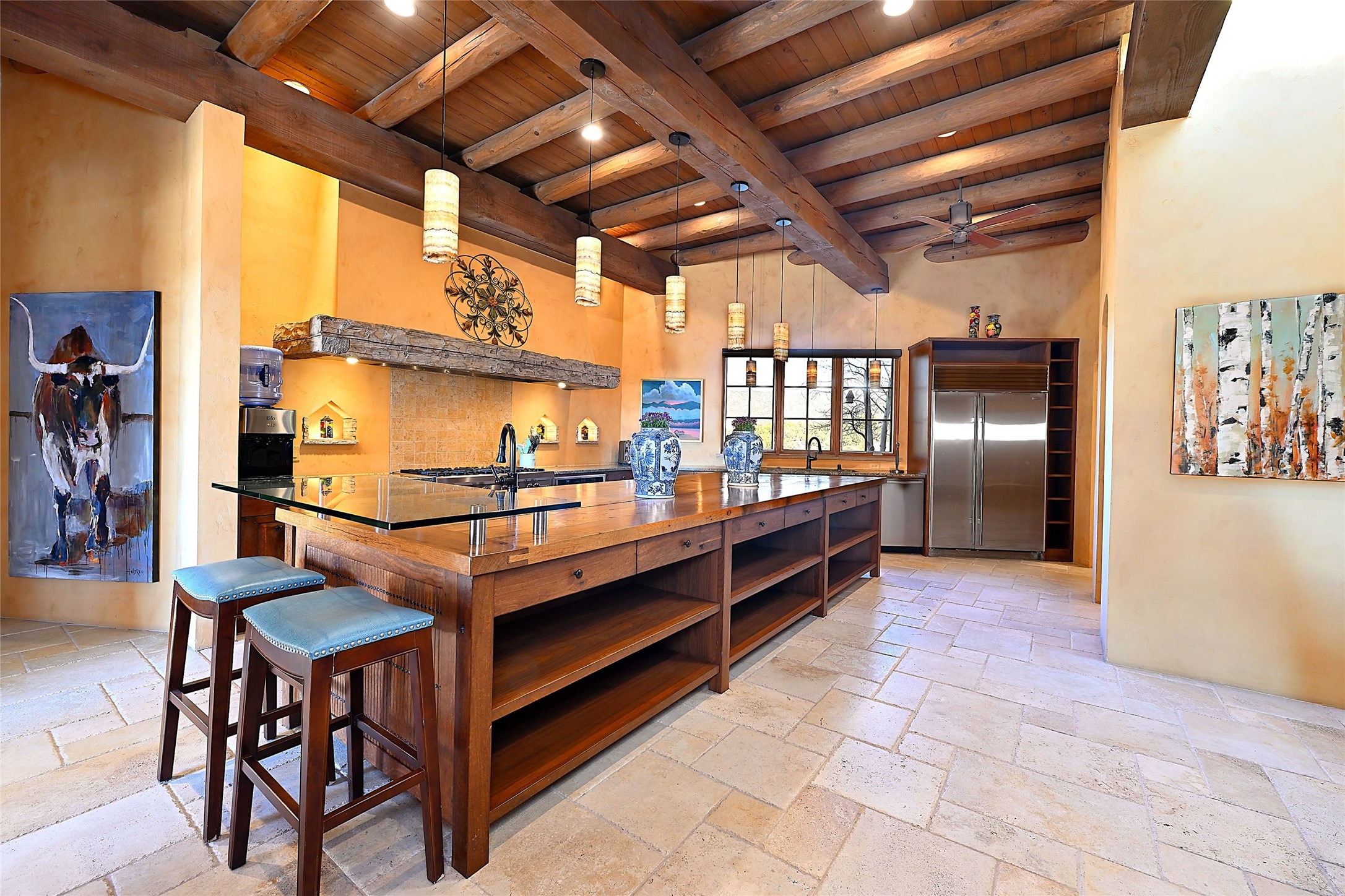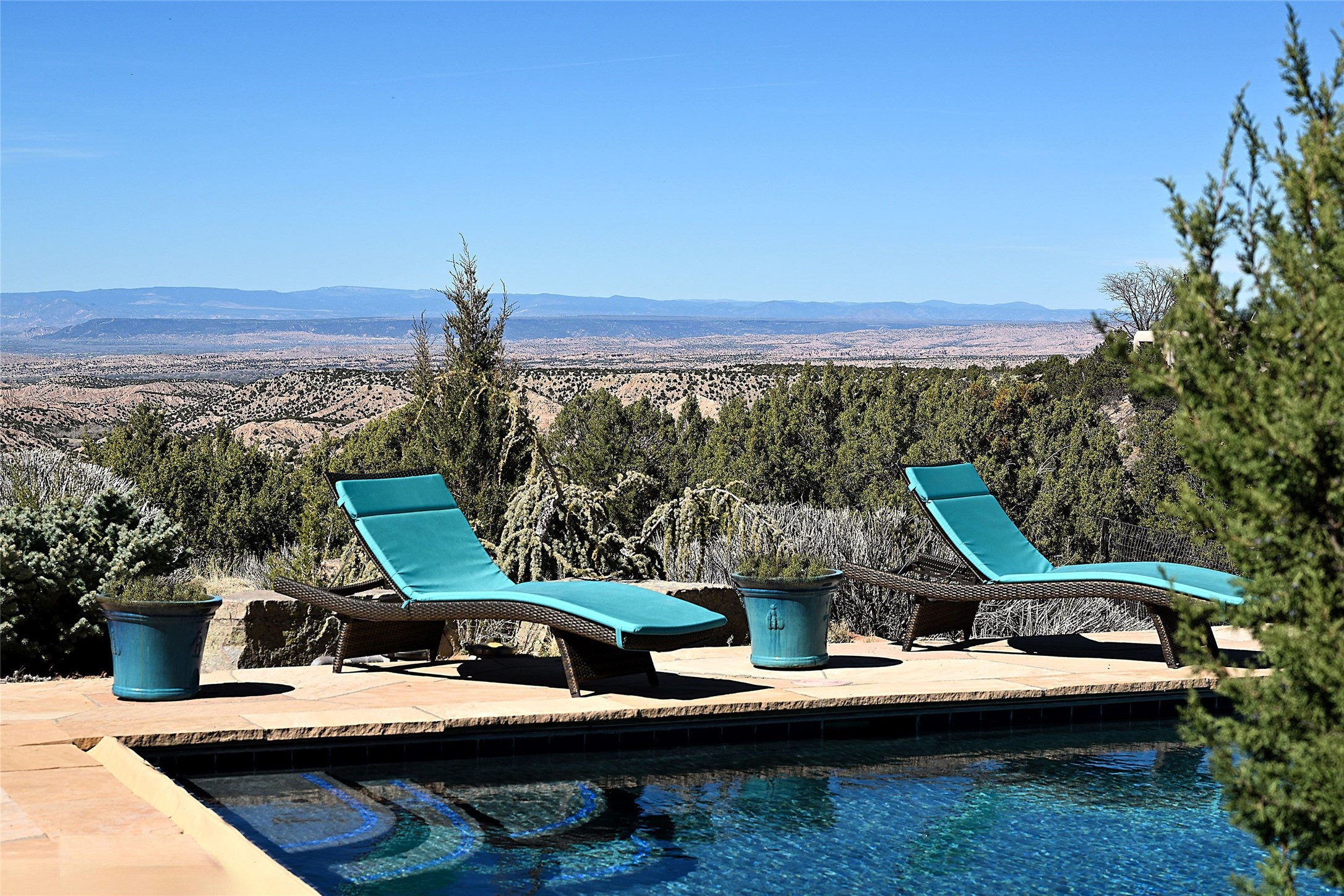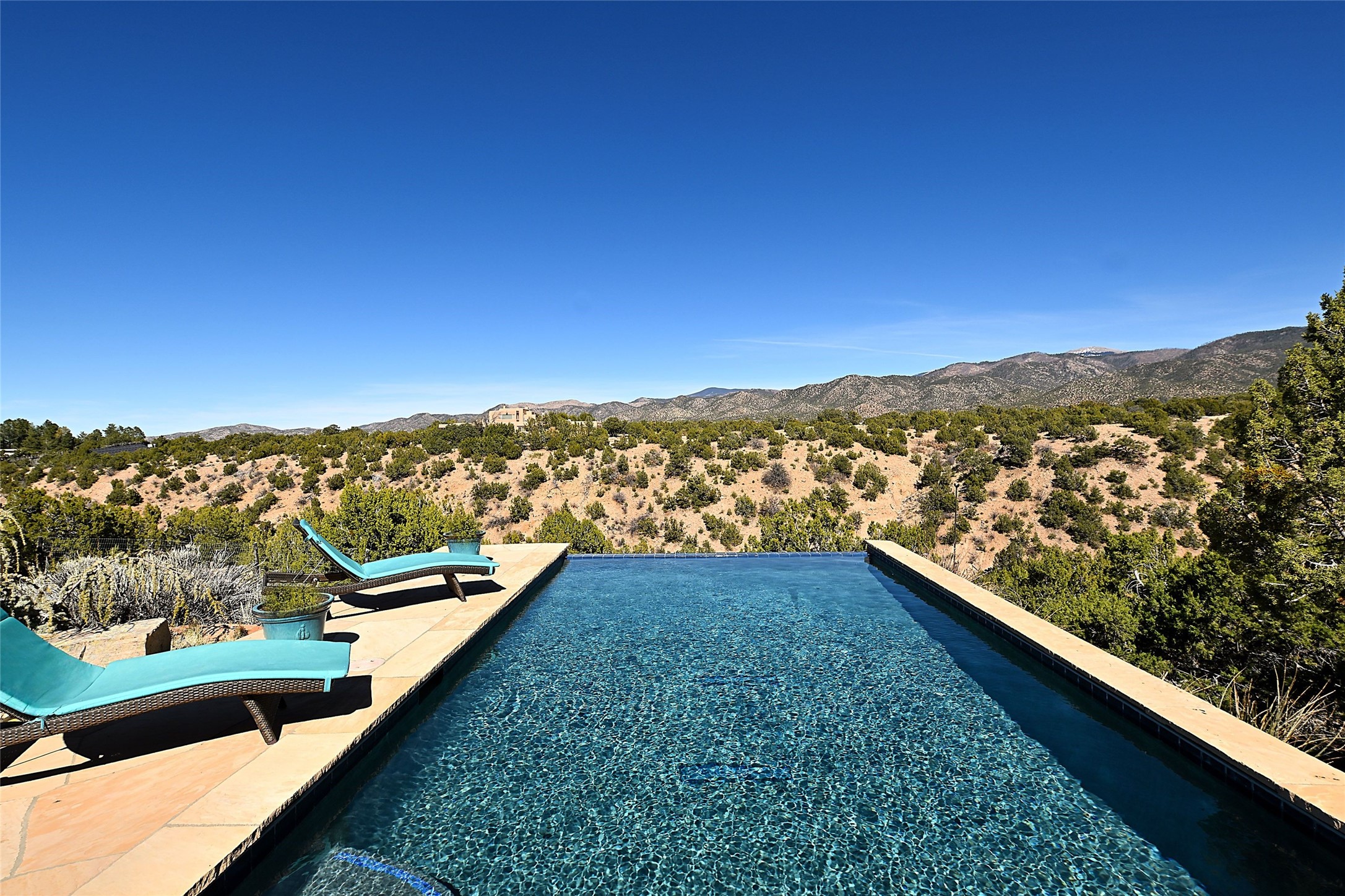 A rare Vista Redonda gem is finally on the market! This extraordinary property offers a rare opportunity to experience the very best of Santa Fe living, where dramatic landscapes, artistic heritage, and profound tranquilityconverge. An elegant retreat, this exceptional Spanish-Pueblo Revival style 4-Bedroom 6-bathroom home boasts unparalleled panoramic views of the JemezandSangre de Christo mountains and offers an exceptional blend of timeless Southwestern architecture and breathtaking natural beauty visible from every window in the home. Across the 5-acre property, become enchanted by the beautiful and thoughtfully manicured landscaping. Feel the serenity of beautifully landscaped grounds as you walk along paths discovering hidden seating areas and privacy amongst the roses and lavender. An infinity edge pool beckons as long lazy Santa Fe summer days explode at dusk into an artist's palette of oranges, purples, and yellows as the sun slowly sets behind the rugged mountain landscape. At the heart of the home is a grand gourmet kitchen, designed for both everyday living and elegant entertaining. A chef's dream, the kitchen features dual Wolf ovens, an 8-burner gas cooktop, two dishwashers, and a Subzero refrigerator. Theadjacent butler's pantry, complete with an additional refrigerator, wine refrigerator, and generous storage, provides exceptional convenience when hosting gatherings. Enjoy indoor/outdoor living at its pinnacle. Beautiful sets of French Doors in every room lead to the property's numerous covered portales and patios. Those on the west side of the property showcase a stunning sunken fountain with surrounding bancos, a perfect spot to relax with friends, soak up the fresh Santa Fe air, or gaze at the night sky free from the lights of the city. This grand home offers a curated slice of elegant Santa Fe living, with exceptional access to Tesuque Village and easy access to downtown Santa Fe..This one of a kind property captures the essence of Santa Fe and truly has everything for the discerning homebuyer.