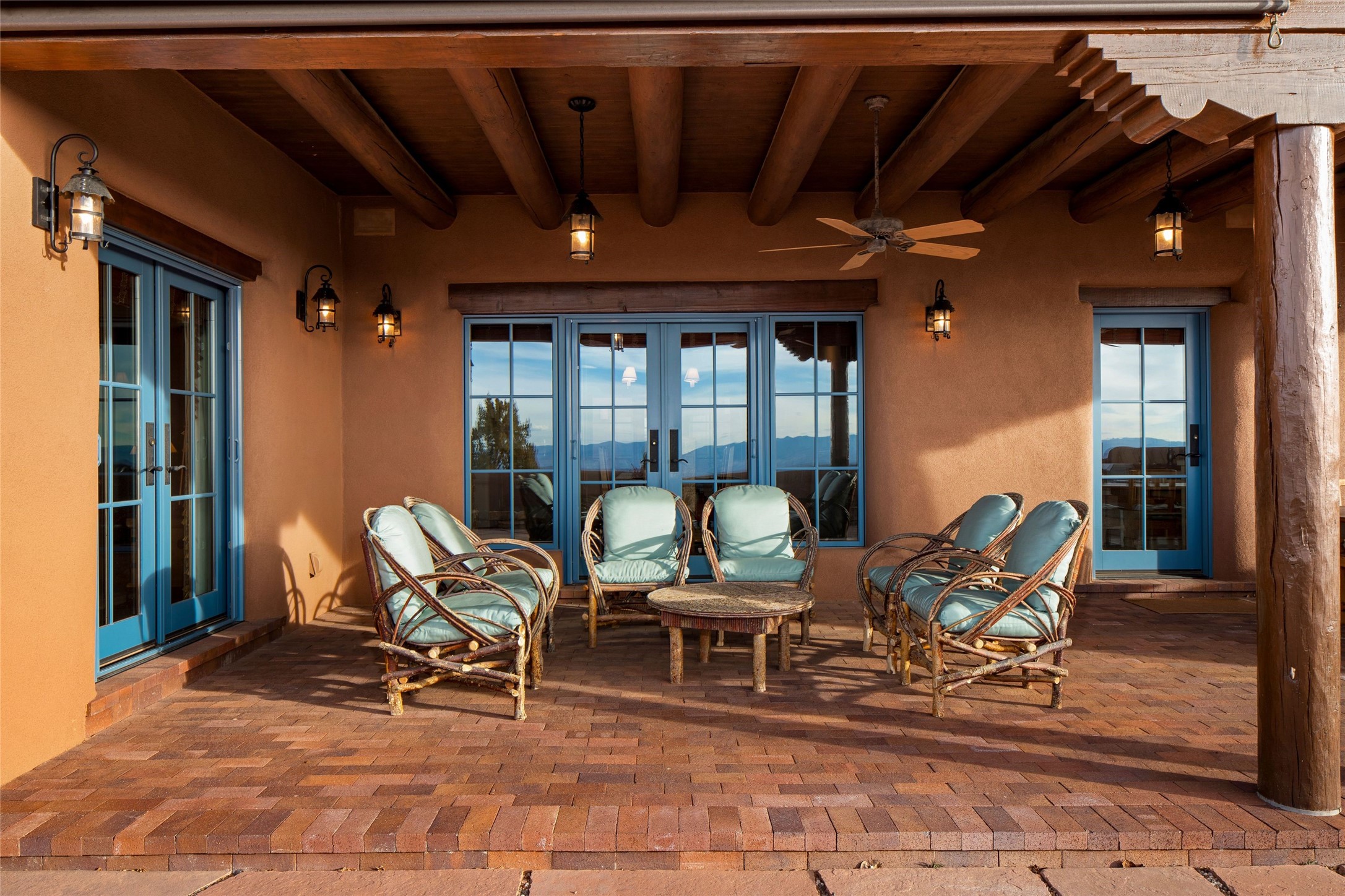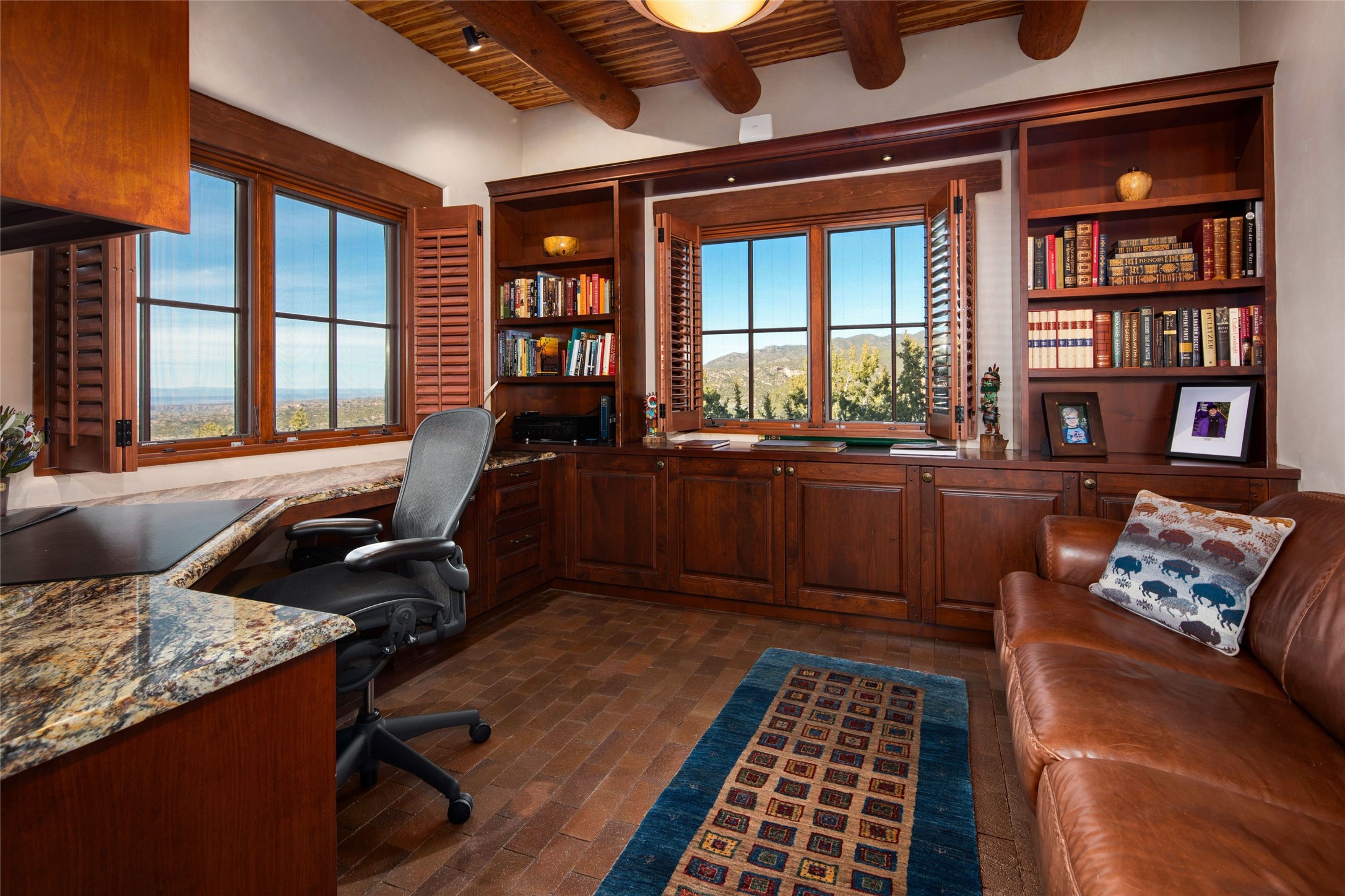 Tesuque 3-bedroom, 6-bath exceptional residence in Bishop's Lodge Hills celebrates the collaboration between acclaimed architect Ed Boniface and master builder Will Prull. Sited on 2.26 acres to capture dramatic views of the surrounding mountains. Single level; no interior stairs. Iconic traditional design features include vigas and beams, nichos, 4 kiva fireplaces, brick and tile floors and multiple patios and portales. Upon entering the foyer, guests are enveloped in a space inspired by the sacred geometry of a Navajo Hogan, setting the tone for the rich architectural heritage woven throughout the home. The grand living room with its soaring beamed ceilings, hand-carved corbels and a striking fireplace design serves as a warm and welcoming focal point. An elegant formal dining room opens to the grand portal which offers extended space for al fresco dining and entertaining. Gourmet kitchen is appointed with antiqued custom cabinetry, custom carved backsplashes, Viking appliances, and a black walnut-topped center island with prep sink. This home is smartly divided into 2 spacious wings. In the primary wing, owners will appreciate the luxurious primary suite with kiva fireplace, two spa-like baths and two walk-in closets. In addition, there is a handsome office with a built-in desk and bookcases. In the opposite wing, 2 guest bedrooms provide privacy for visitors. Recent improvements include new stucco (2025) and new roof (2024). Conveniently located with easy access to the Santa Fe Ski Basin, Ten Thousand Waves Spa, the Santa Fe Opera and the downtown Plaza.