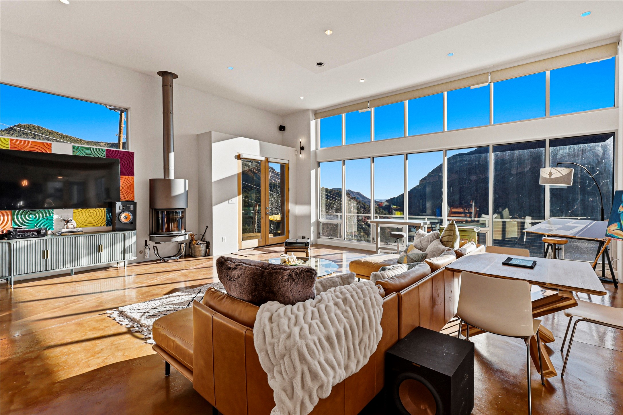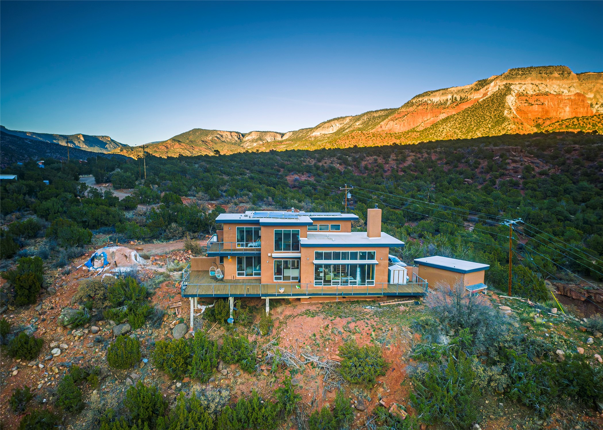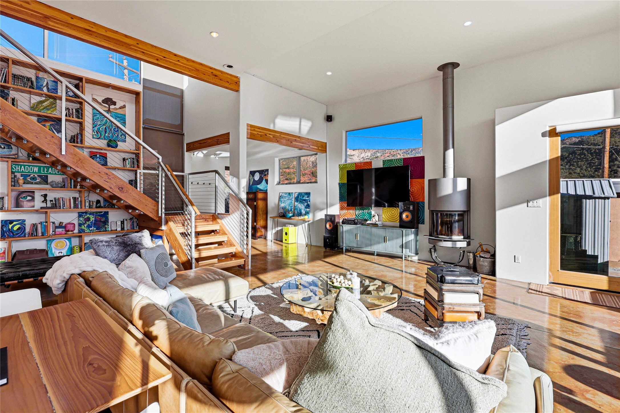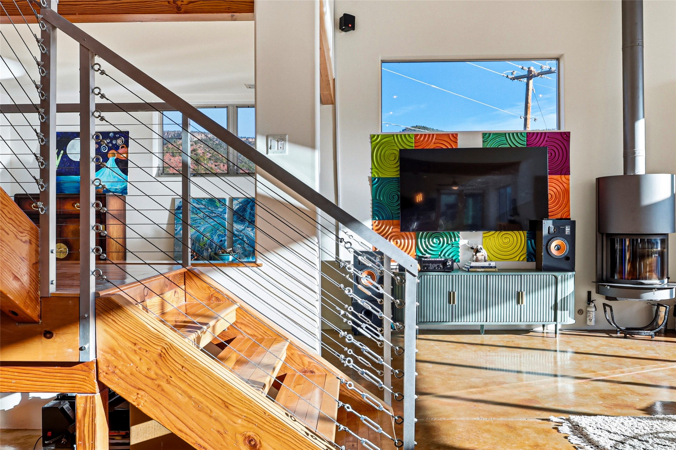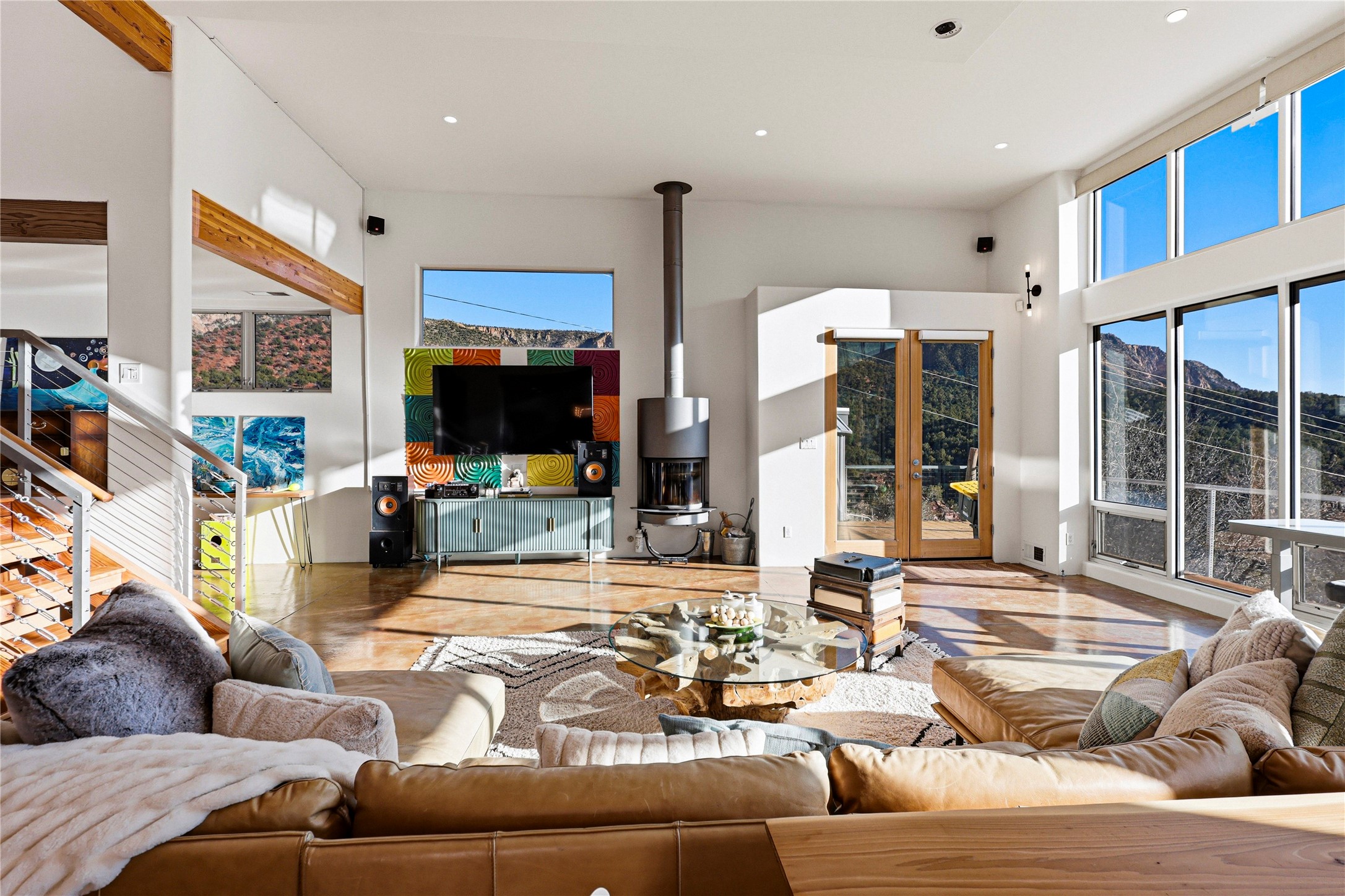 A one-of-one architectural triumph by Judy Cunningham. This 3BR/3BA mountain sanctuary is a masterful fusion of massive timber beams, polished concrete, and pristine wood flooring. Experience walking on air on expansive wraparound decks, capturing dark sky vistas and breathtaking sunsets. The main-level owner's suite offers an otherworldly awakening to floor-to-ceiling views and a soaking tub positioned for the golden hour. A sculptural floating staircase with custom cable railings leads to a private guest wing. Sustainable, high-thermal-efficiency design with paid off solar and elite Starlink Max. A serene, world-class commute to LANL through the Valles Caldera. Santa Fe and the ABQ Sunport are under an hour away. Incomparable brilliance in the heart of the Jemez.