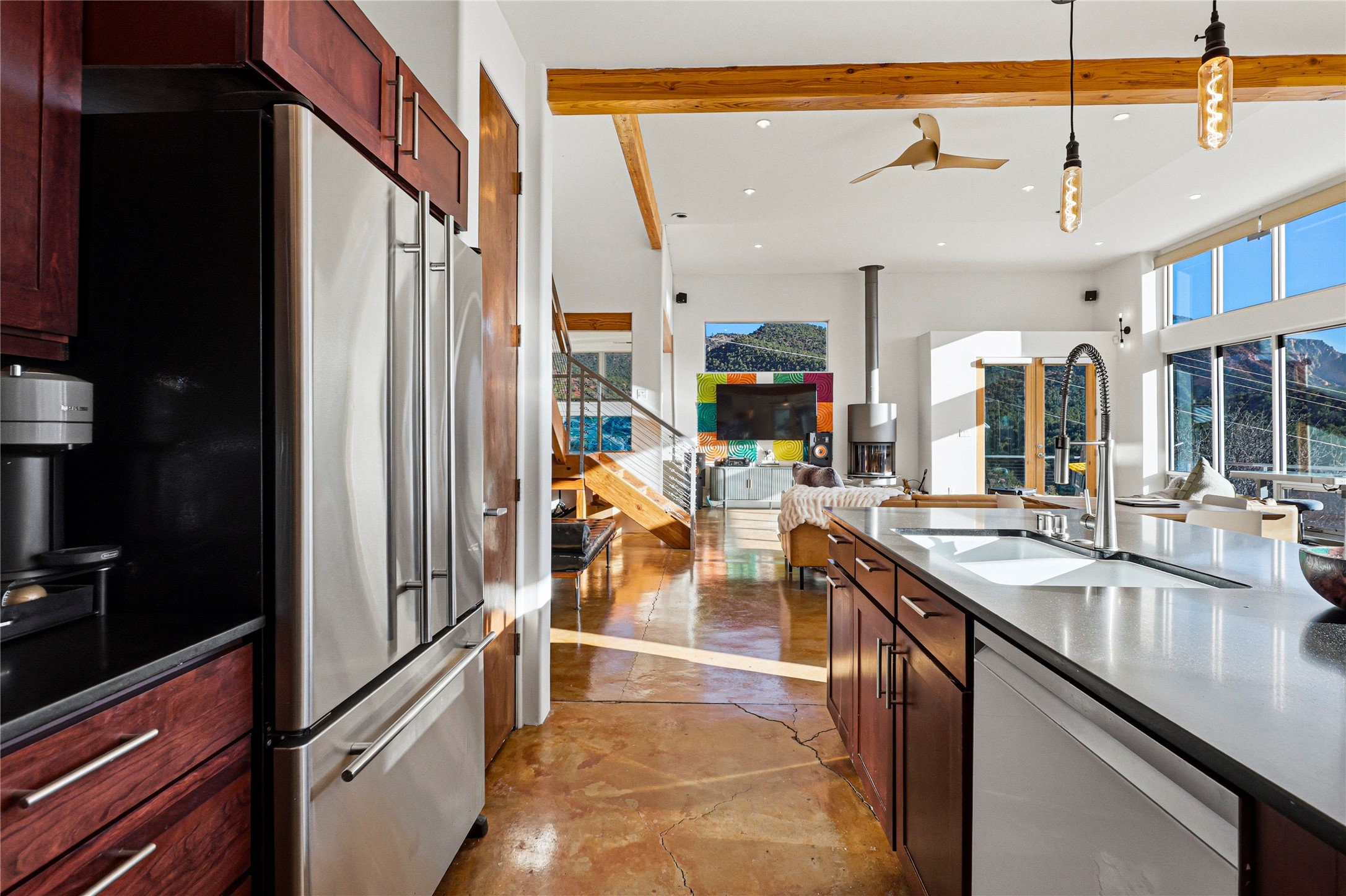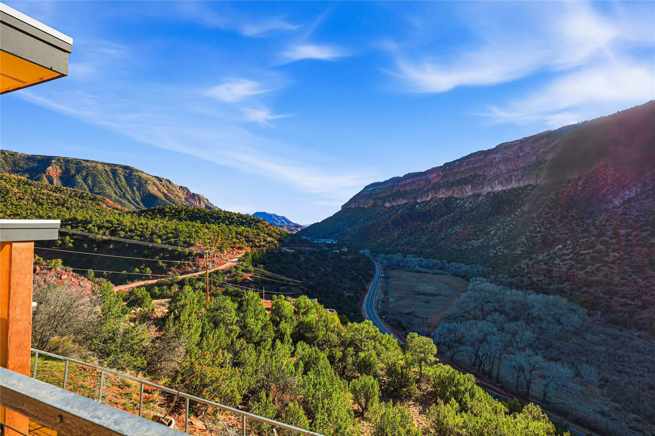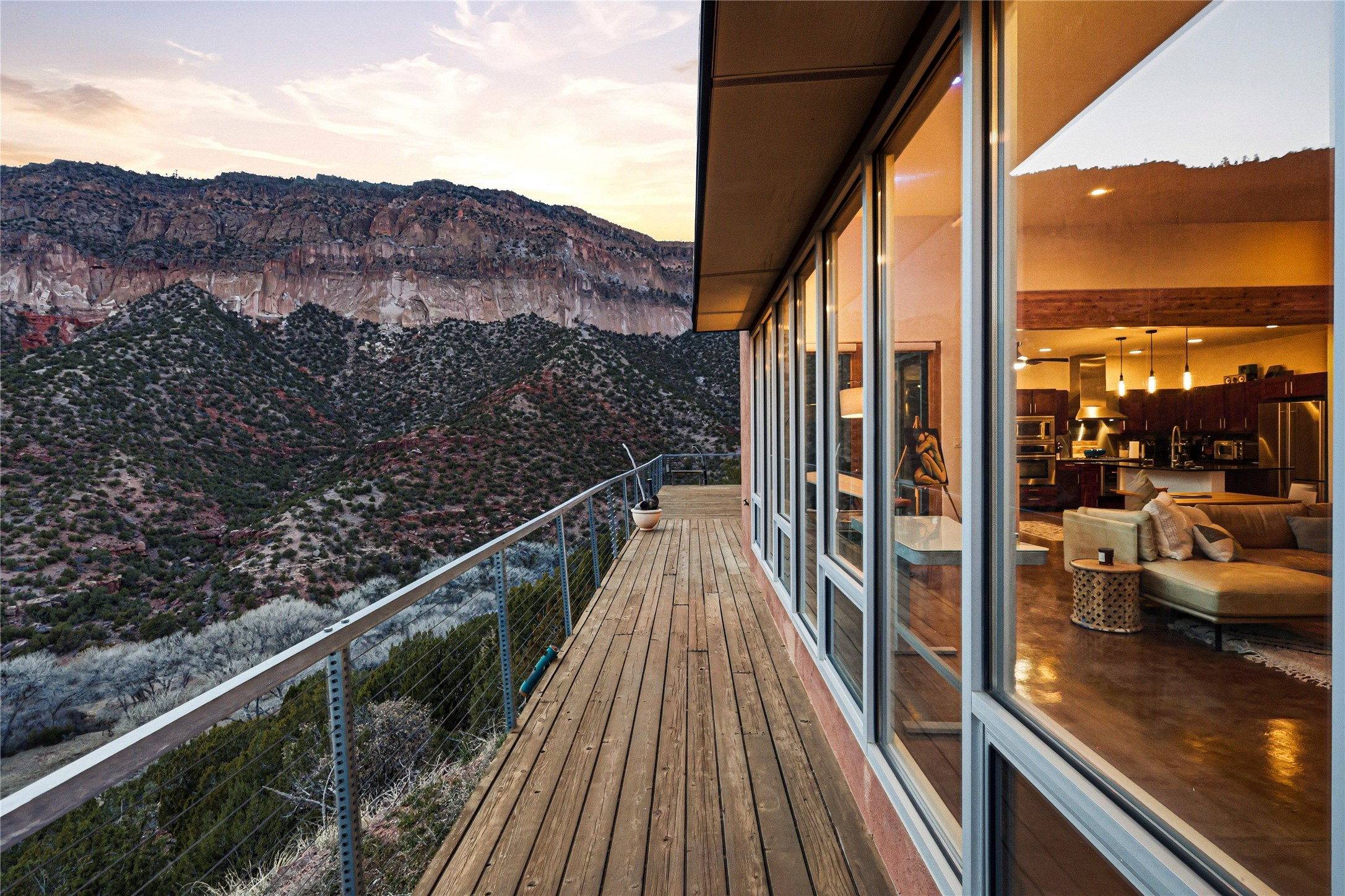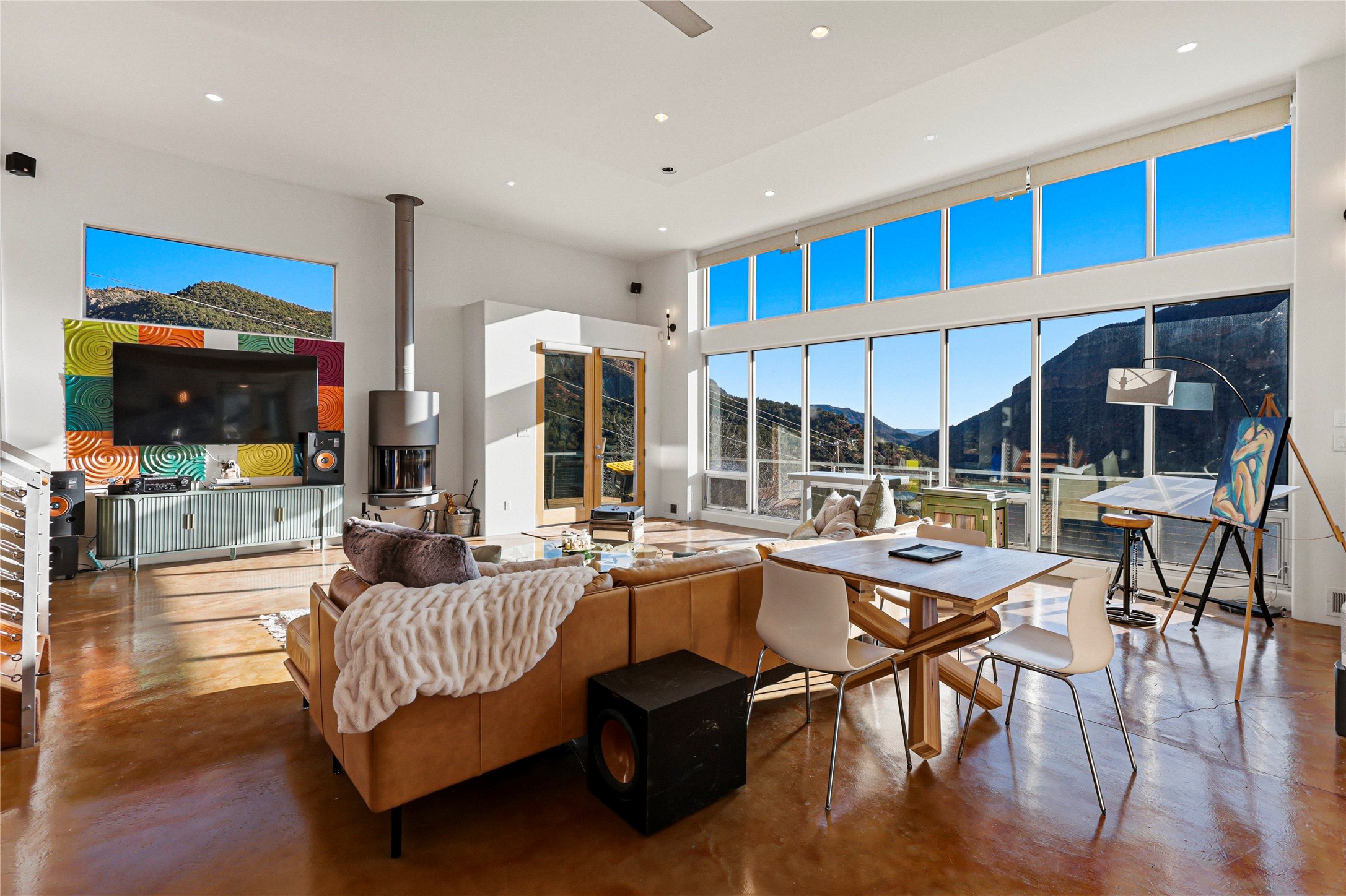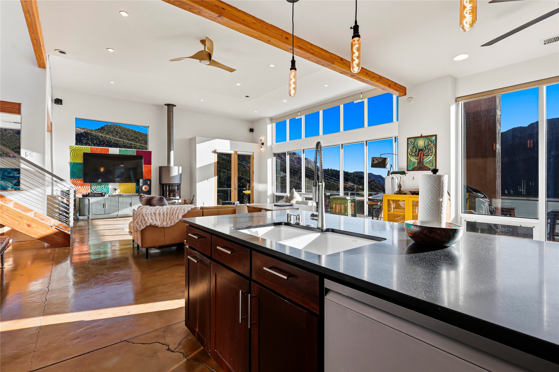A one-of-one architectural triumph by Judy Cunningham. This 3BR/3BA mountain sanctuary is a masterful fusion of massive timber beams, polished concrete, and pristine wood flooring. Experience walking on air on expansive wraparound decks, capturing dark sky vistas and breathtaking sunsets. The main-level owner's suite offers an otherworldly awakening to floor-to-ceiling views and a soaking tub positioned for the golden hour. A sculptural floating staircase with custom cable railings leads to a private guest wing. Sustainable, high-thermal-efficiency design with paid off solar and elite Starlink Max. A serene, world-class commute to LANL through the Valles Caldera. Santa Fe and the ABQ Sunport are under an hour away. Incomparable brilliance in the heart of the Jemez.
