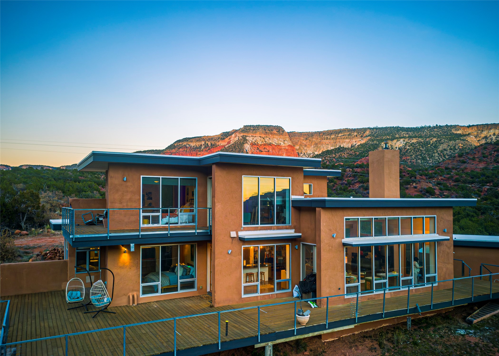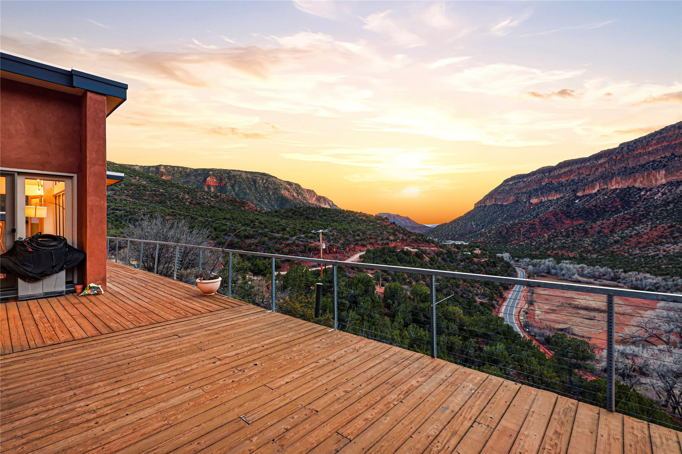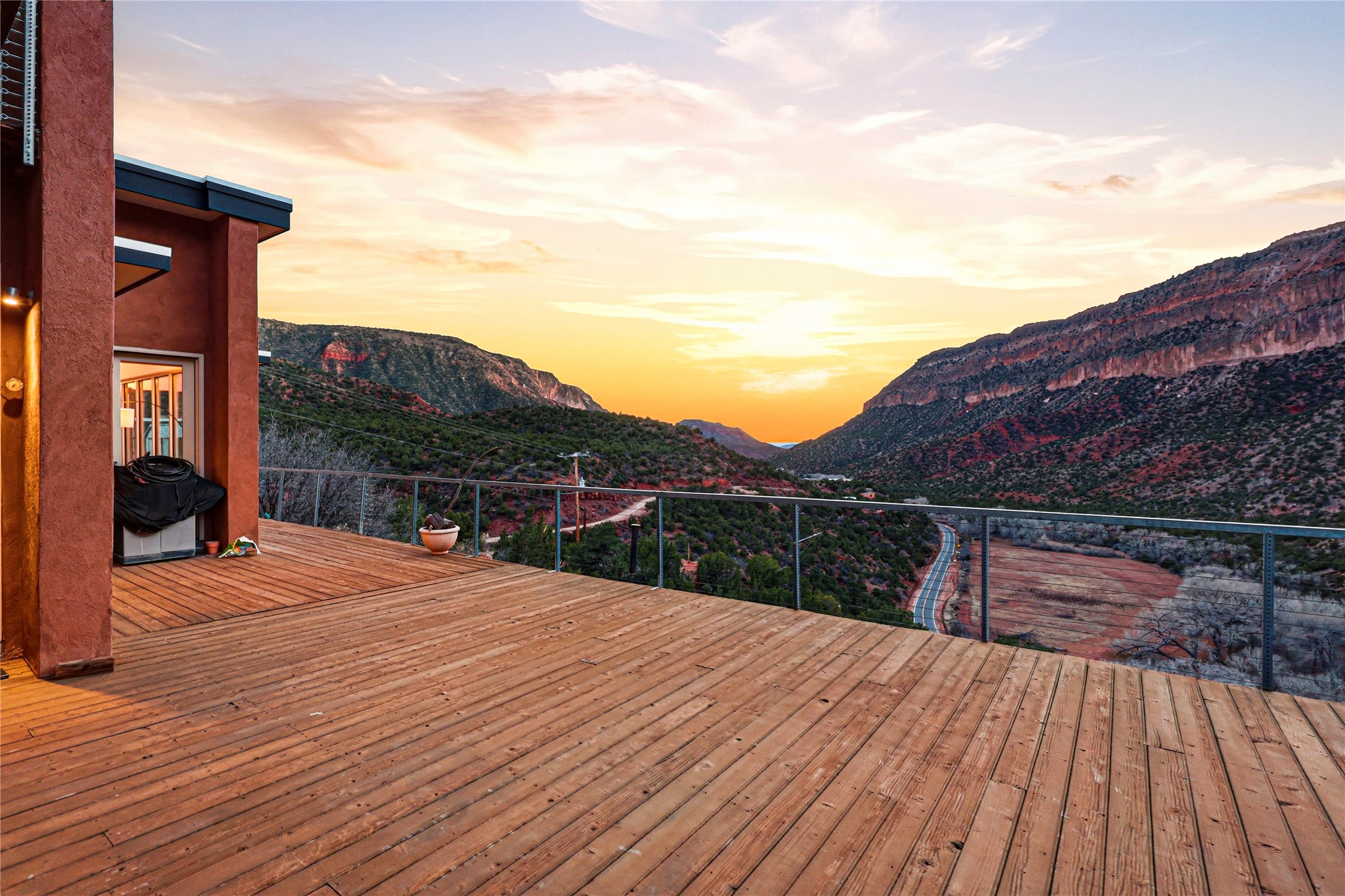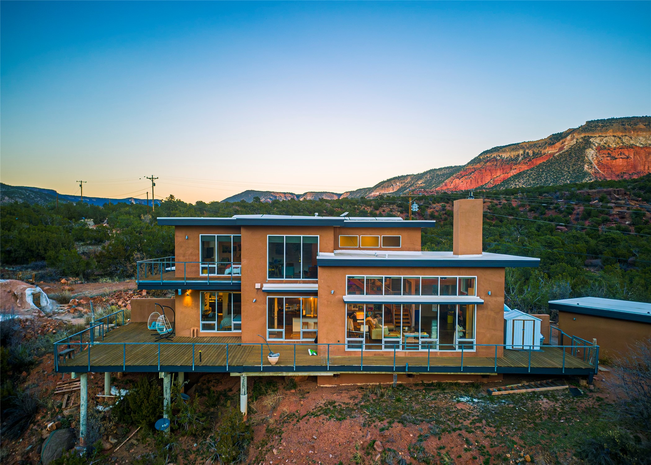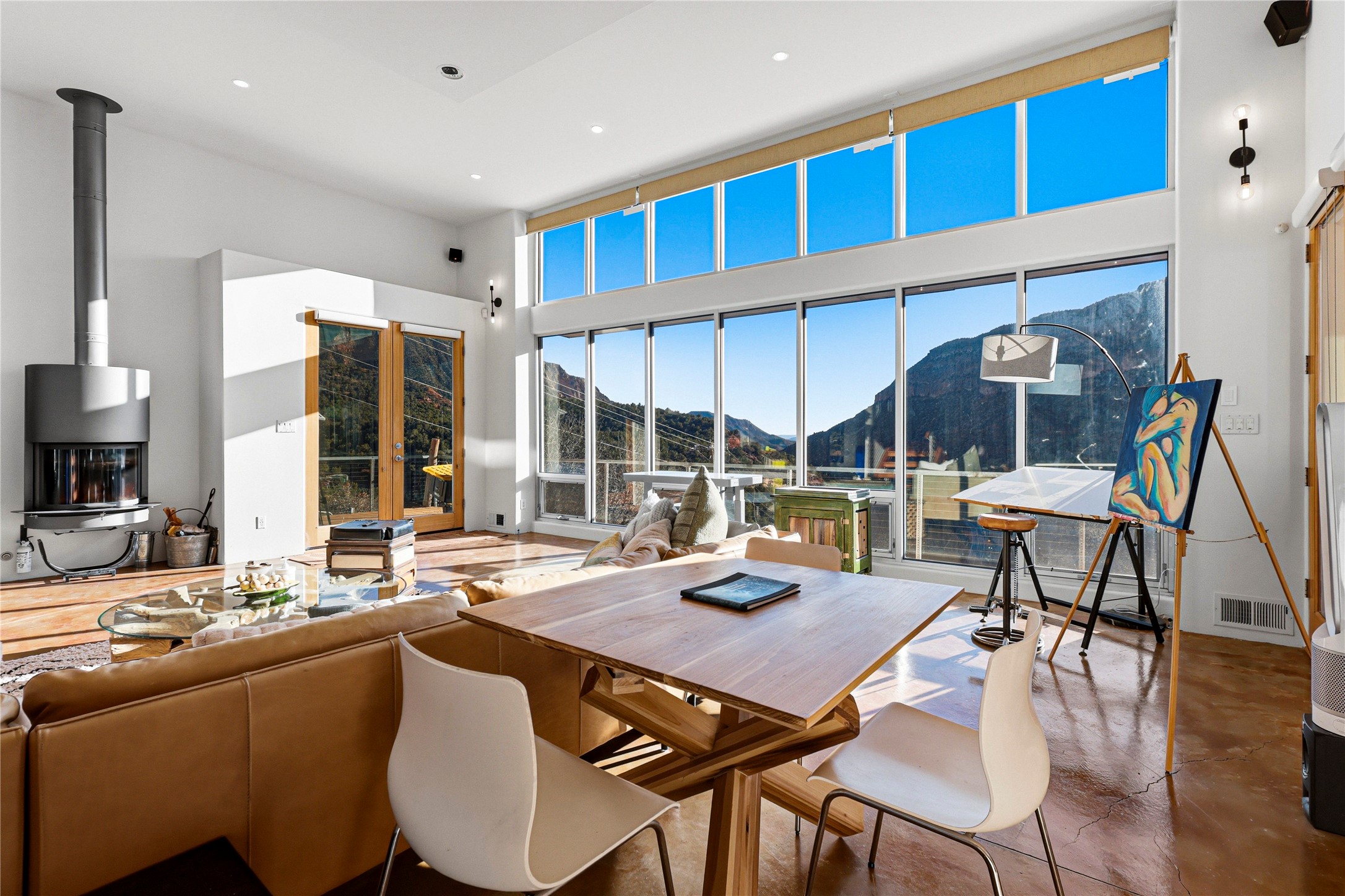 A one-of-one architectural triumph by Judy Cunningham. This 3BR/3BA mountain sanctuary is a masterful fusion of massive timber beams, polished concrete, and pristine wood flooring. Experience walking on air on expansive wraparound decks, capturing dark sky vistas and breathtaking sunsets. The main-level owner's suite offers an otherworldly awakening to floor-to-ceiling views and a soaking tub positioned for the golden hour. A sculptural floating staircase with custom cable railings leads to a private guest wing. Sustainable, high-thermal-efficiency design with paid off solar and elite Starlink Max. A serene, world-class commute to LANL through the Valles Caldera. Santa Fe and the ABQ Sunport are under an hour away. Incomparable brilliance in the heart of the Jemez.