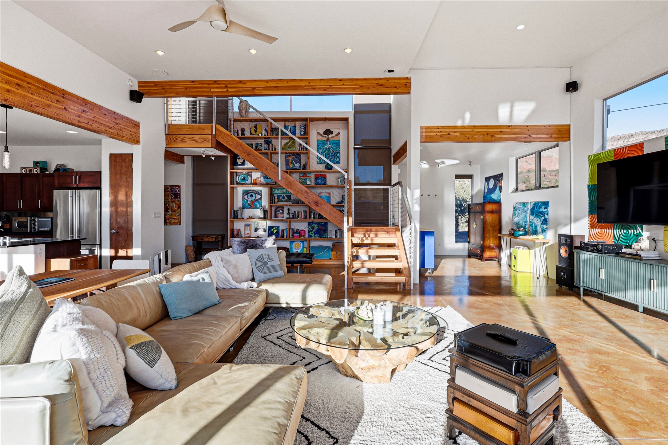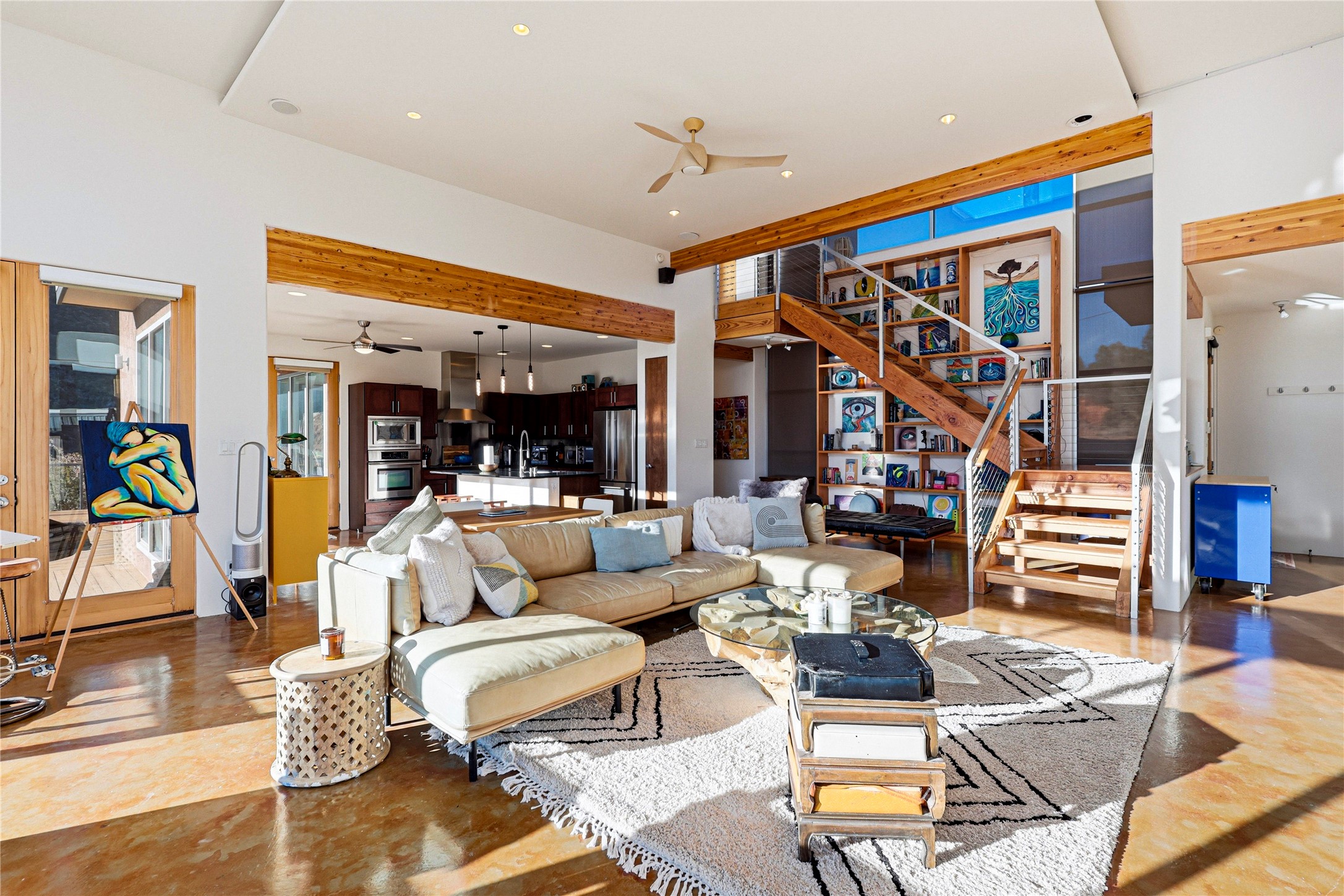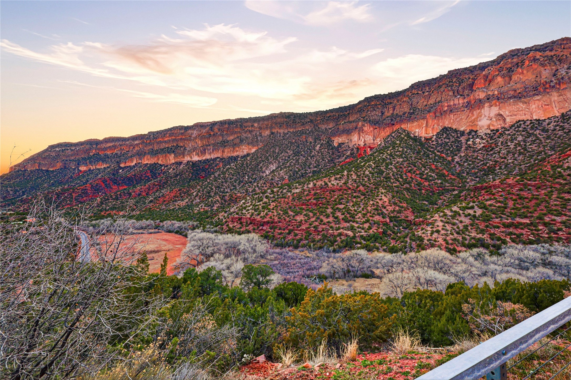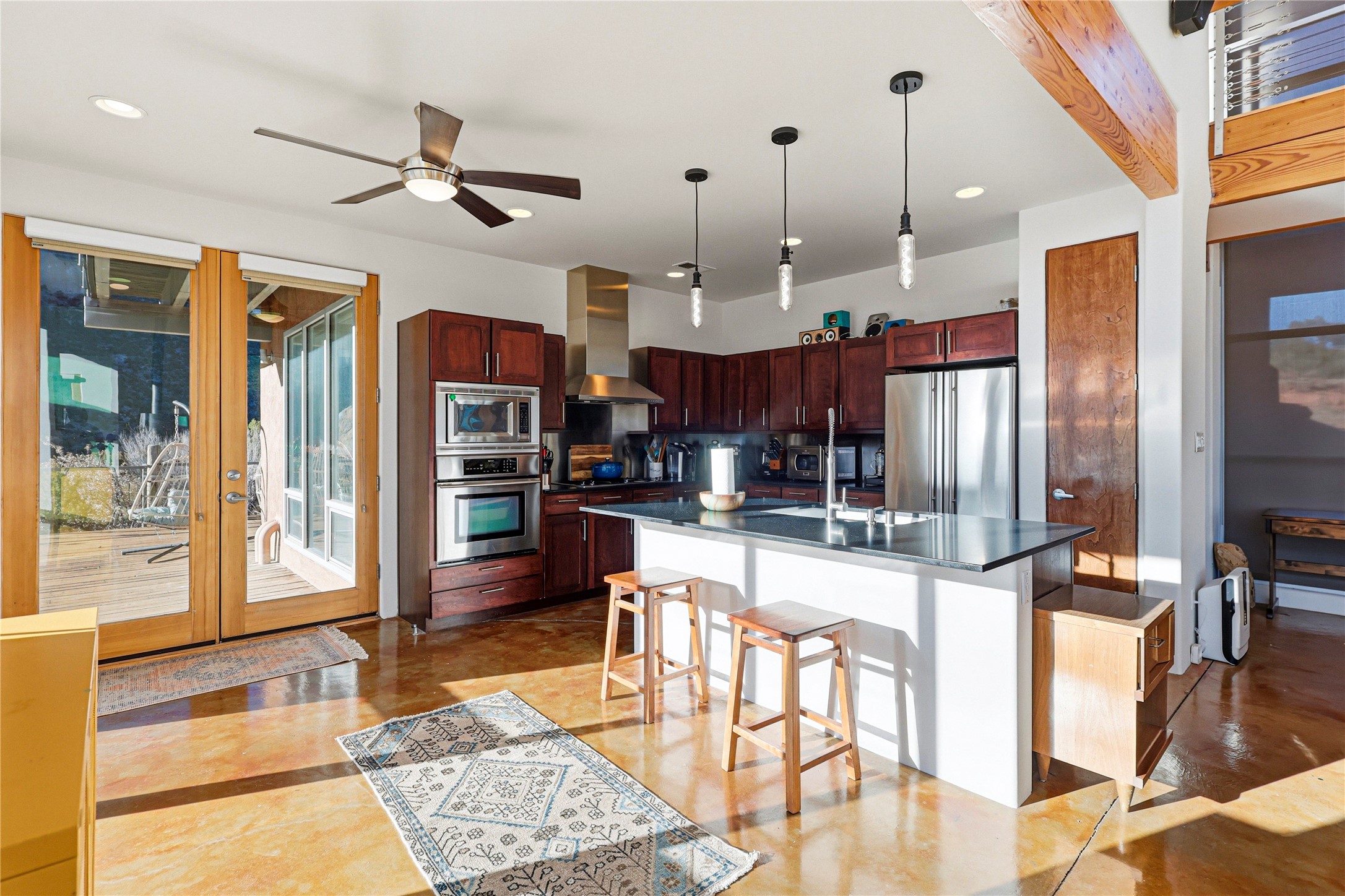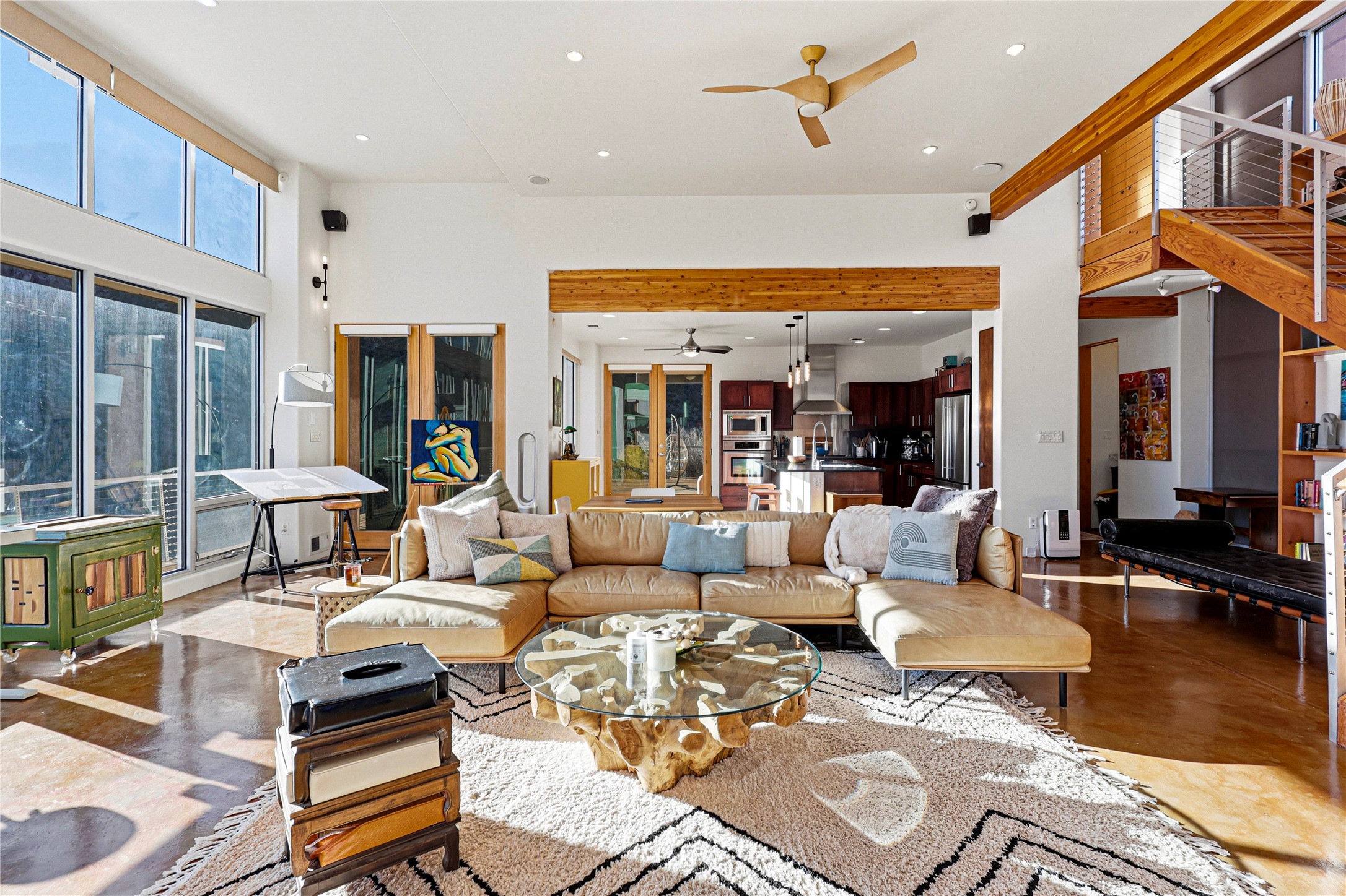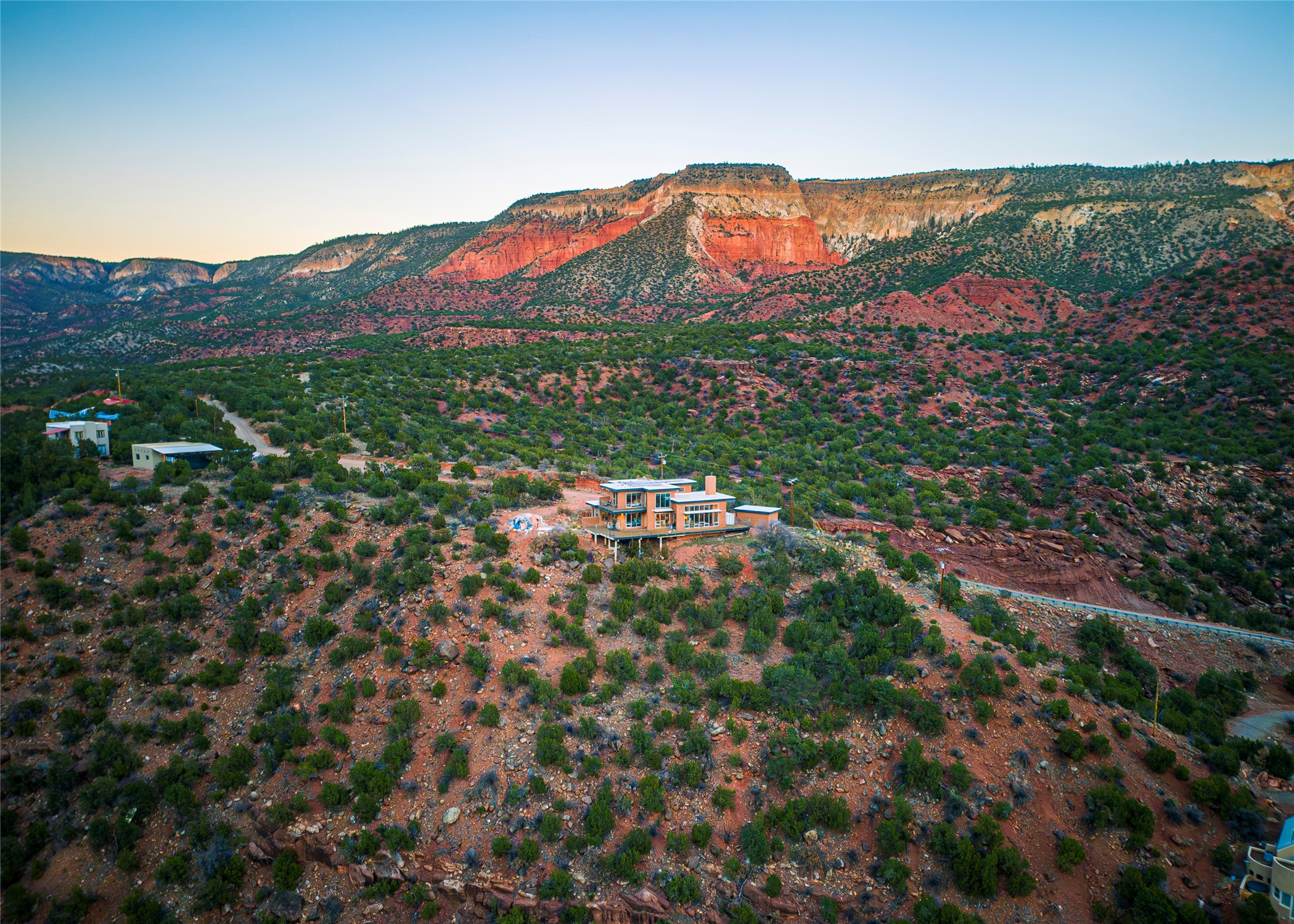 A one-of-one architectural triumph by Judy Cunningham. This 3BR/3BA mountain sanctuary is a masterful fusion of massive timber beams, polished concrete, and pristine wood flooring. Experience walking on air on expansive wraparound decks, capturing dark sky vistas and breathtaking sunsets. The main-level owner's suite offers an otherworldly awakening to floor-to-ceiling views and a soaking tub positioned for the golden hour. A sculptural floating staircase with custom cable railings leads to a private guest wing. Sustainable, high-thermal-efficiency design with paid off solar and elite Starlink Max. A serene, world-class commute to LANL through the Valles Caldera. Santa Fe and the ABQ Sunport are under an hour away. Incomparable brilliance in the heart of the Jemez.