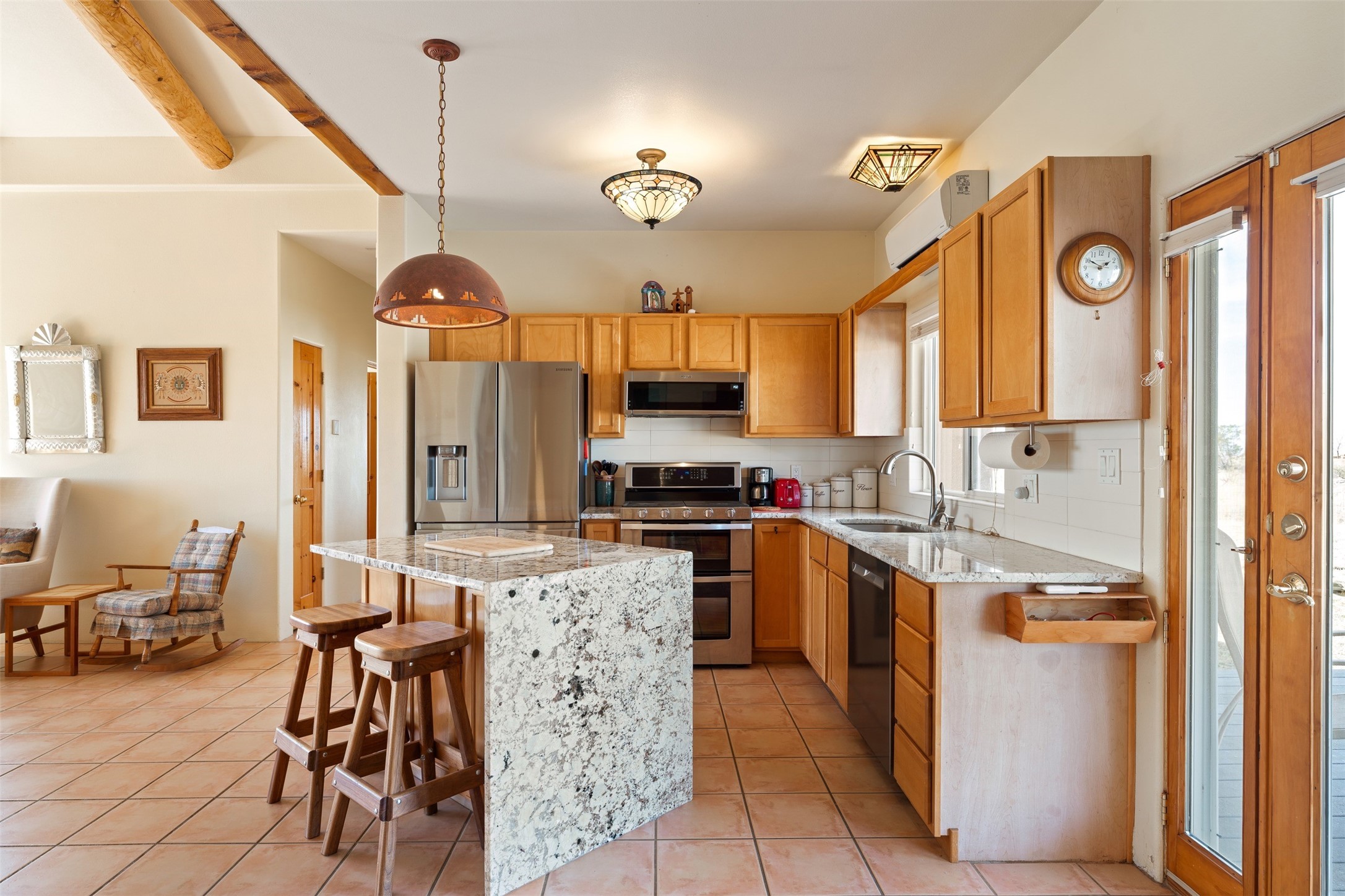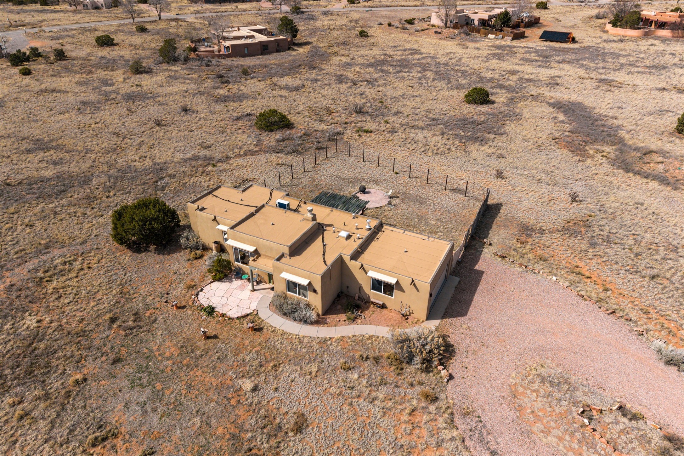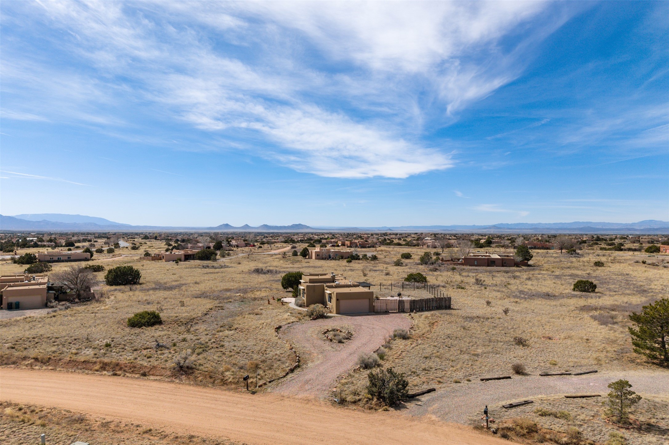 Super light and bright, charming open plan contemporary concept. 3 bedrooms, 2 bath with excellent separation between main and guest suites. The updated entertainers kitchen features granite counter tops and central island. Sweeping sunset mountain views from the living room with a gas fireplace for extra winter warmth. The kitten radiant heating system was abandoned by the previous owners and now a larger compressor was just added to serve the 4 mini splits that both heat and cool this home. The electrical has been updated, and the 2 car garage has been insulated and finished. The home was re roofed in 2019 and been maintained, a patio view at the front and lovely party deck added on the north side with Sangre foothill views. A latilla pergola with awnings and fenced yard for added benefits on over an acre of land. This is a delightful home located close to Eldorado amenities, local shopping, pub, schools, library and senior center. All this with just a short trip into historic Santa Fe.