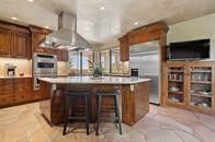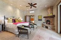 THIS STUNNING SANTA FE STYLE LAS CAMPANAS RESIDENCE CAPTURES SWEEPING WESTERN VIEWS OF THE JEMEZ MOUNTAINS AND SUNSET GOLF COURSE. The home's rich topography is felt throughout, blending beautifully with natural flagstone floors, stacked stone fireplaces, wooden beams, smooth plaster walls, and deep covered portals that epitomize indoor-outdoor New Mexico living and allows you to relax into the dazzling landscape. Designed with clean lines for privacy and flow, the thoughtfully tiered floor plan offers a well-separated two-suite guest wing - complete with art hanging system and laundry - opposite the luxurious primary suite. The heart of the home lies in the expansive living spaces and several large portals, perfect for entertaining or quiet reflection, all while enjoying framed views of nature and sky. Ascend past the office to the serene primary suite featuring its own fireplace, private patio with hot tub access, elegant built-ins, large walk-in closet, plenty of storage, and a spa-like bath with deep soaking tub and grand shower. The kitchen is warm, functional, and beautifully integrated within the undulating colorful mountain views. Here you will find a cook's kitchen with Viking appliances, a Wolf induction cooktop, informal gathering space, a walk-in pantry, and seamless access to both front and rear portals. A separate foyer with a wine fridge, powder room, and a flexible office or reading room adds thoughtful utility and charm. Outdoors, the portals extend the living experience with a kitchen, tranquil gardens, water features, even more storage, and complete privacy. Timeless Santa Fe design, executed to perfection.