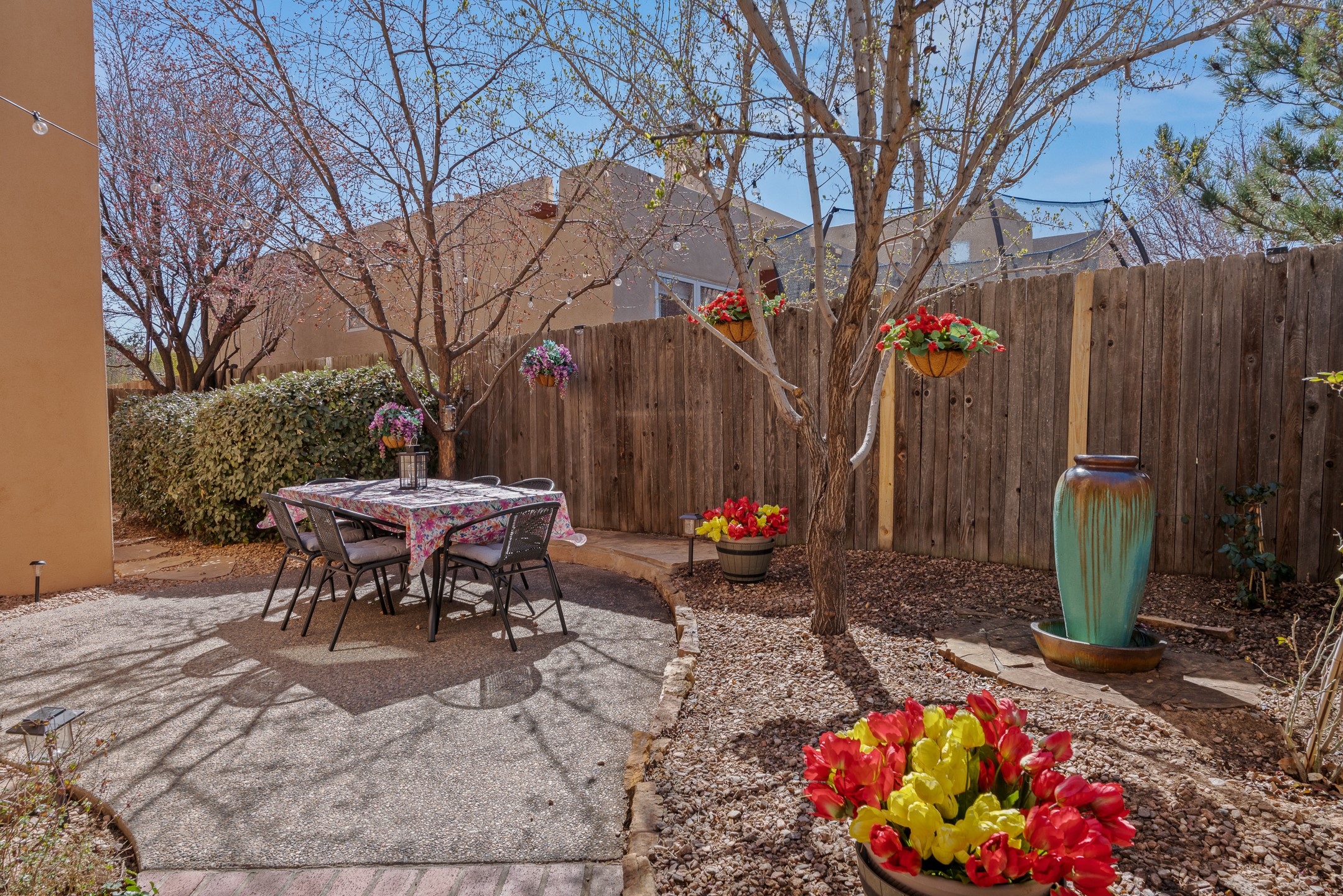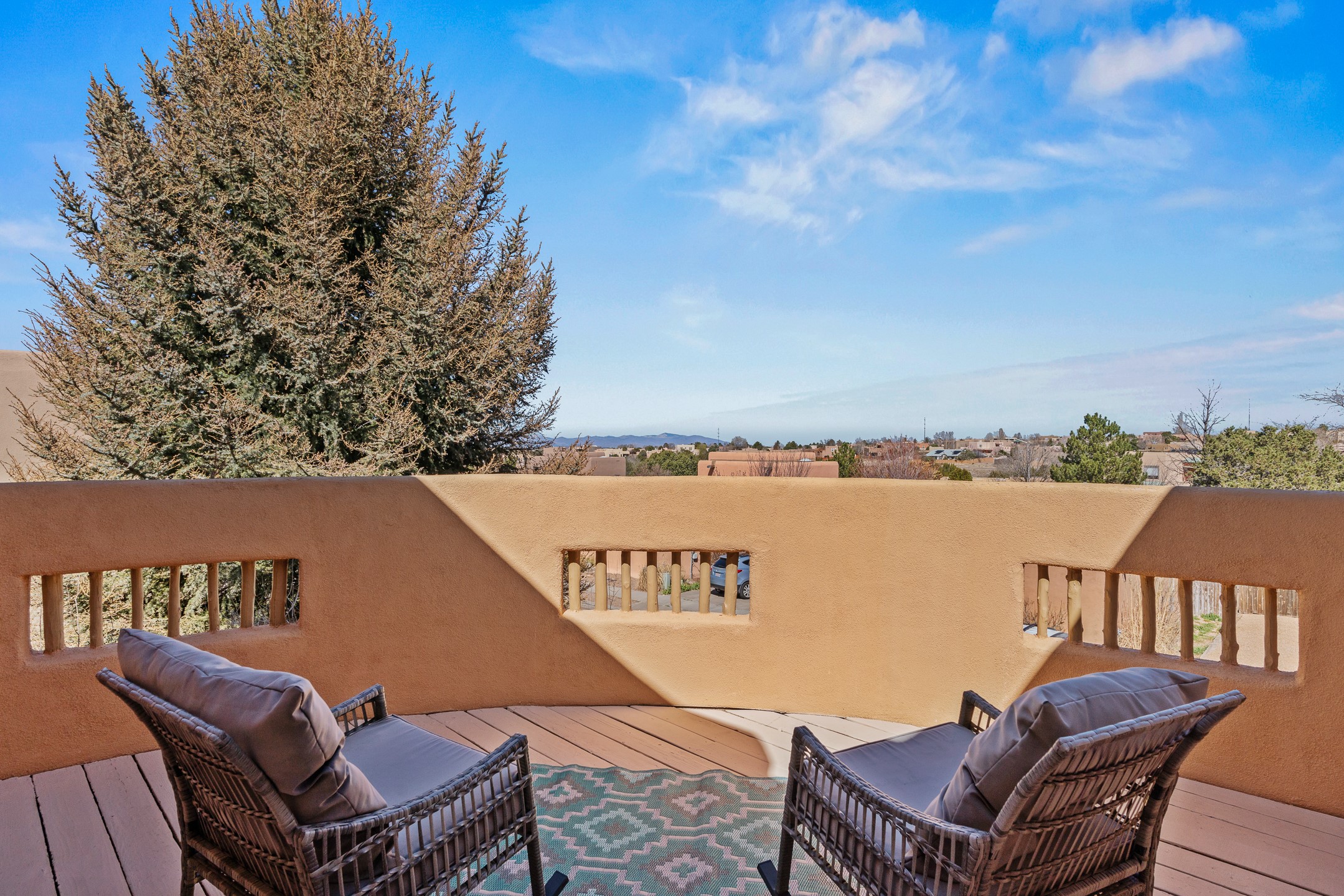 Experience authentic Southwestern charm in this beautifully maintained custom Santa Fe-style home. Built in 1995, with classic architectural details including stunning vigas and aspen latilla ceilings, tile flooring, two inviting kiva fireplaces, and custom built-in shelving in the dining room. The thoughtfully designed curved kitchen has been tastefully updated with new appliances, a stylish tile backsplash, wine fridge, and breakfast bar--creating an inviting space for both everyday living and entertaining.Comfort and efficiency are enhanced by four mini-split systems providing cooling in the summer and quick, efficient heat in cooler months.Outdoor living is equally impressive. A pergola-covered patio overlooks a beautifully enhanced backyard featuring mature landscaping, new side fencing, additional drip irrigation, and three private seating areas connected by flagstone patios and walkways--perfect for relaxing or gathering with guests.The home offers 3 bedrooms and 3 baths, including a convenient main-level bedroom with an adjacent accessible shower bath. The main level also features a spacious living room, dining area, and a cozy TV/sitting room with wood burning kiva fire place opens to the outdoor portal for effortless indoor-outdoor entertaining.Upstairs, you will find a large master bedroom suite with a remodeled bathroom featuring new tile flooring, a new tub, updated vanity and sinks, and a generous tiled shower with dual shower heads. Off of this bedroom is a deck with views of the Sangres. Upstairs is an additional ensuite bedroom which could be used as a second primary suite. There is a second upstairs deck off of this area. Additional features include abundant storage, 4 minisplits for cooling and a garage with a 220-volt outlet suitable for EV charging or workshop use.Filled with natural light and lovingly cared for, this exceptional Santa Fe home offers timeless character, thoughtful upgrades, and inviting indoor and outdoor living spaces.